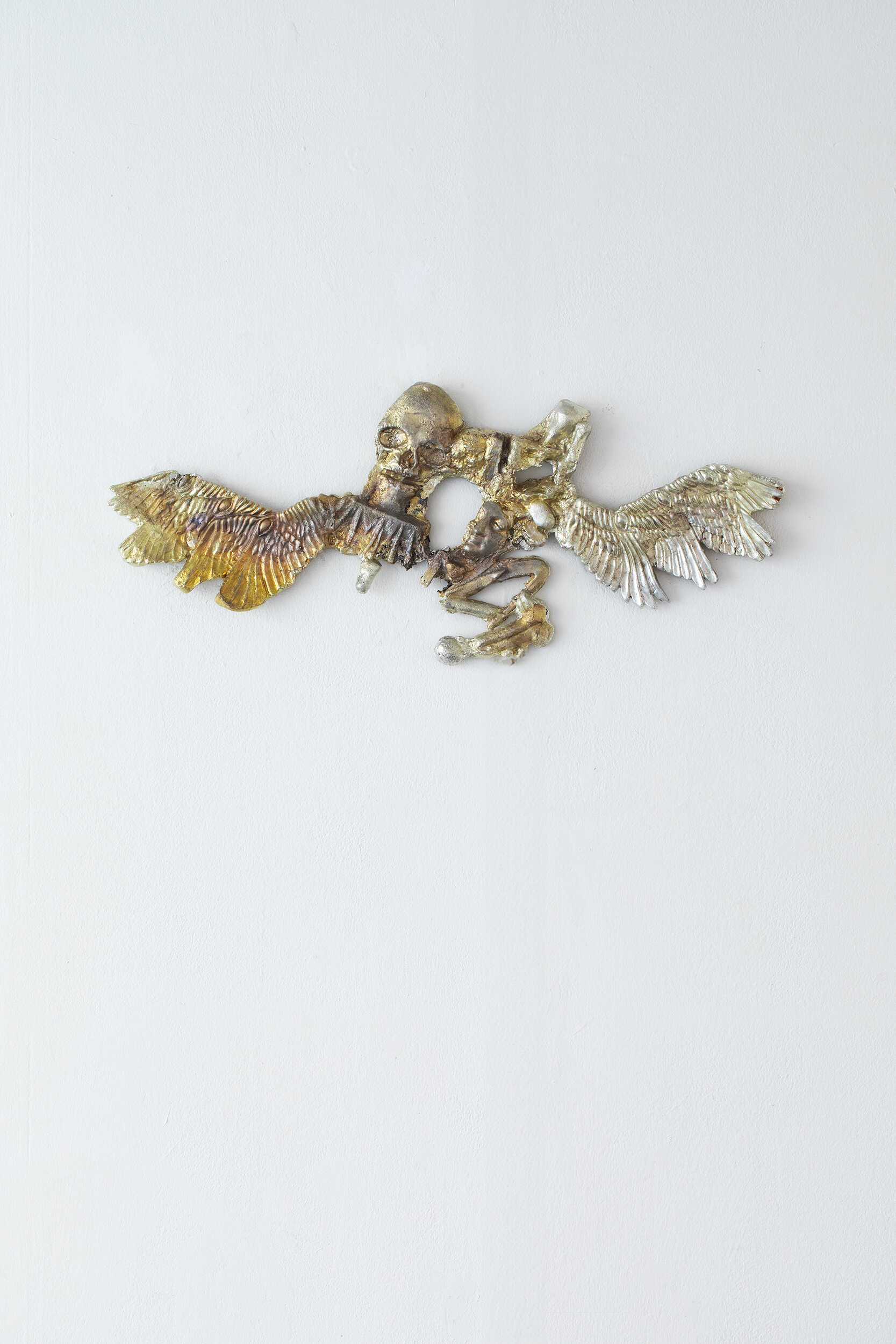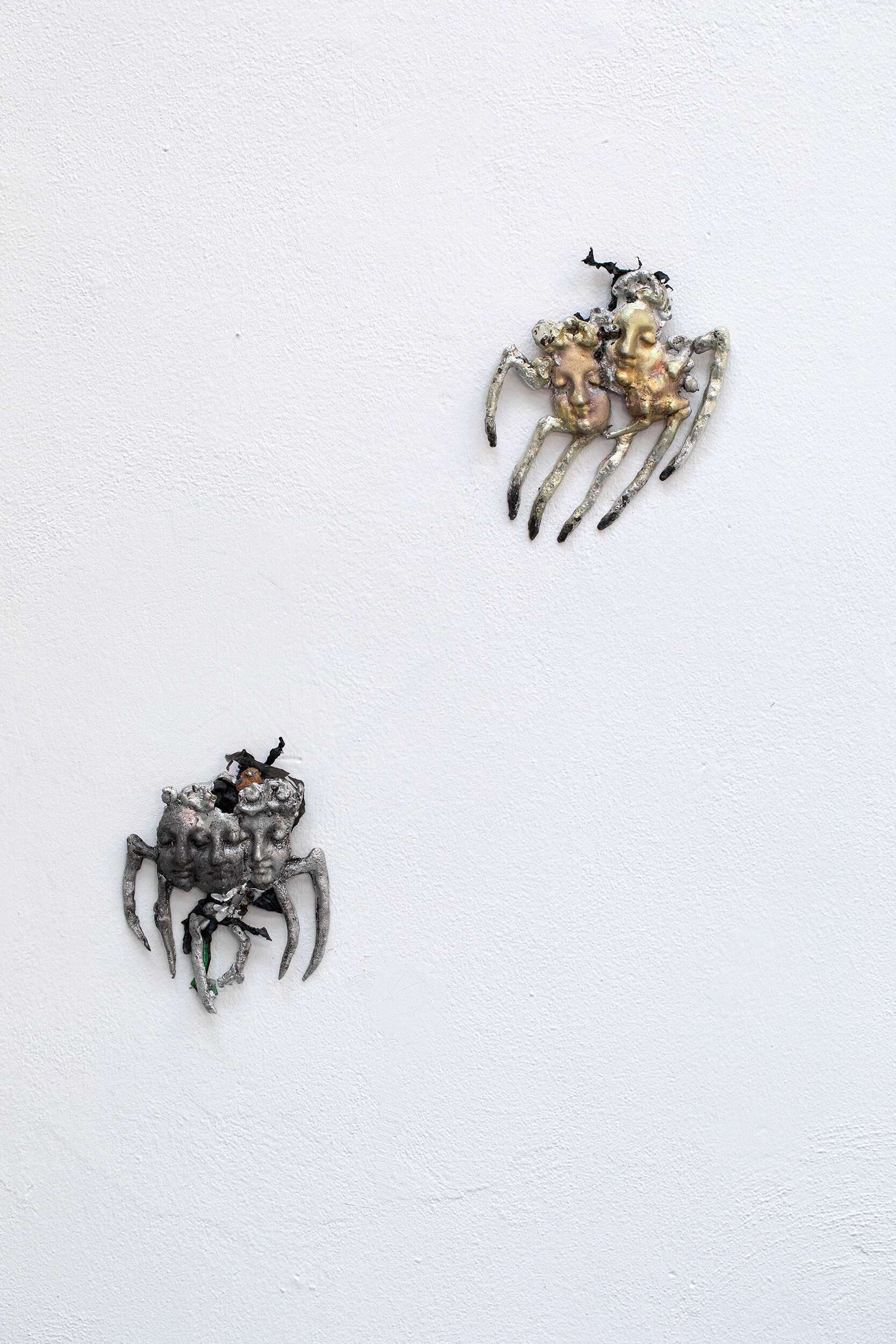 All that remains of the ancient figures are fragments of faces, reminiscent of posthumous masks, fused