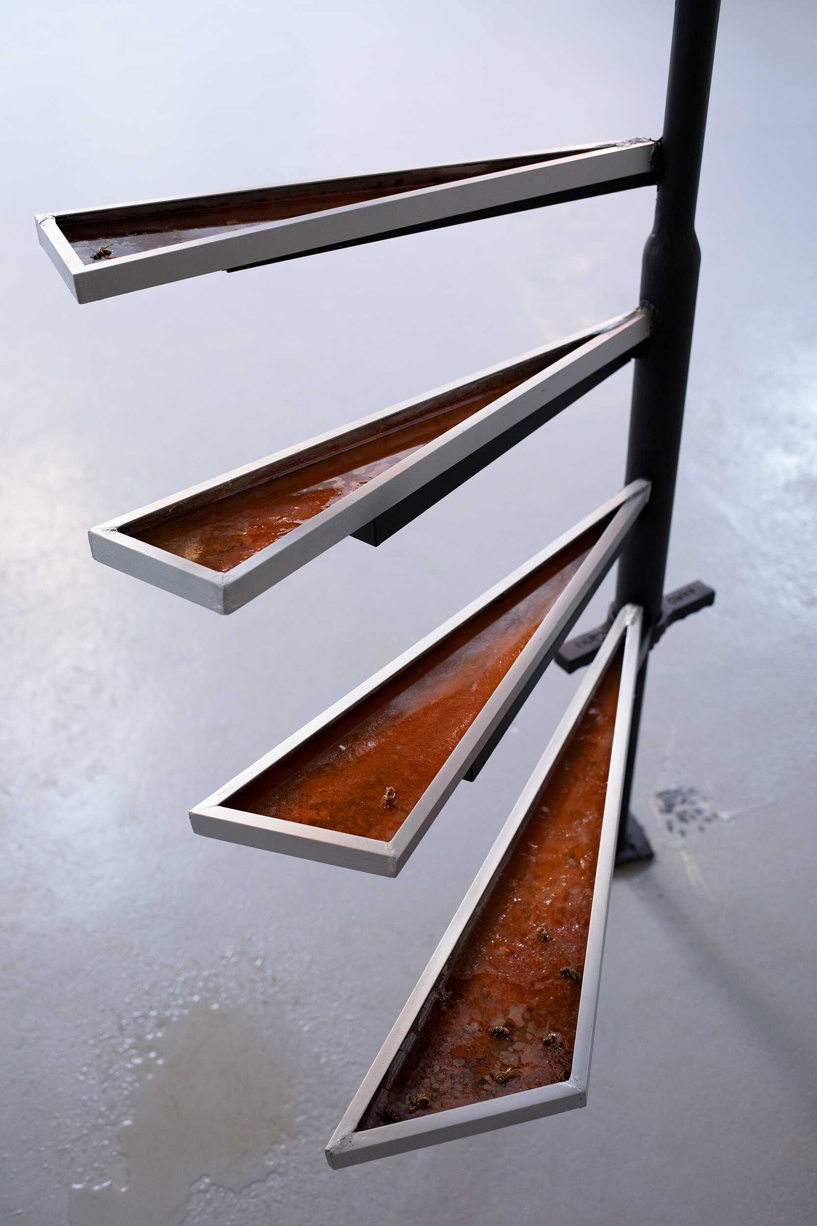 conglomerate. The water in the geometric shapes is murky, the metal parts rust, the mounting