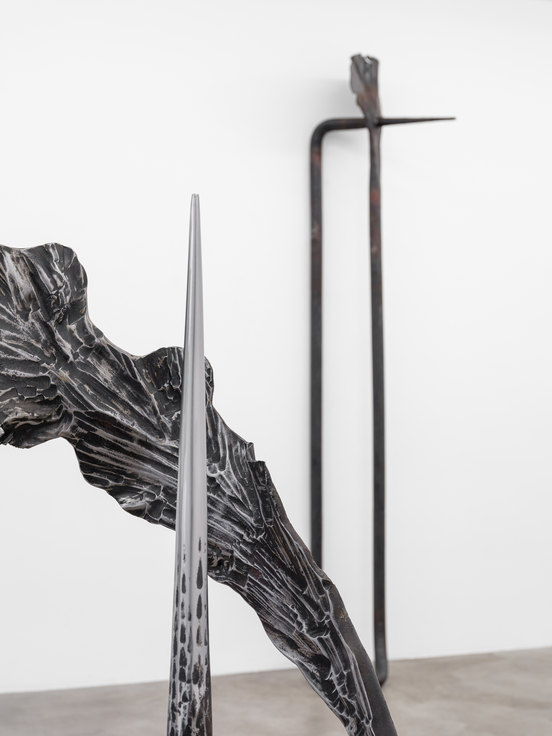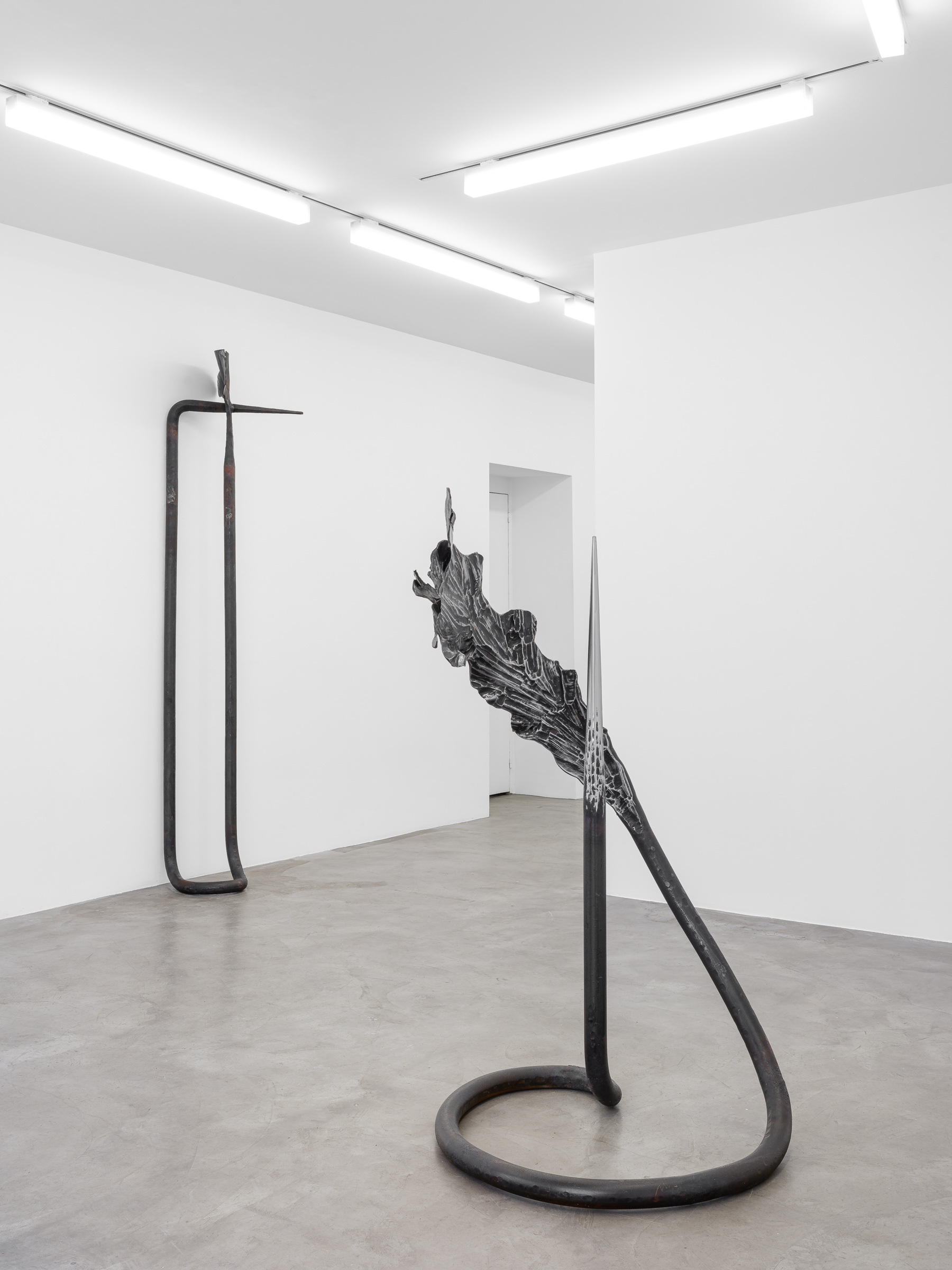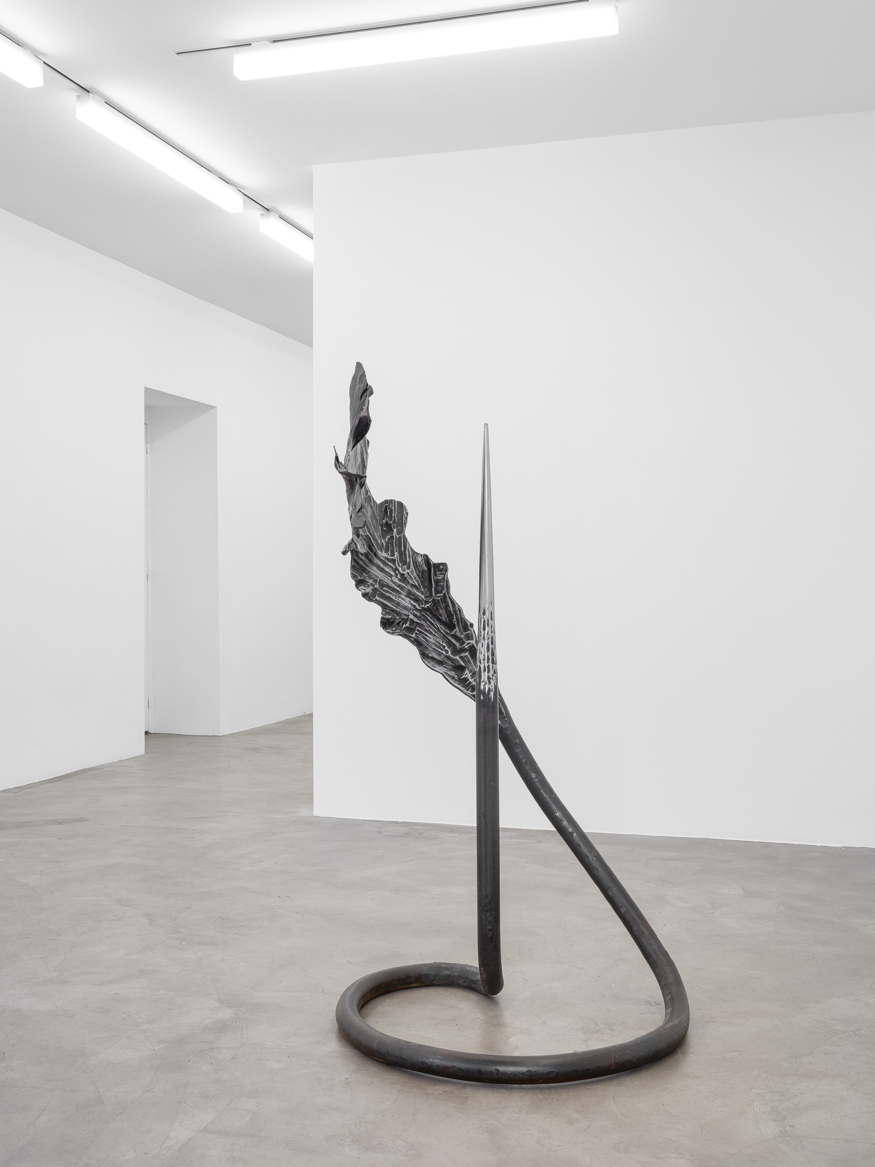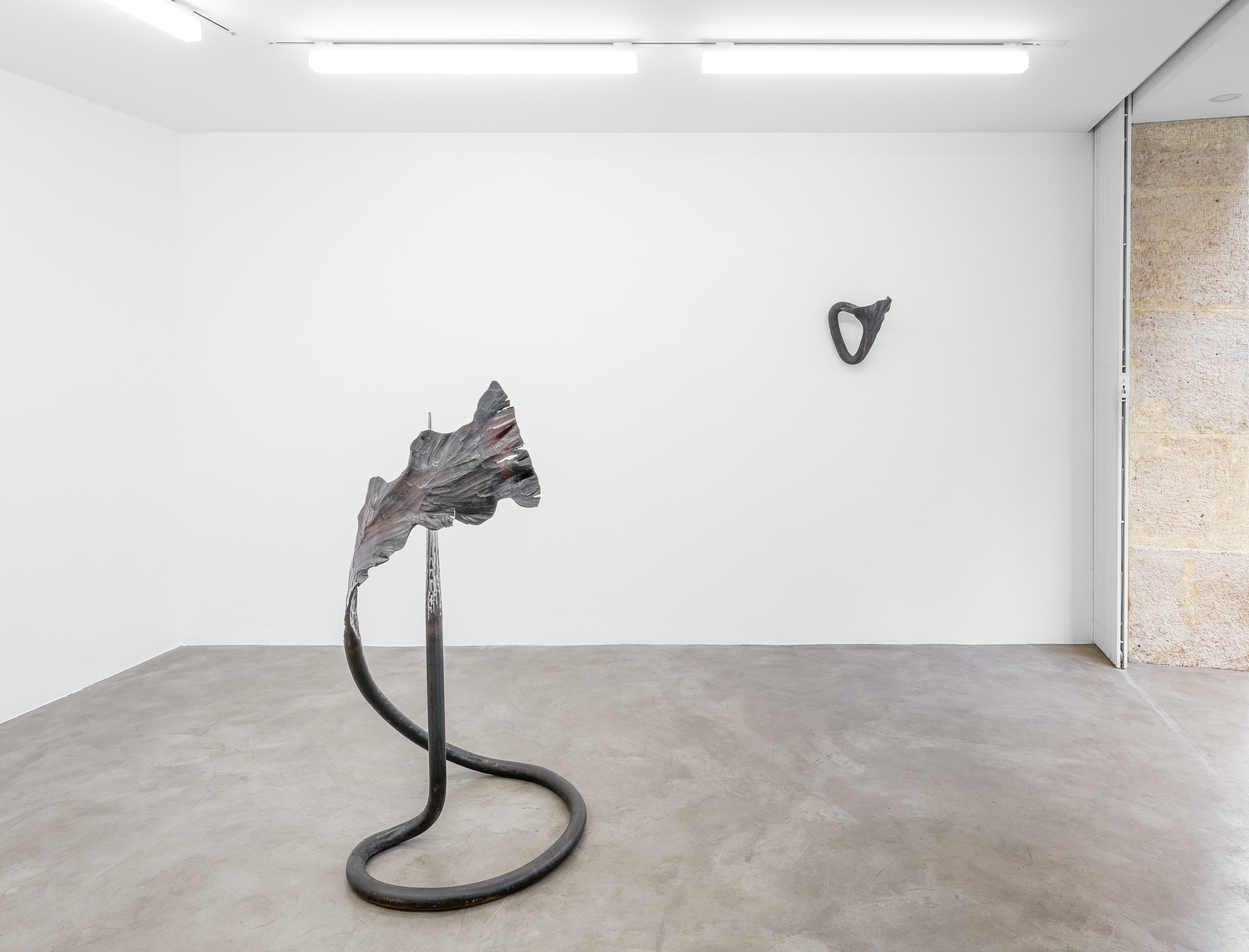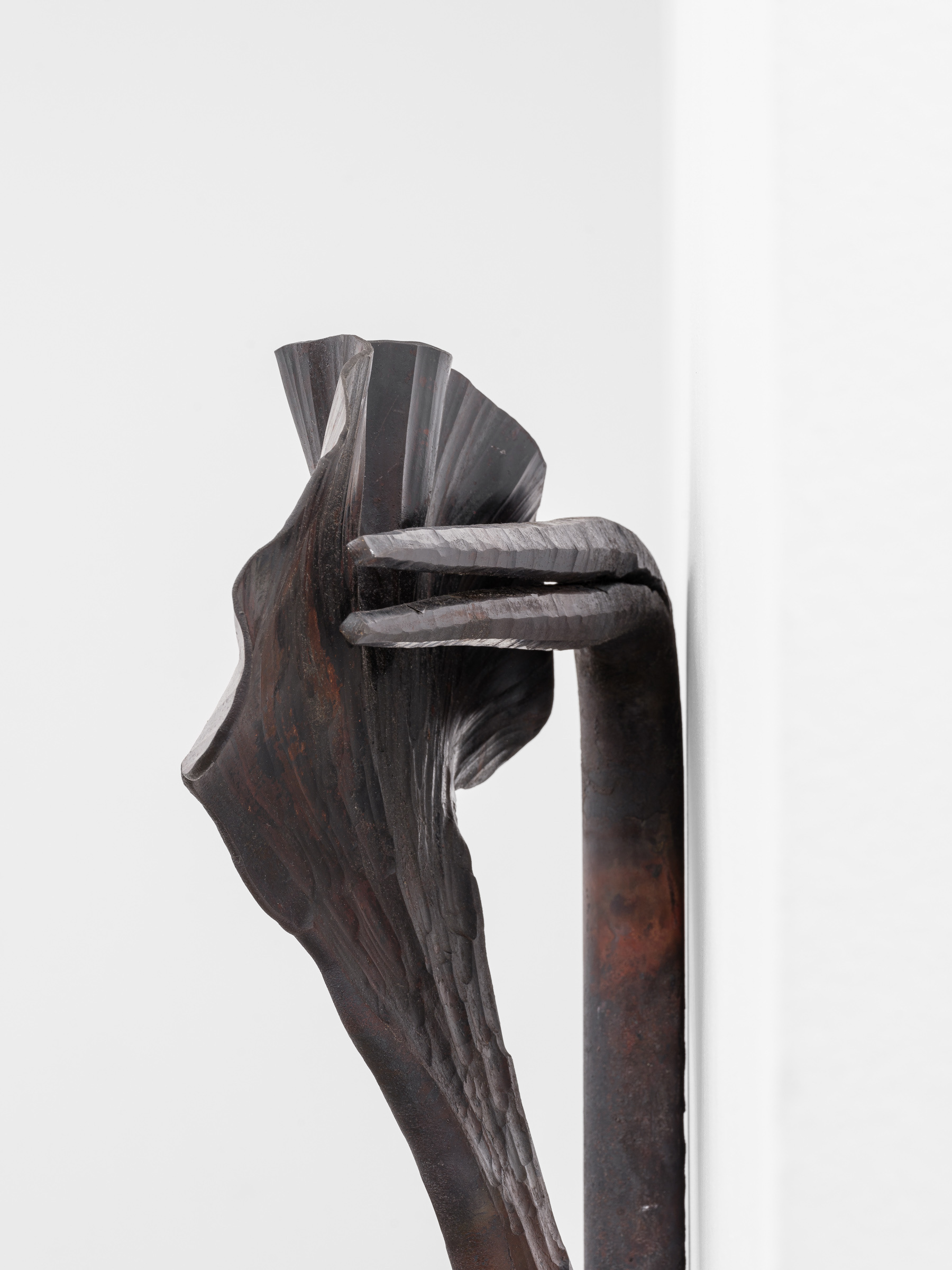 The Shy One greets us, withdrawing into itself, yet unable to fully conceal the sharp point rising at its center. It introduces the dual tension that underlies this entire body of work and the exhibition. Frozen in a spiraling gesture, it draws us into its movement as much as it repels us. Devoid of a base, the Tubes extend into space, finding support as much on the ground as on the walls, emphasizing a sense of choreographed momentum. This dance begins from the very inception of the work, in its germinal state. The artist narrates the forms, mimicking the energy of each sculpture. Like a mold or its counterform, her body becomes the preliminary medium of the piece. By sketching the metal’s movements in space, she communicates the intentions of the form to Jadran Stenico, the blacksmith she has collaborated with since 2017 to create her wrought iron pieces. This gestural and sensitive creation process becomes a language in itself, introducing a fundamental approach that engages the discursive qualities embedded in every material.