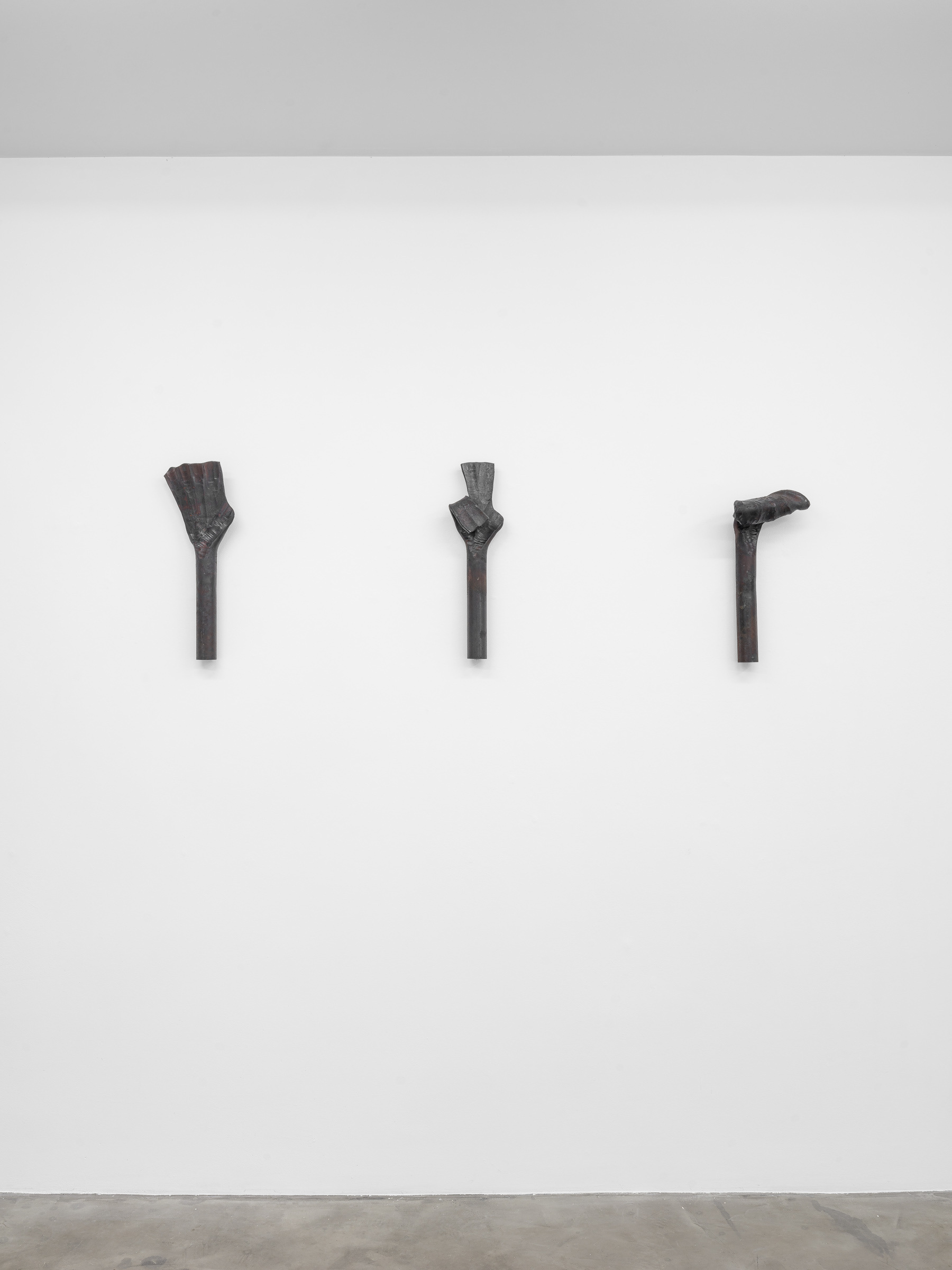 Rock, Paper, Scissors. The importance of gesture. Three smaller wall sculptures occupy an exceptional place in the exhibition. Still made from the same initial module, the tube in this case stretches to form a hand. Like an amputated limb, the other end is a rough cut, revealing not the hollow but the solid interior of the iron section. The hand-shape varies according to three potentials: closed, open, folded. Contrasting with the methodical rigor to which the artist remains faithful, the quest for movement that she brings to life in her forms, as we have seen, draws on modes of play, defiance, and even risk. The game of Rock, Paper, Scissors, in its confrontation with the opponent, is a form of calculated chance. The choice of gesture is voluntary but limited and will be dictated by the mutual experience of the two players. This game is among the most archaic, having traversed civilizations, often used to "draw lots," make decisions, or settle situations by relying on the gods or simply fate. The completion of a gesture has the potential to alter the course of things.