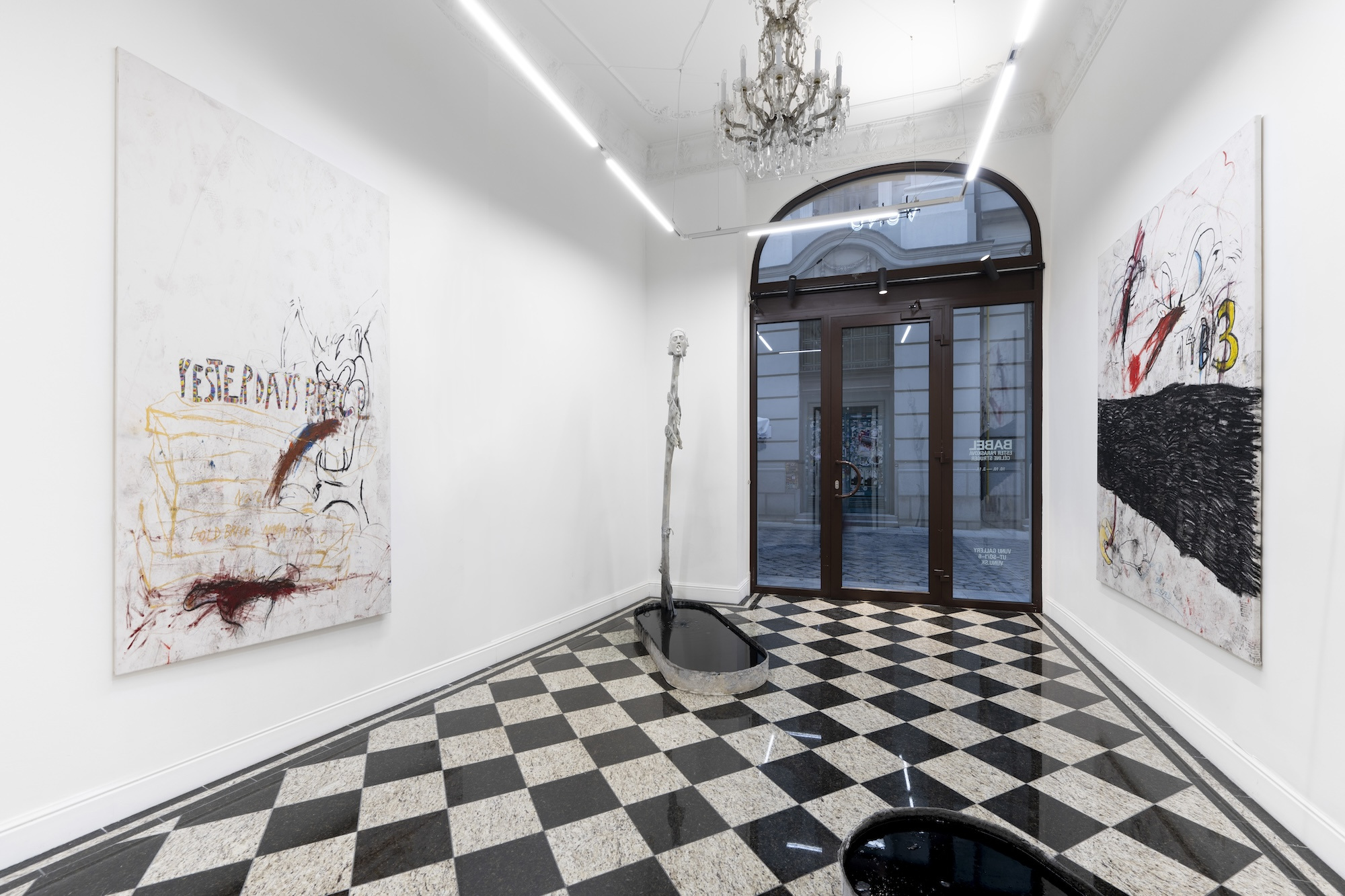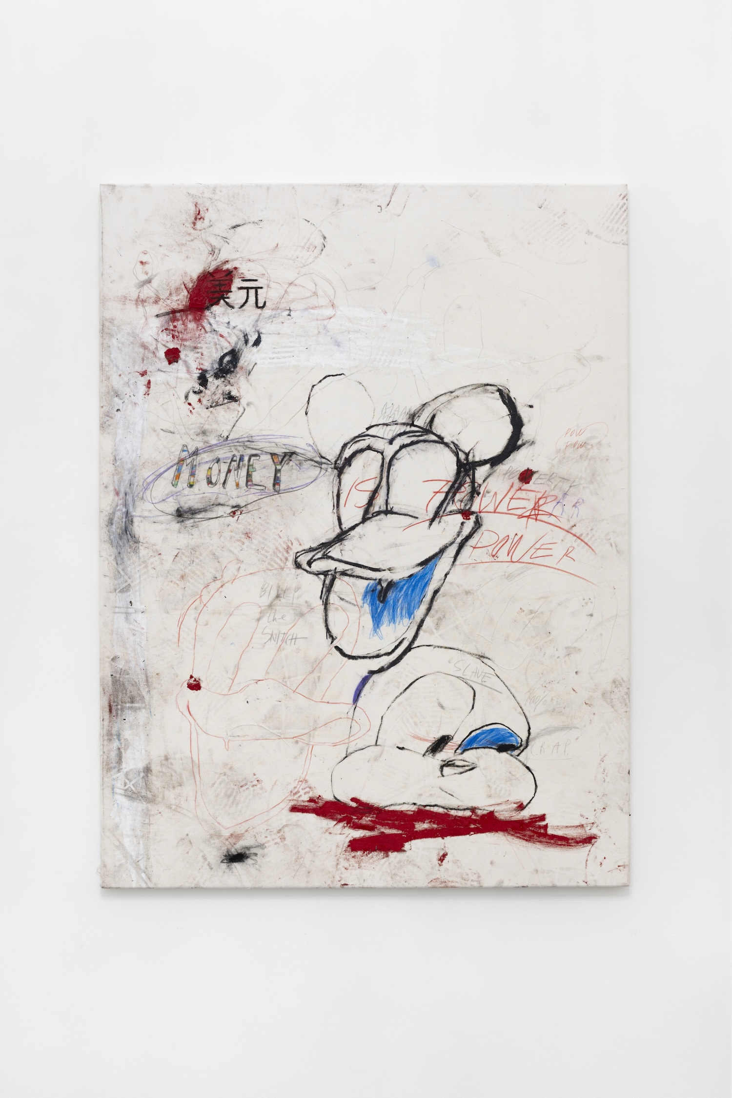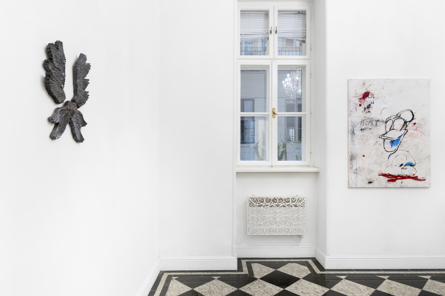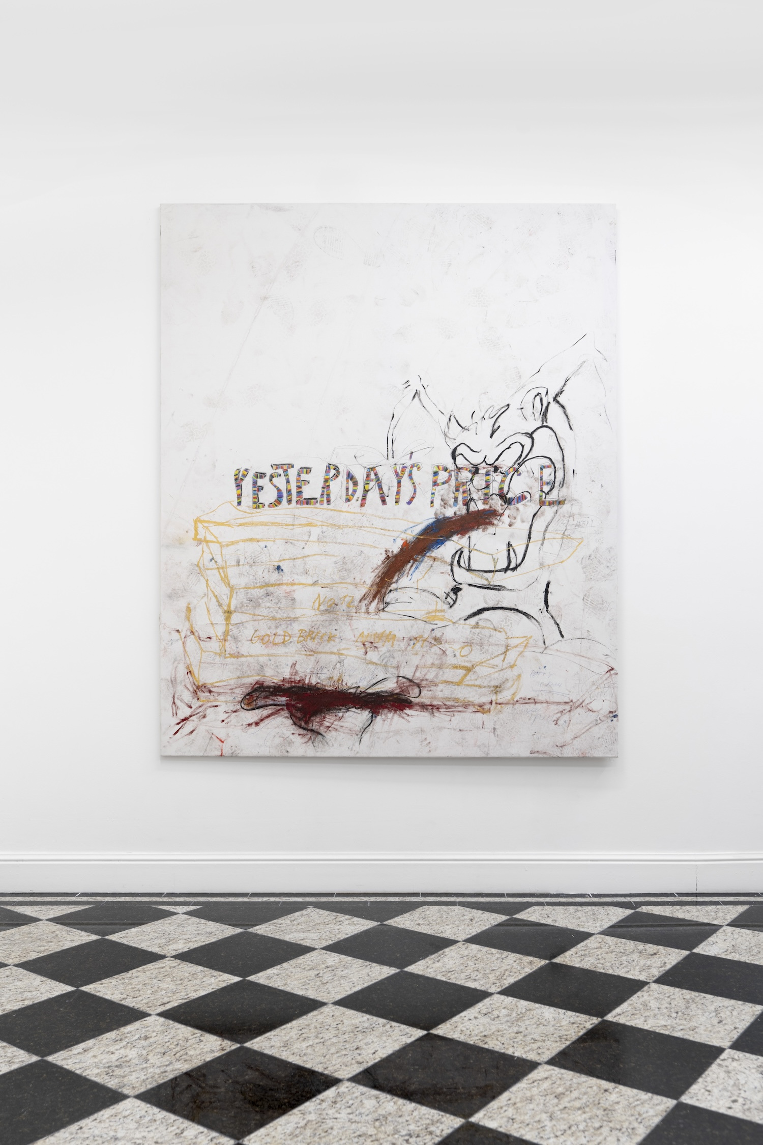 Large-format paintings by Ester ParaskovĂĄ (b. 1993, KuĆim; currently based in Prague) preserve expressive drawing records in between fluid automatism and elaborate reflections on the contemporary world. Their raw naturalism and nude visuality is striking at first glance. Traces of dirty shoes, motion, quick scribbles and shaky handwriting are accompanied by appropriations of familiar cartoon characters or text slogans. Her visual collages oscillate between conflict and charm, good and evil, beauty and ugliness, irony and weightiness. ParaskovĂĄ anchors the imaginary bedlam through functional composition, contrast and colour combinations, elevating it through critical view of the society, violence, consumerism or the functioning of the world of art.