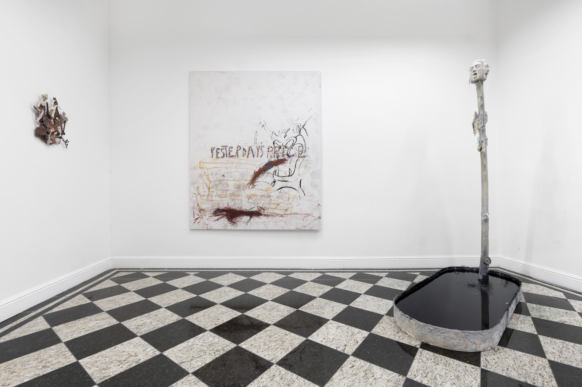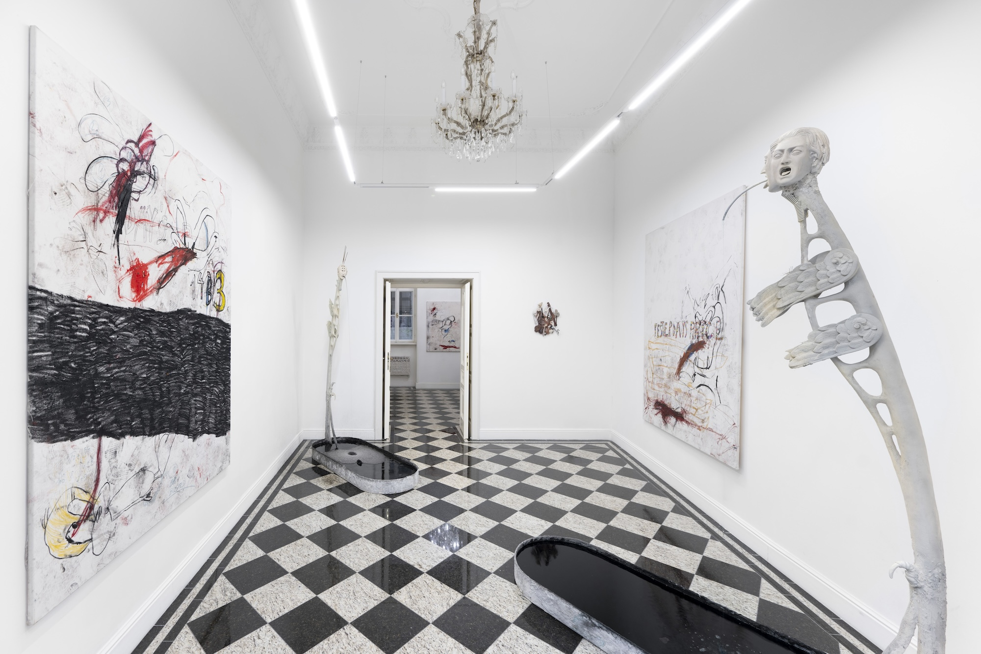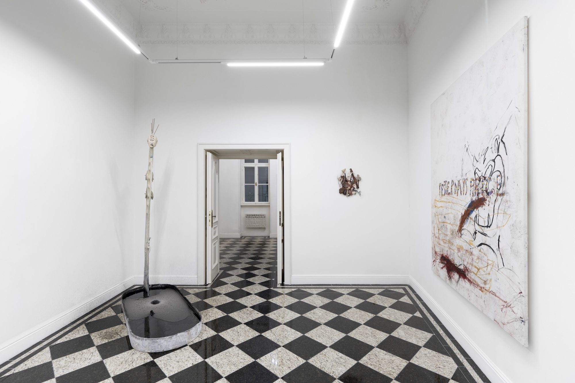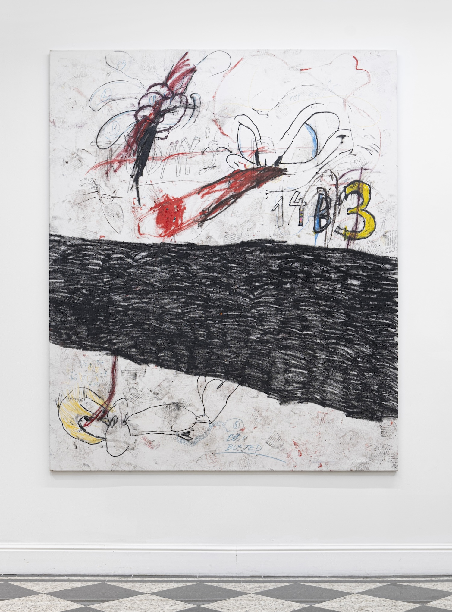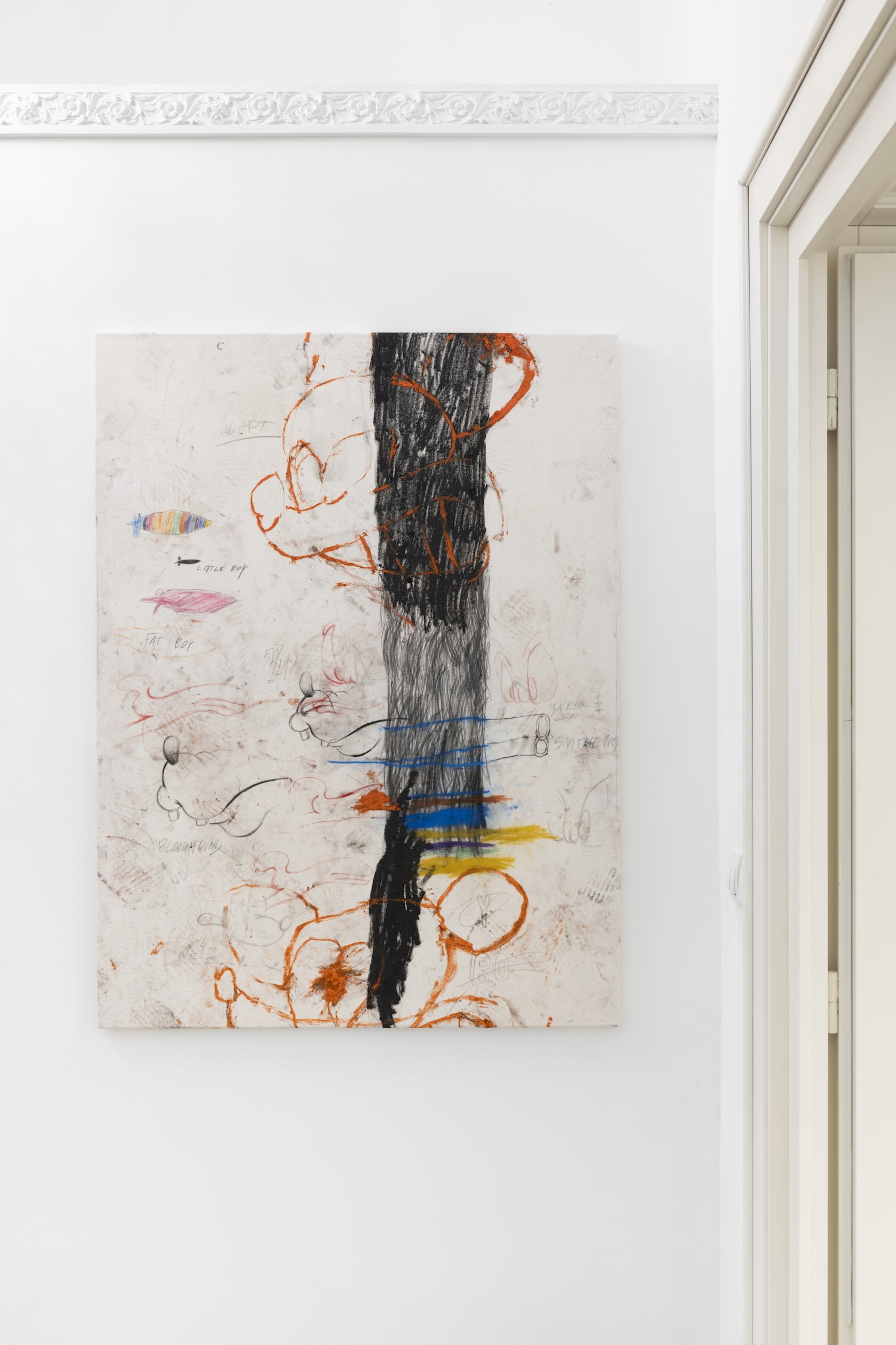 Large-format paintings by Ester ParaskovĂĄ (b. 1993, KuĆim; currently based in Prague) preserve expressive drawing records in between fluid automatism and elaborate reflections on the contemporary world. Their raw naturalism and nude visuality is striking at first glance. Traces of dirty shoes, motion, quick scribbles and shaky handwriting are accompanied by appropriations of familiar cartoon characters or text slogans. Her visual collages oscillate between conflict and charm, good and evil, beauty and ugliness, irony and weightiness. ParaskovĂĄ anchors the imaginary bedlam through functional composition, contrast and colour combinations, elevating it through critical view of the society, violence, consumerism or the functioning of the world of art.