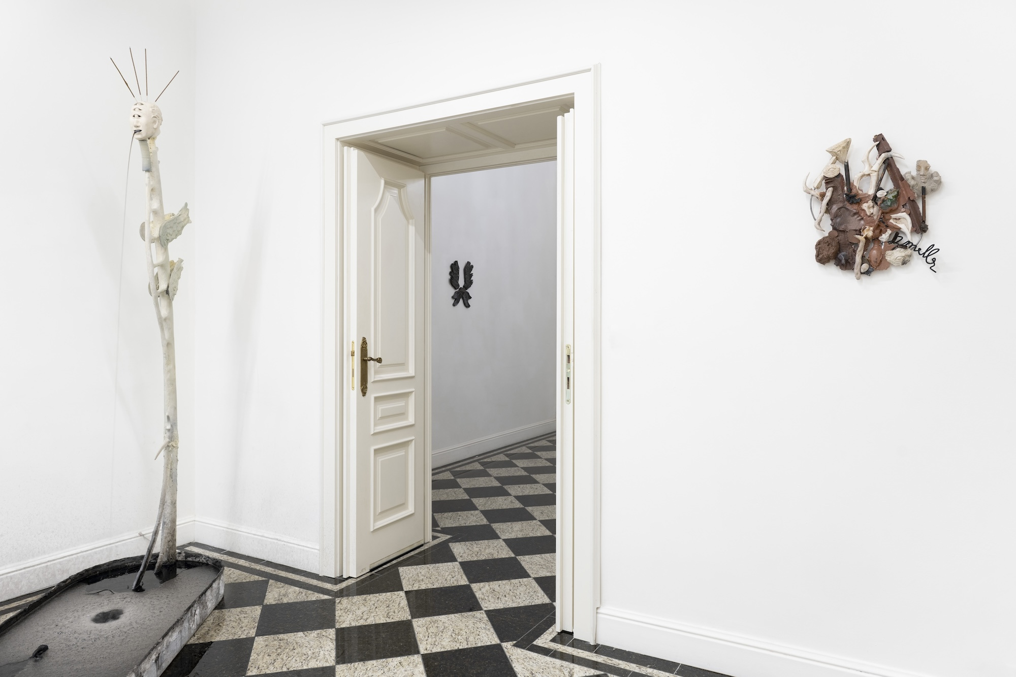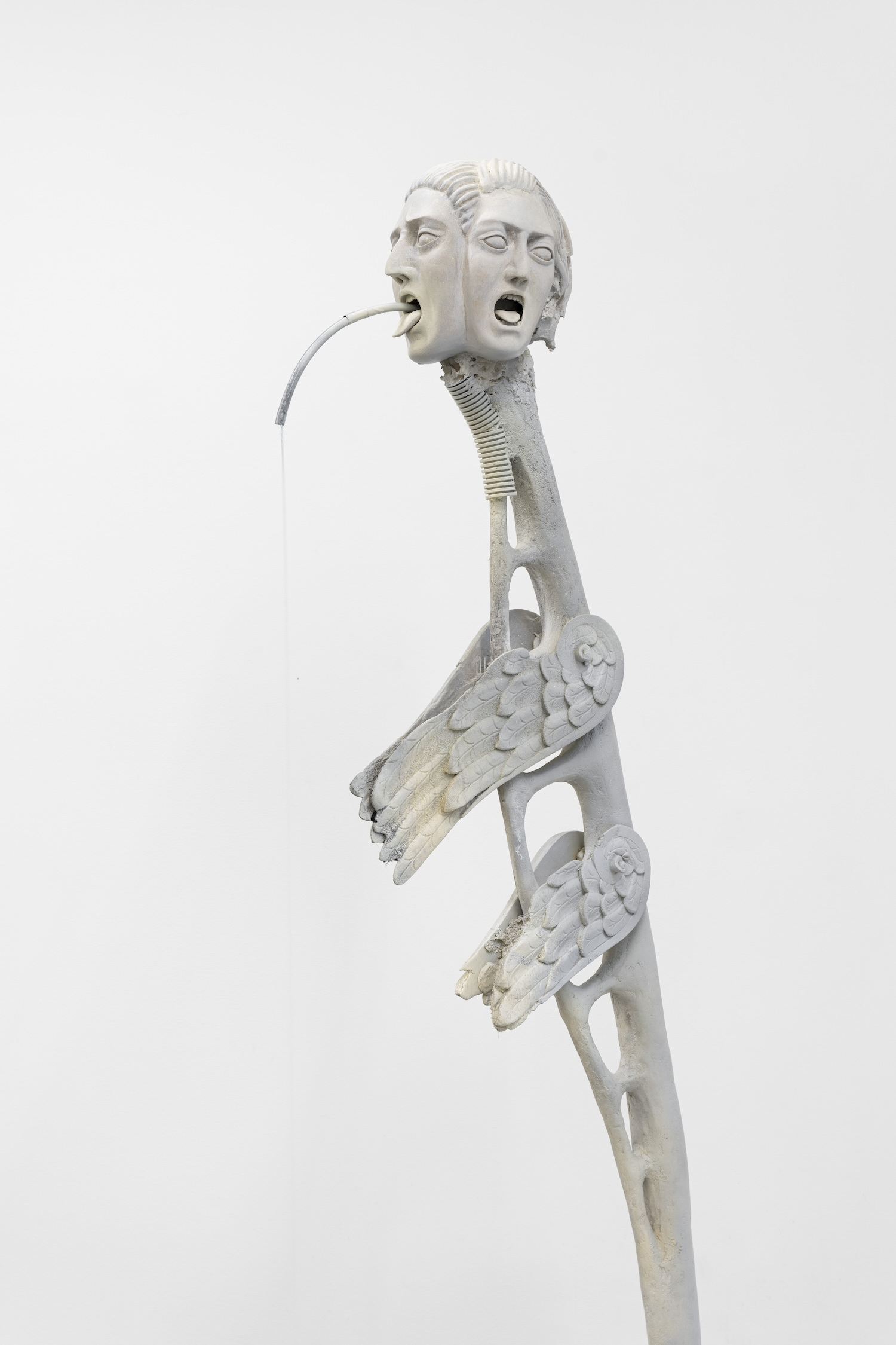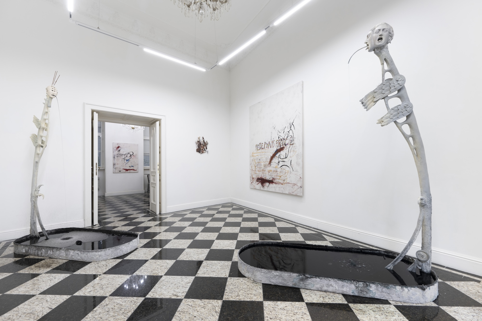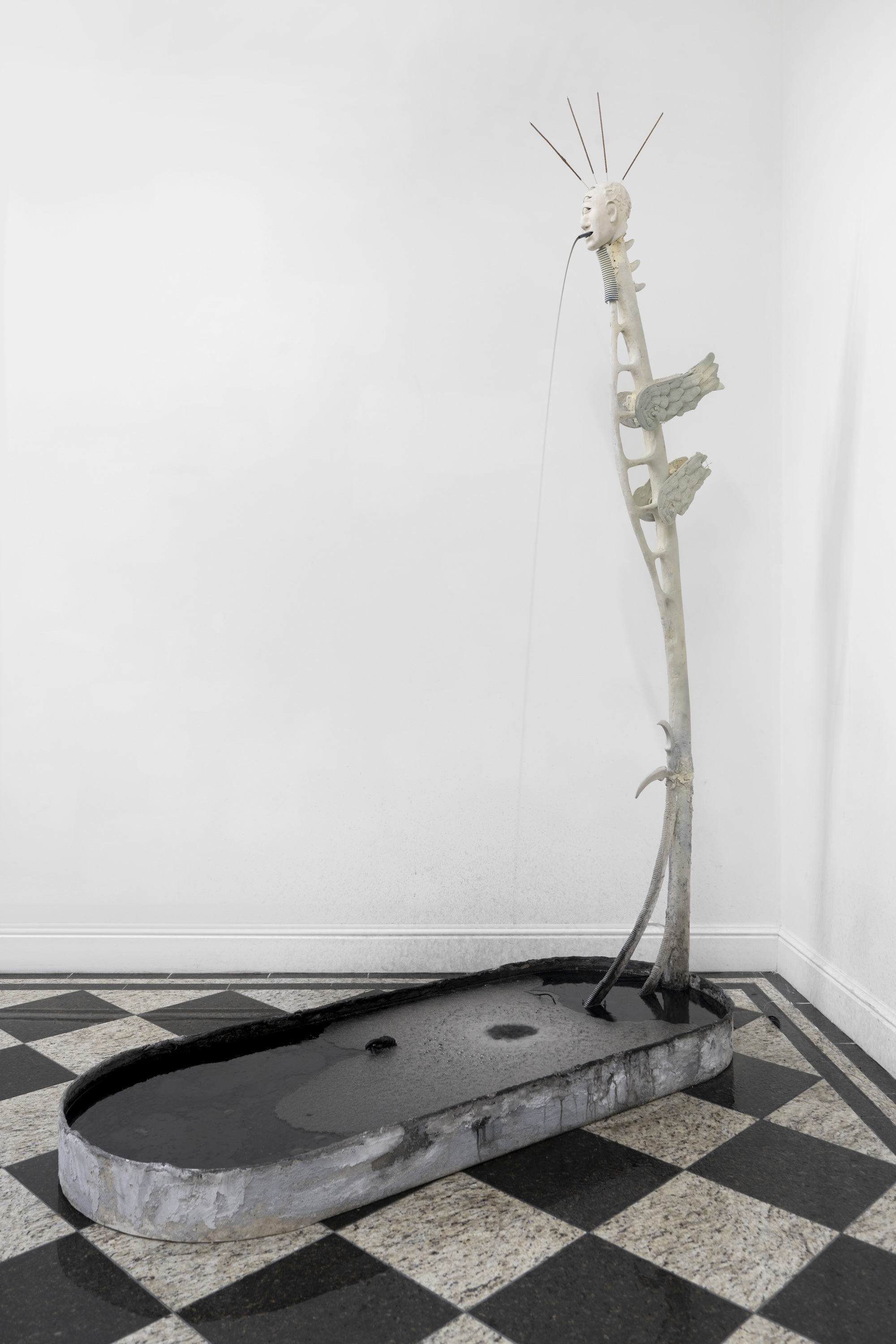 The works by CĂ©line Struger (b. 1982, Klagenfurt; currently based in Vienna) are based on traditional sculpture, which she updates through found materials or technical elements. They appear as mix of dystopian residues of past cultures, combining historical pre-images fused in personal mythologies and captivating fictions into new contexts. Two sculptures - hybrids of grotesque gargoyles and fountains where we discover fragments of different cultures or religions â dominate the exhibition. Struger creates odd figures combining a three-headed version of the god Janus, symbolising the past, present and future, with her own vision of Cyclops with multiple eyes, transforming his originally restricted view into the ability to perceive reality from multiple perspectives. Original mythological (anti)heroes emerge through a complementing pair of wings or claws of Harpy, changing knowledge and testing the boundaries of fantasy, myth or (pseudo)spirituality.