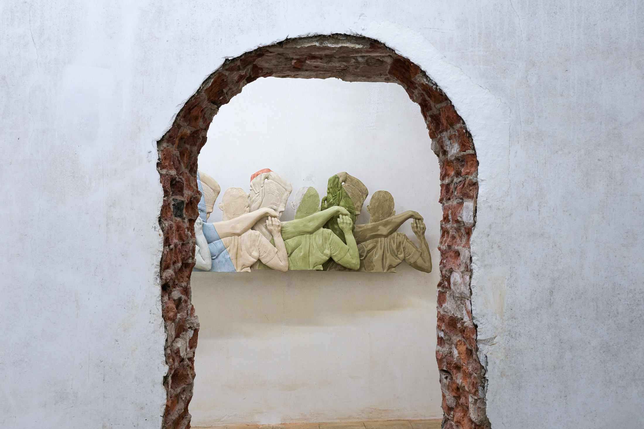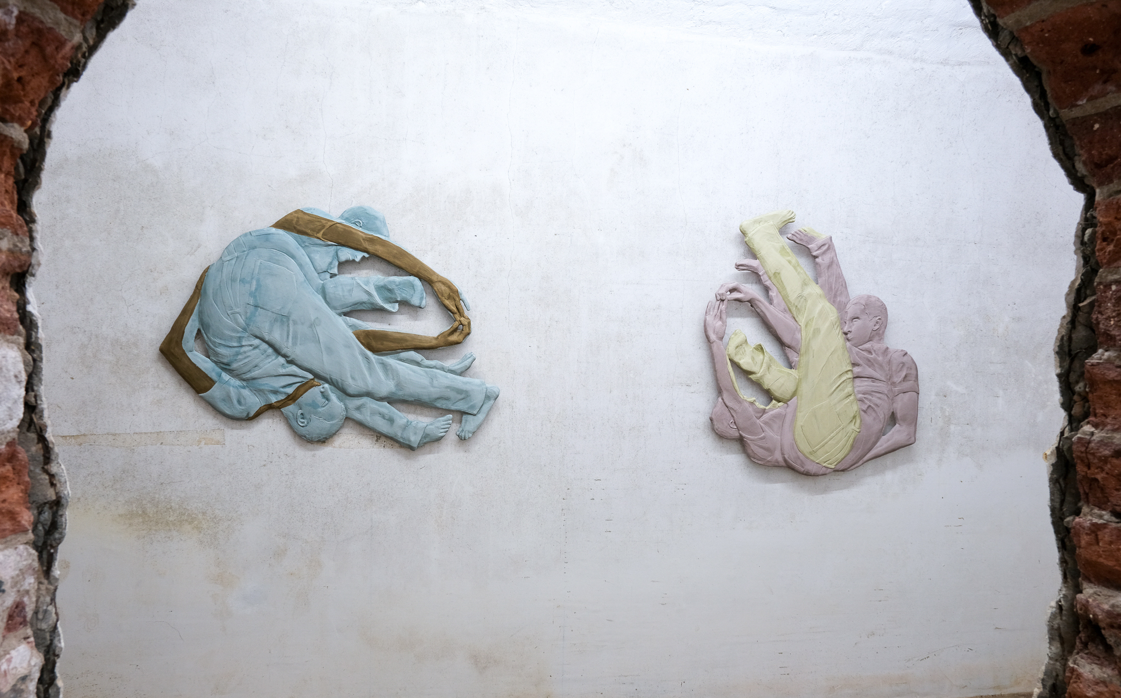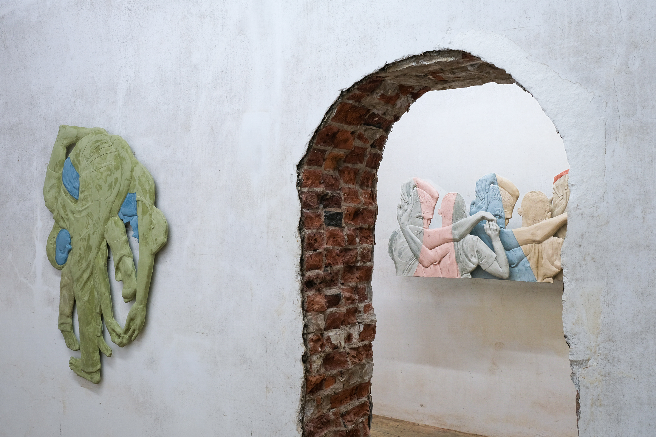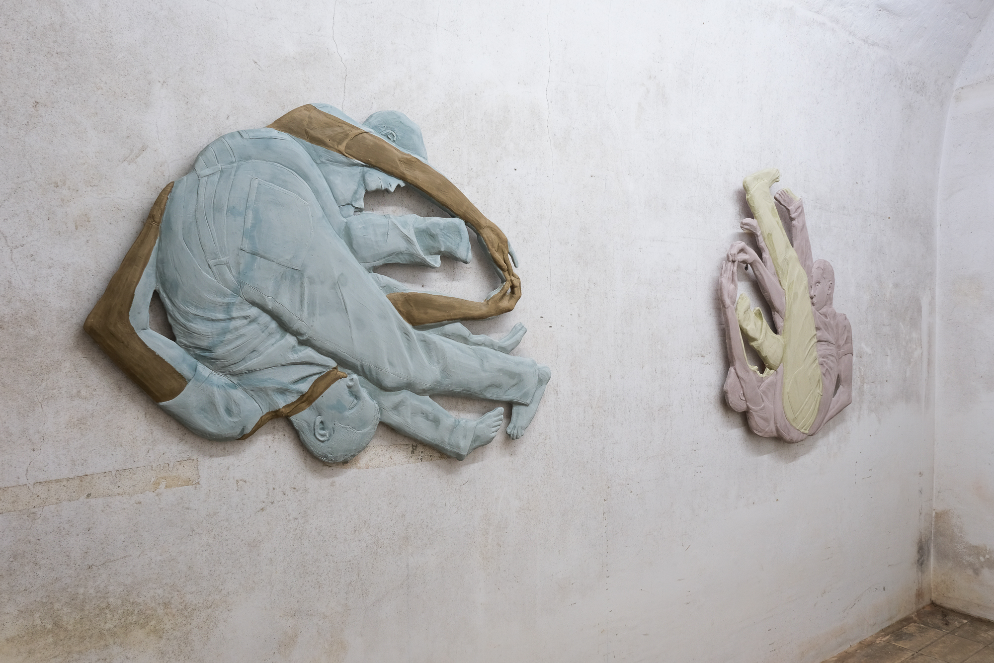 knowledge which they strive to reject or challenge. Across both her video and sculptural work, she attempts to unpack and explore the inherent contradictions of these alternative systems of belief. In a pair of connected chambers, Hunter presents a new series of reliefs that depict sets of doubled and repeated figures entwined in various orientations. Cast in muted pastel colors that overlap and confuse the boundaries between them, the sets of figures are difficult to differentiate from each other. As they tumble and repeat through space, itâs hard to tell whether they are engaged in some form of mutual assistance or conflictâor even whether they represent separate individuals. The overlapping colors suggest at once fields of energy connecting the figures and the informational overlays of medical diagrams. Drawn from illustrations found in intuitive anatomy texts, these sculptural works probe Hunterâs interest in the notion of our entanglement with a kind of shadow-self, an entity perhaps produced by the myriads of scrutinizing gazes to which we have become subject.