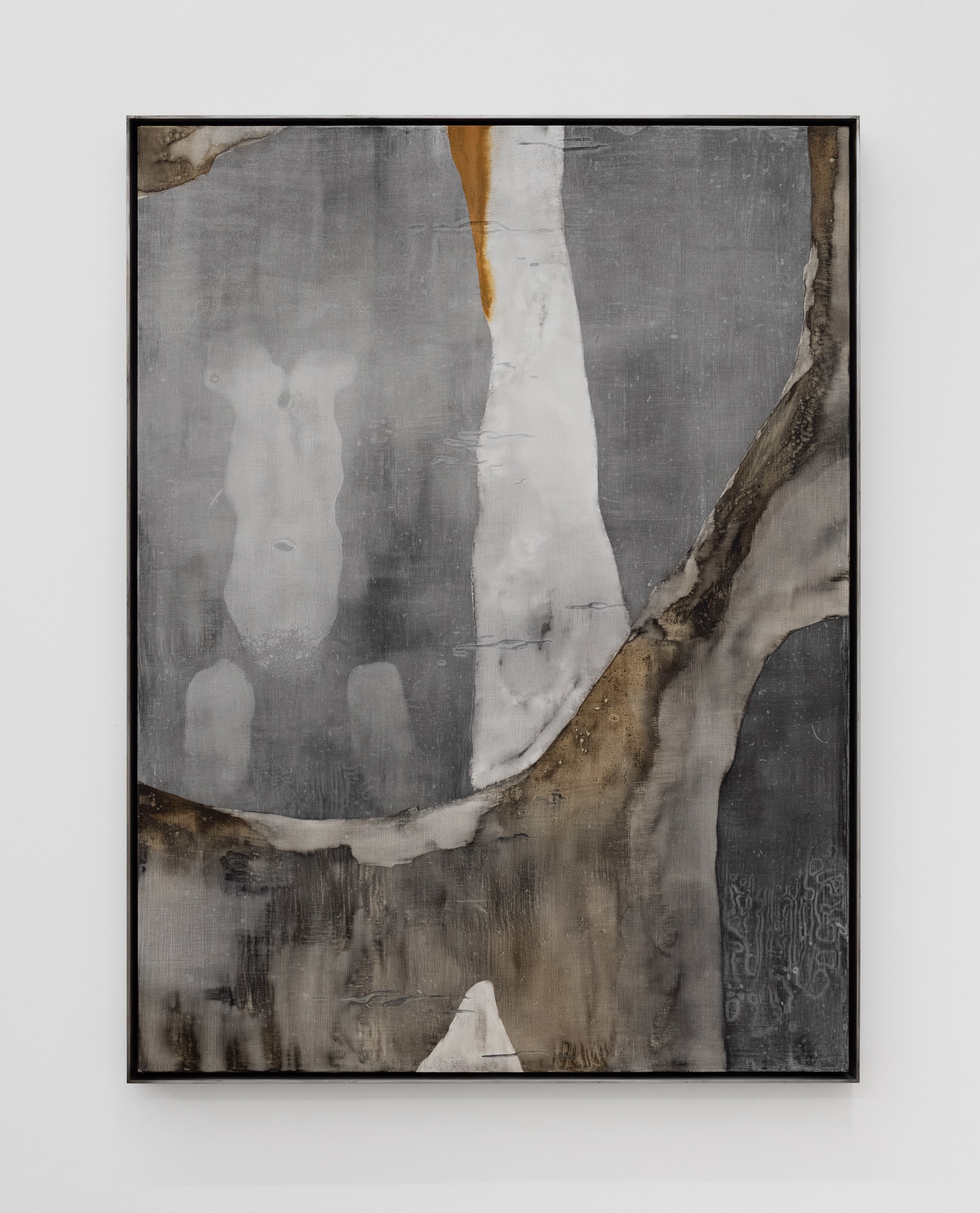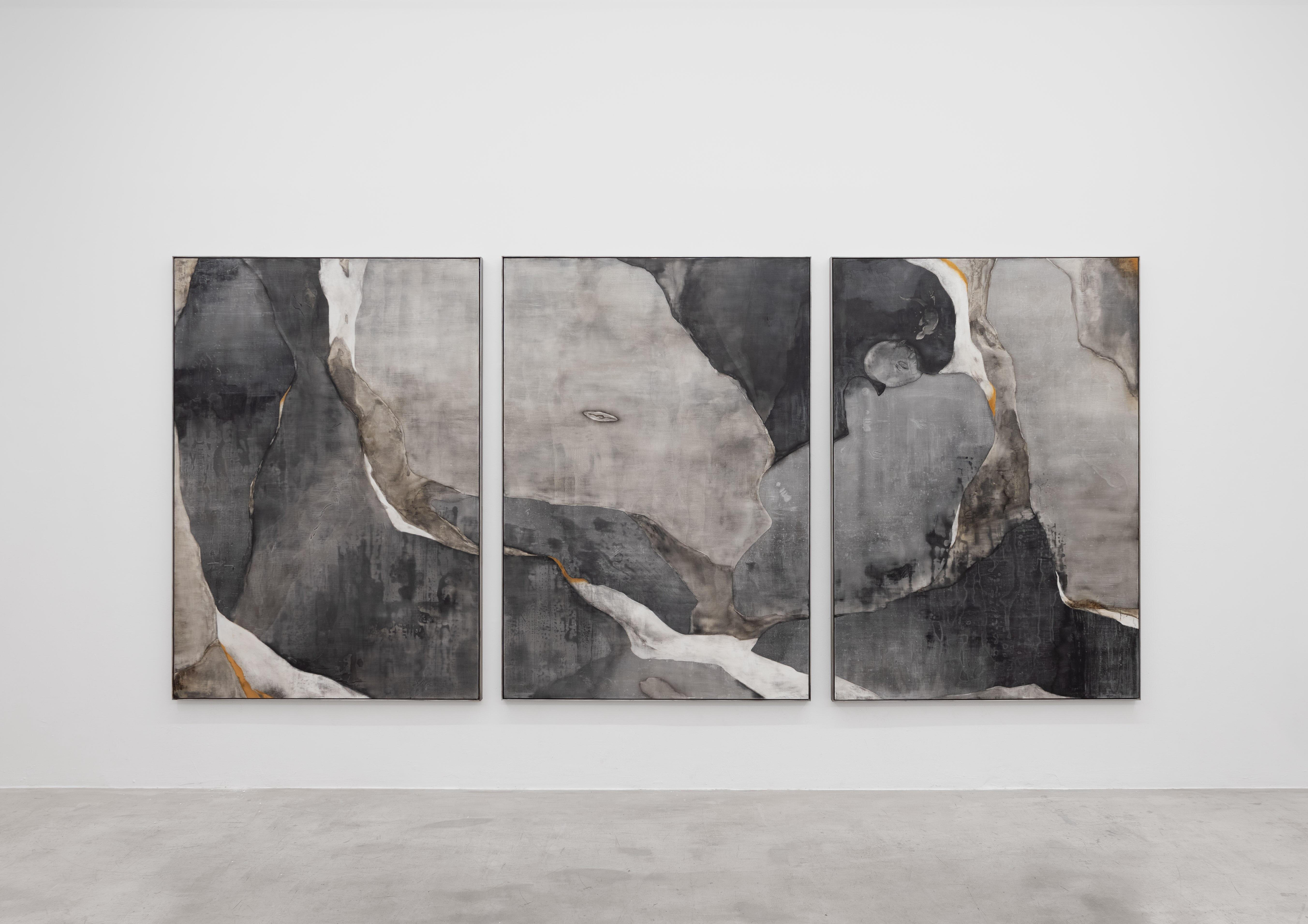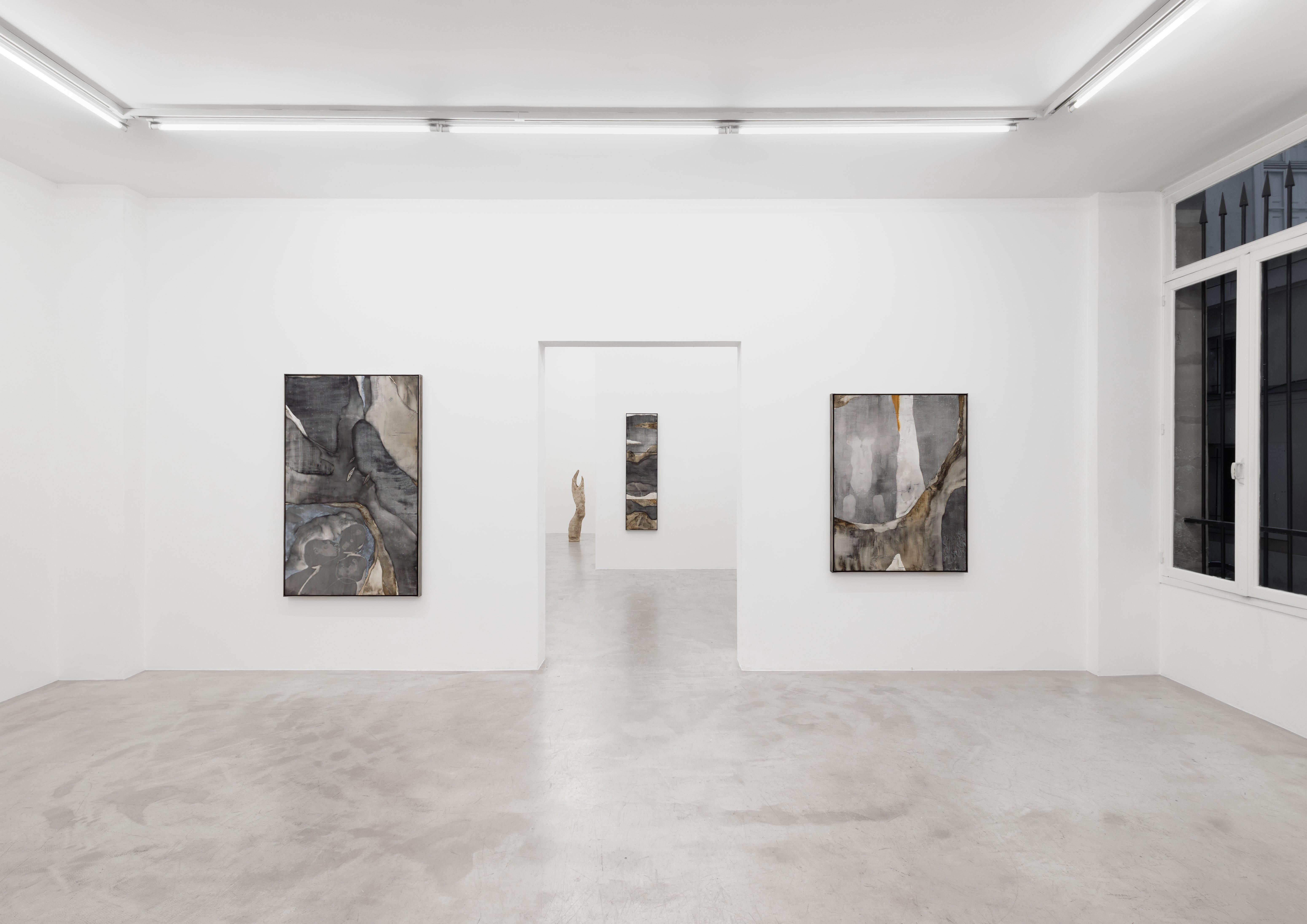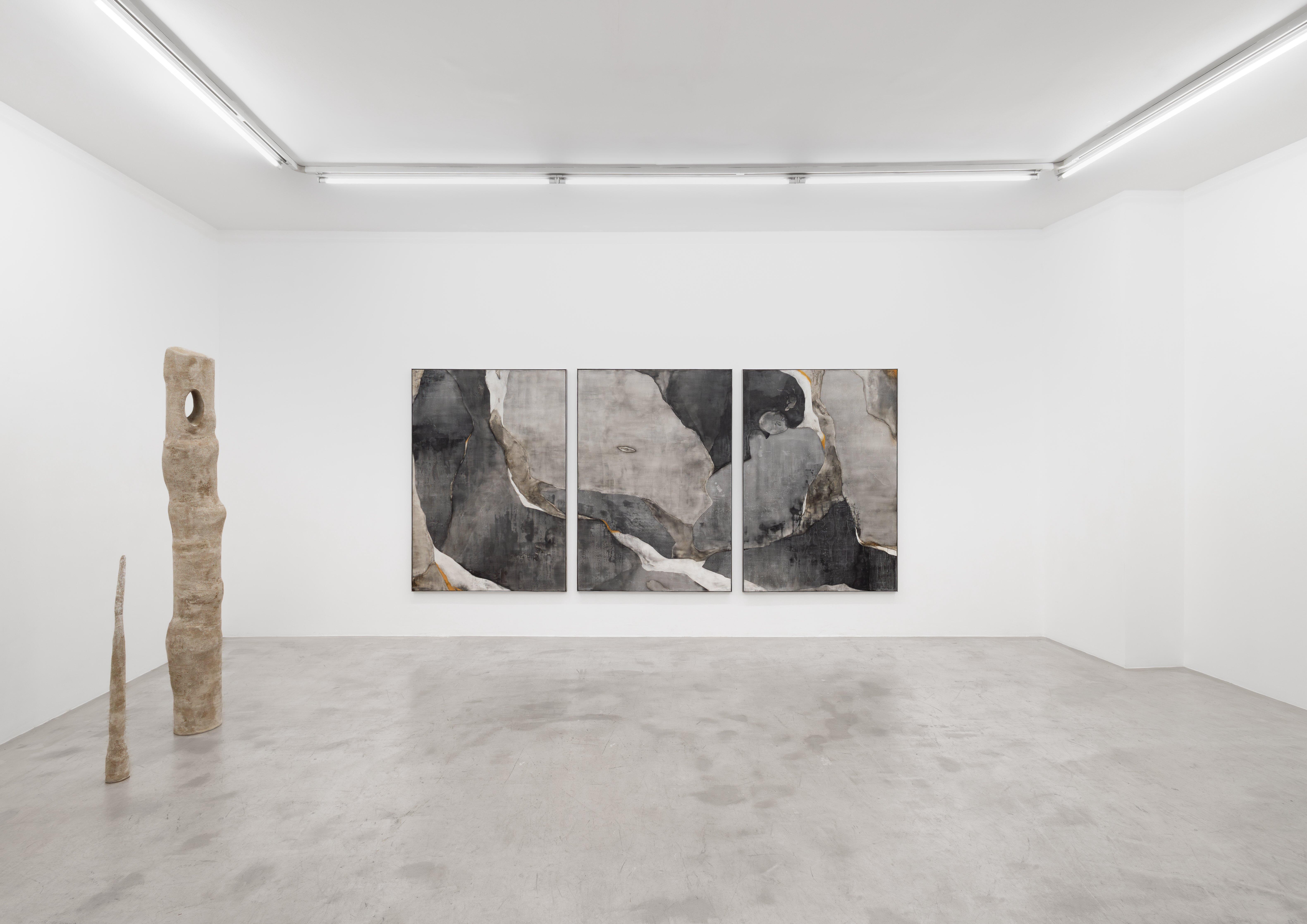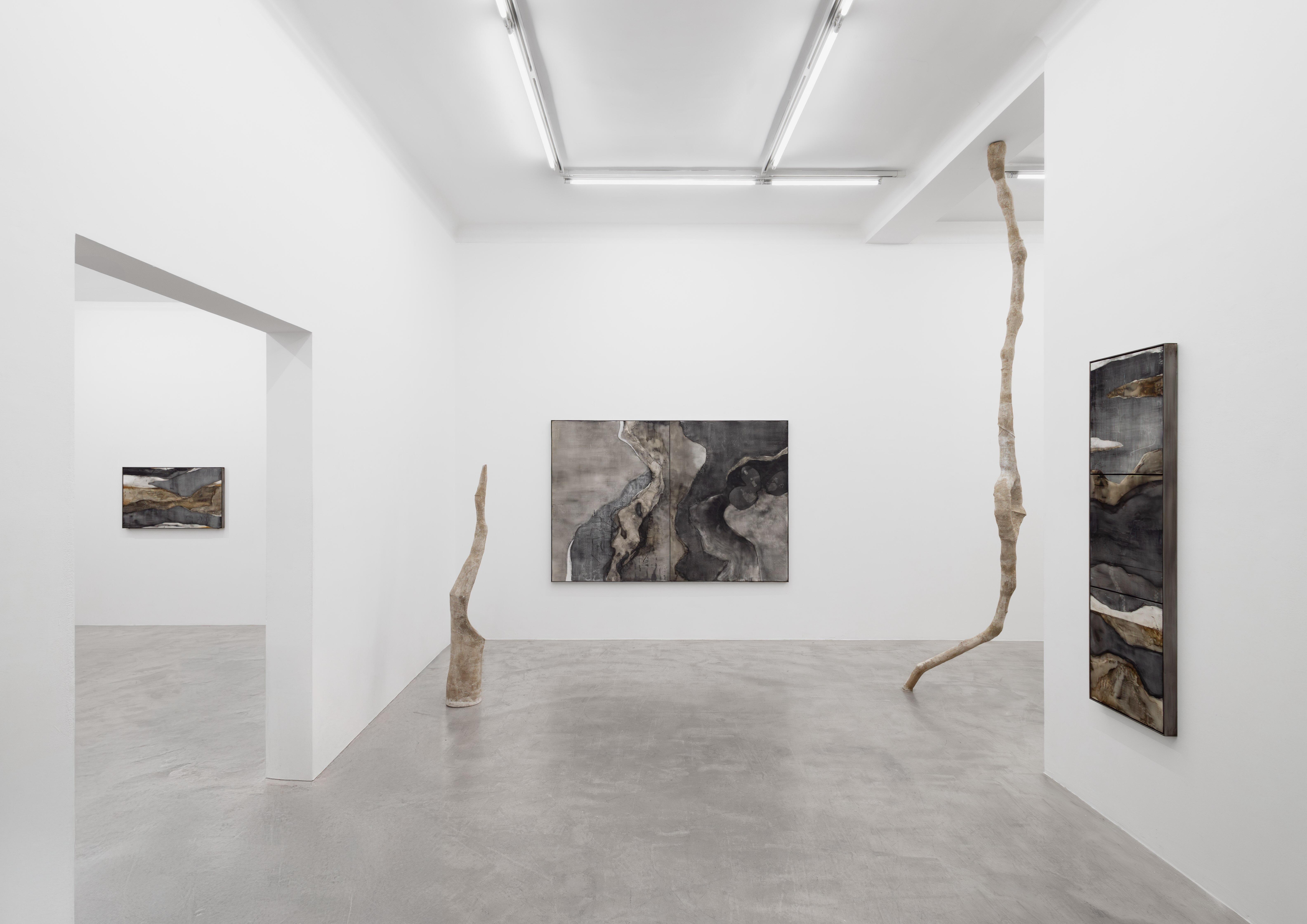 Sculptures and paintings are grounded by natural materials; sumi ink, charcoal, calcium, and shellac form a palette that evokes moonscapes, slate, and silt.