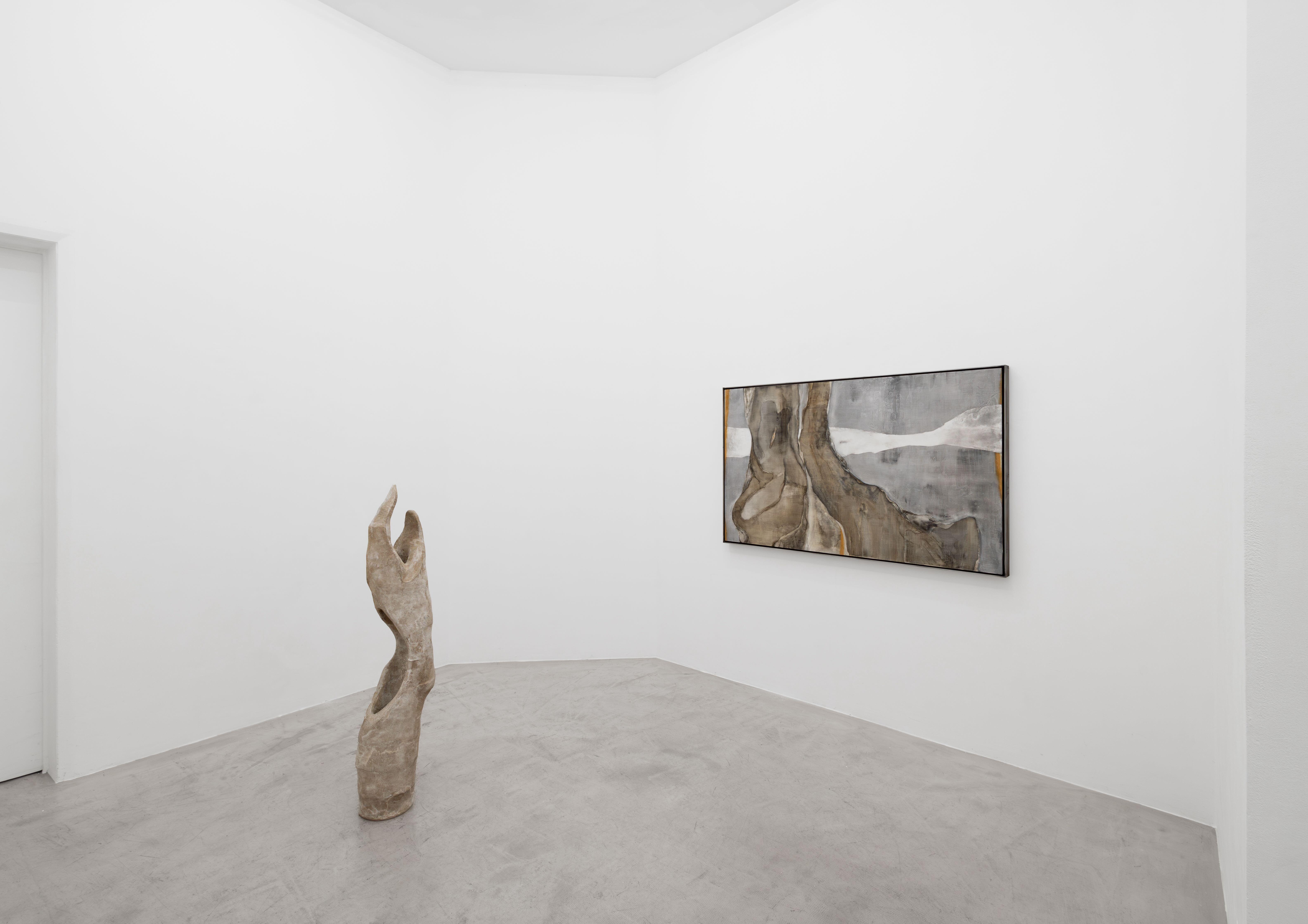 The sculptures echo the paintings in spirit and form, resembling calcified creatures or animate rocks. They both shift their perceived state of being to one of continuous becoming-with, transcending temporal and corporeal borders.