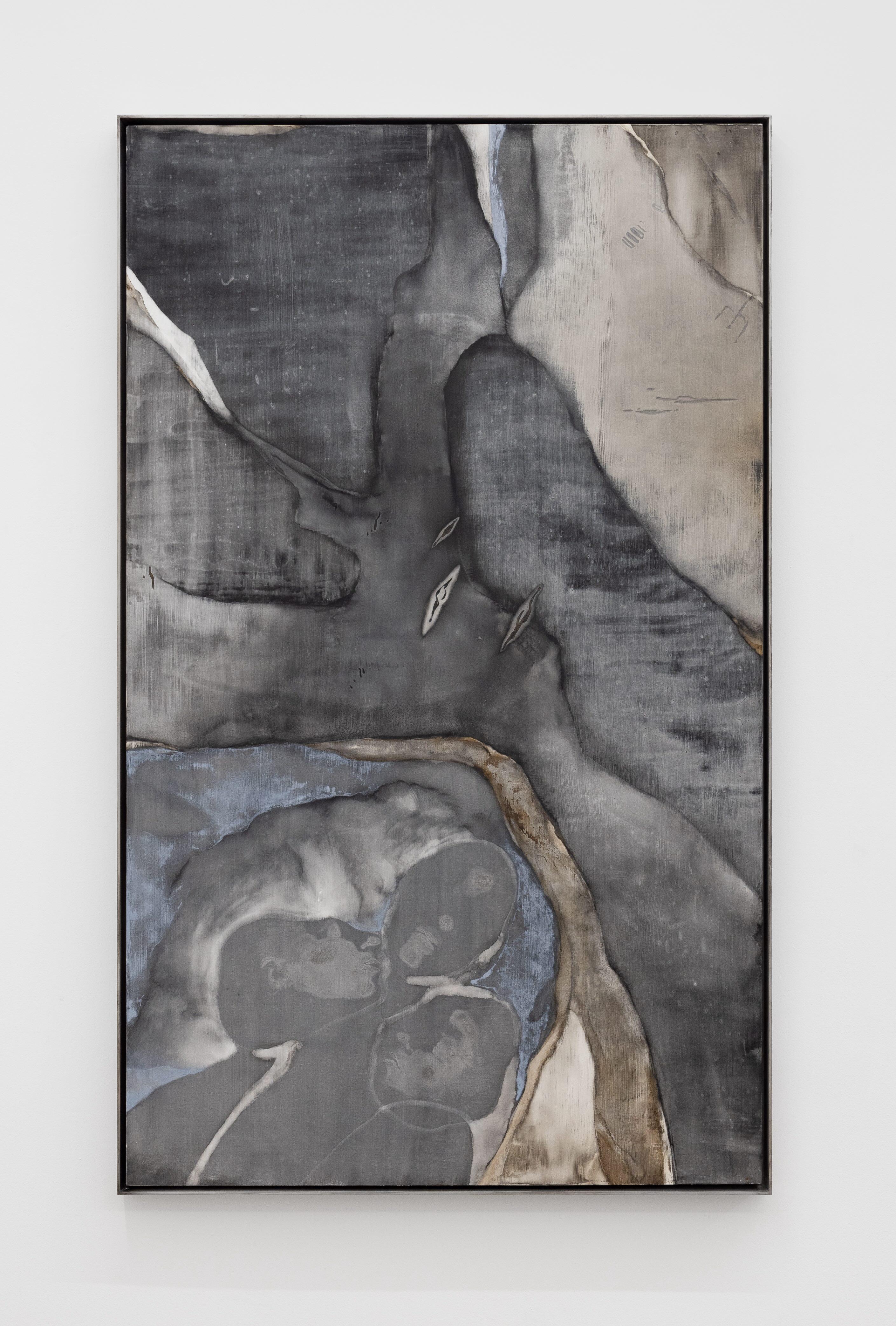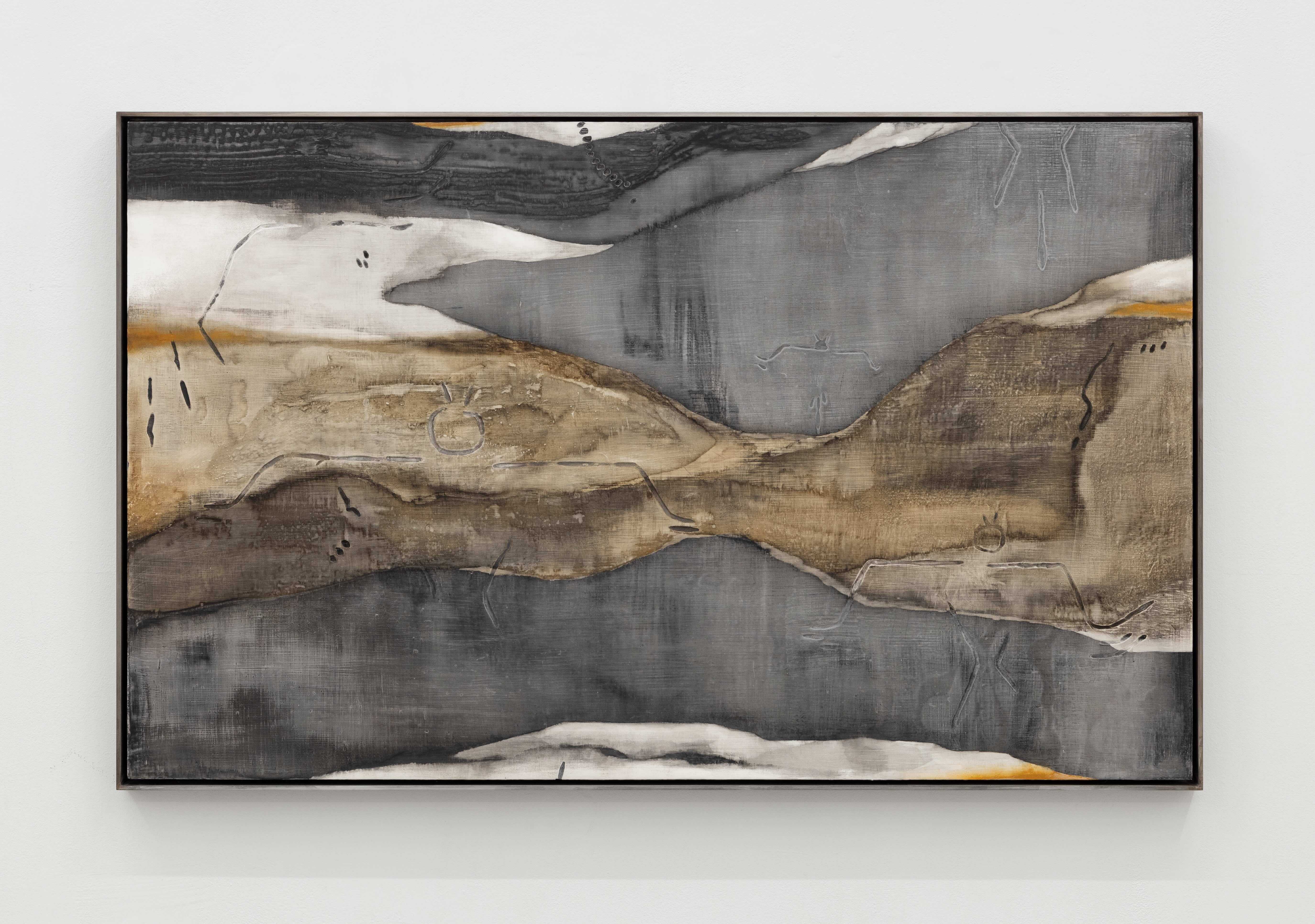 Of the paintings, the artist says her physical, floor-based process reminds her of archeology or gardening. From afar, they resemble geographical or geological formations; aerial views from a flight home, cross sections of strata. But buried within, or emerging from, these terrains are rhythms of code, figures, carvings, and body imprints from which narrative threads can be woven.