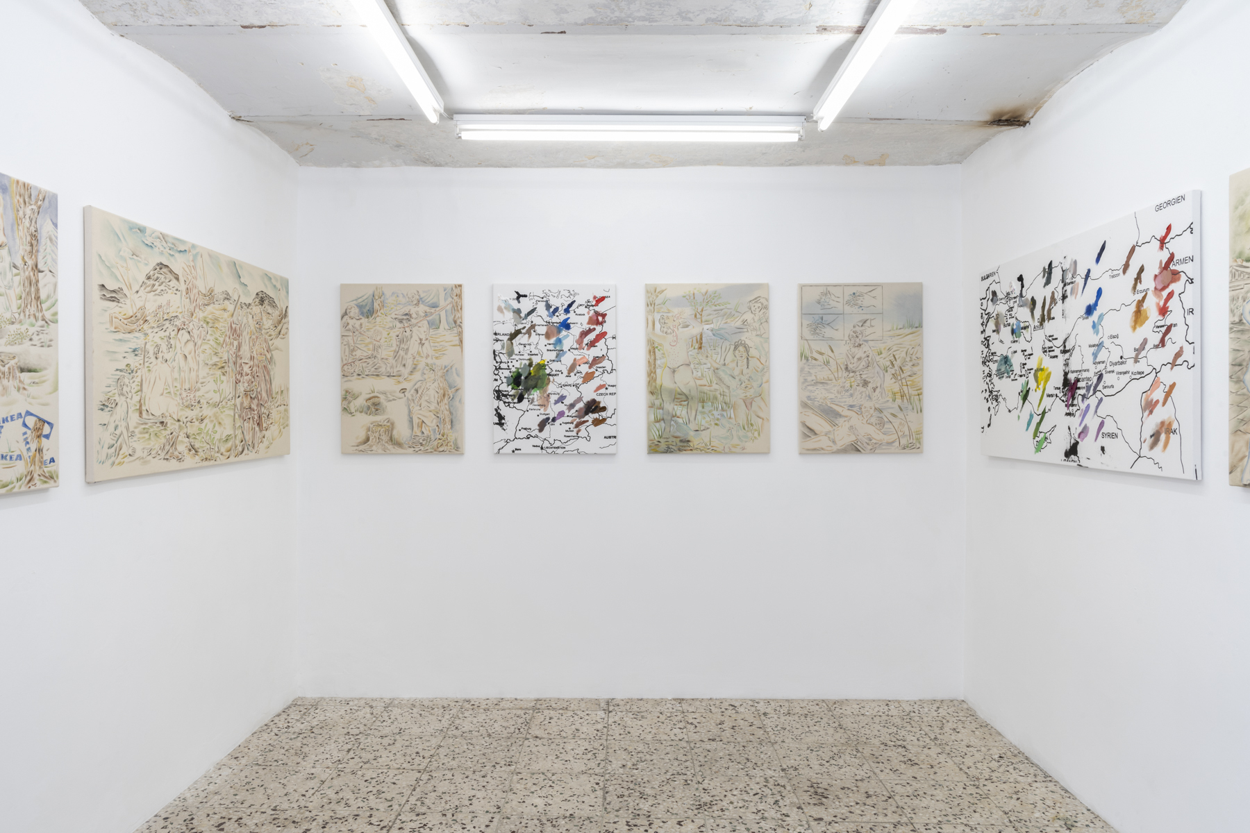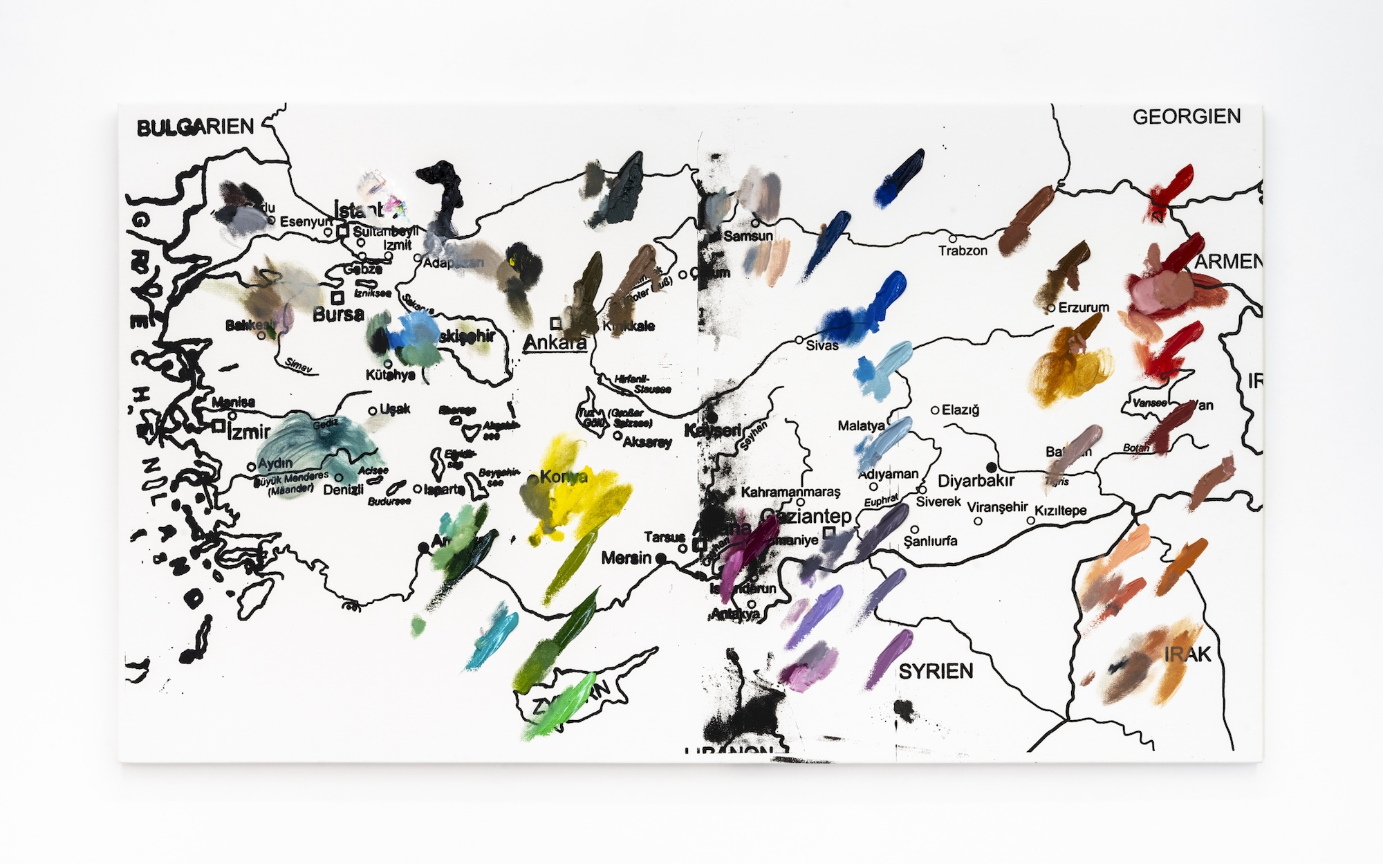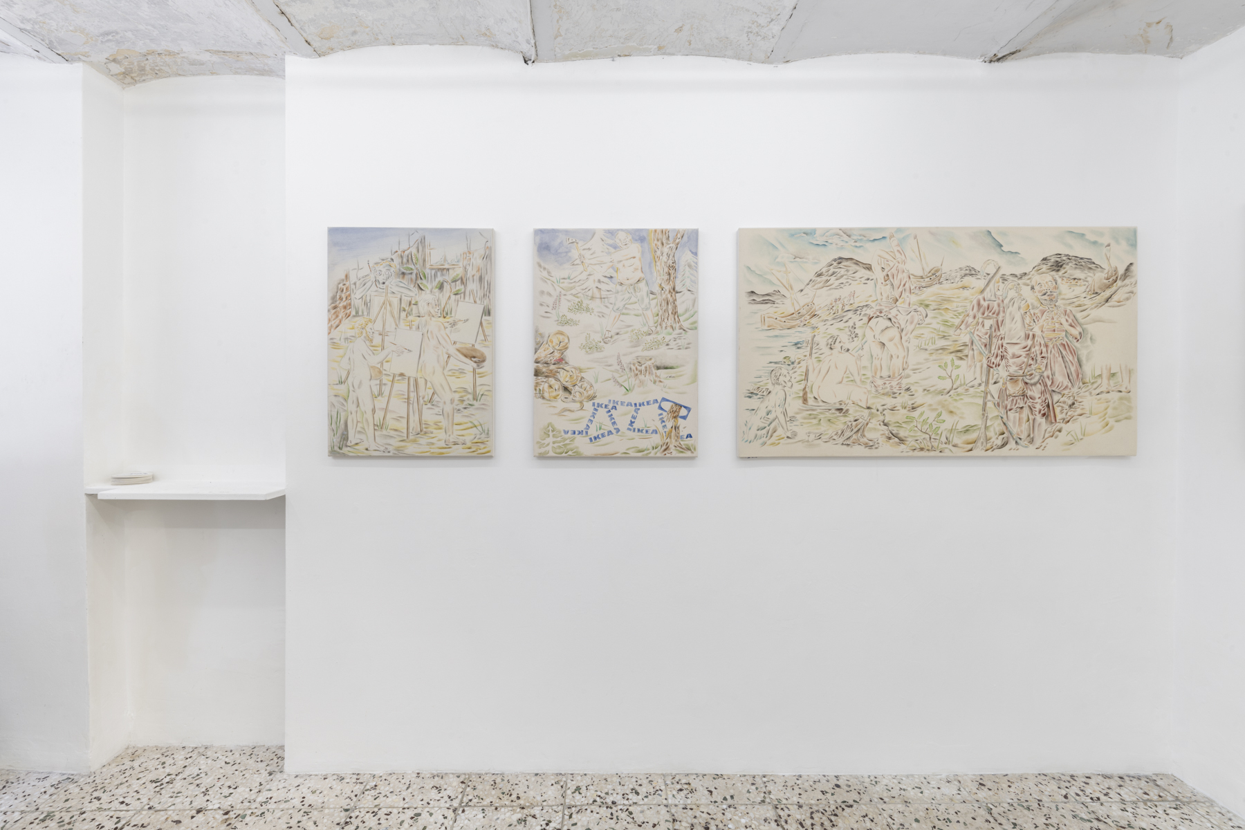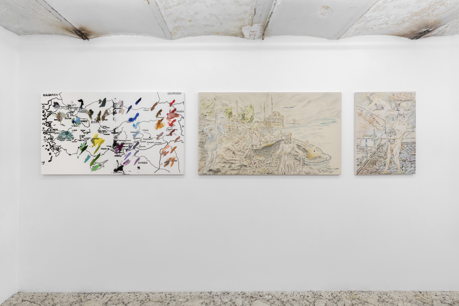 For his solo exhibition “Europa Carnivora” in Kiralık Depo, Berlin-based artist David Schiesser displays a series of subdued oil paintings on canvas. The paintings’ dimensions are defined by the cartographic shape of two countries — Germany and Türkiye. In a style evoking traditional European painting, chaotic narratives informed by contemporary news flow, fantasy, and history play out by way of humans energetically performing any number of actions: chopping, fishing, painting, queuing, telephoning, smoking, and so on. The subtle brushwork and combination of various styles, paired with the exhibition title convey a feeling between unease and sometimes a smile. Breaking the rhythm of these surreal narratives are two silkscreened prints of the maps of Germany and Türkiye overlayed with a palette. By drawing our attention to pictorial representations of both cartography and painting, Schiesser emphasizes a different type of categorical absurdity: a human obsession with flatness and rectangularity. The exhibition is accompanied by a poem written by Schiesser, providing additional layers of interpretation and insight.