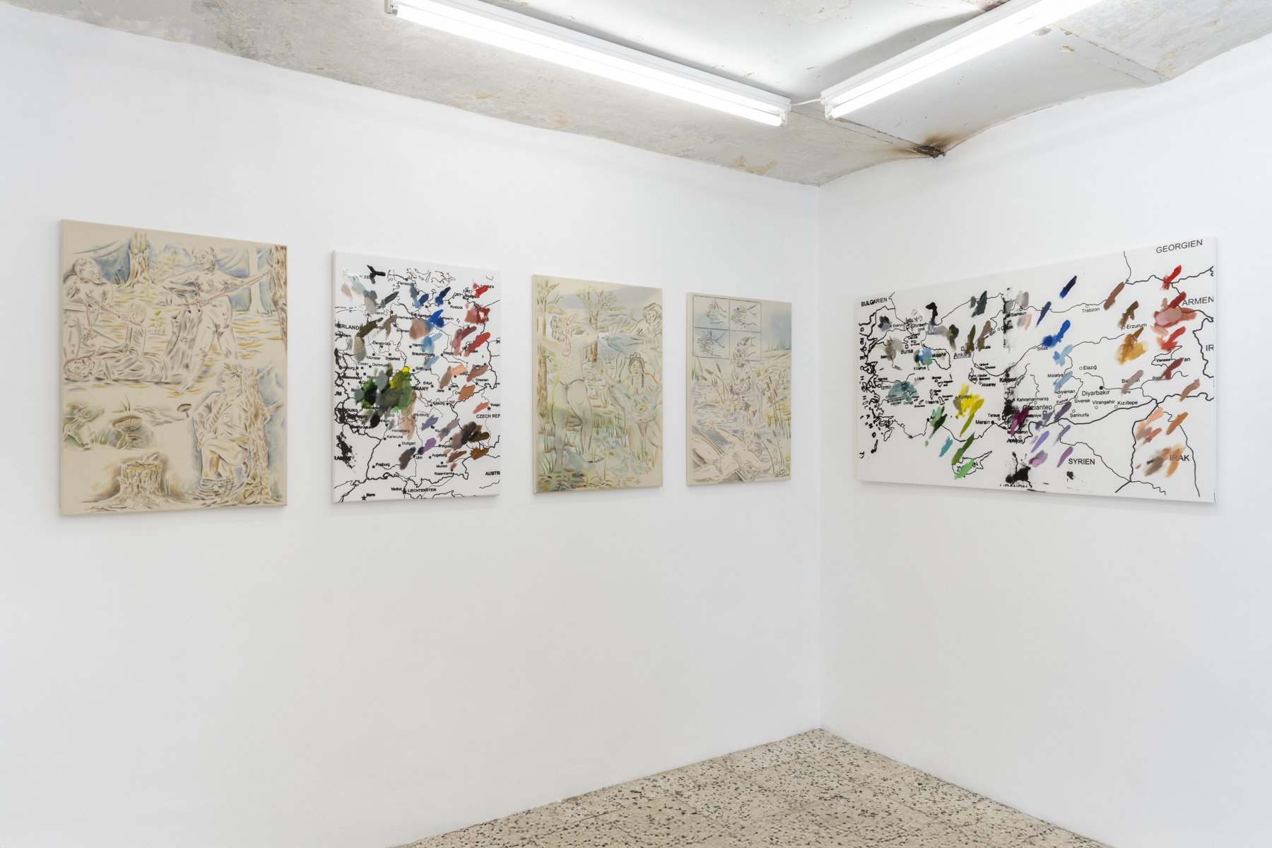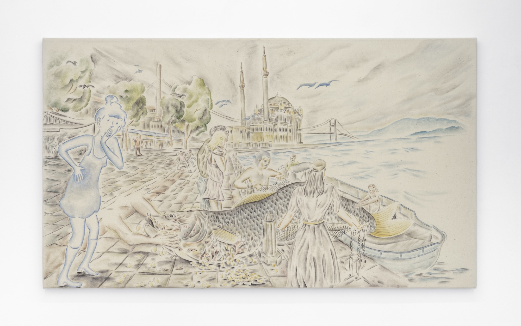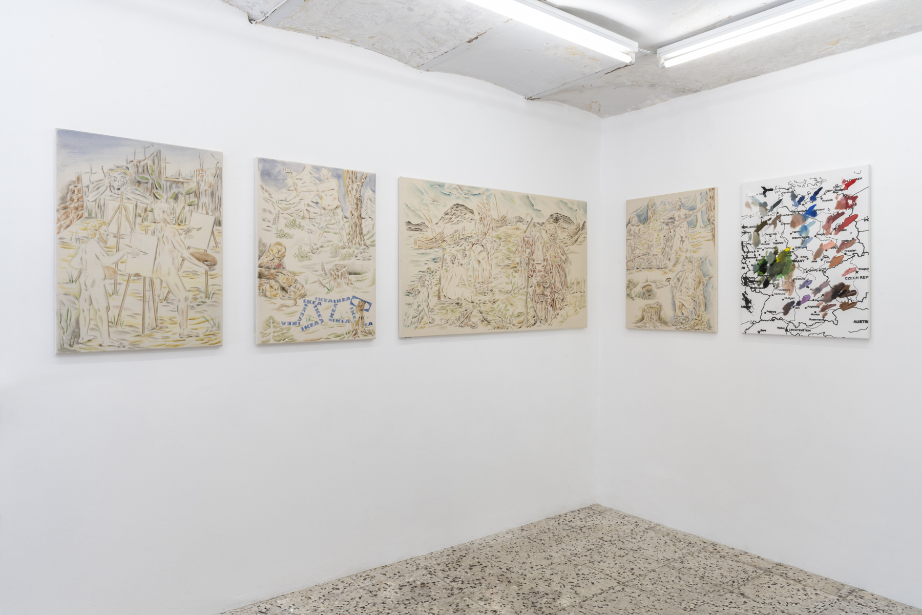 For his solo exhibition “Europa Carnivora” in Kiralık Depo, Berlin-based artist David Schiesser displays a series of subdued oil paintings on canvas. The paintings’ dimensions are defined by the cartographic shape of two countries — Germany and Türkiye. In a style evoking traditional European painting, chaotic narratives informed by contemporary news flow, fantasy, and history play out by way of humans energetically performing any number of actions: chopping, fishing, painting, queuing, telephoning, smoking, and so on. The subtle brushwork and combination of various styles, paired with the exhibition title convey a feeling between unease and sometimes a smile. Breaking the rhythm of these surreal narratives are two silkscreened prints of the maps of Germany and Türkiye overlayed with a palette. By drawing our attention to pictorial representations of both cartography and painting, Schiesser emphasizes a different type of categorical absurdity: a human obsession with flatness and rectangularity. The exhibition is accompanied by a poem written by Schiesser, providing additional layers of interpretation and insight.