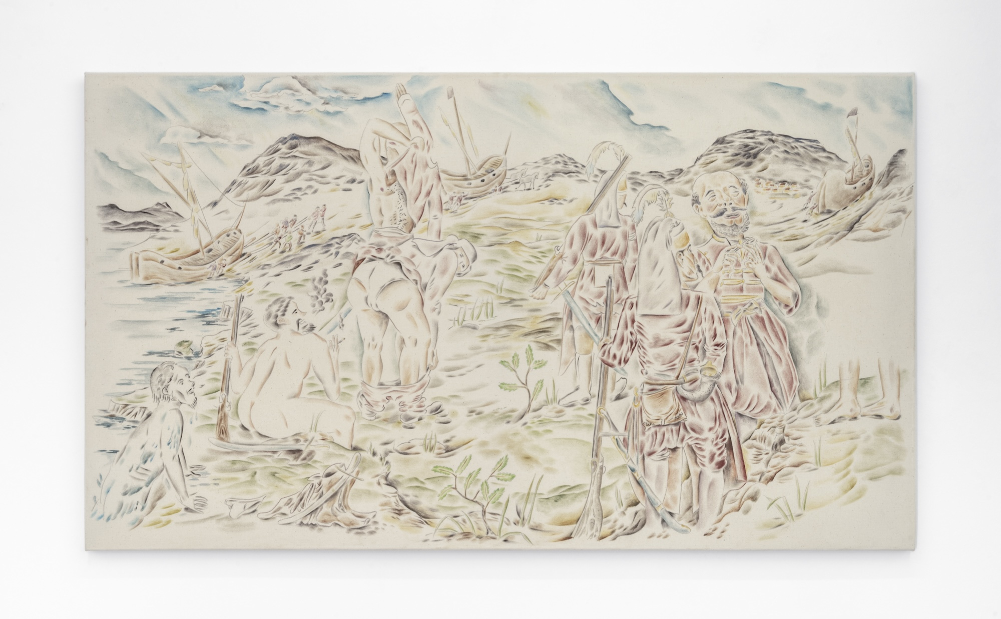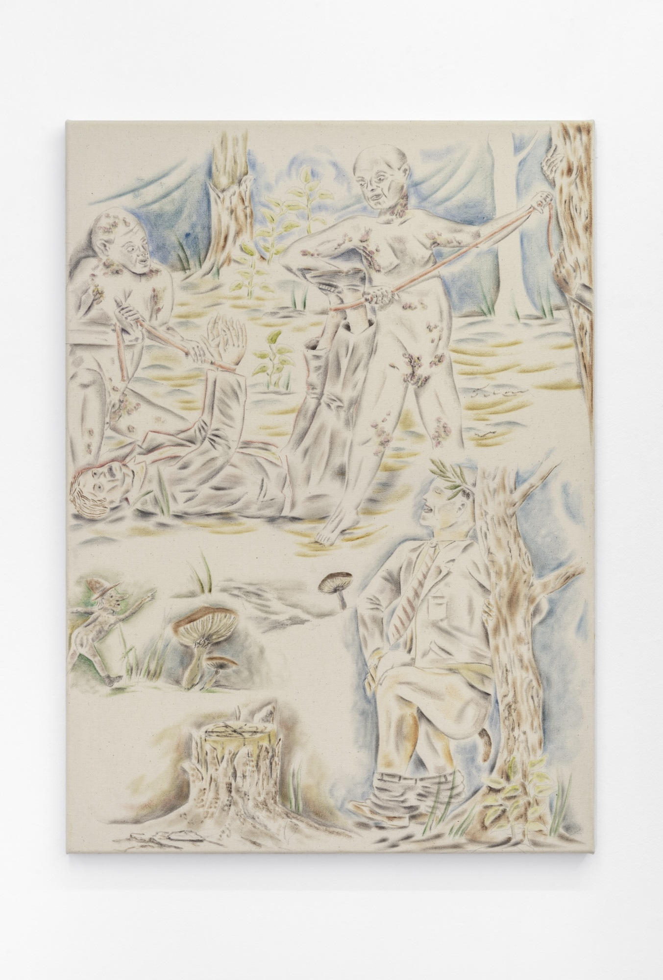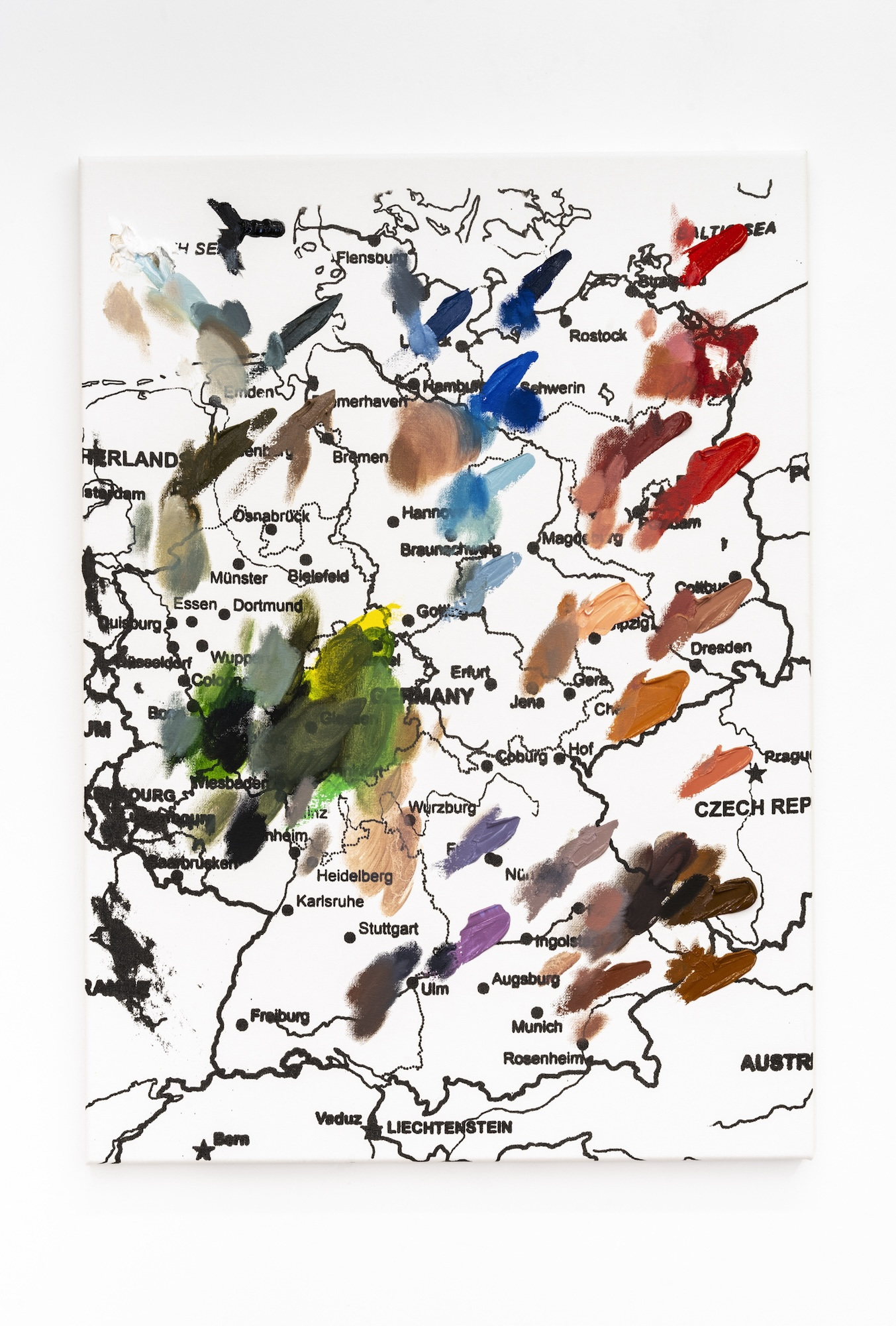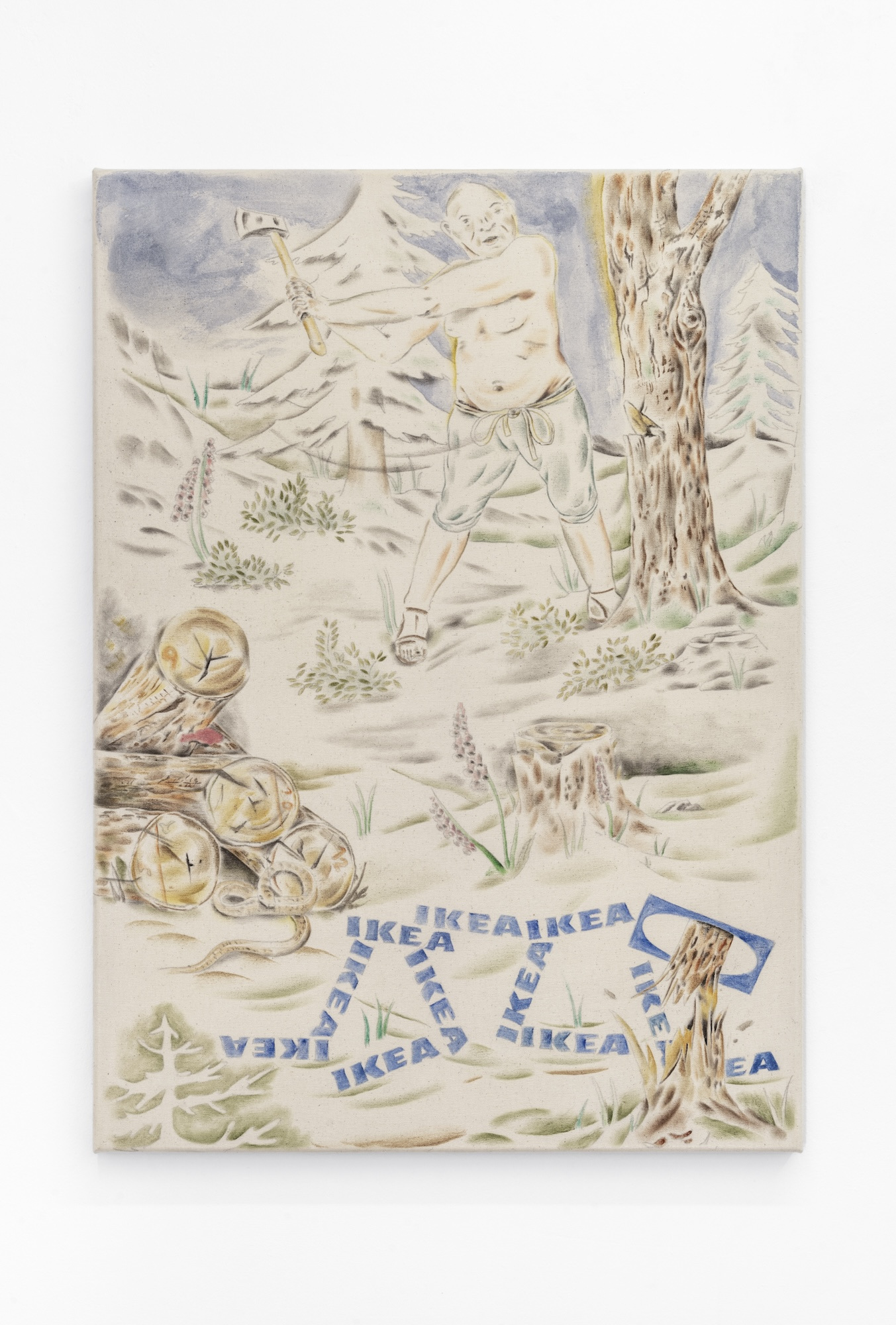 For his solo exhibition “Europa Carnivora” in Kiralık Depo, Berlin-based artist David Schiesser displays a series of subdued oil paintings on canvas. The paintings’ dimensions are defined by the cartographic shape of two countries — Germany and Türkiye. In a style evoking traditional European painting, chaotic narratives informed by contemporary news flow, fantasy, and history play out by way of humans energetically performing any number of actions: chopping, fishing, painting, queuing, telephoning, smoking, and so on. The subtle brushwork and combination of various styles, paired with the exhibition title convey a feeling between unease and sometimes a smile. Breaking the rhythm of these surreal narratives are two silkscreened prints of the maps of Germany and Türkiye overlayed with a palette. By drawing our attention to pictorial representations of both cartography and painting, Schiesser emphasizes a different type of categorical absurdity: a human obsession with flatness and rectangularity. The exhibition is accompanied by a poem written by Schiesser, providing additional layers of interpretation and insight.