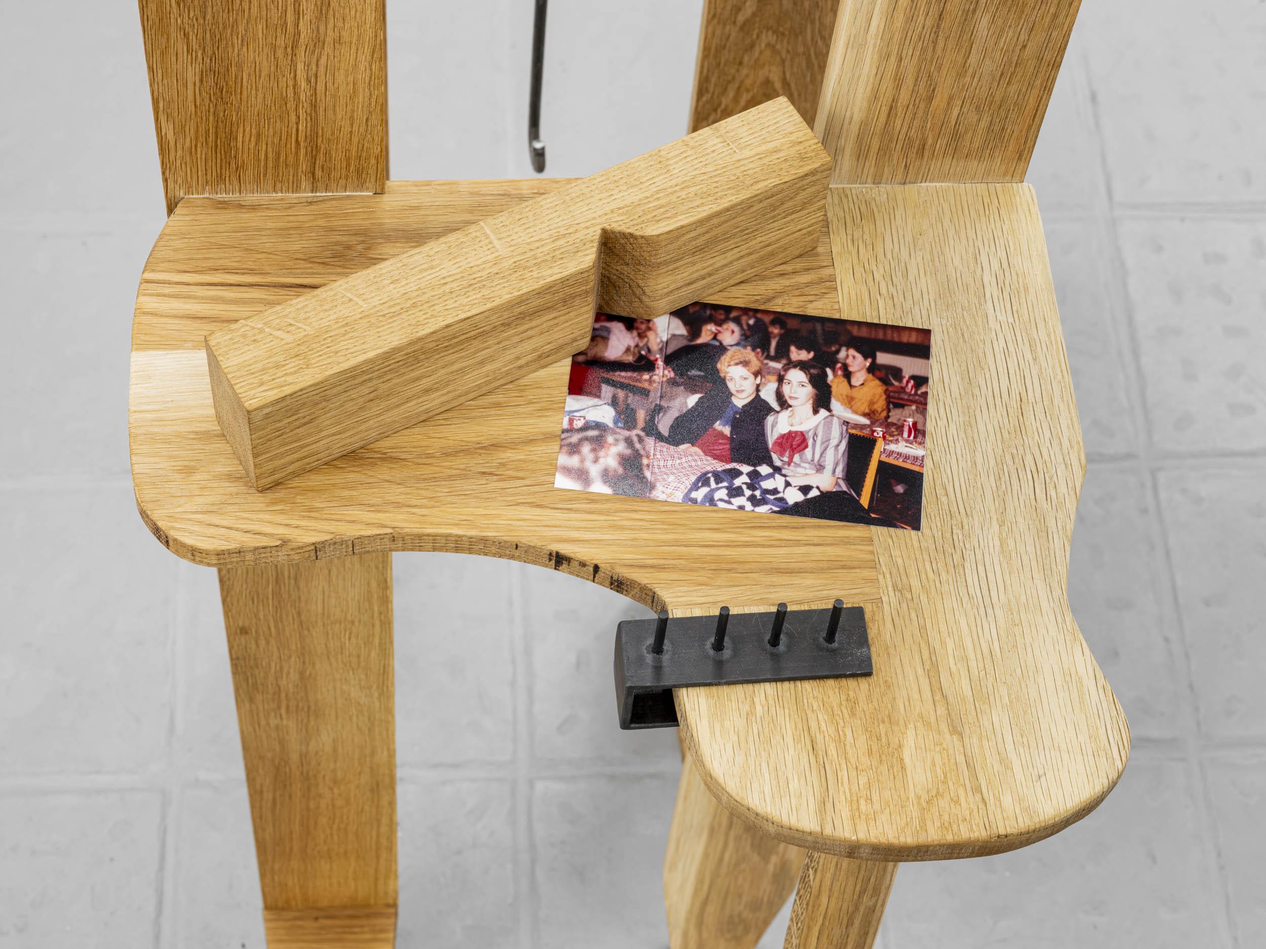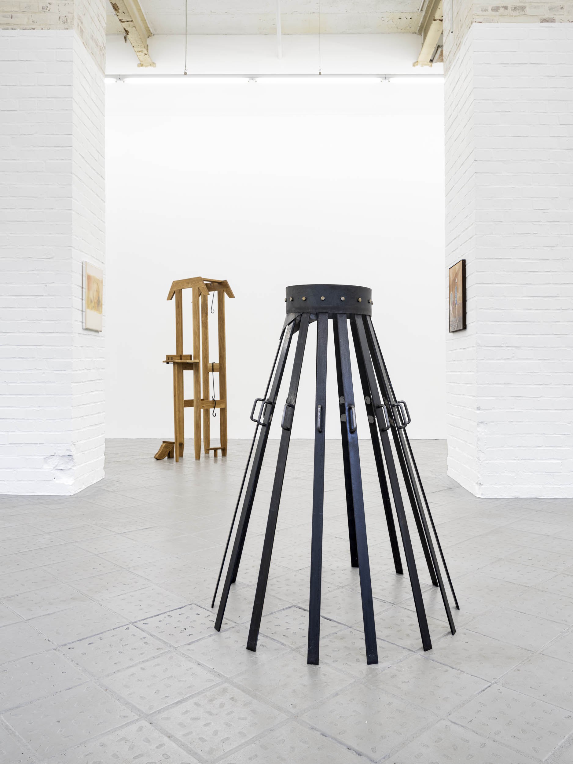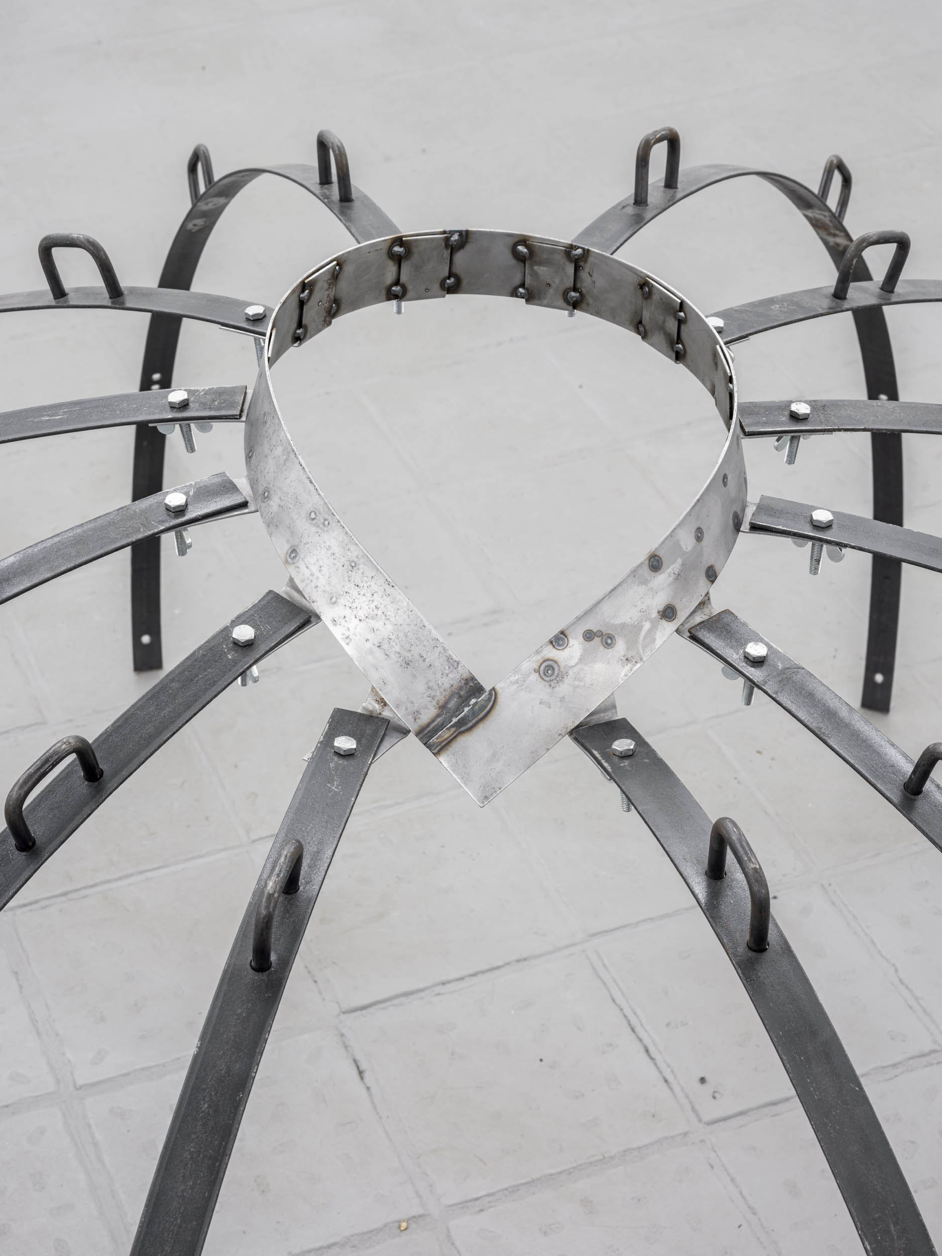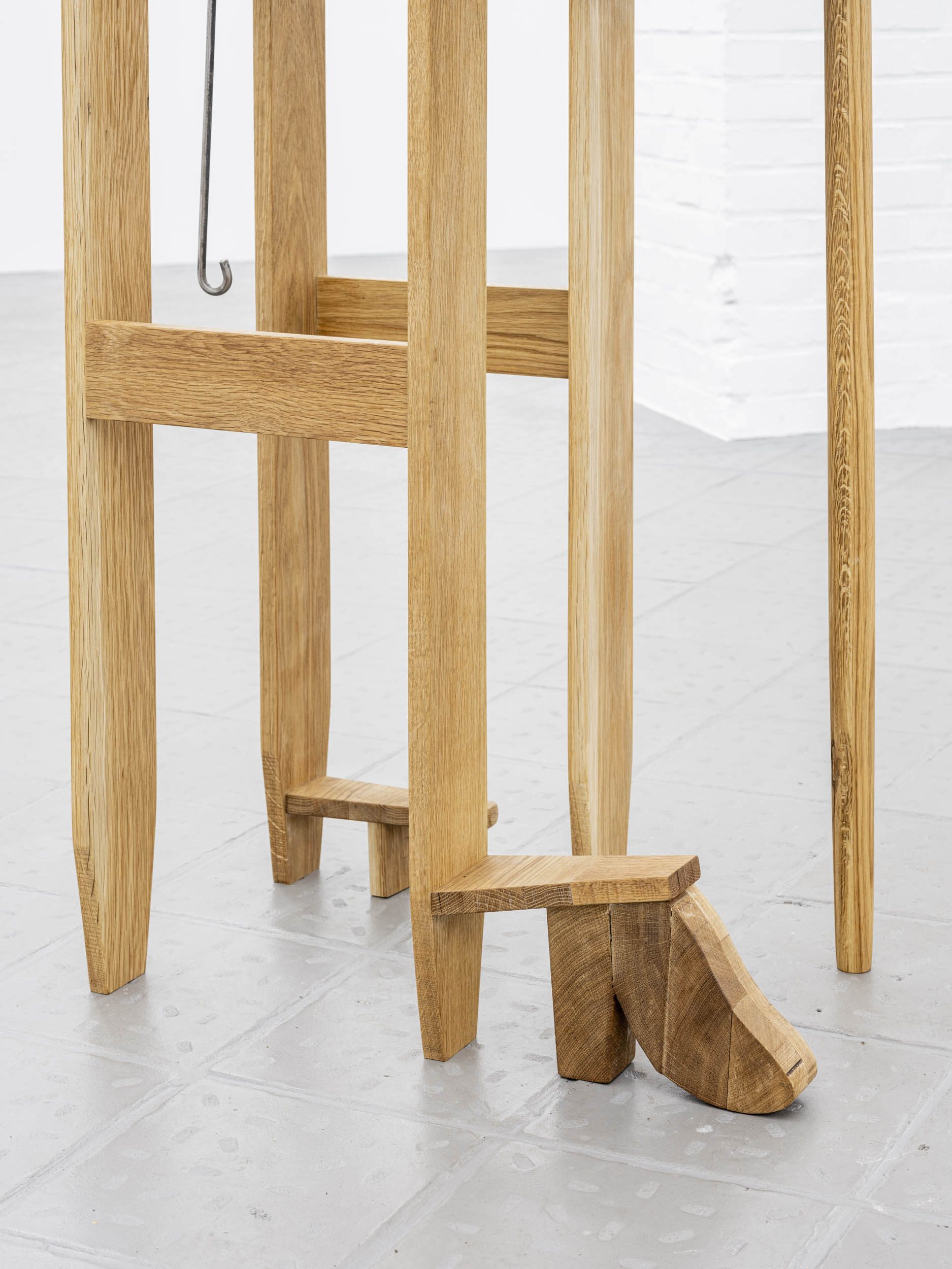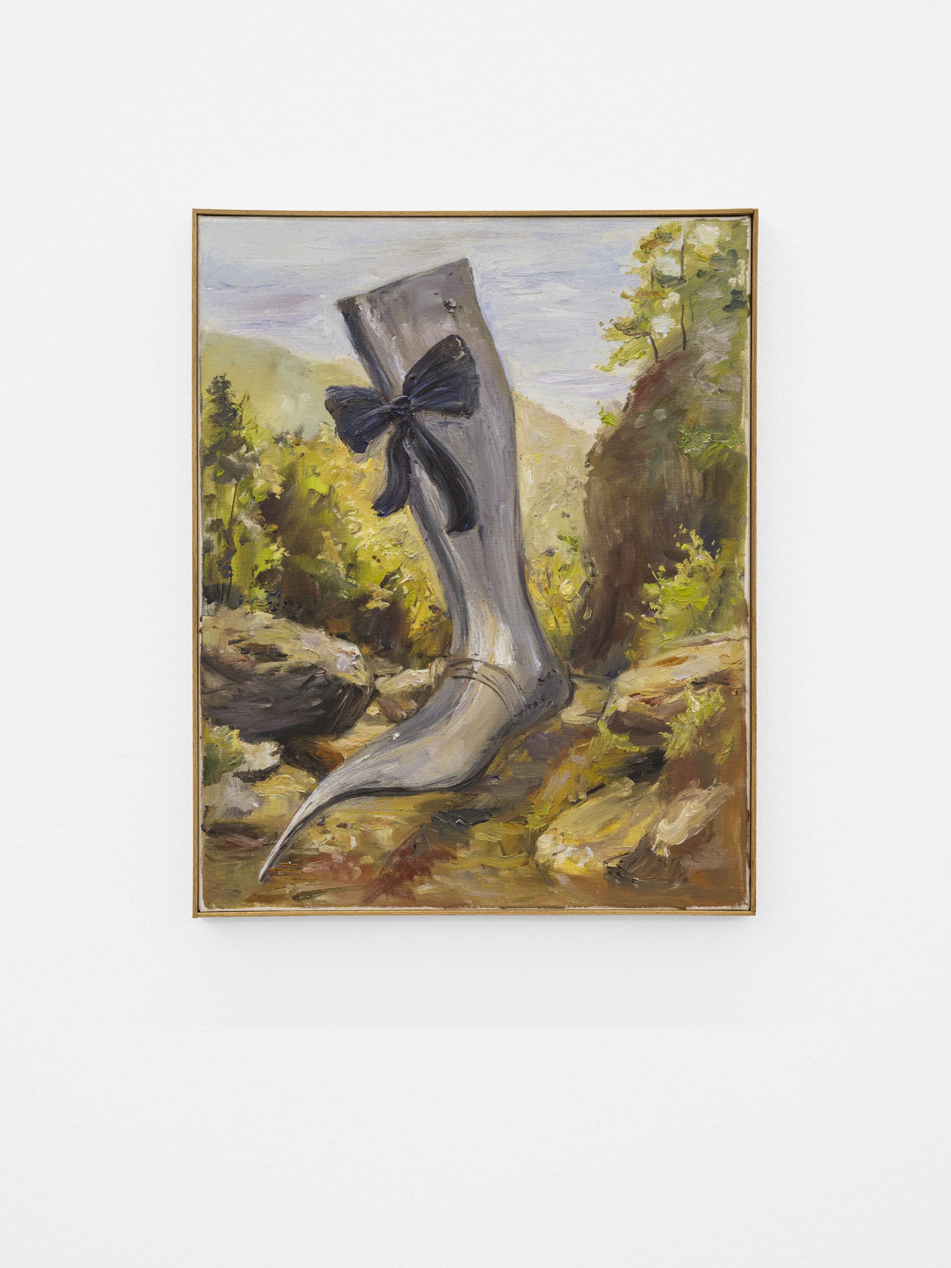 “Hovering, an iron beak-shoe with bow-adorned leg-tube rises in majestic verticality over the gently rolling hills of Département XX. Sharp and curved, the construct gives no appearance of wanting to merge with the rocky terrain of nature. One wonders: What do you want here, if not to destroy? With the additional adorned mourning ribbon that turns you into a thorny widow, you tower like a parallel creation into the breathtaking expanse of a horizontal – nature – without the slightest indication of wanting to hide. Are you perhaps a narcissist in your conspicuous, artificial otherness? Or do you stand as a subject of freedom and self-confidence, as an autonomous cogito, in an environment that no longer can express itself as an independent intuition in the same way?” (Peggy Pehl)