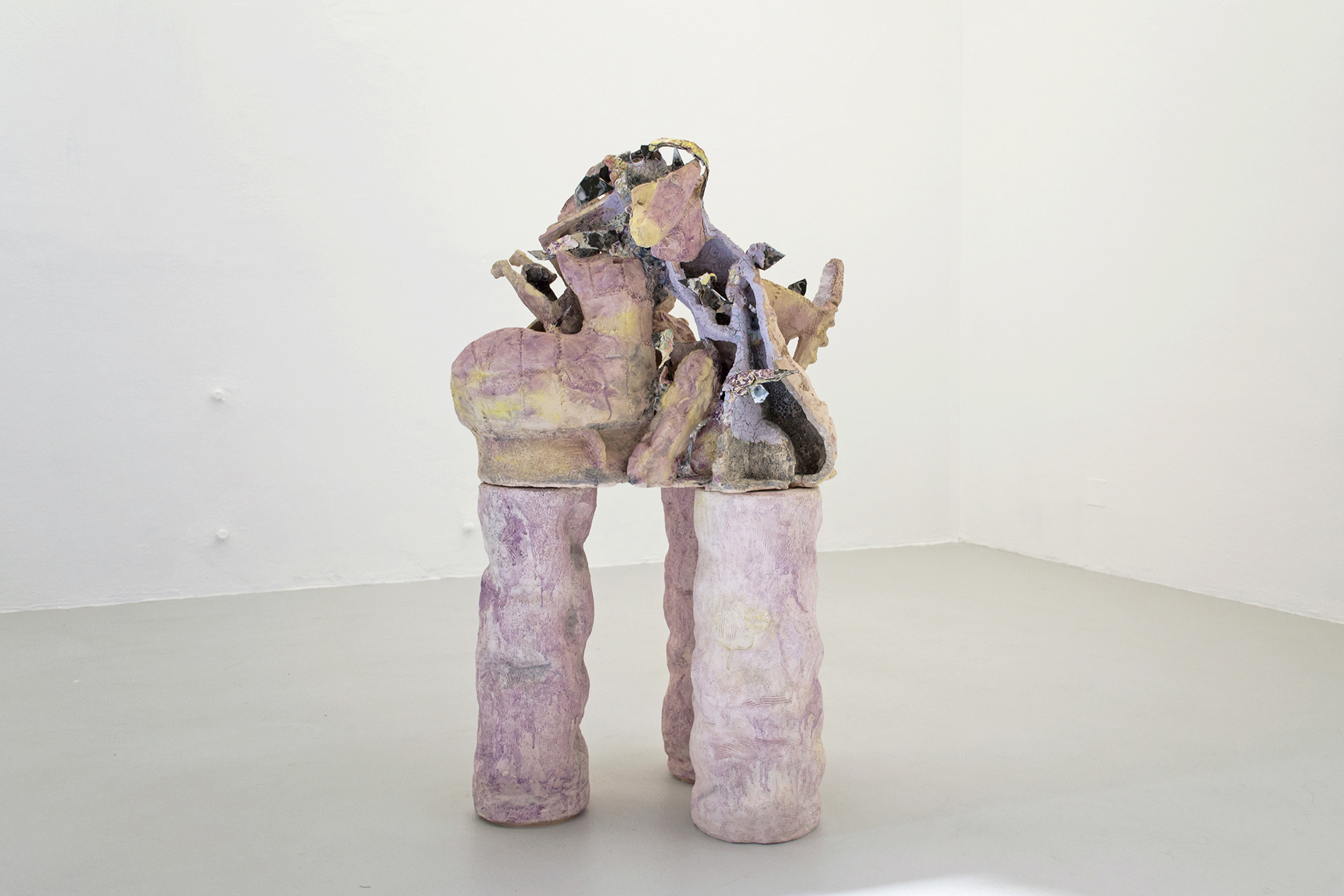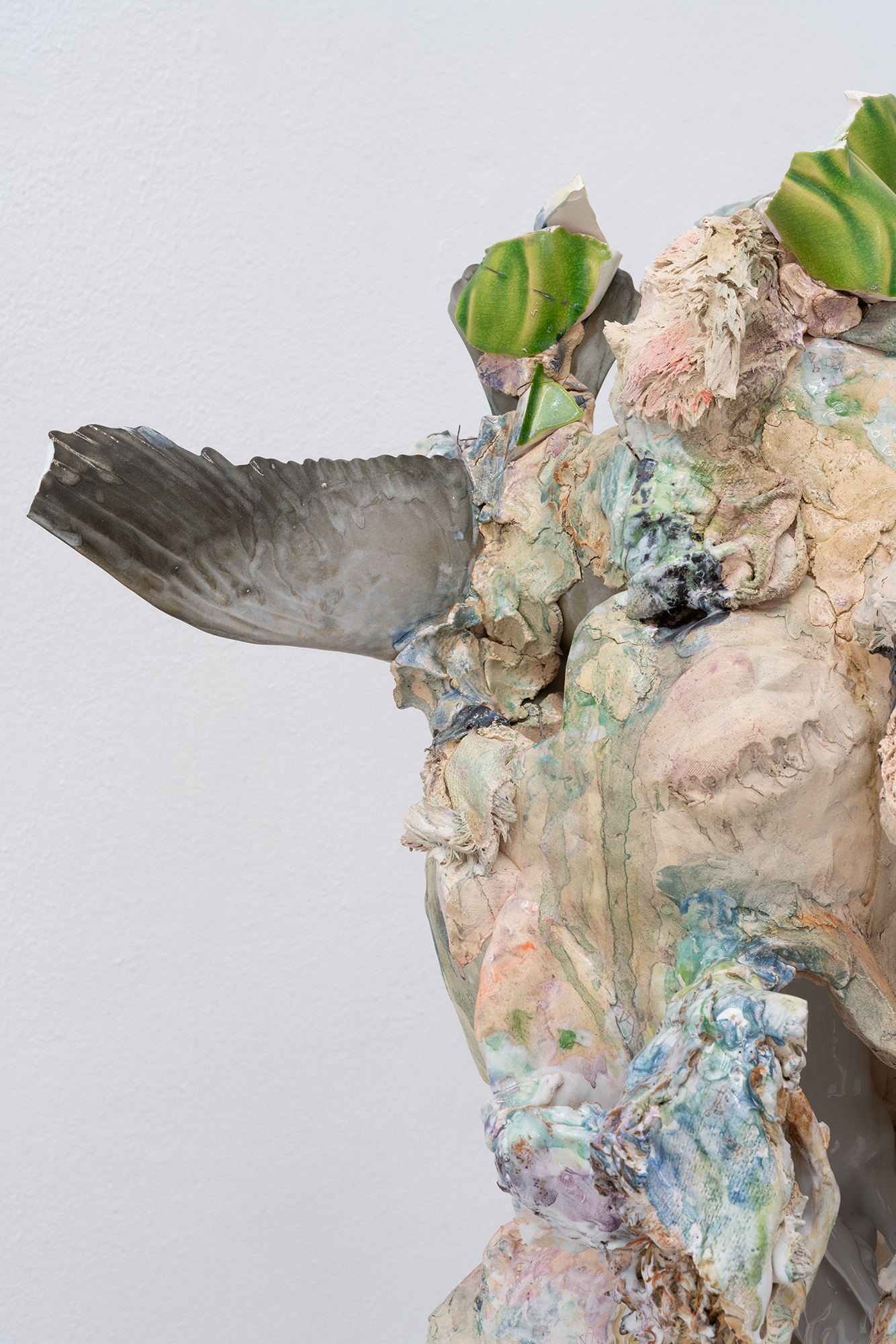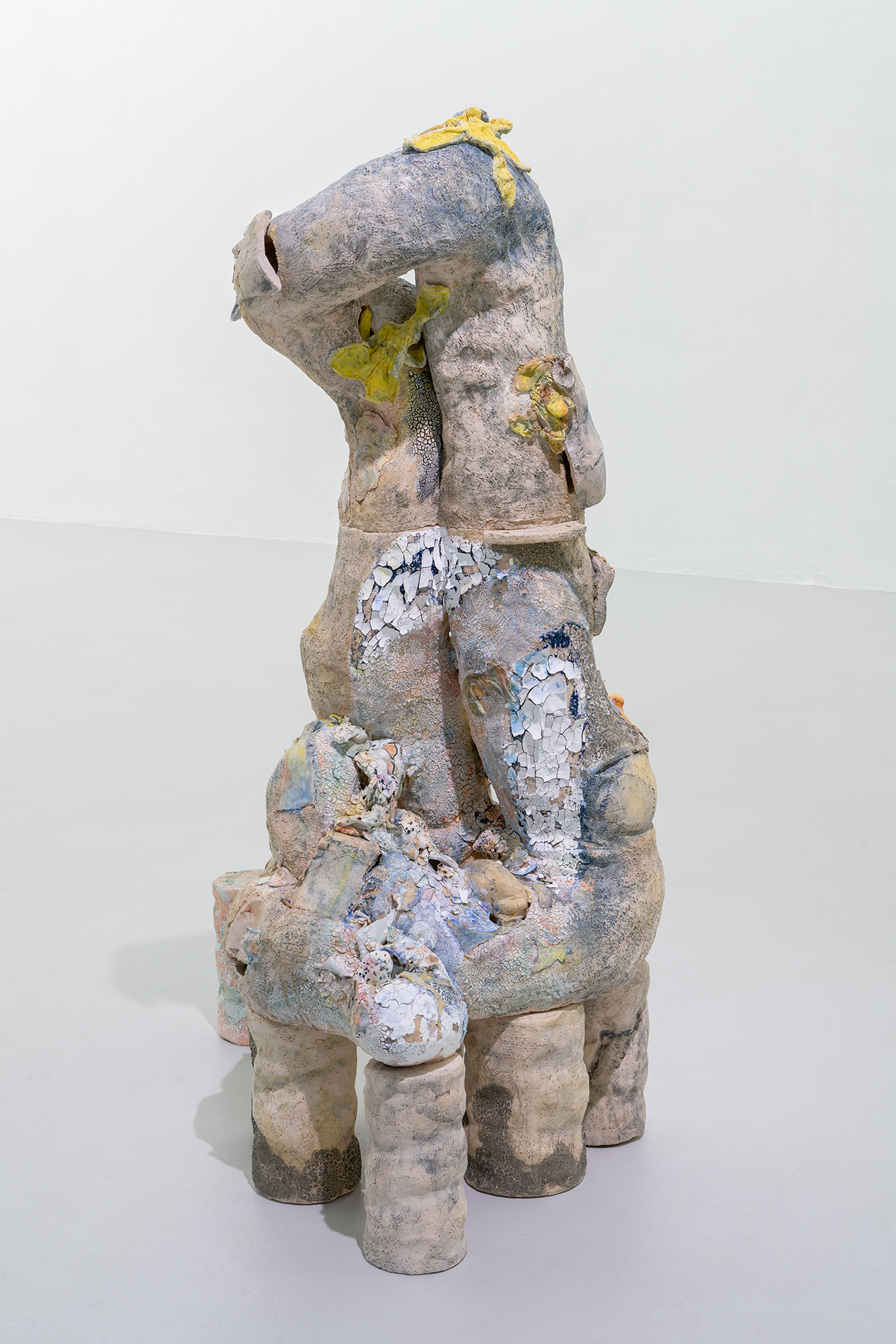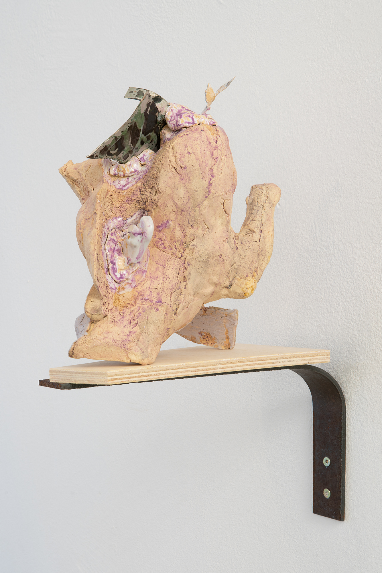 Julia Klemm's sculptures expand the traditional boundaries of the ceramic medium. In addition to classically modelled clay, 3D-printed molds are used, textile fragments, stuffed animals, pieces of metal and, above all, parts of second-hand ceramic figures are also processed into assemblages.