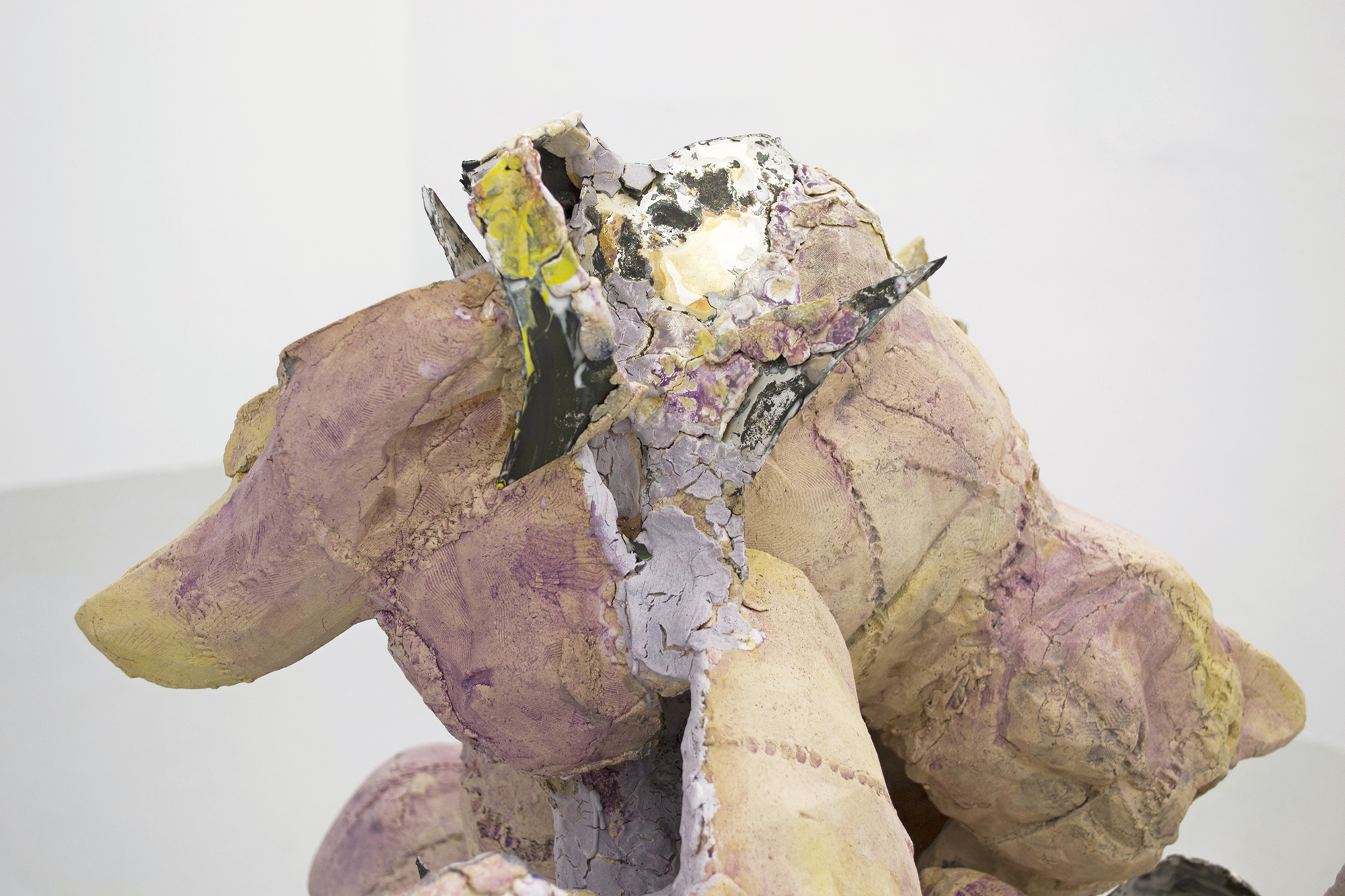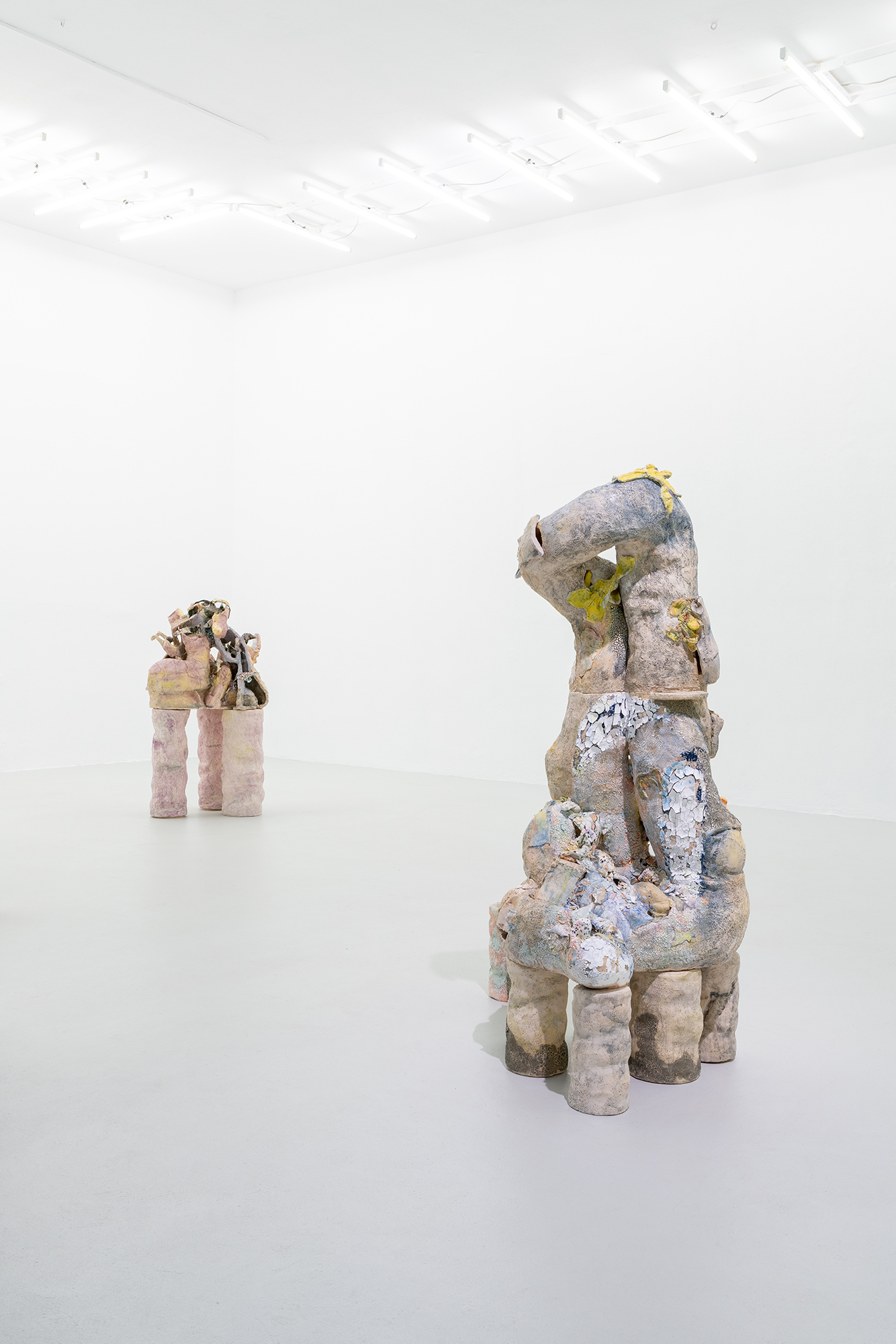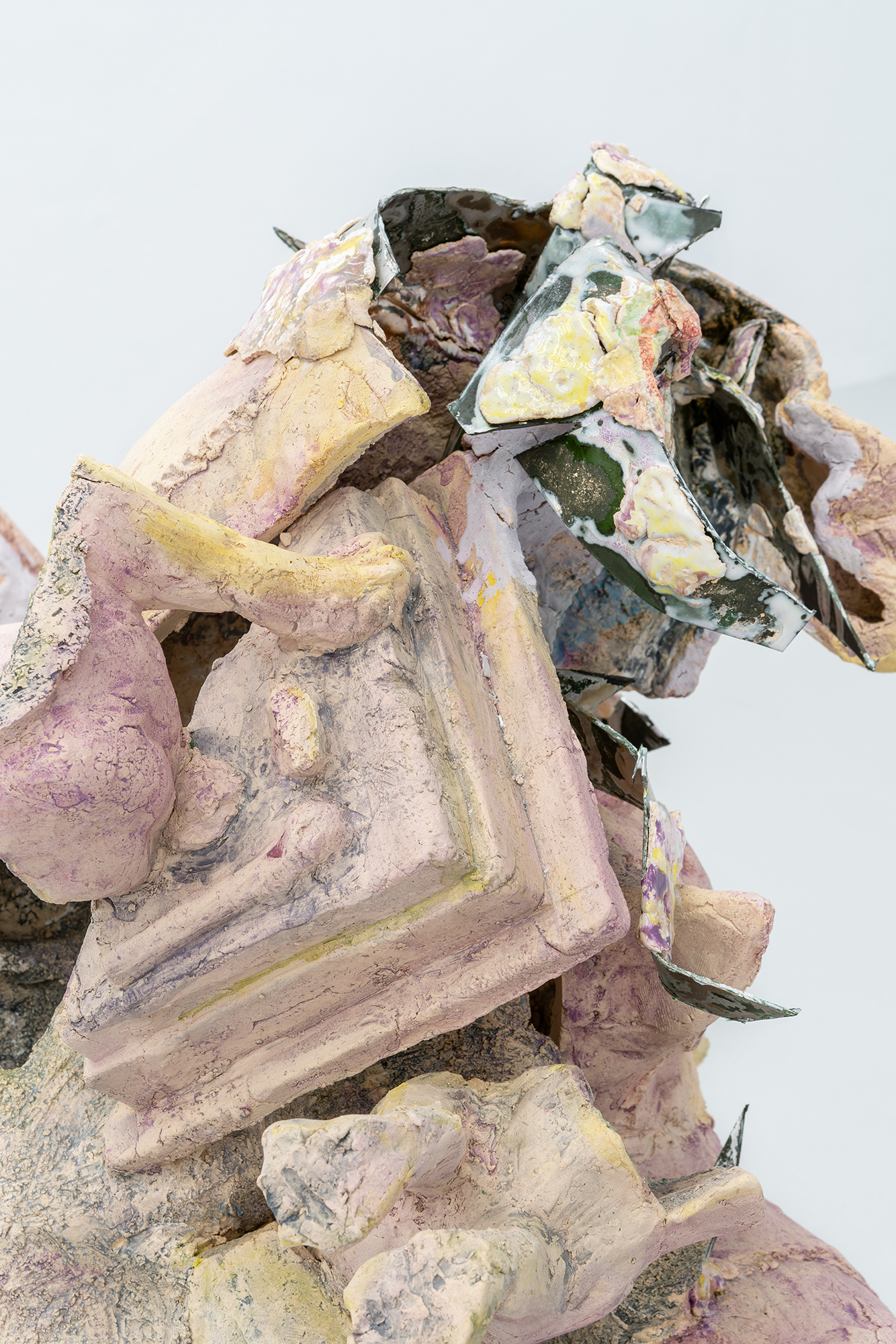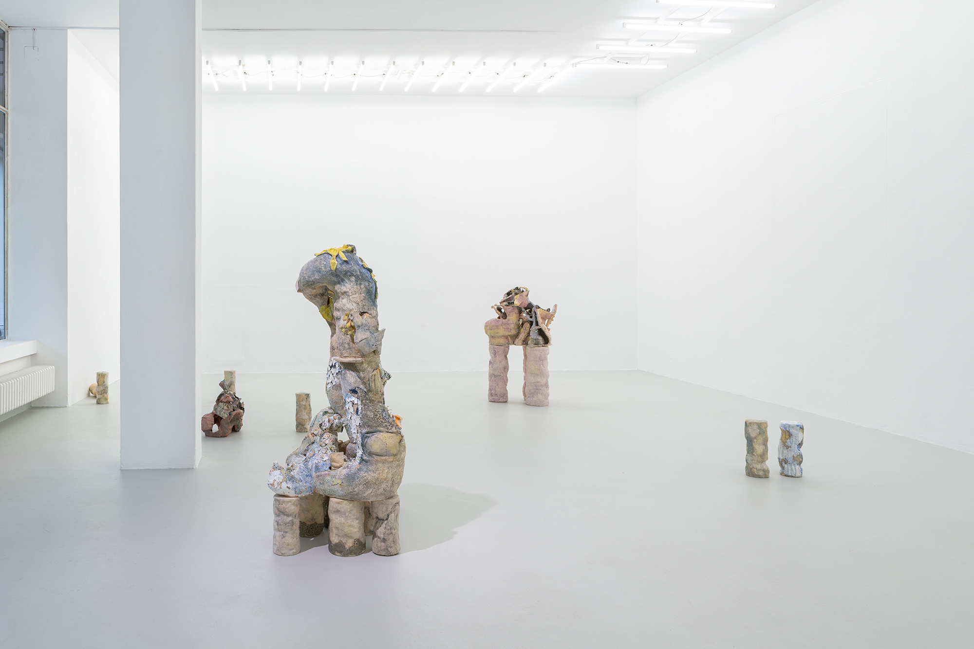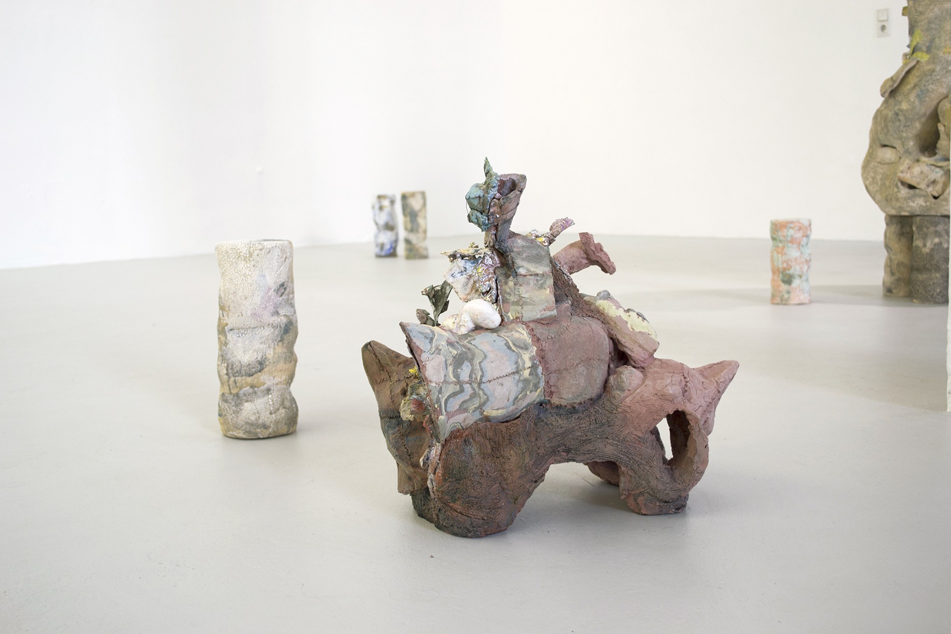 Julia Klemm's sculptures expand the traditional boundaries of the ceramic medium. In addition to classically modelled clay, 3D-printed molds are used, textile fragments, stuffed animals, pieces of metal and, above all, parts of second-hand ceramic figures are also processed into assemblages.