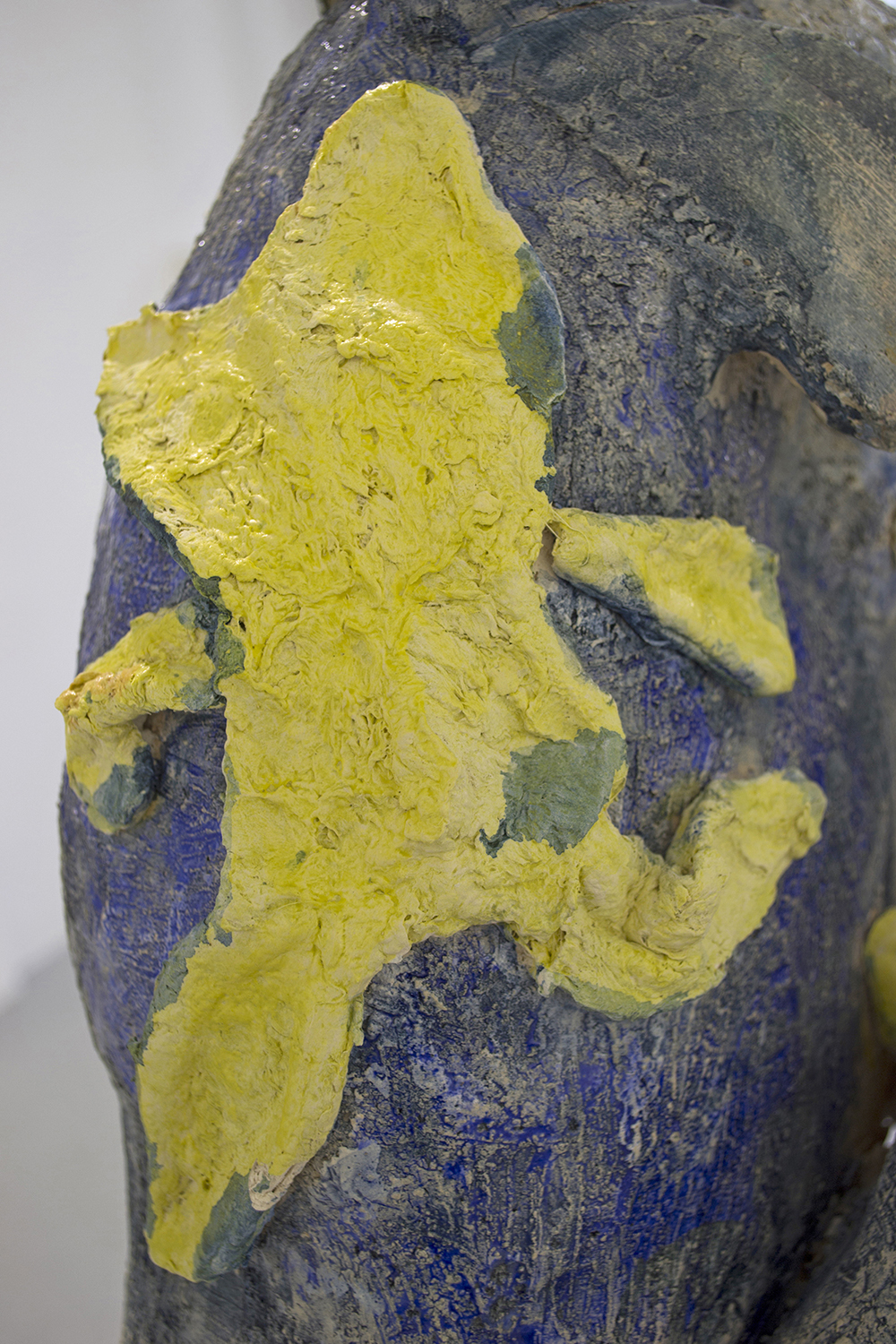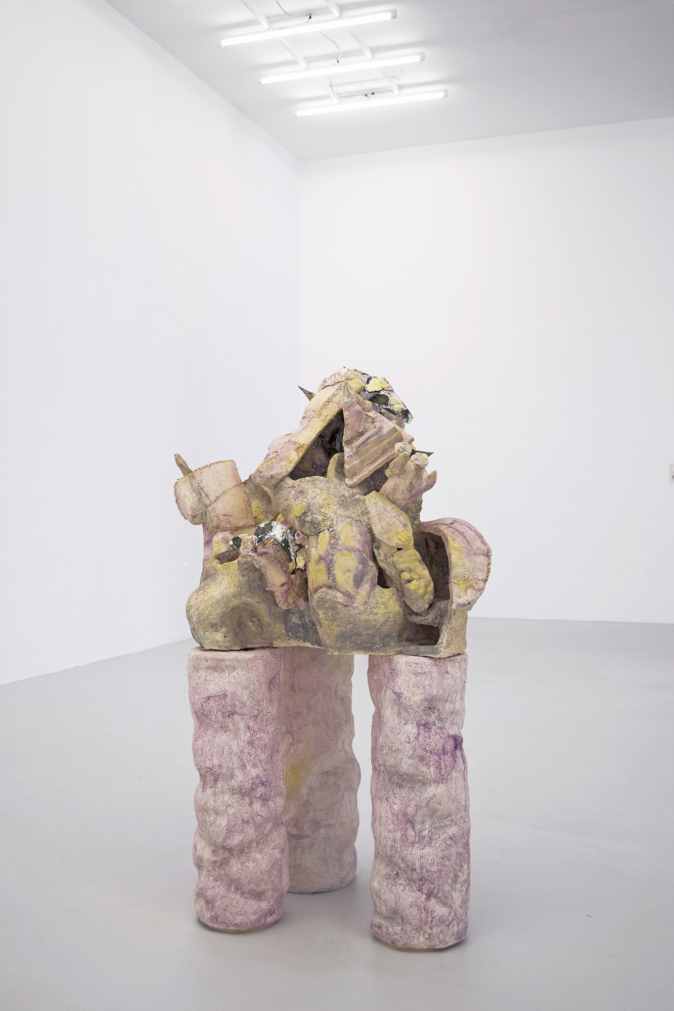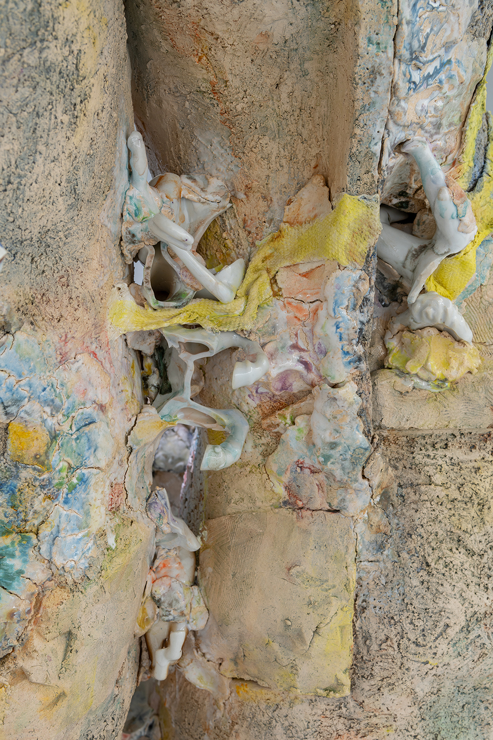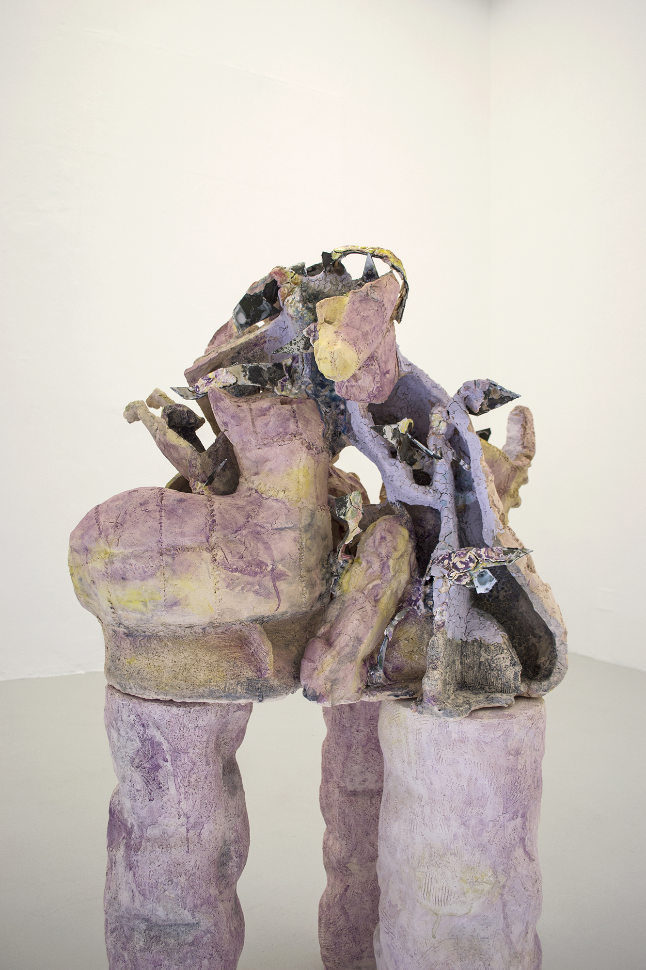 Julia Klemm's sculptures expand the traditional boundaries of the ceramic medium. In addition to classically modelled clay, 3D-printed molds are used, textile fragments, stuffed animals, pieces of metal and, above all, parts of second-hand ceramic figures are also processed into assemblages.