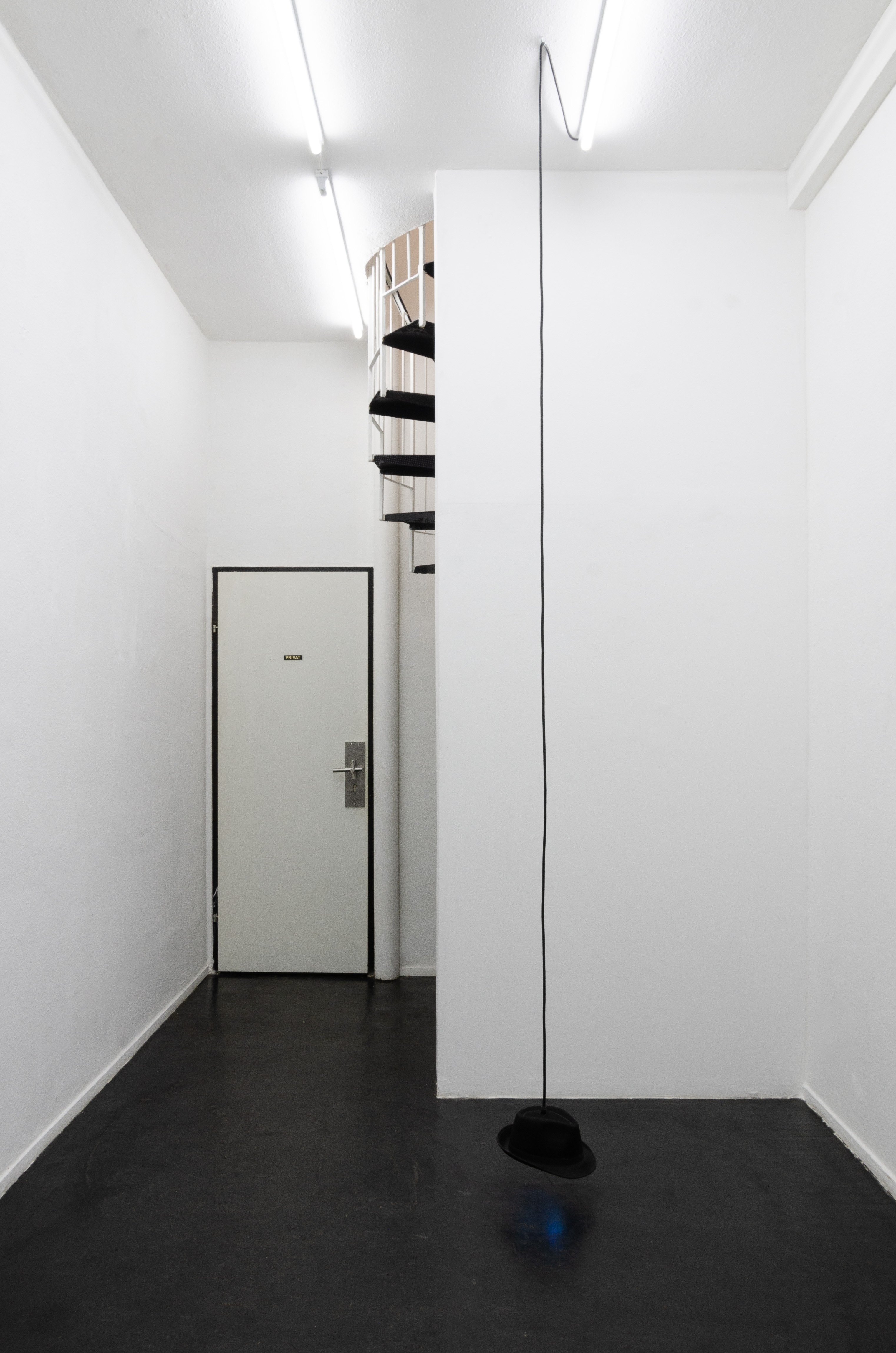 Connor Crawford, Flughafenhut, 2024, Hat, power cable, RGB led strip, MP3 player, speaker, electronics, mp3 playlist (9 files, runtime 28min 20sec), Dimensions variable
