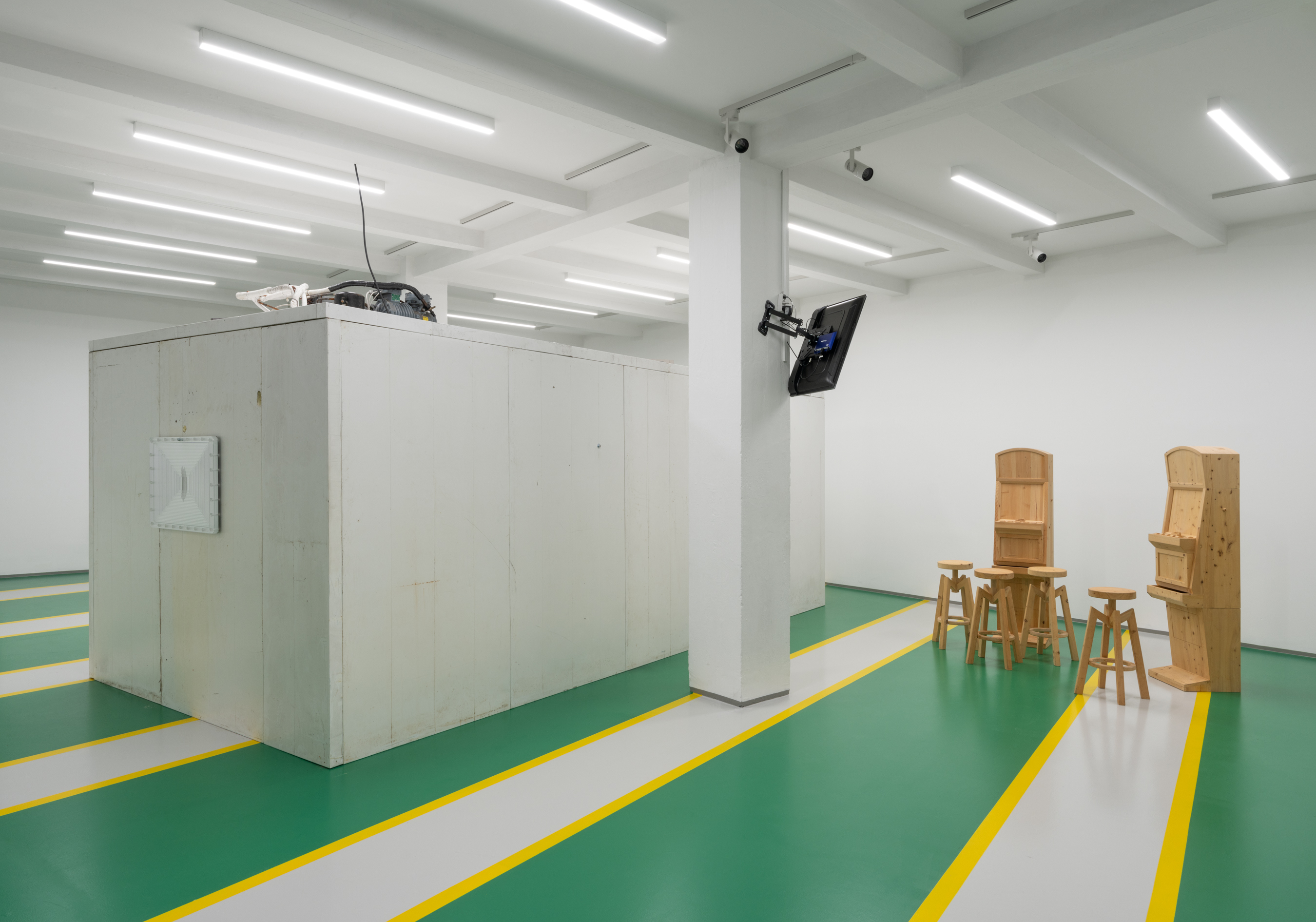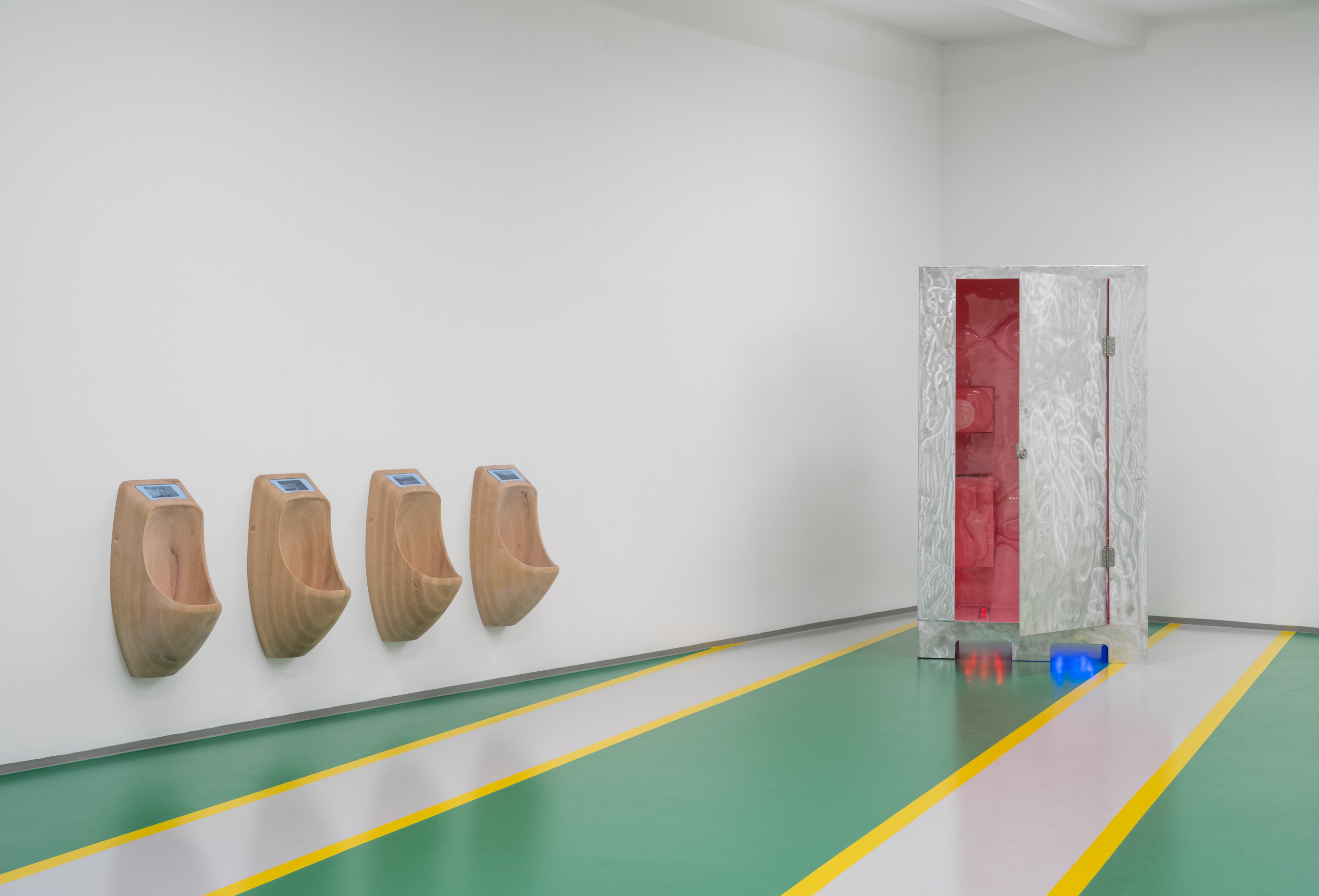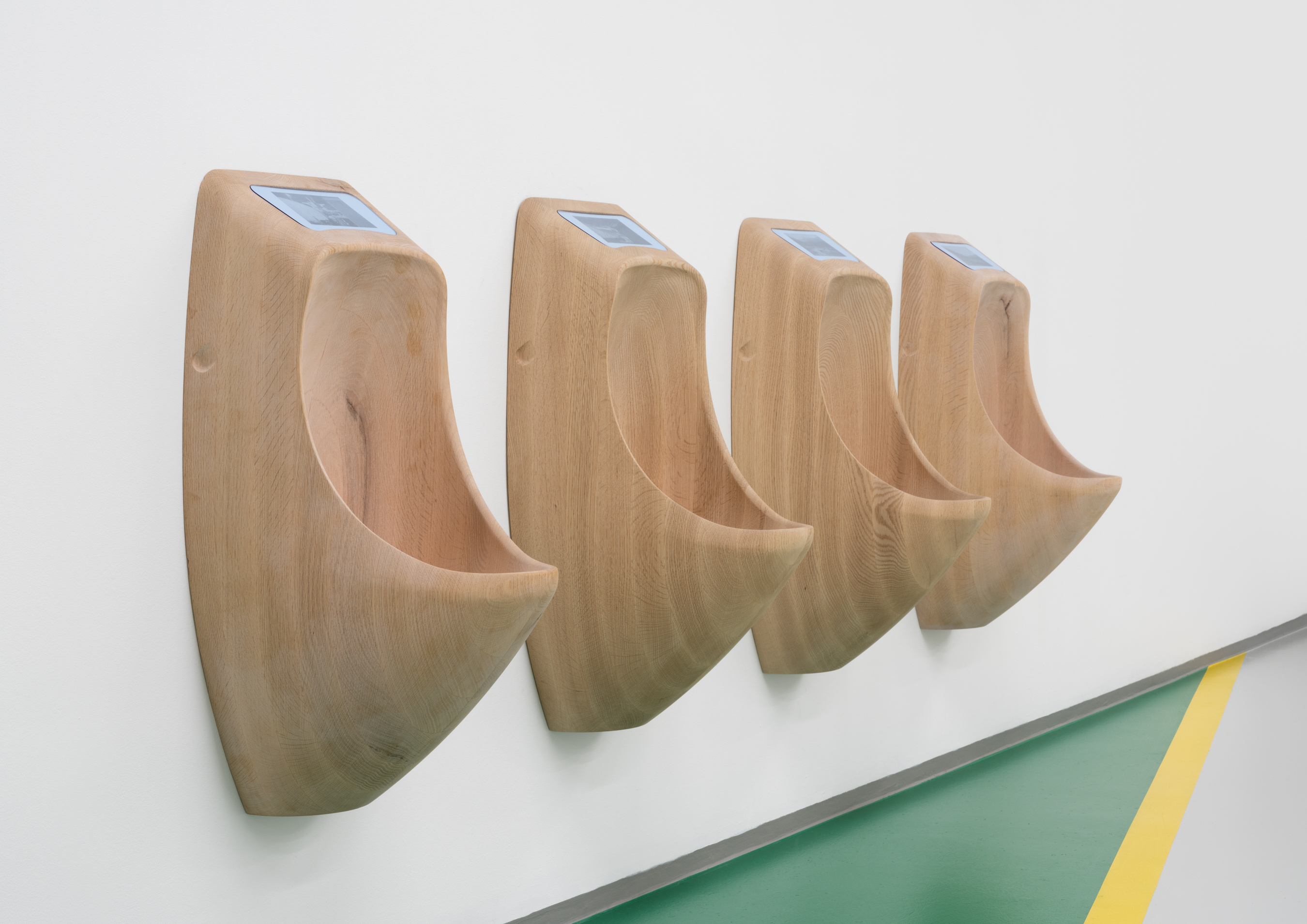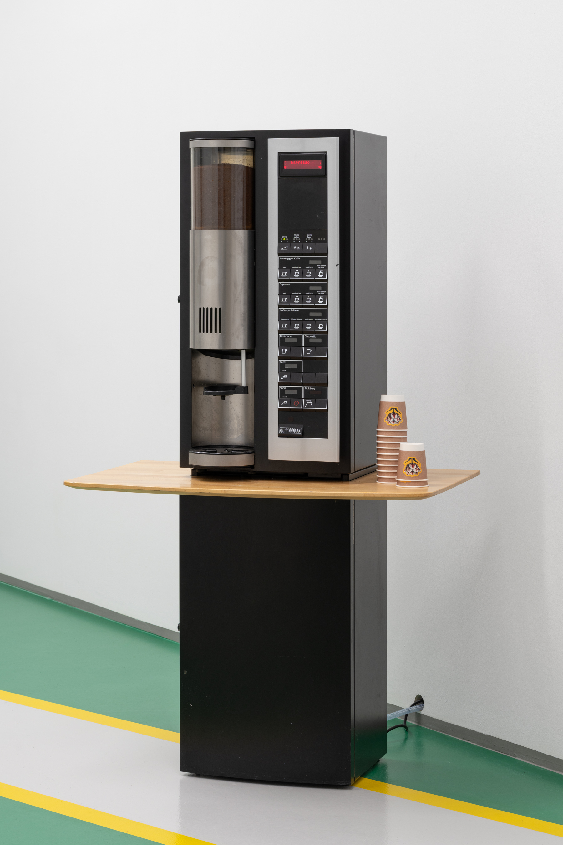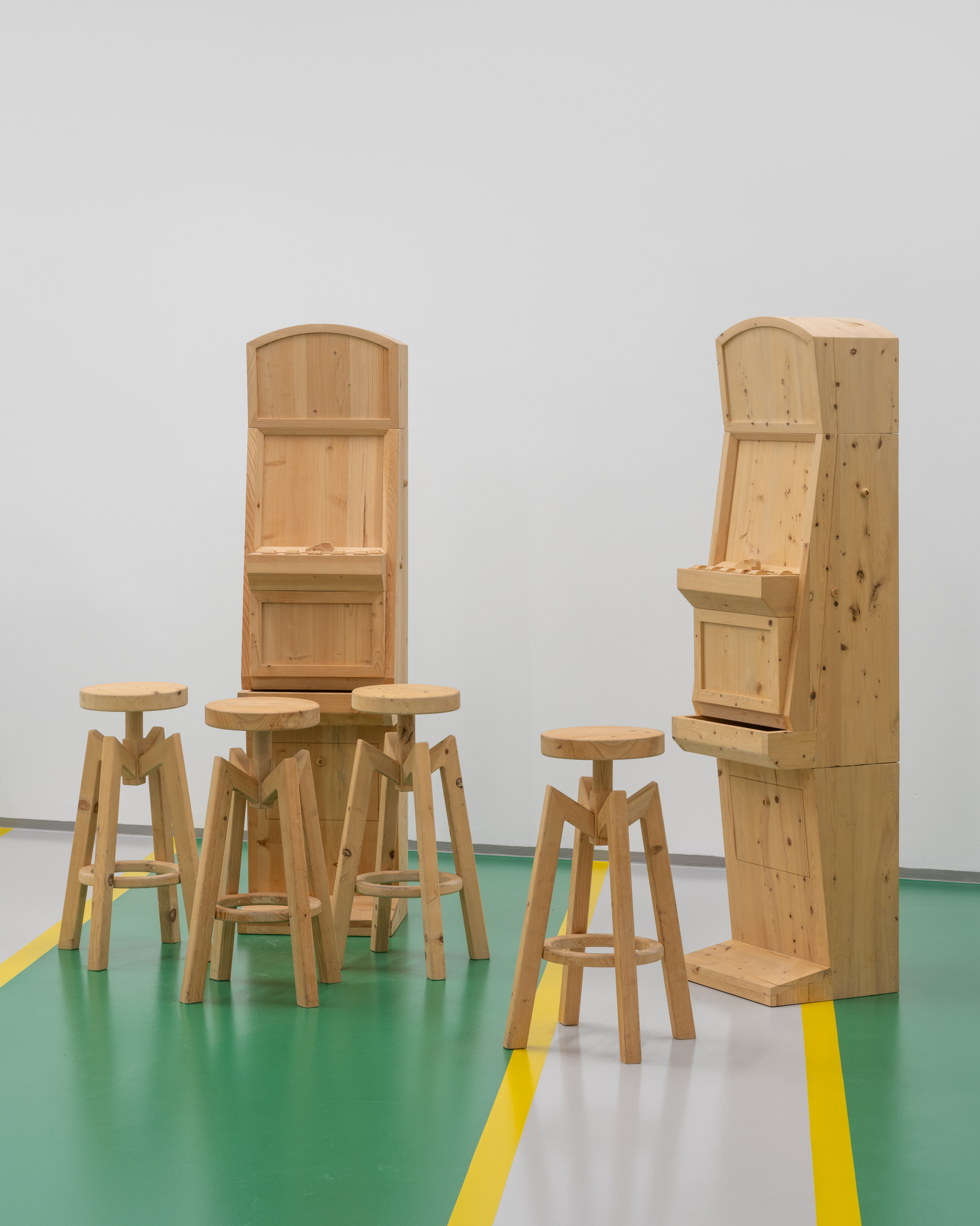 Queering familiar logistics—from transport industries to public toilets or pawnshop business—is core to Villiam Miklos Andersen’s sculptural and relational artistic work. For O—Overgaden, Andersen mounts the grand new project Caffè Crema. Trailing his own experience as a truck driver by borrowing the exhibition title from the cheap coffee one can choose at almost any freeway stop through central Europe, the project employs a multitude of objects—including an actual, ready-made coffee machine, hand-carved oak urinals, a stack of real-life carrots, flower decorations, a room-sized freezer, and slot machines made from cedarwood—to create a colorful grand-scale installation alluding to wholesale markets or free trade zones. Meanwhile Andersen’s sculptural jest of tweaking the different objects upends how consumer goods, or even zones of trade, reek of both male-dominated freight trains and uniformity of powerful infrastructures. Altering typical normative visual standards of commodities, Andersen thus exposes a systemic logistical regulation of mundane actions, purchases, and movement patterns often hidden in plain sight.