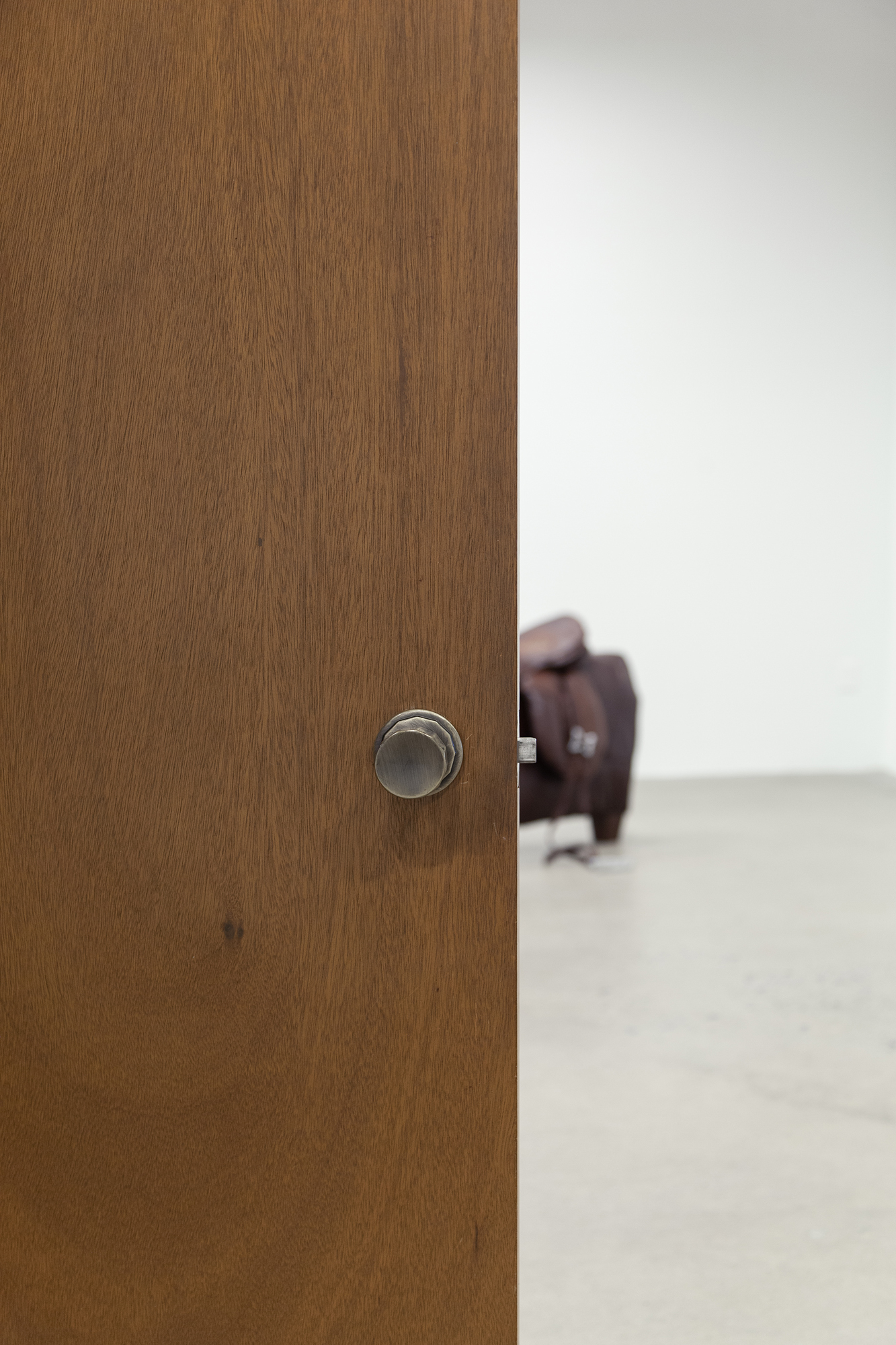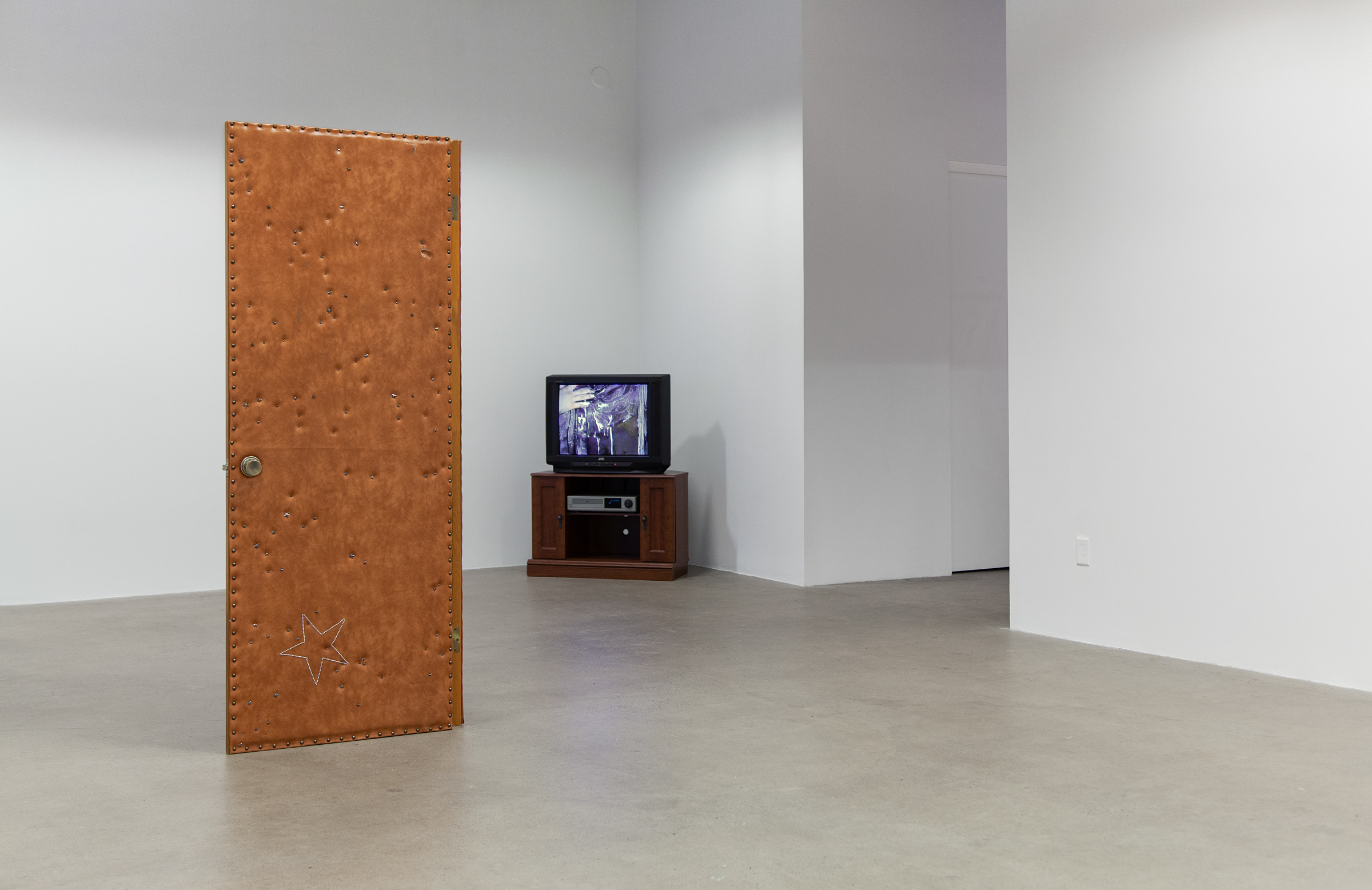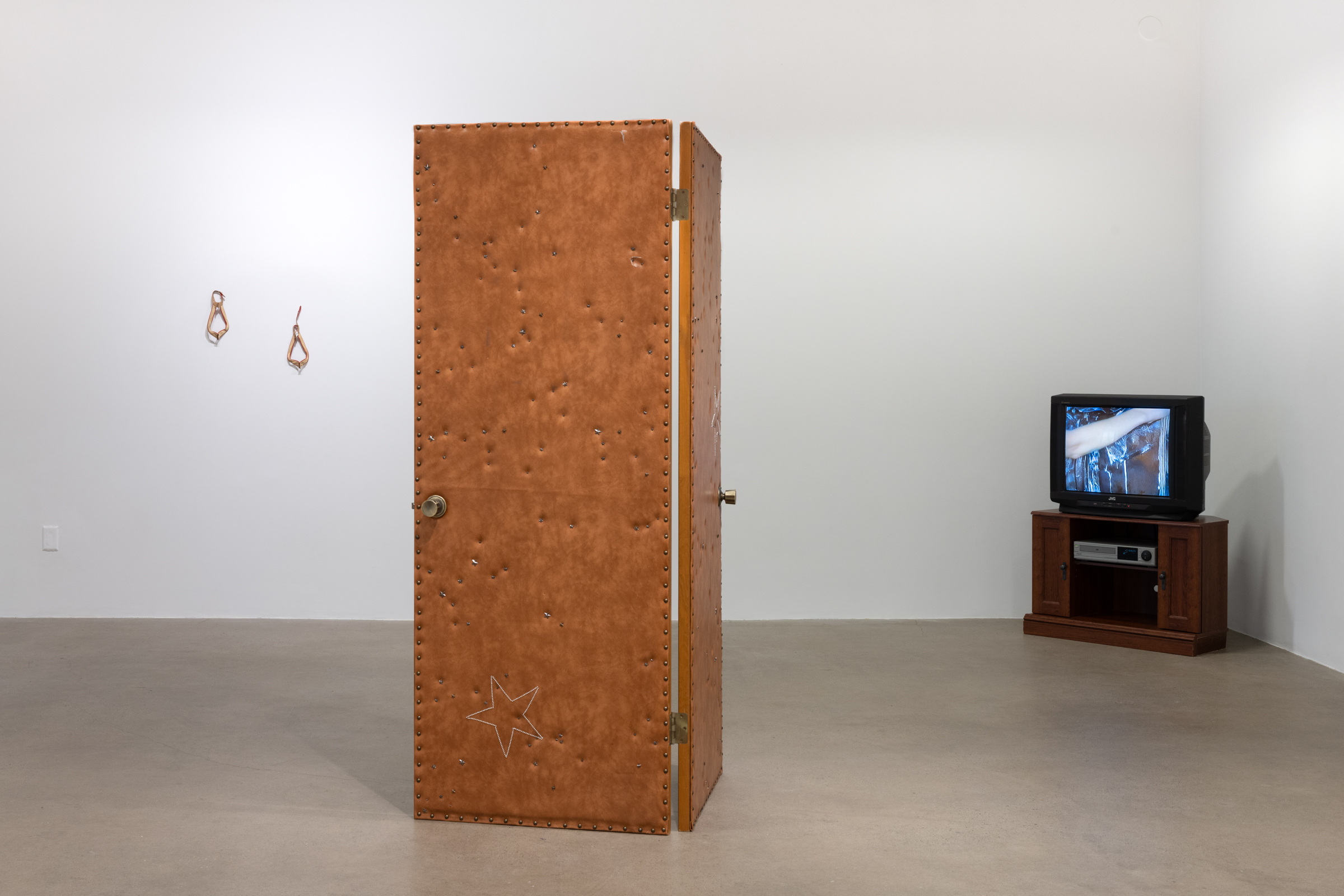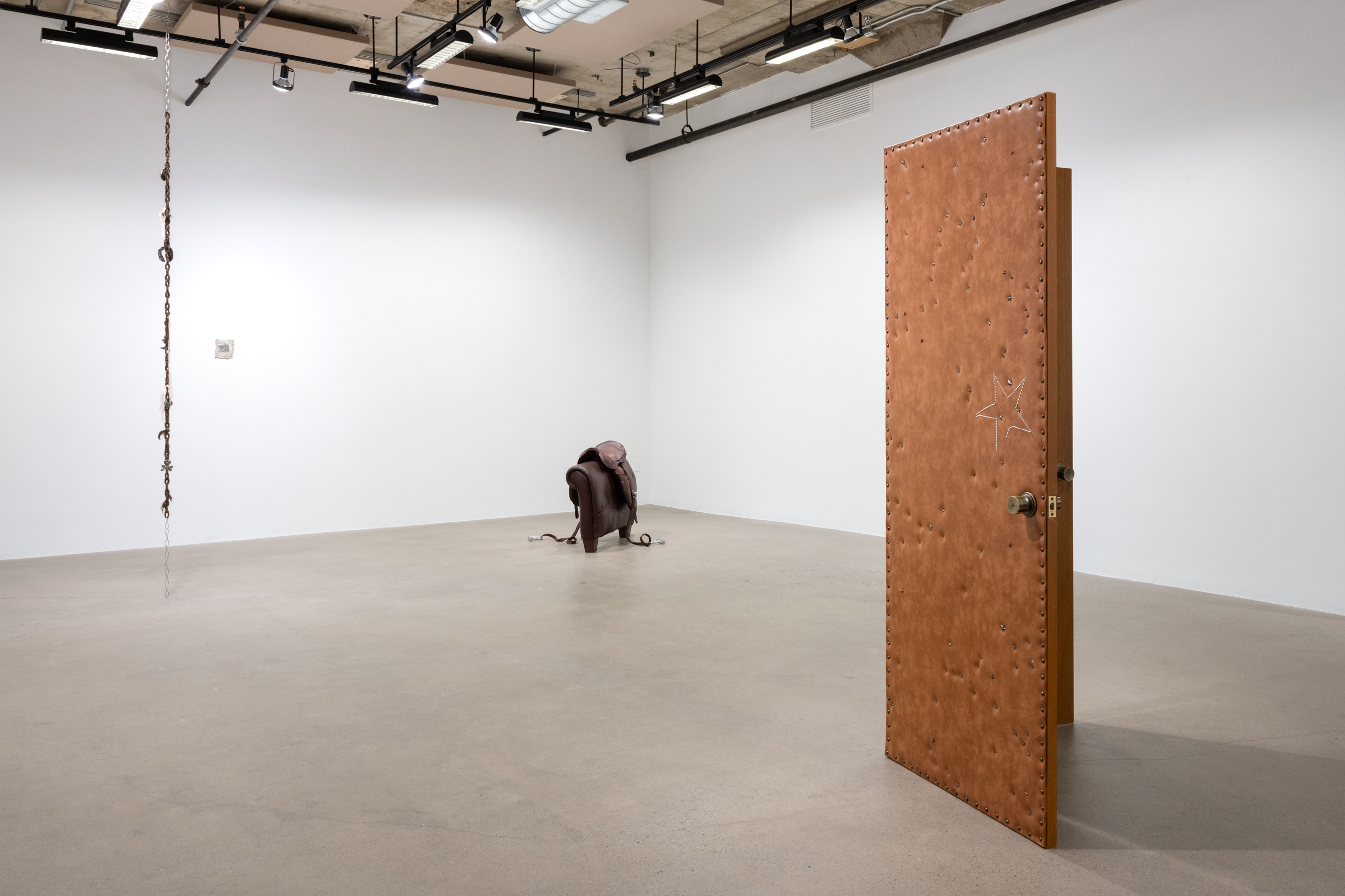Cindy Hill, "Permissions", salvaged leather doors, leather star studs, 45â x 31â x 80â, 2024