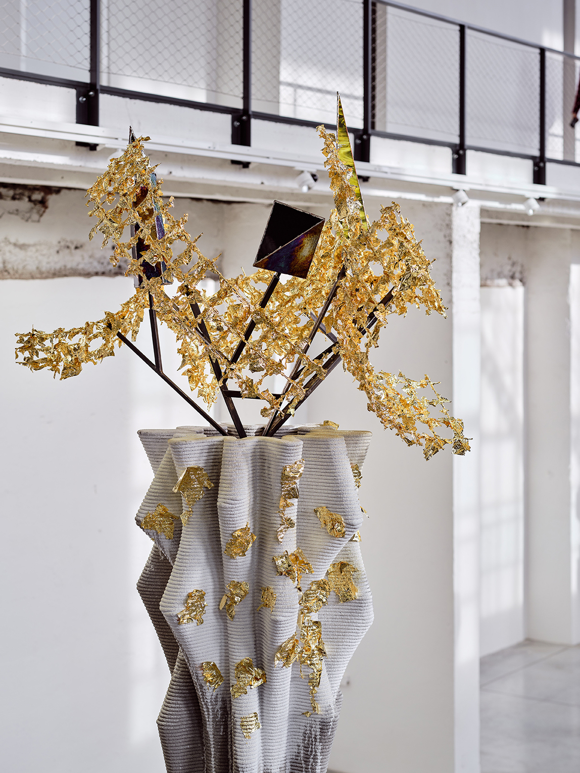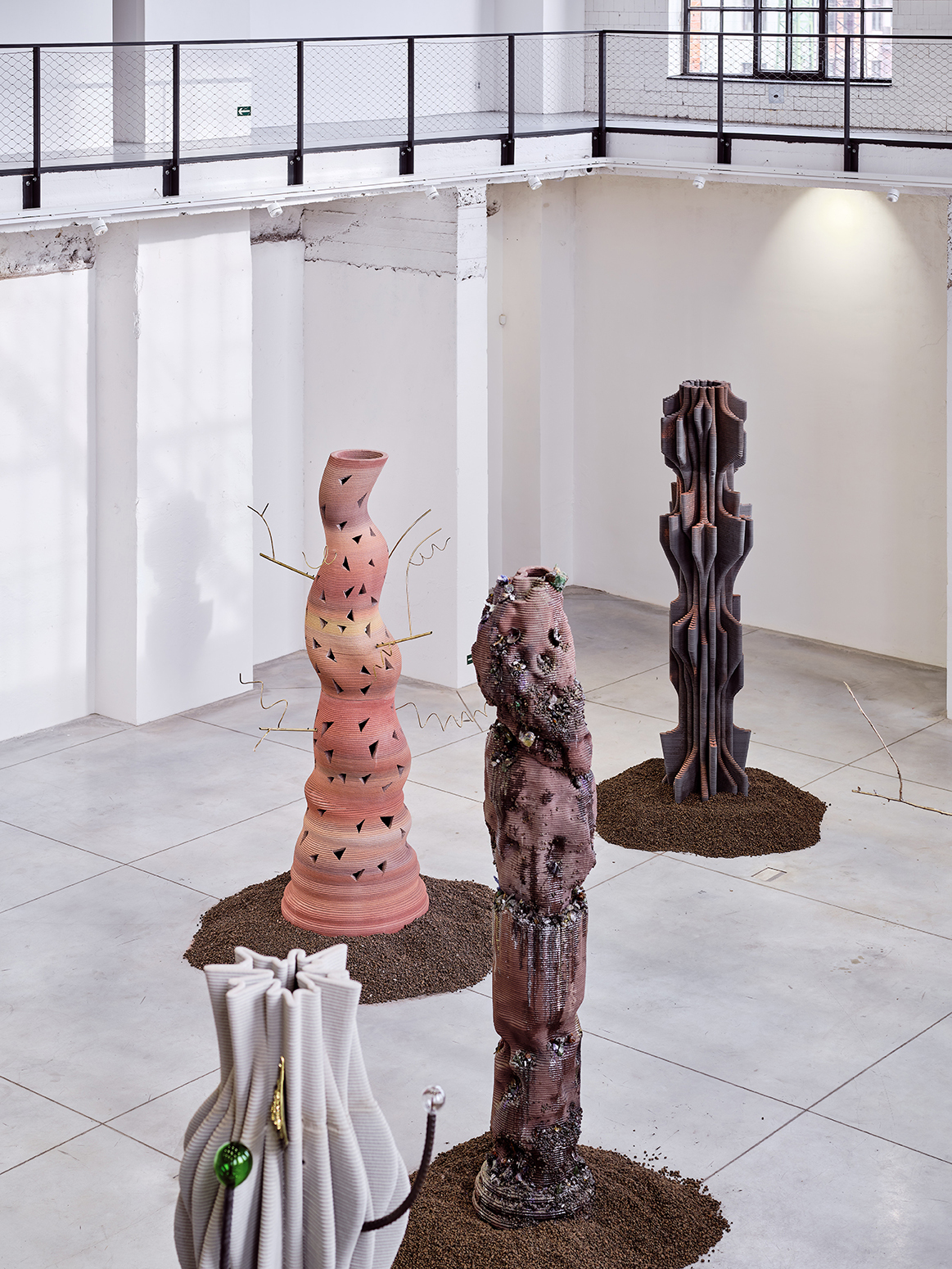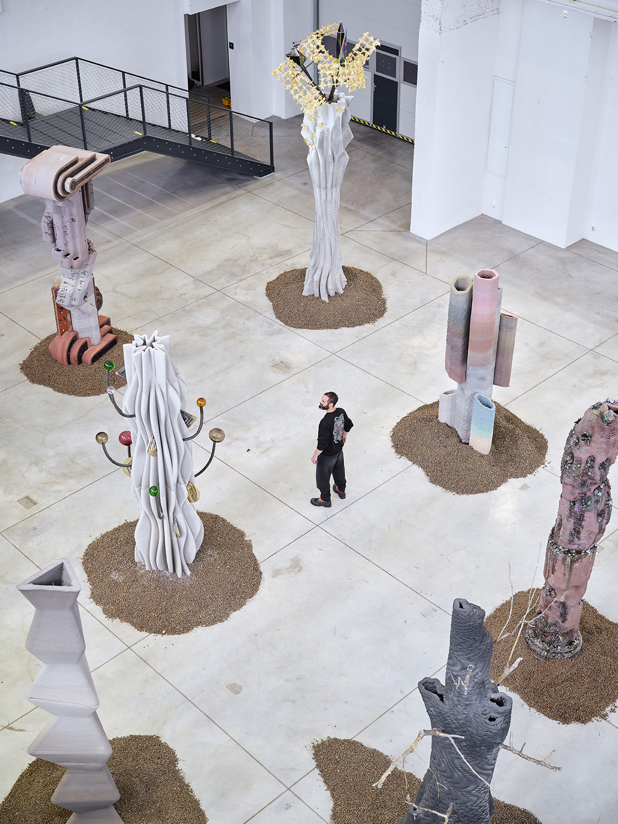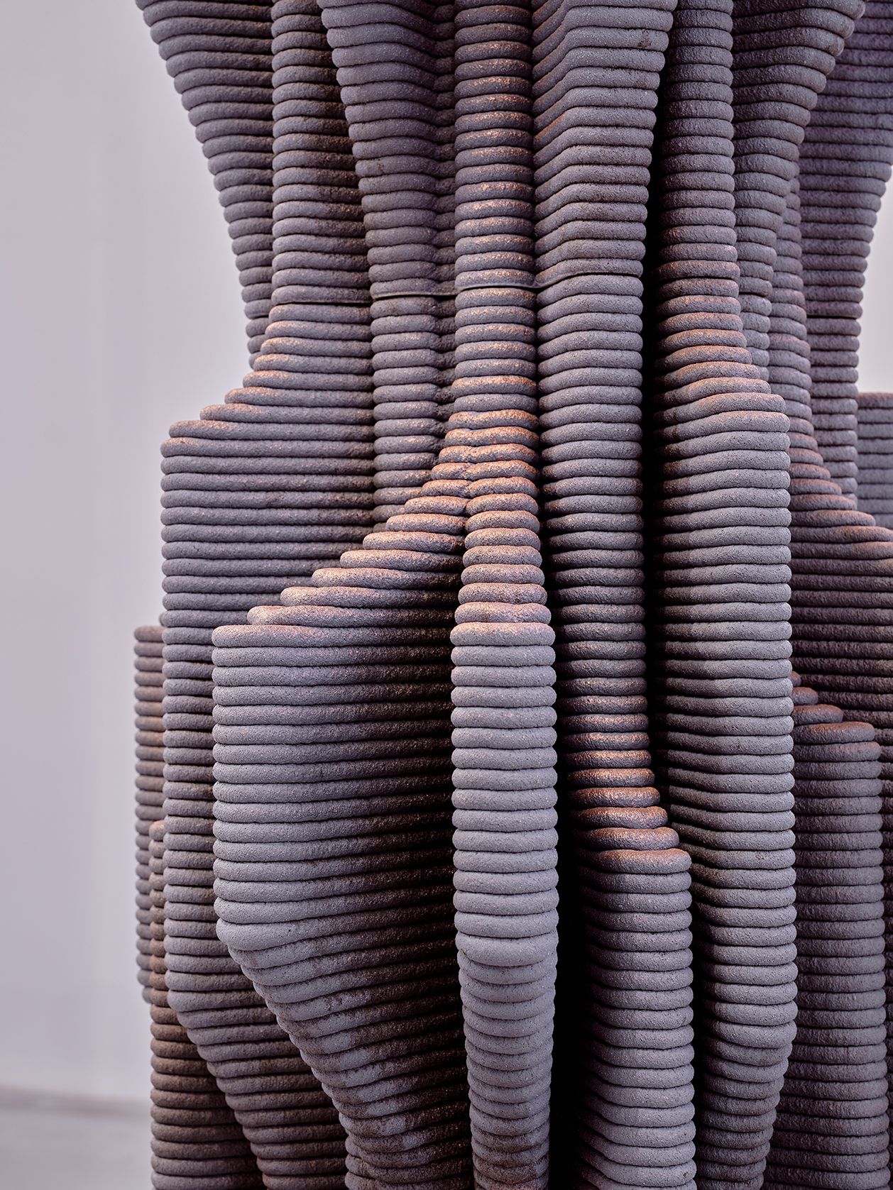 The expressive form of the dozen sculptural verticals does not stop at 3D printing. While this technology gives specific geometric and organic shapes a distinctive expressive shortcut, each of the sculptures is complemented by manual intervention, paint or components made of other materials, such as glass. In this, too, a parallel can be found with the works of Matthias Braun at Kuks, as these were at the time of their creation in the early 18th century coloured with polychrome paints. Colour contributed to a greater impact at that time, and natural pigments play the same role in Chochola’s current project. 3D printing was only a semi-finished product. According to the character of the sculptures, the artist varied the final design and processing, the texture of the surfaces, from minimalist gestures to maximalist coverage with glass shards. Manual intervention is essential – it gives artistic meaning to the printed mass. Without these individual touches, the set would be a formal exercise in 3D printing. Chochola also relativized 3D printing itself and tested its limits. He tried to shape the material beyond the classic angles, using ceramsite sprinkling during printing. All of the sculptures were printed from several segments, but there is also a combination of printing in horizontal and vertical layers, so that the subsequent tectonics of the object is much more refined. The artist also infused the material with coloured concrete and glass, which he and his collaborators then ground and polished, sometimes adding resin to achieve a mirror-like sheen, other times not applying any at all. At the same time, he and the experts on the Voxell team experimented with several other printing options such as nonplanar printing, where layers are stacked diagonally, or algorithms that introduce an element of chance into the print trace, so that the resulting texture is much more organic.