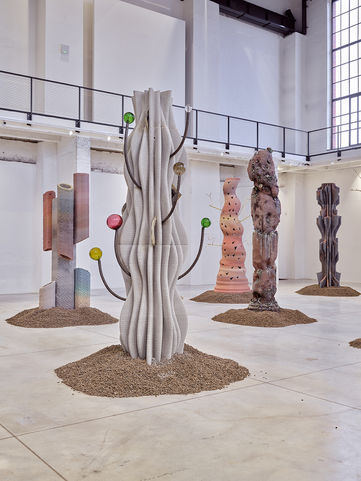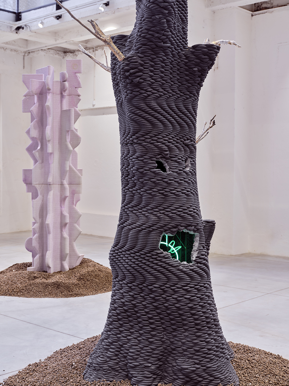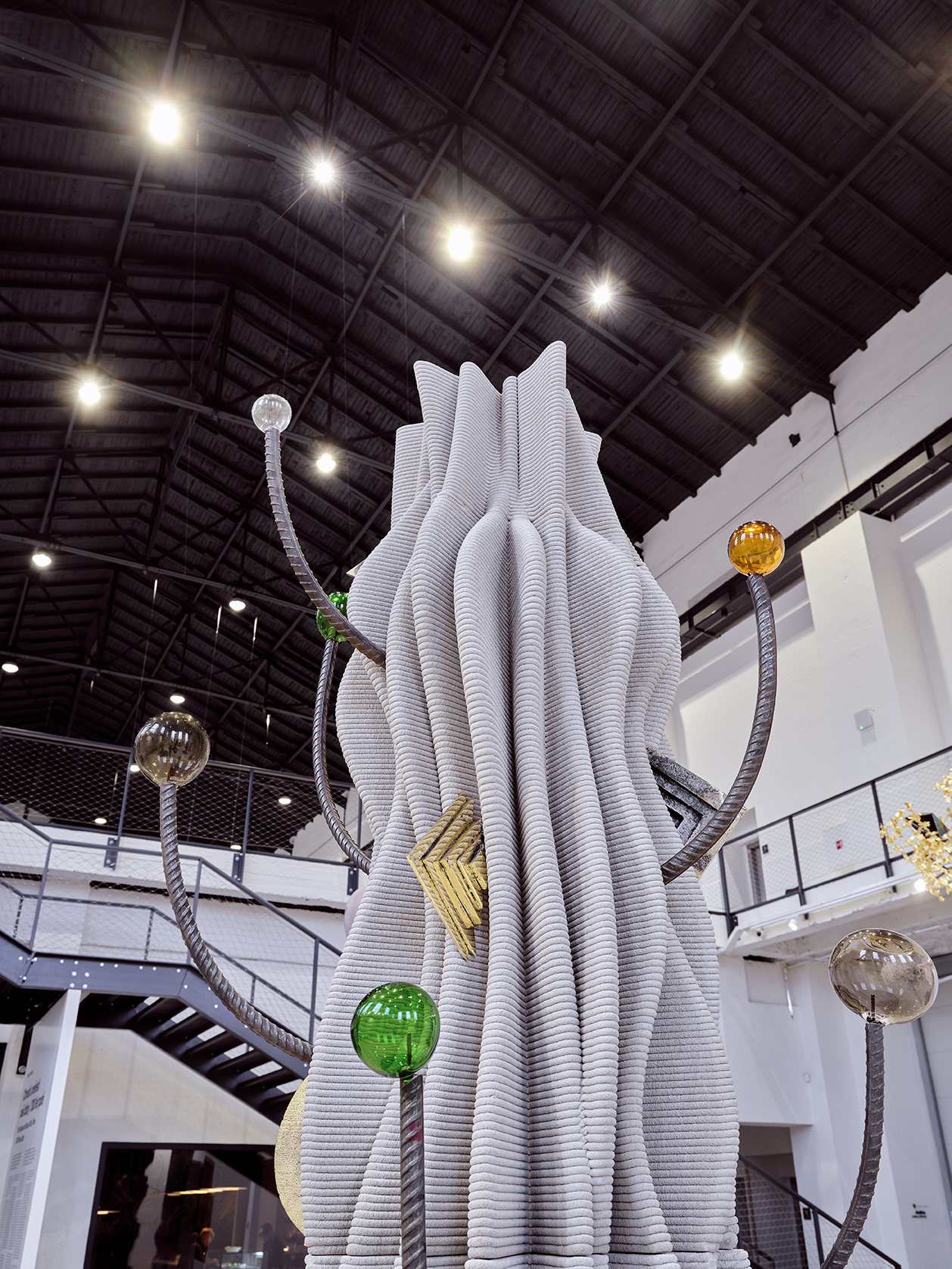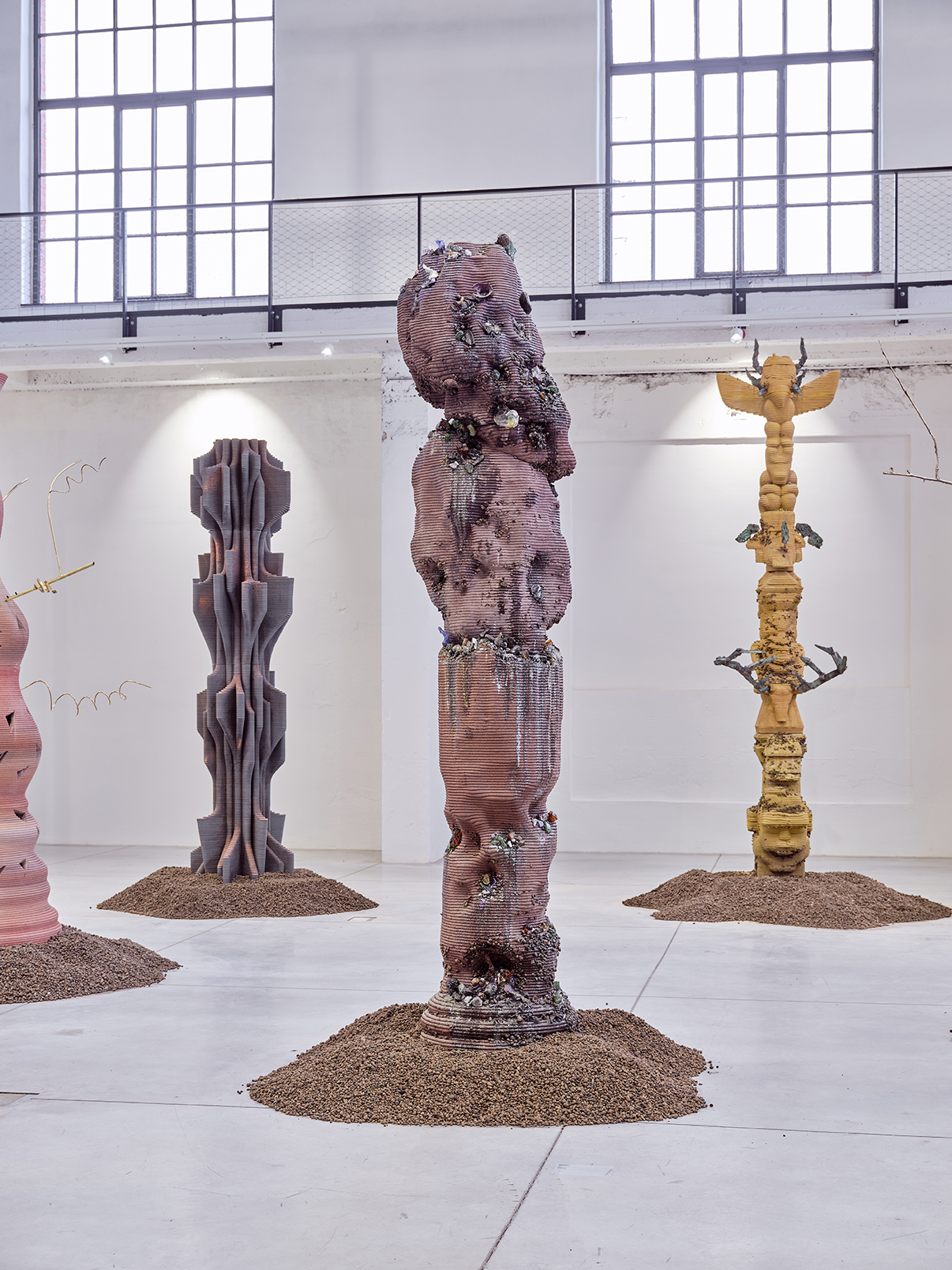 The expressive form of the dozen sculptural verticals does not stop at 3D printing. While this technology gives specific geometric and organic shapes a distinctive expressive shortcut, each of the sculptures is complemented by manual intervention, paint or components made of other materials, such as glass. In this, too, a parallel can be found with the works of Matthias Braun at Kuks, as these were at the time of their creation in the early 18th century coloured with polychrome paints. Colour contributed to a greater impact at that time, and natural pigments play the same role in Chochola’s current project. 3D printing was only a semi-finished product. According to the character of the sculptures, the artist varied the final design and processing, the texture of the surfaces, from minimalist gestures to maximalist coverage with glass shards. Manual intervention is essential – it gives artistic meaning to the printed mass. Without these individual touches, the set would be a formal exercise in 3D printing. Chochola also relativized 3D printing itself and tested its limits. He tried to shape the material beyond the classic angles, using ceramsite sprinkling during printing. All of the sculptures were printed from several segments, but there is also a combination of printing in horizontal and vertical layers, so that the subsequent tectonics of the object is much more refined. The artist also infused the material with coloured concrete and glass, which he and his collaborators then ground and polished, sometimes adding resin to achieve a mirror-like sheen, other times not applying any at all. At the same time, he and the experts on the Voxell team experimented with several other printing options such as nonplanar printing, where layers are stacked diagonally, or algorithms that introduce an element of chance into the print trace, so that the resulting texture is much more organic.