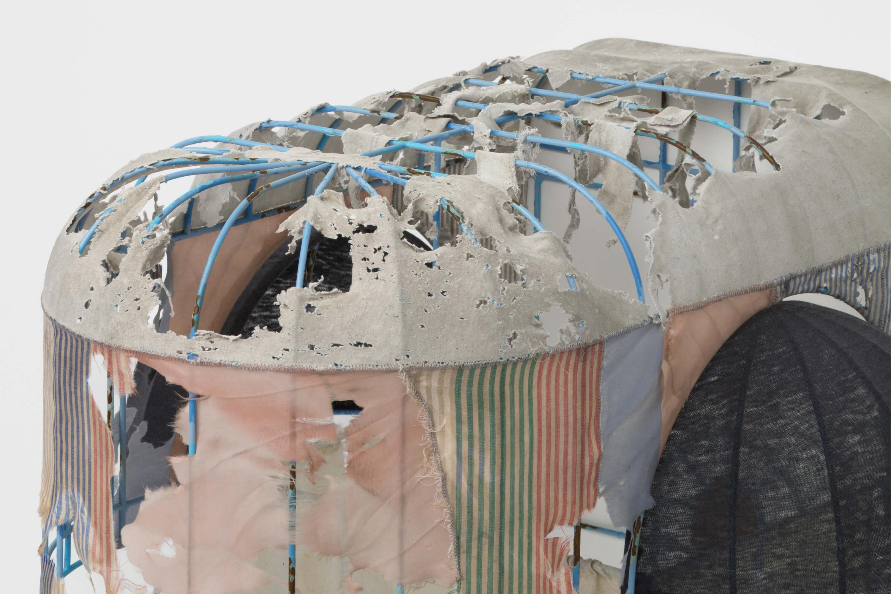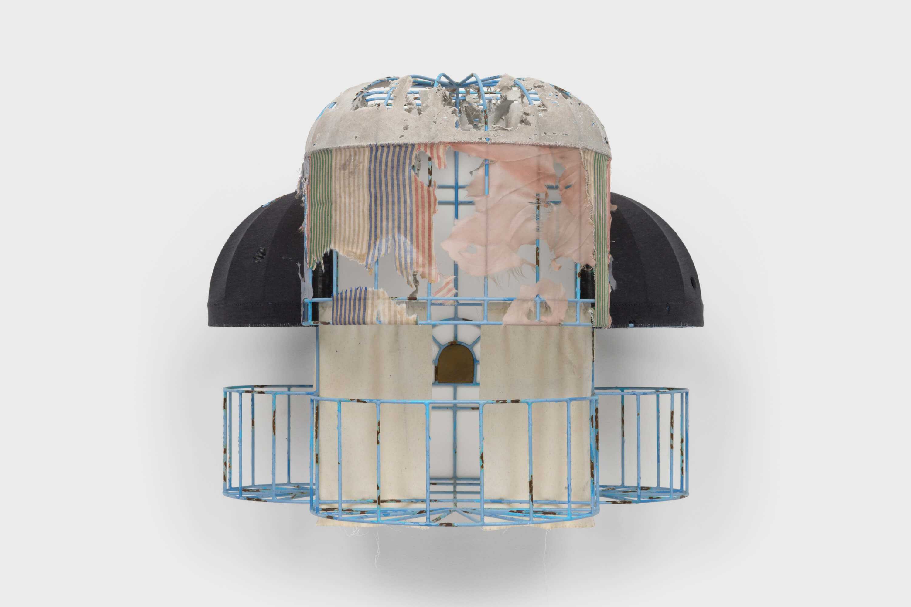 Found materials are brought together to adorn Carideoâs meticulously hand made structures, manually cut, bent, welded and steel-brazed by the artist, articulating the passage of time through layers of chipped away paint, patina and rust. His scaffoldings reference architectural details such as archways or thresholds that repeat asynchronously and persist across time, translated and reconfigured in different cities and contexts like an architectural echo. ACM (2024), Carideoâs largest and most complex work to date, footnotes the floorplan of a Romanesque basilica, and simultaneously flickers with a likeness to the window security gates often found in New York. Contrasting shades of blue measure its age by mapping patterns of corrosion, as if painted and repainted again. Incorporating the battered shoulders of a black t-shirt and an old yellow pillow case as curtains, it is a playful, almost carnivalesque structure, and nevertheless a portrait of intimacy and quiet solitude.