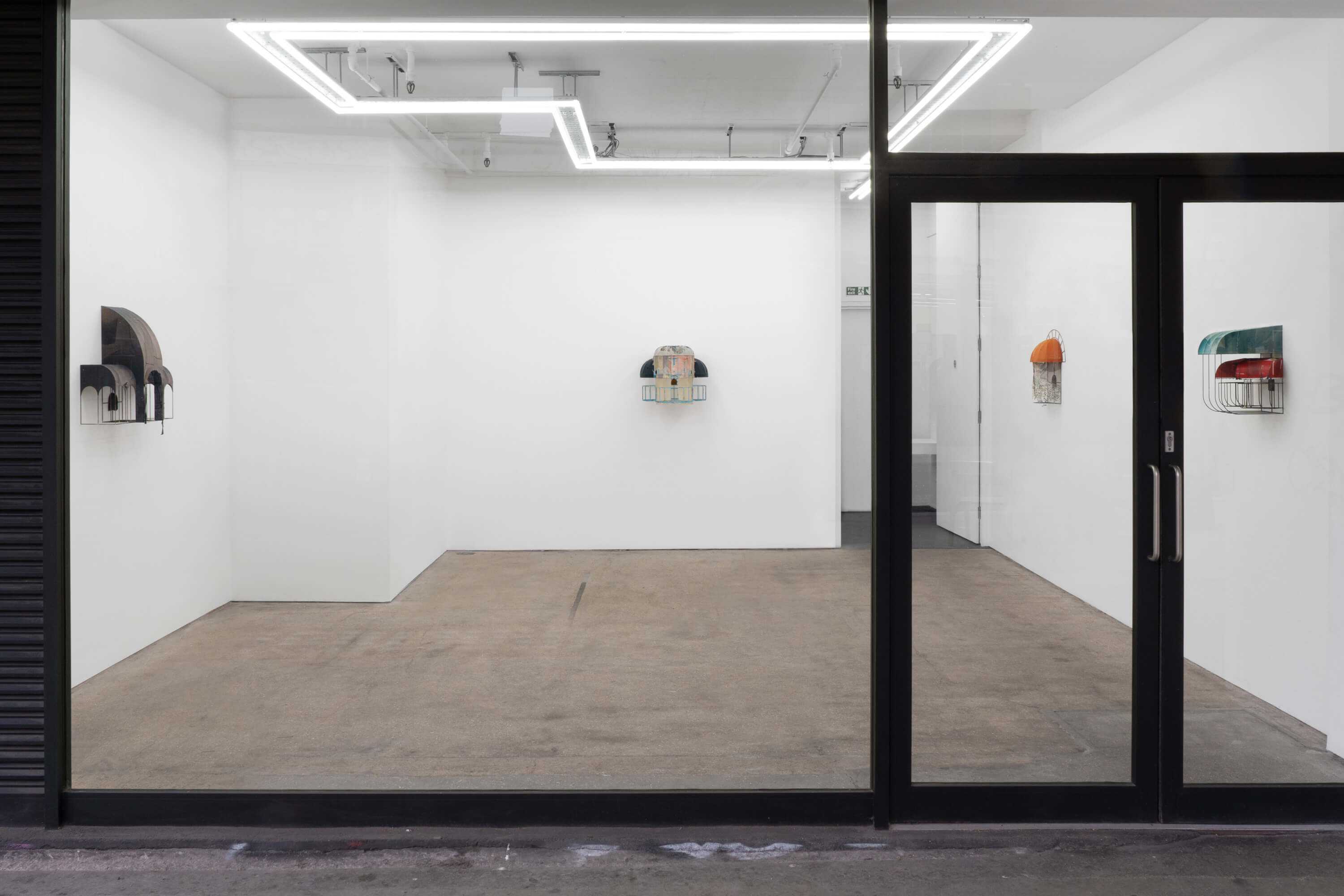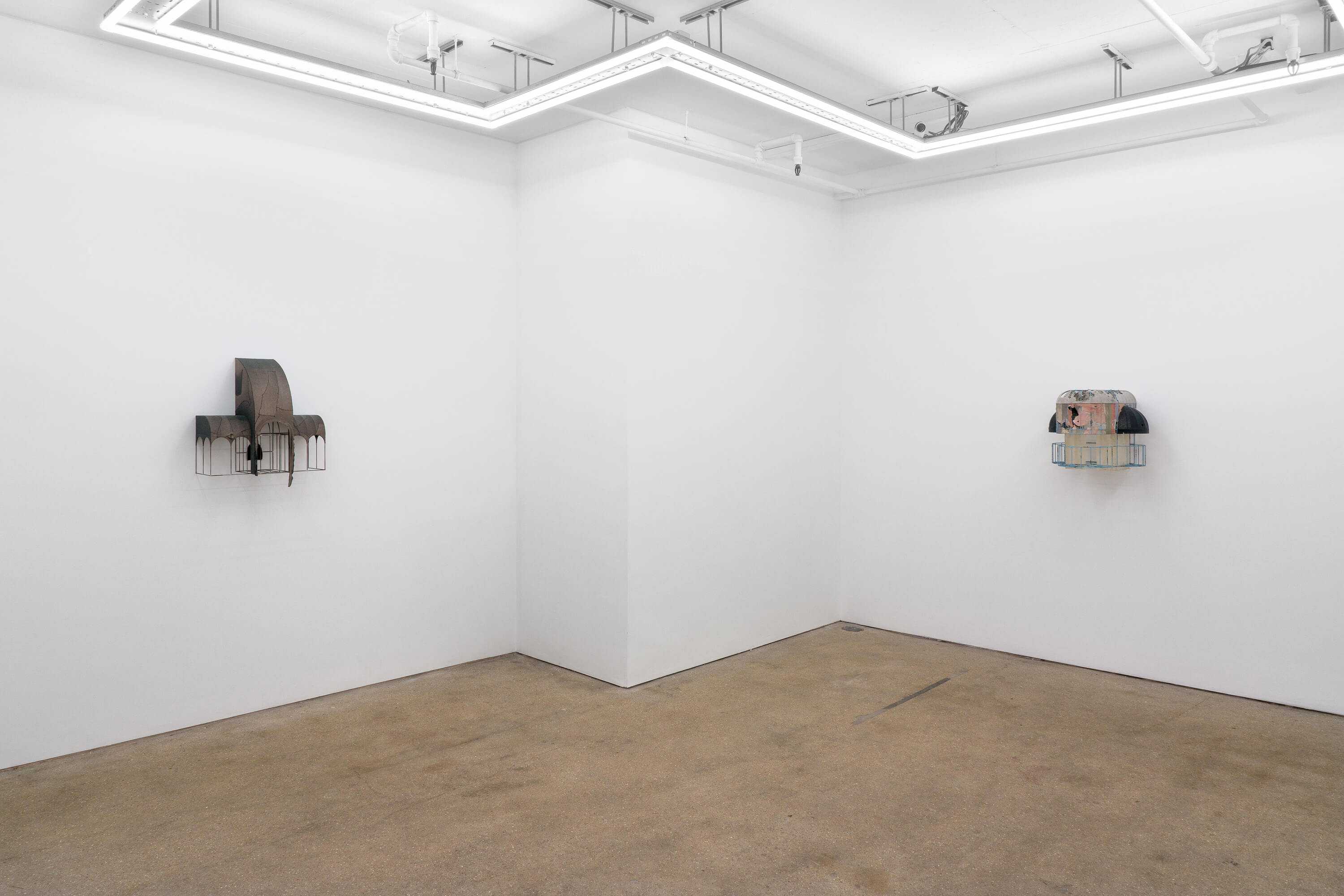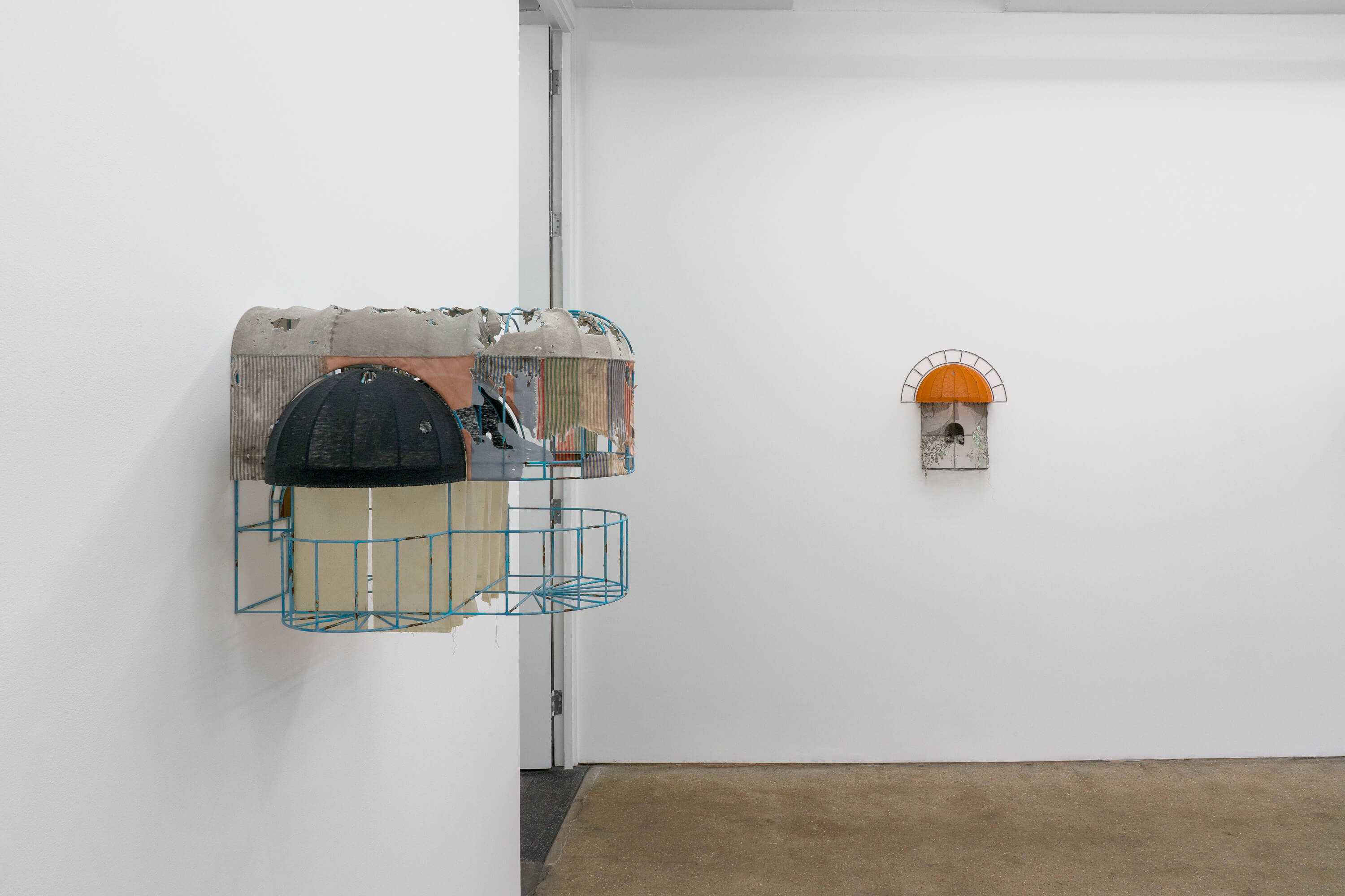 Public Gallery is pleased to present 'groundwork', a solo exhibition of new works by New York based artist Greg Carideo, whose practice references the architectural language of awnings, building facades, doorways, and thresholds. Using found fabrics, shoe heels, and other lost or discarded items, Carideoâs intimate wall-based sculptures â silver-brazed steel armatures threaded through delicate fabric canopies â call to mind social spaces of shelter, encounter and exchange.