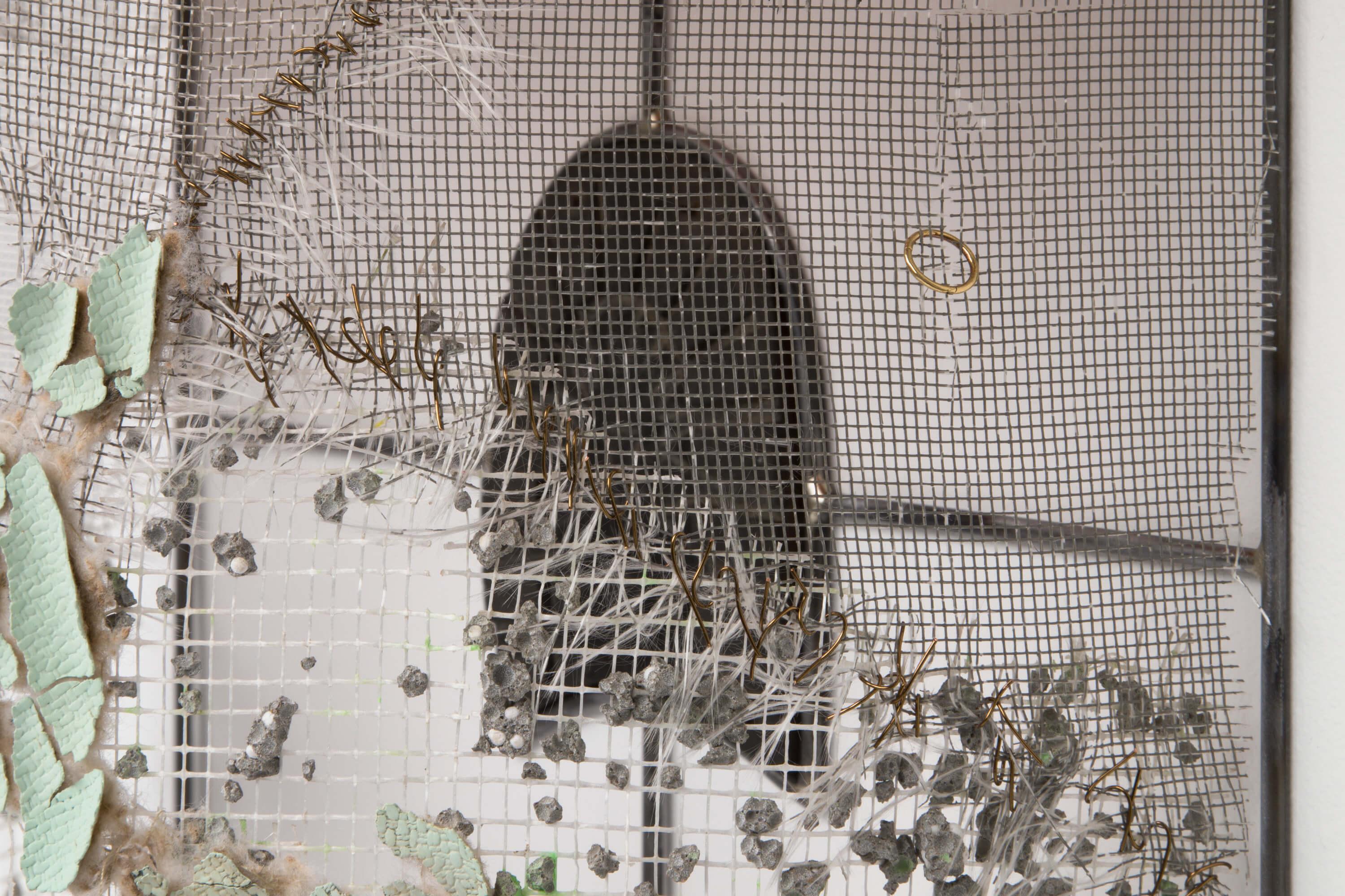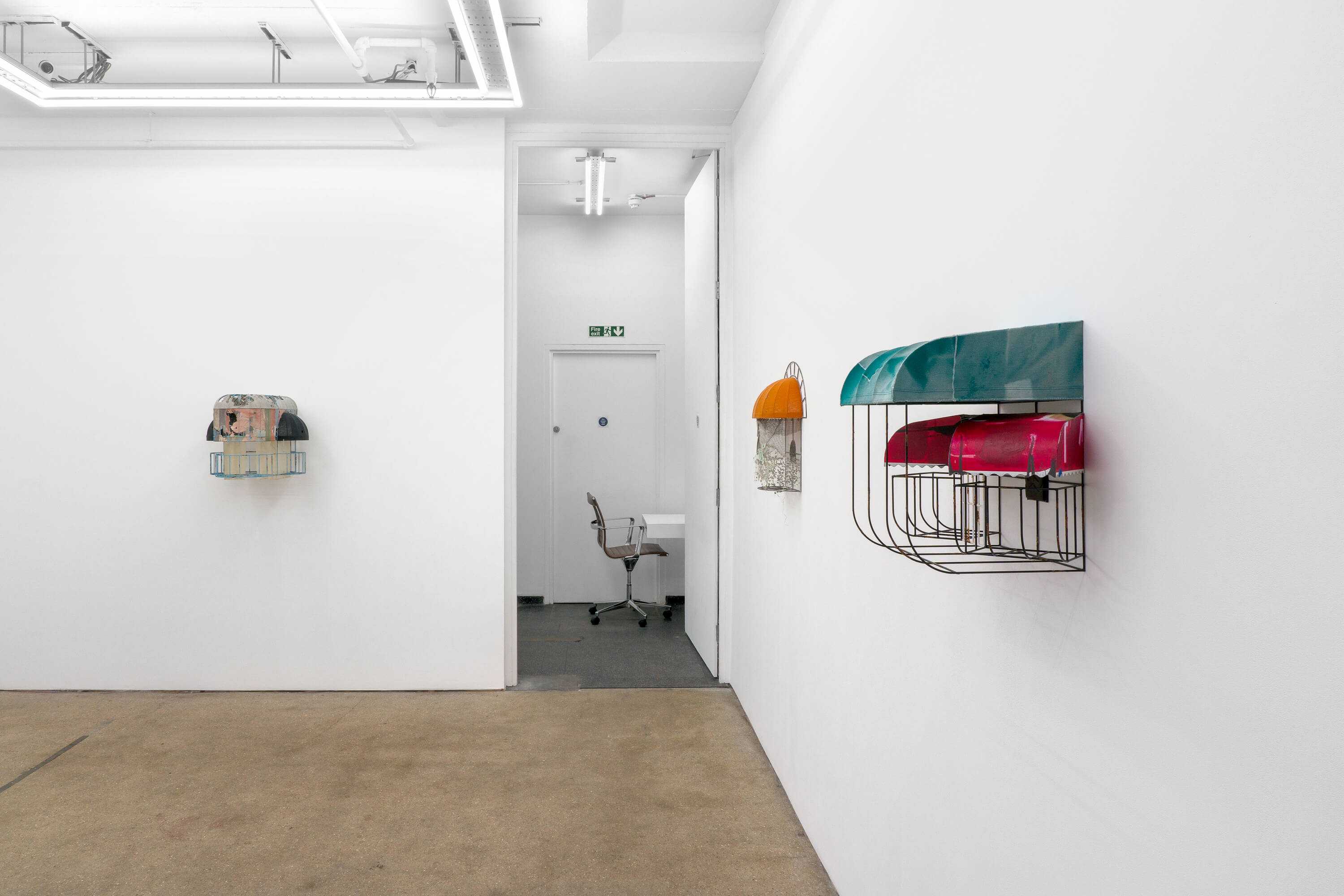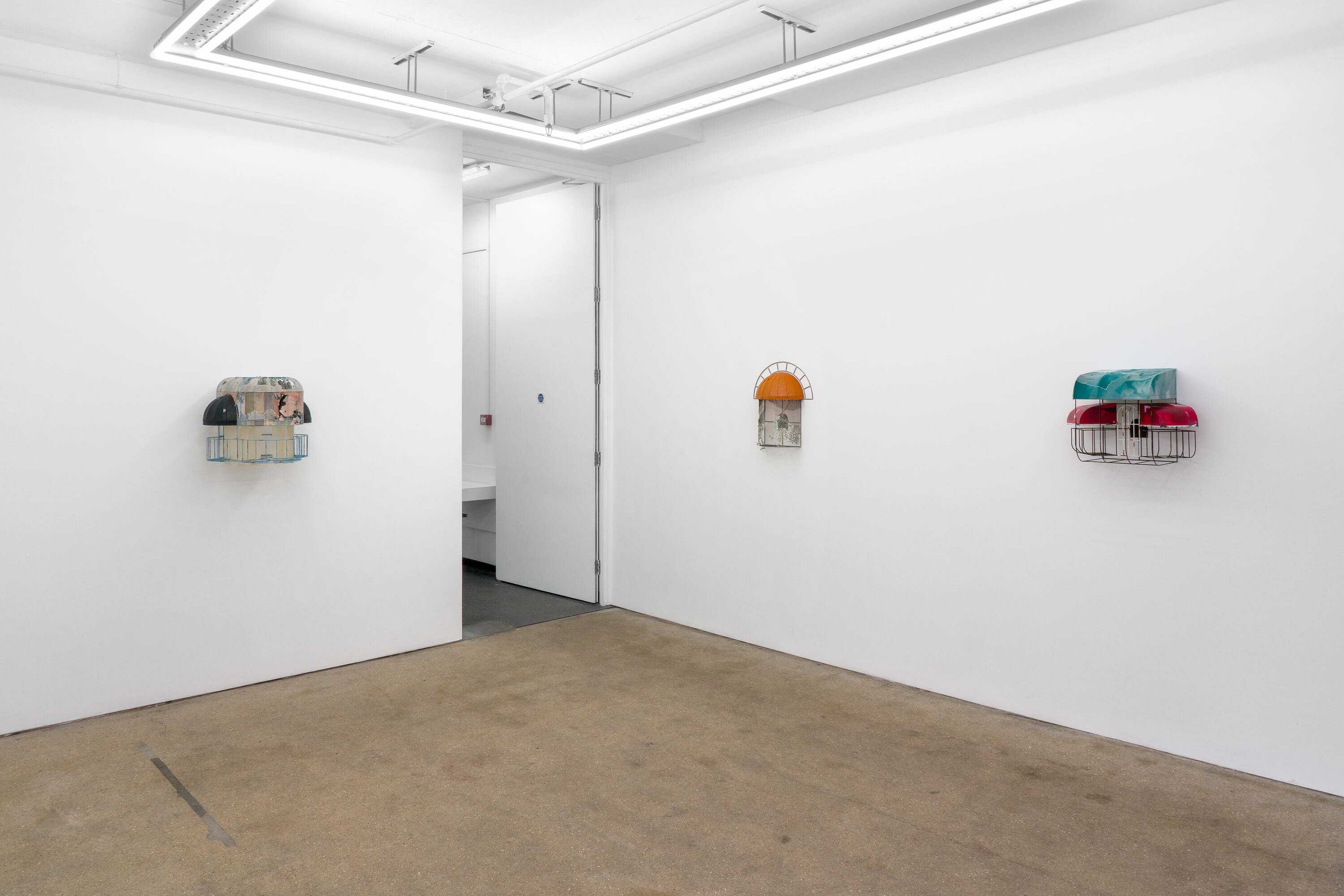 Public Gallery is pleased to present 'groundwork', a solo exhibition of new works by New York based artist Greg Carideo, whose practice references the architectural language of awnings, building facades, doorways, and thresholds. Using found fabrics, shoe heels, and other lost or discarded items, Carideoâs intimate wall-based sculptures â silver-brazed steel armatures threaded through delicate fabric canopies â call to mind social spaces of shelter, encounter and exchange.