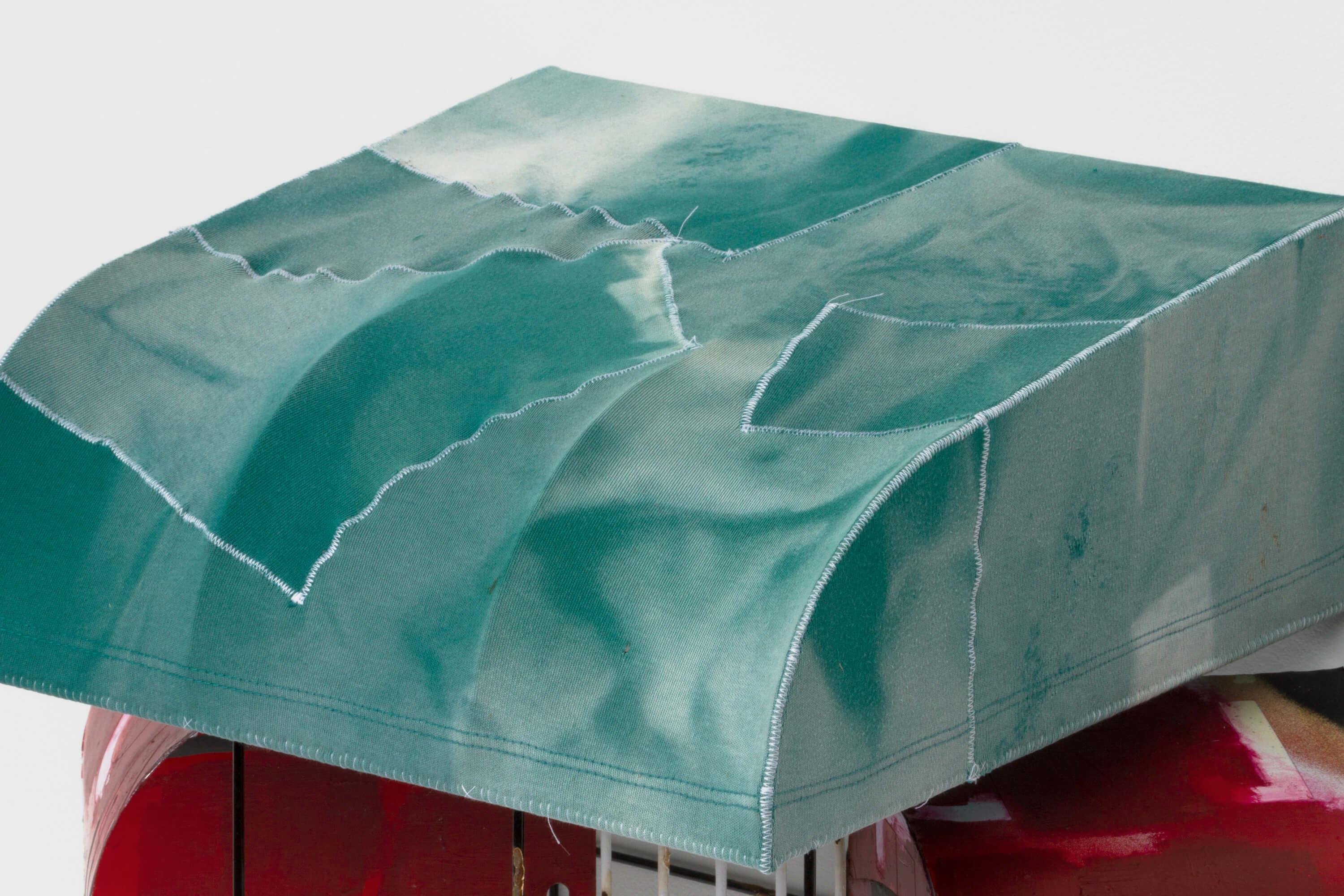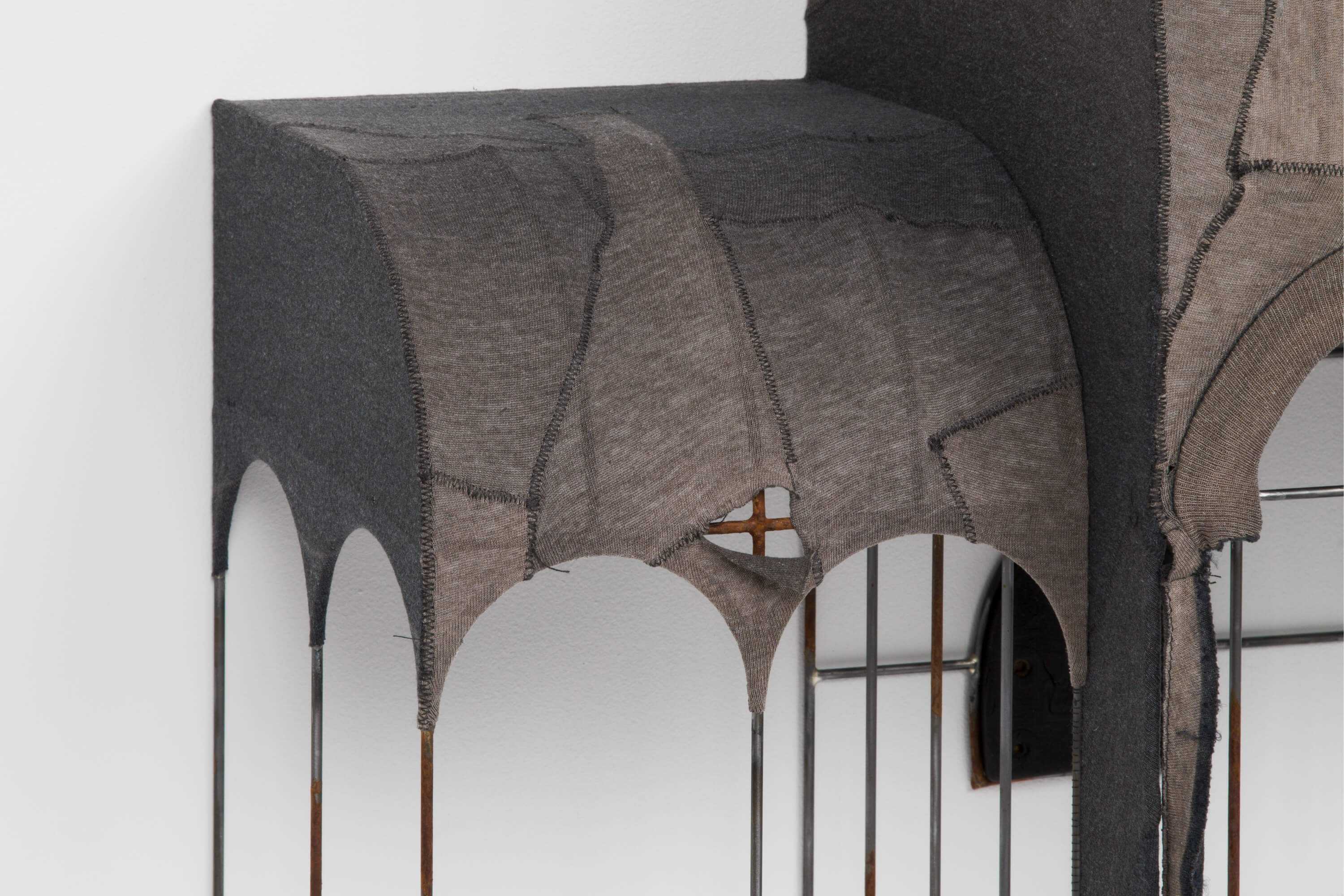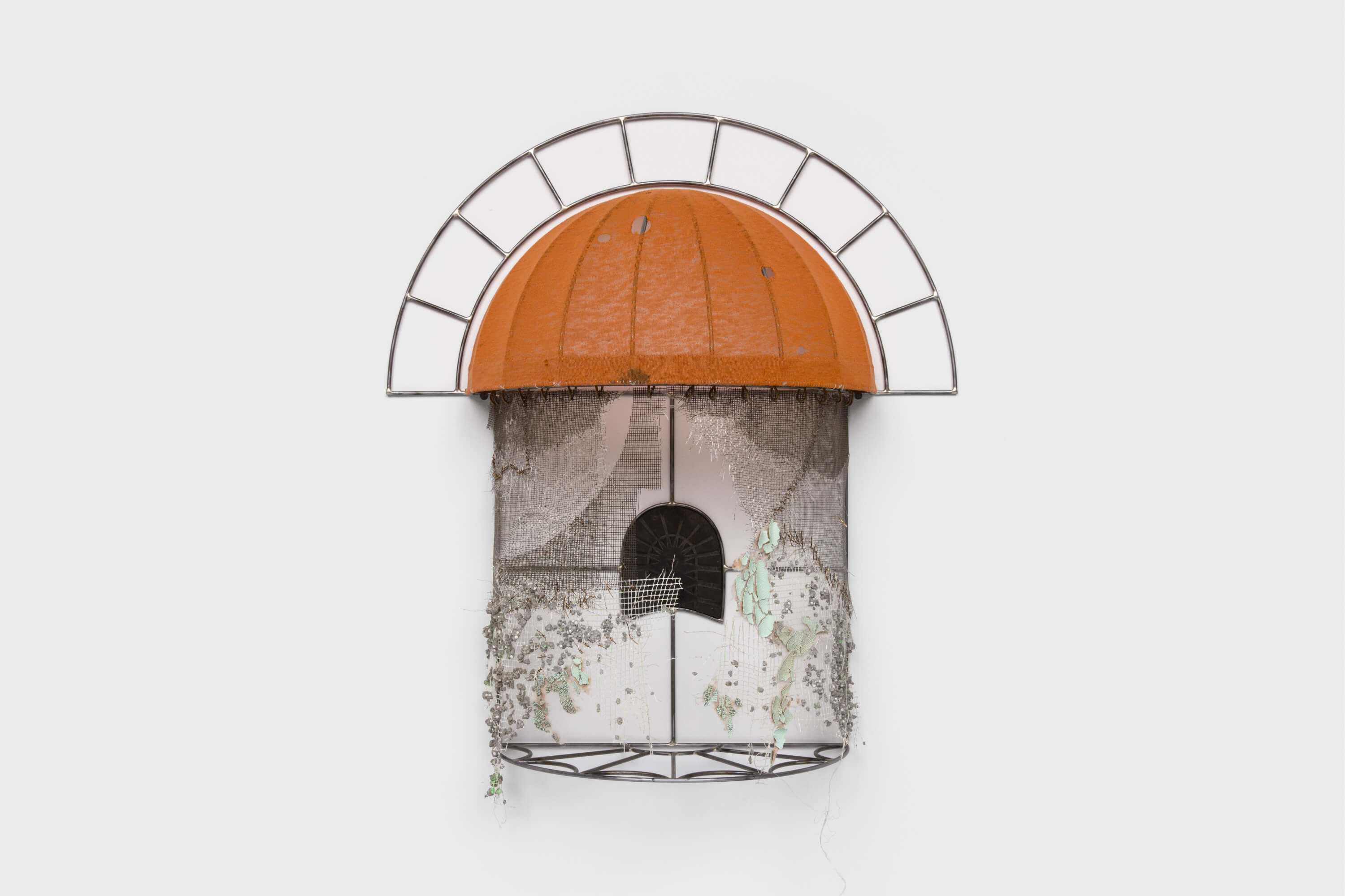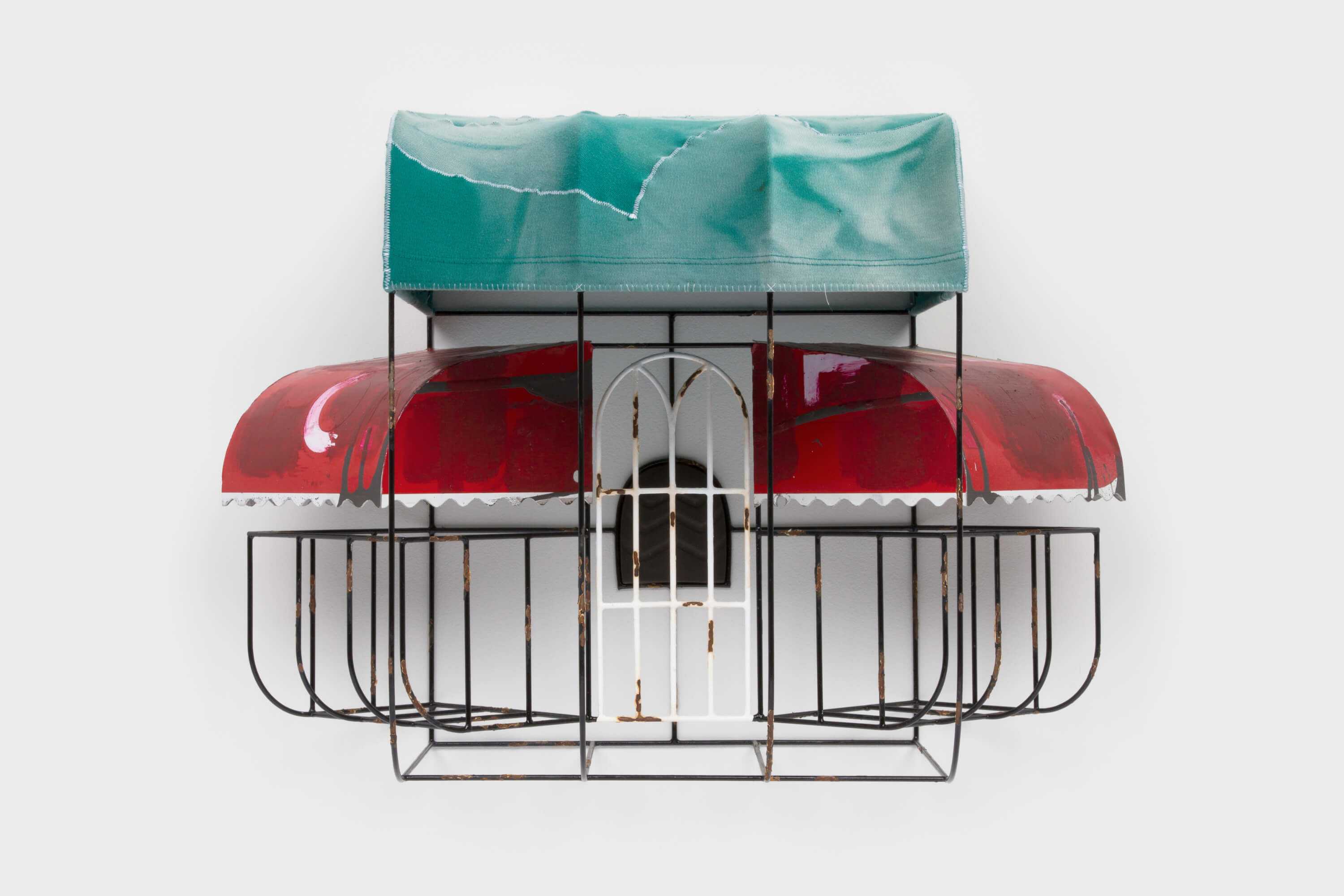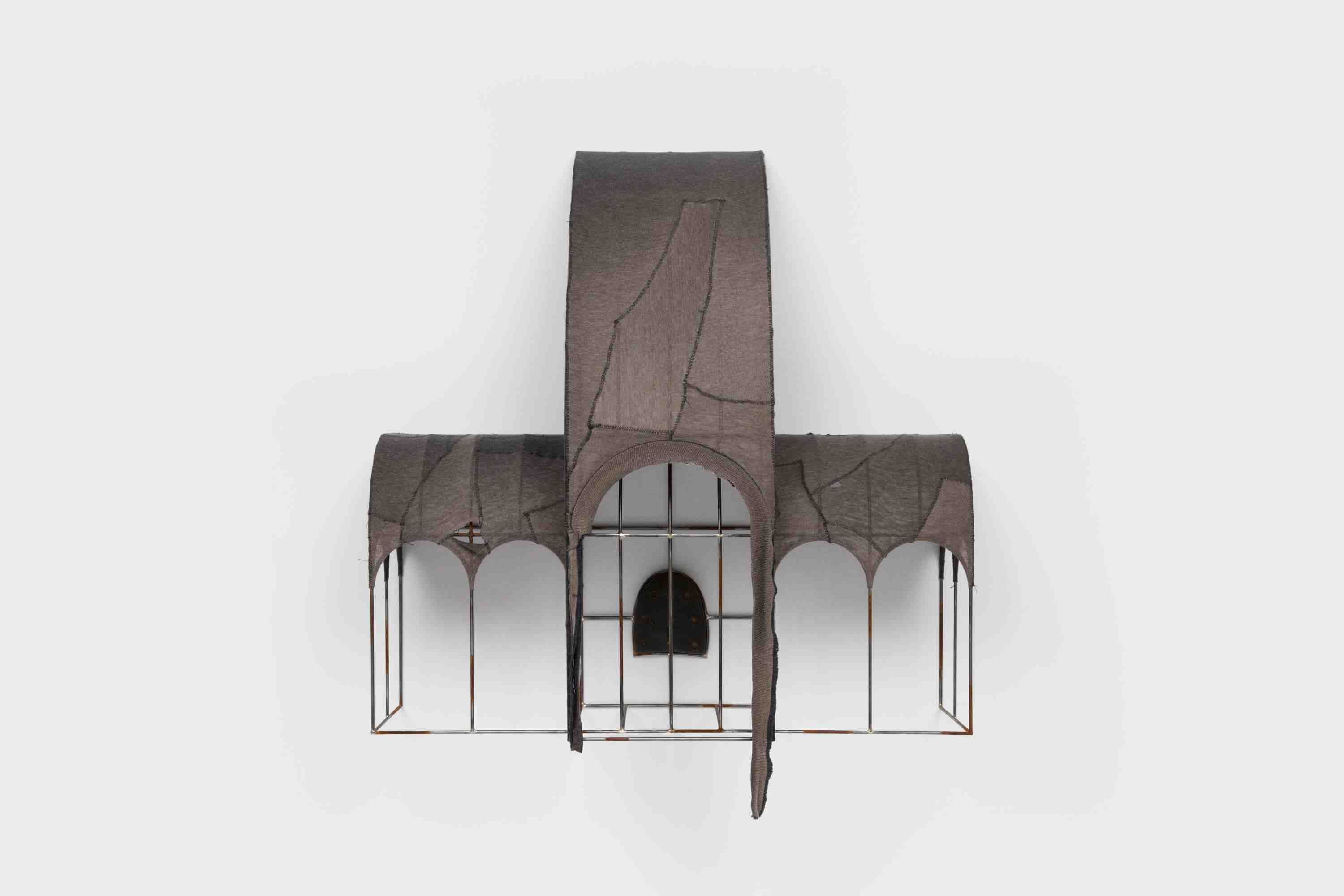 Tailored fabric collages envelop each silver-brazed construction, often assembled by threading through the original shirt seam, emphasizing the relationship between the surface materials and the structure beneath, further inviting a viewer's intimate gaze. In NOP (2024), the artist references a common red residential awning in Queens, mirroring the one outside his house, cut and rearranged from a âno parking signâ to form the curvature of an awning. Within the sheltered reliquary, a shoe heel tunnels into the wall â its darkened and worn rubber signifying the vanishing point at the workâs center. Like the worn fabric that forms the sculptureâs exterior, the shoe heel also retains the indentation of their wearerâs footstep.