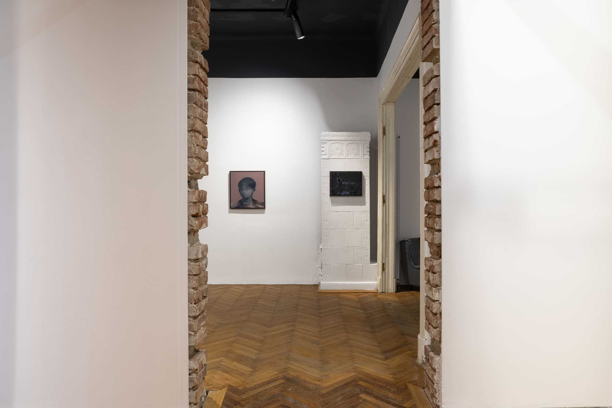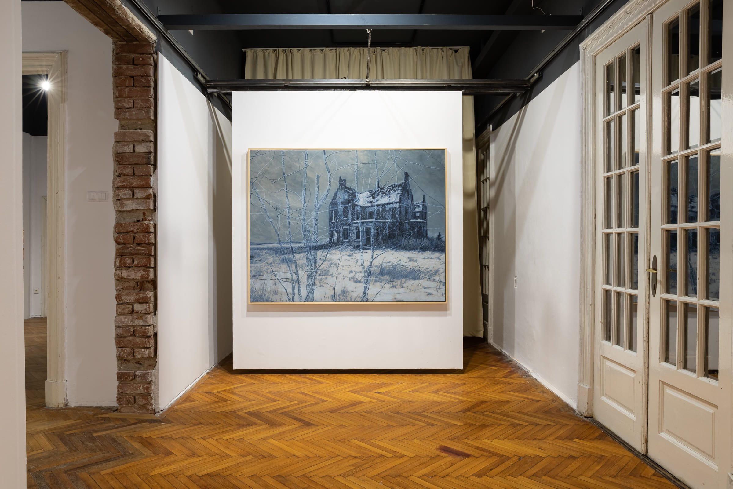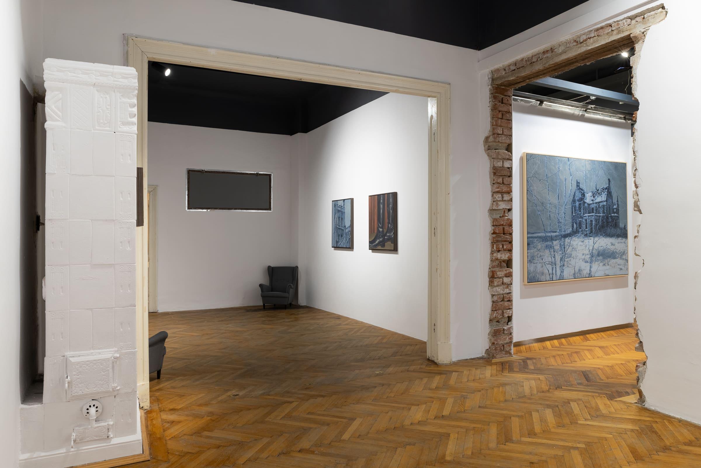 The exhibition opens with the painting In the living room shadows burn - a found digital image of an abandoned house - mounted on a moving wall. This shifting image imposes the viewerâs movements, drawing them closer and then pushing them away in a dynamic loop that mirrors the feeling of stepping into a house in a video game. The exhibition flows in a non-linear, fluid way, encouraging visitors to engage with the space, to step in and step out, just as one would enter and leave the rooms of a house.