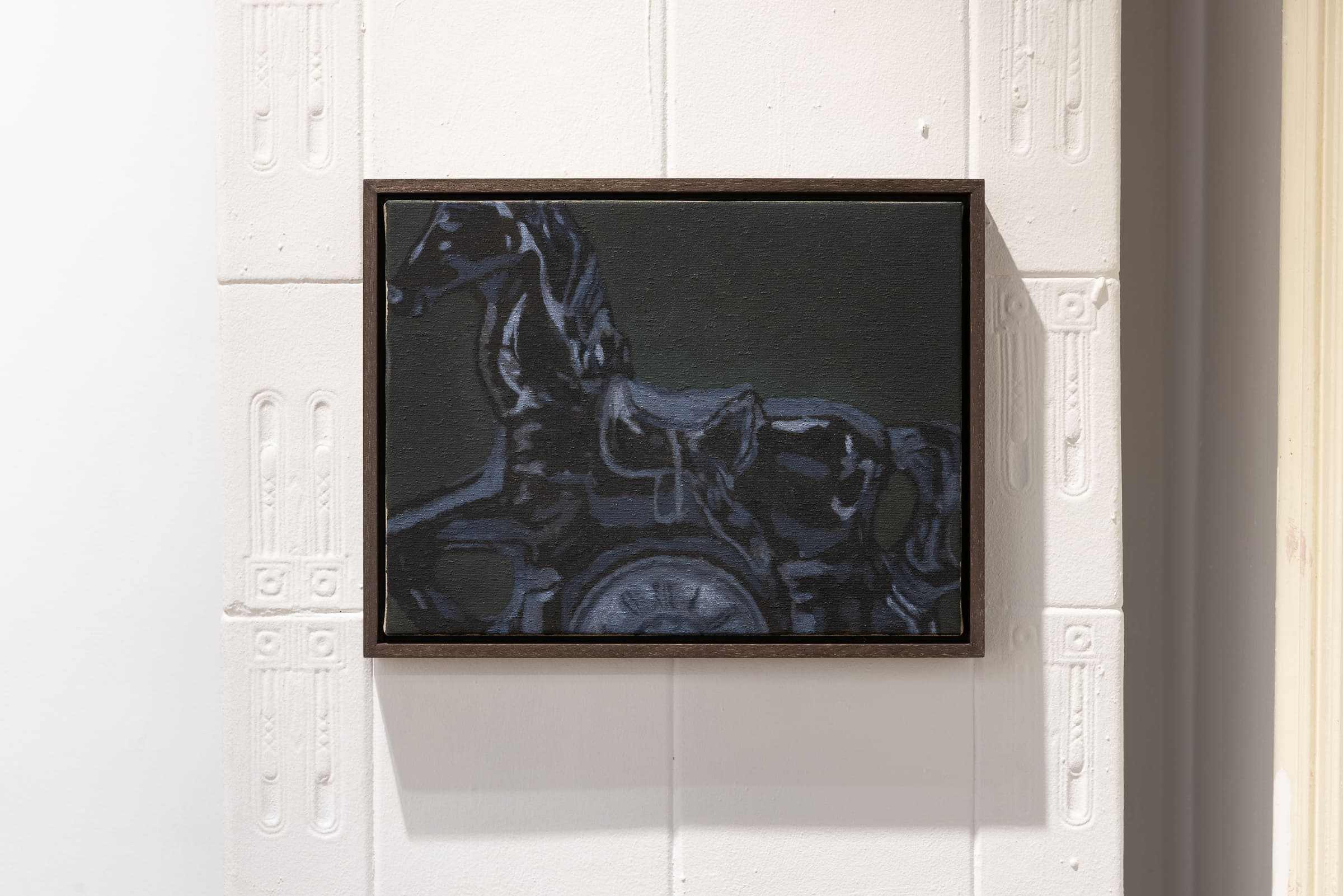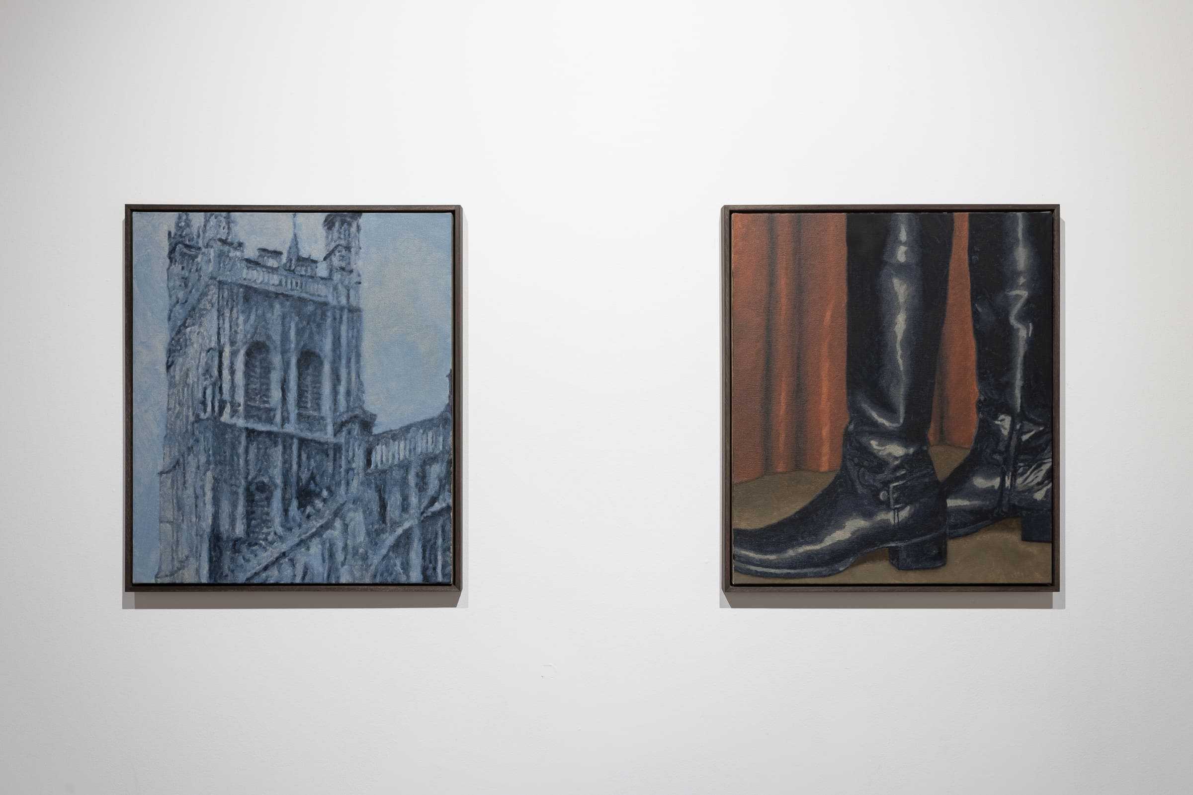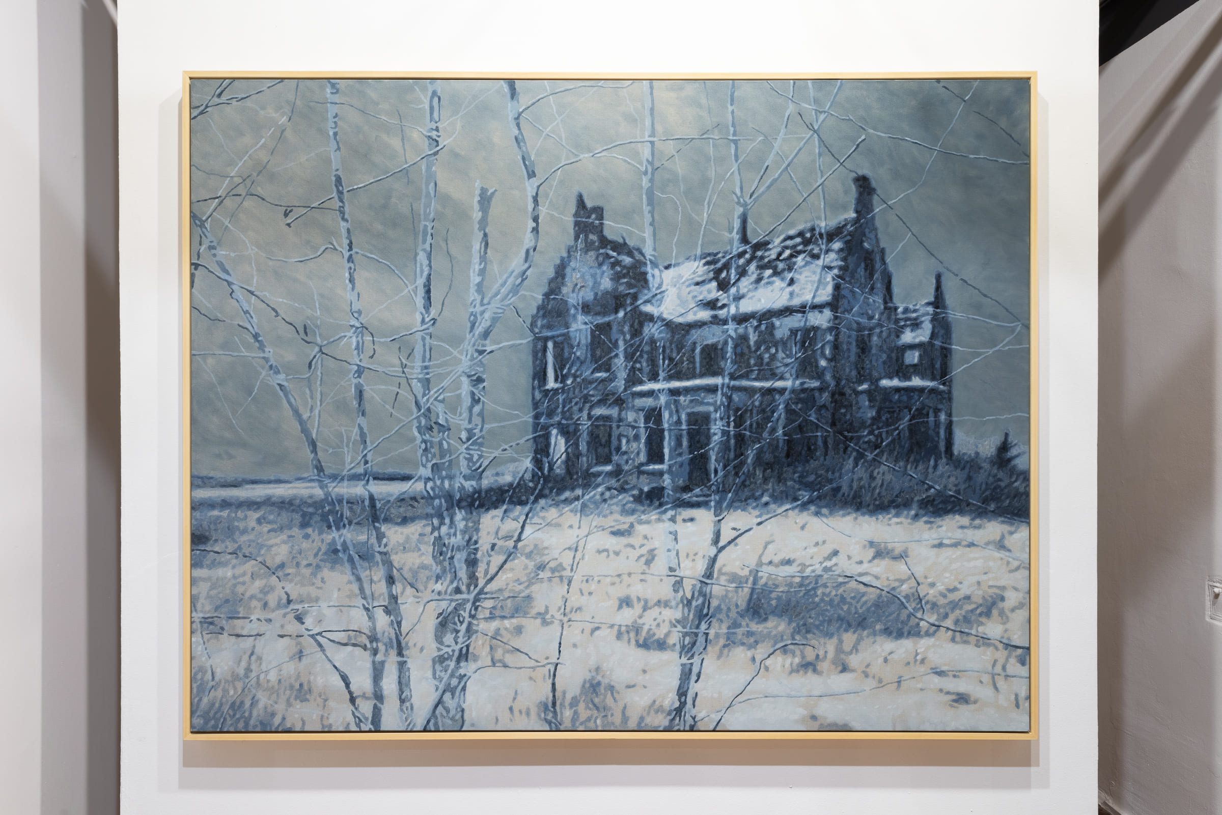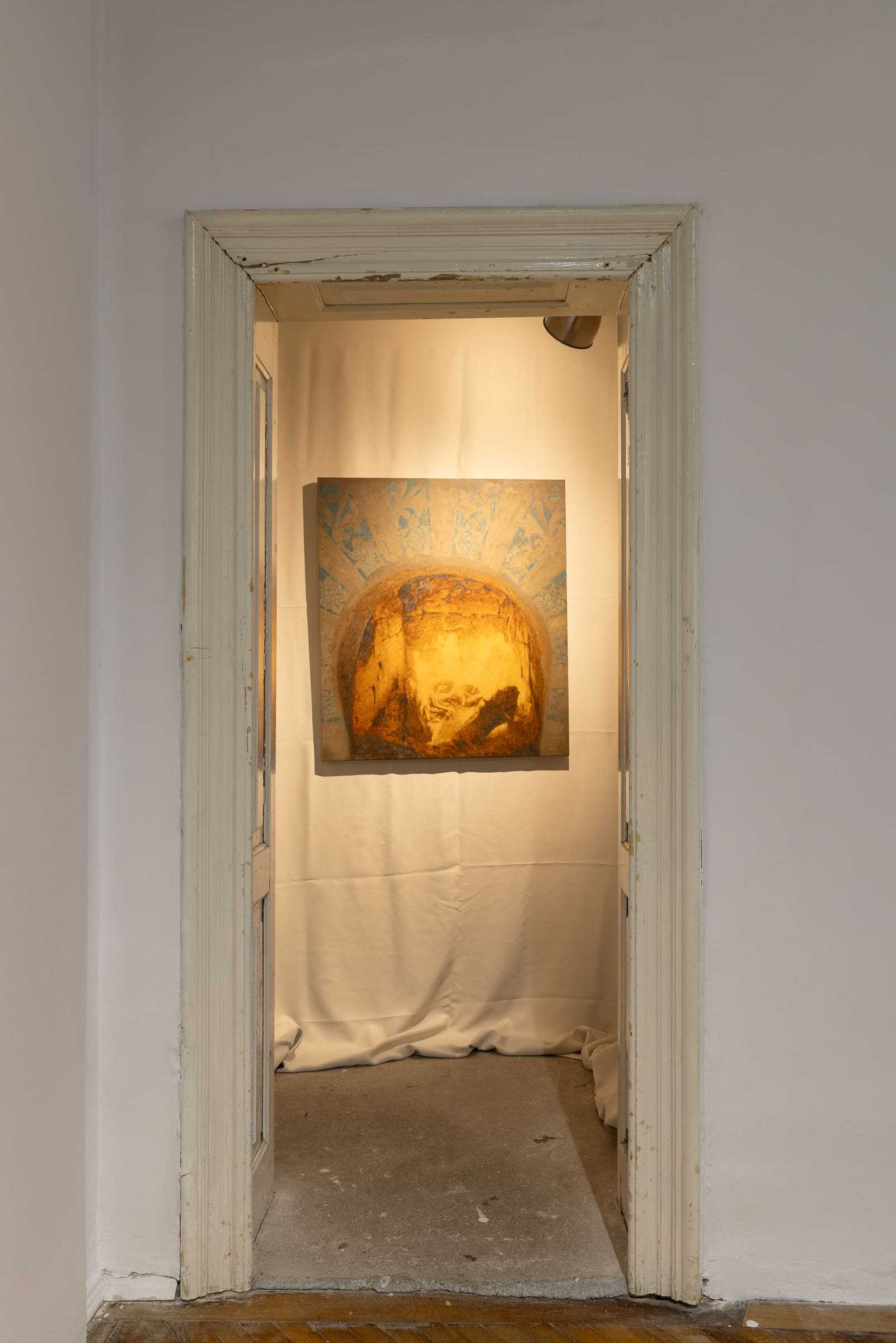 The exhibition opens with the painting In the living room shadows burn - a found digital image of an abandoned house - mounted on a moving wall. This shifting image imposes the viewerâs movements, drawing them closer and then pushing them away in a dynamic loop that mirrors the feeling of stepping into a house in a video game. The exhibition flows in a non-linear, fluid way, encouraging visitors to engage with the space, to step in and step out, just as one would enter and leave the rooms of a house.