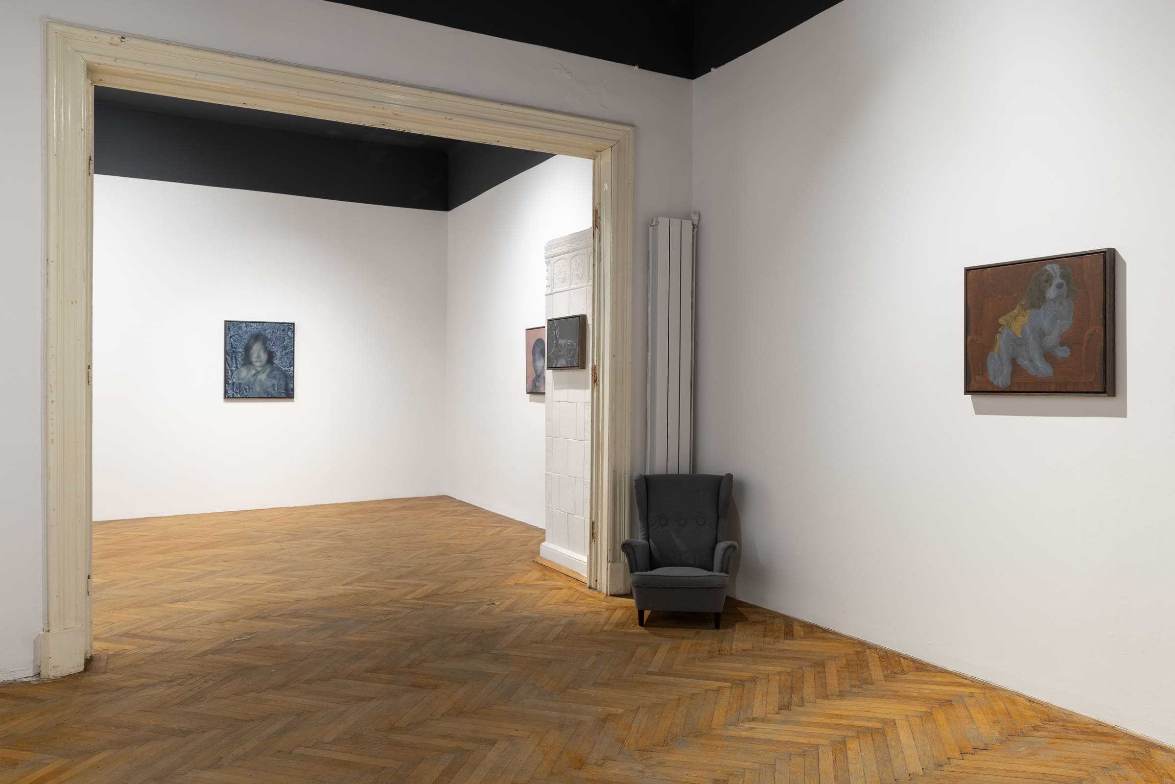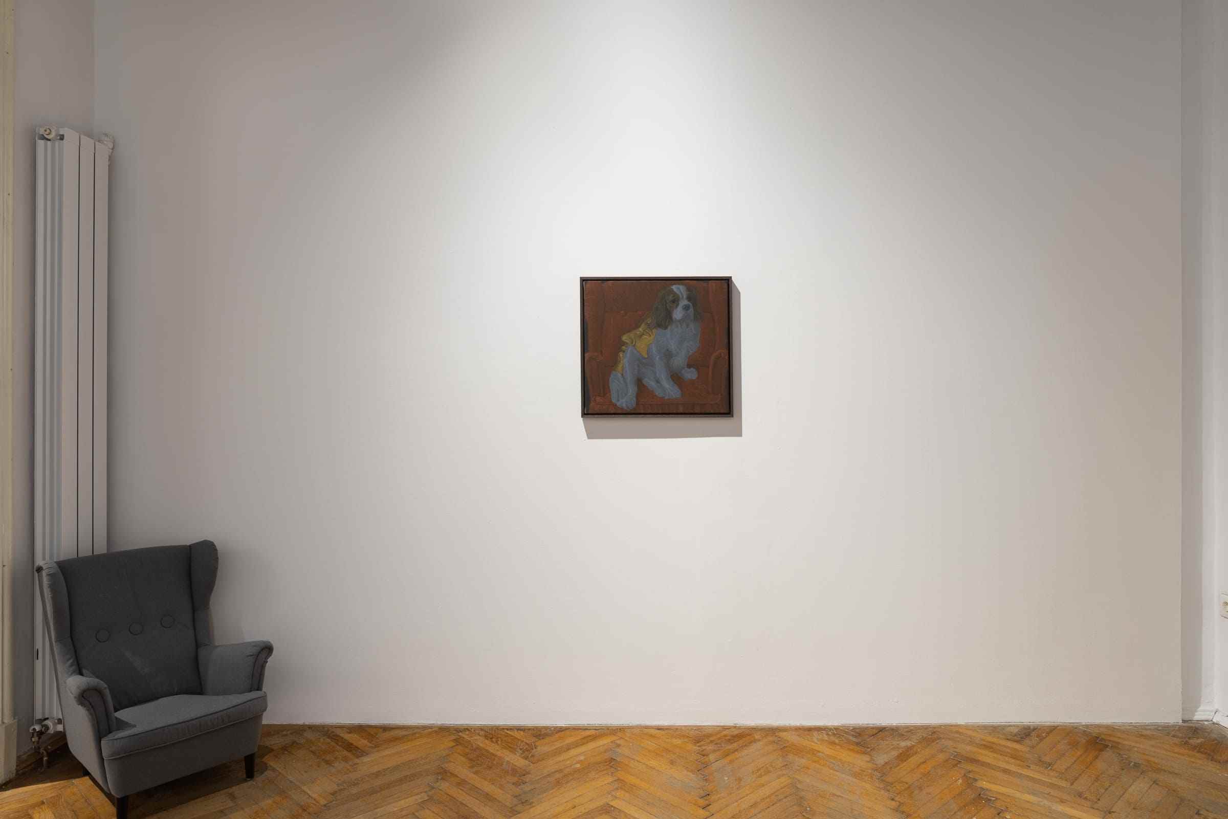 In the next room, the paintings take a more atmospheric turn, as if the artist decided to swap out portraits for objects and landscapes that look like theyâve just rolled out of a dreamâor perhaps an editorial magazine that took a fragmented turn. The painting World of Dogs portrays Lucaâs dog, Duru, seated on a very basic Ikea chairâan object familiar to many. In this context, the chair can become a symbol of the global ubiquity of consumer goods, a standardized object that populates millions of living rooms around the world. The chair in the painting is brought into real life not as the standard version we know, but reimagined and scaled down, specifically for kidsâor, in this case, for Duru, the dog, who probably couldnât care less about the capitalist forces that produced it.