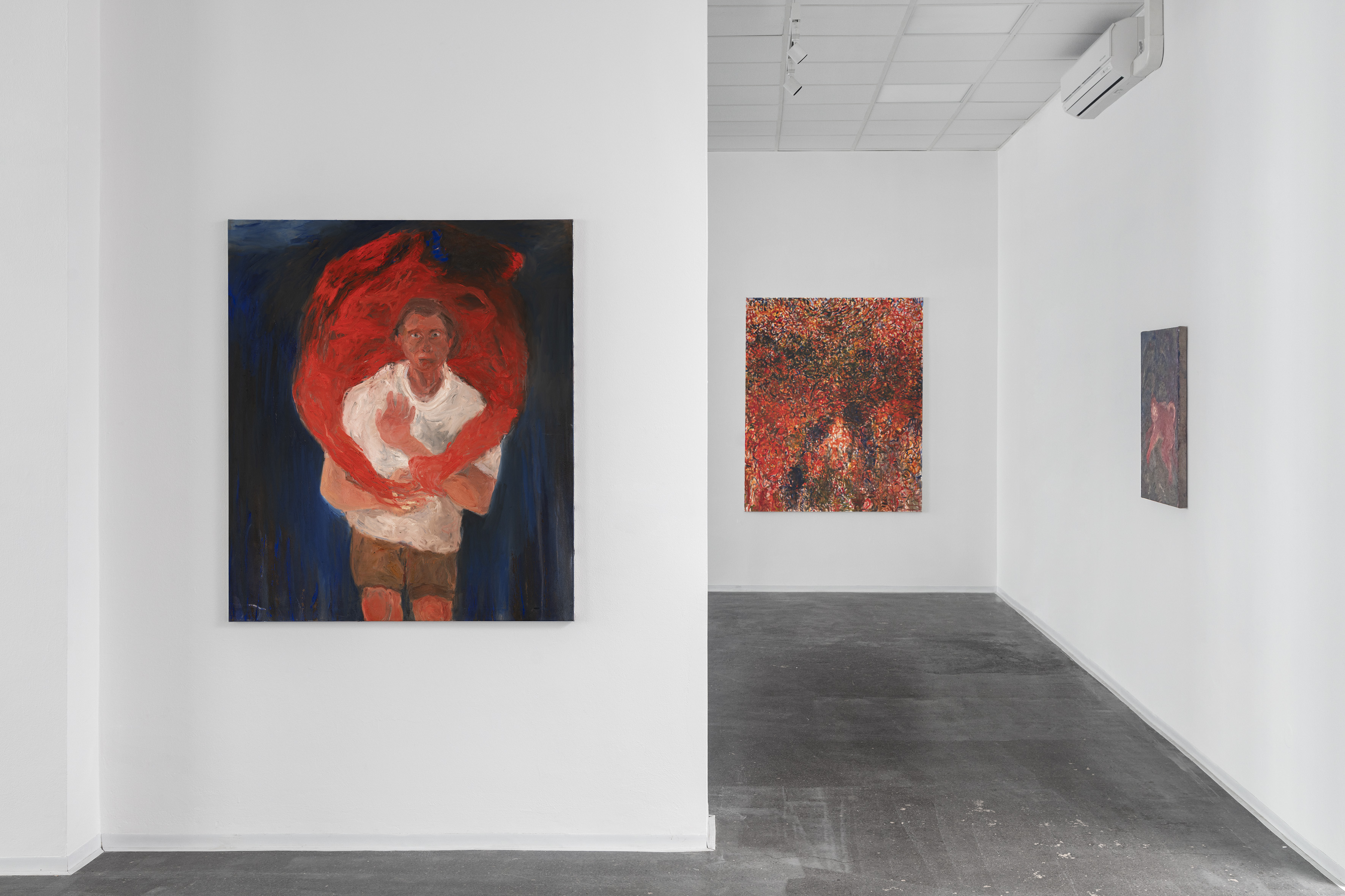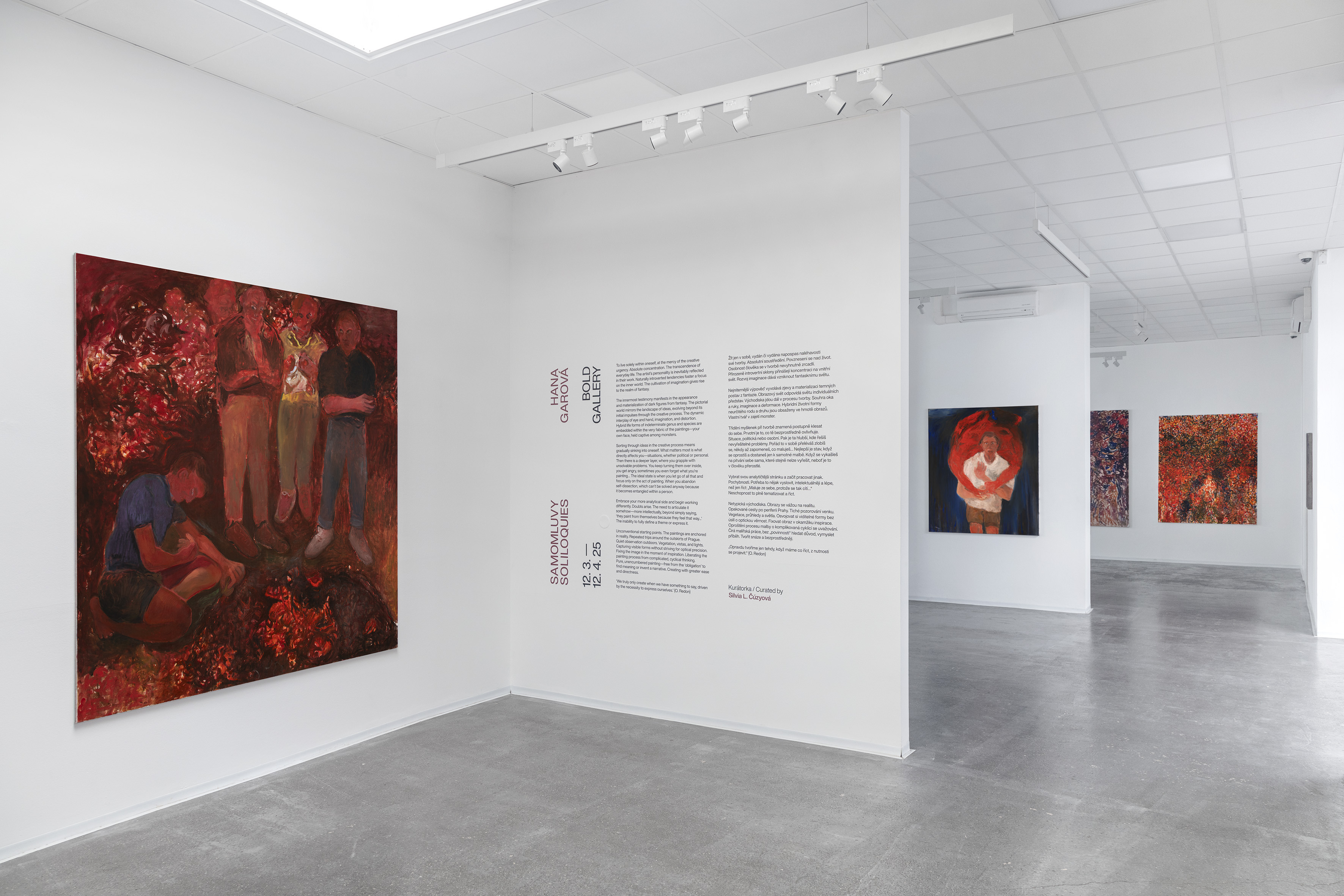 Hana Garová’s solo exhibition at the Bold Gallery in Prague features entirely new, previously unexhibited paintings that reflect a more analytical approach. The selection of works is based on contrasts of pure color shades—distinctive blues, reds, greens, with accents of yellow and purple. Figures and figurative compositions hold a dominant place in the paintings, significantly shaping the structural frameworks of their content. A notable development is the expanded presence of landscape features and structures, rendered in striking watercolor-like washes of saturated color. The author explores her pictorial themes through various techniques and approaches, reflecting the diverse range of painting challenges she engages with. The transition from one painting to another is abrupt and spontaneous, yet seemingly disparate works are unified by underlying internal connections.