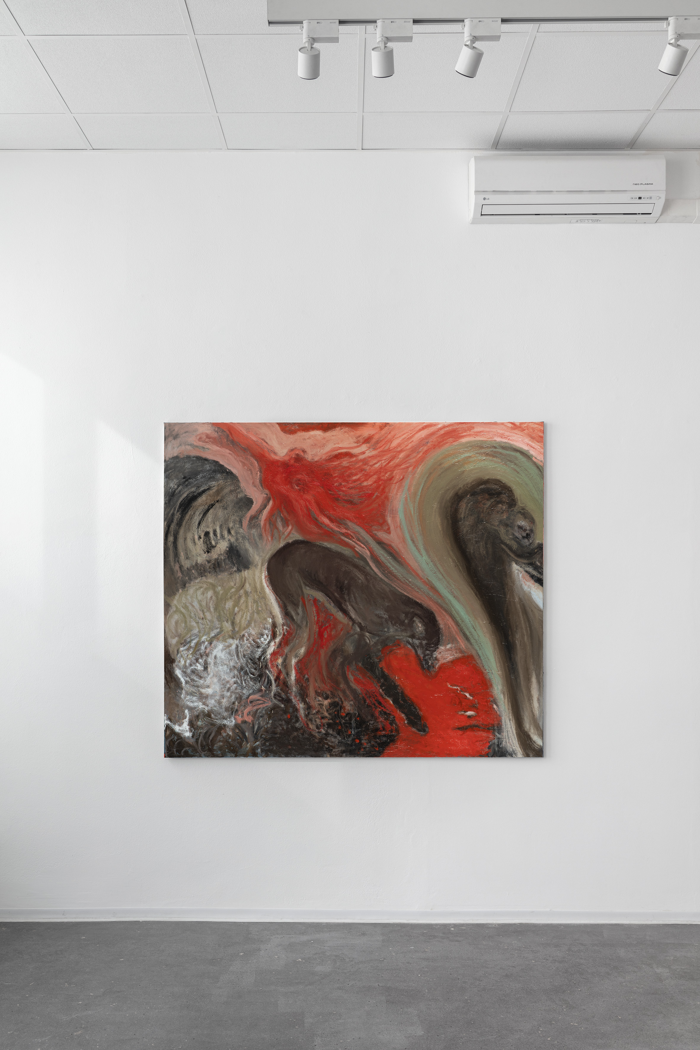 The innermost testimony manifests in the appearance and materialization of dark figures from fantasy. The pictorial world mirrors the landscape of ideas, evolving beyond its initial impulses through the creative process. The dynamic interplay of eye and hand, imagination, and distortion. Hybrid life forms of indeterminate genus and species are embedded within the very fabric of the paintings—your own face, held captive among monsters.