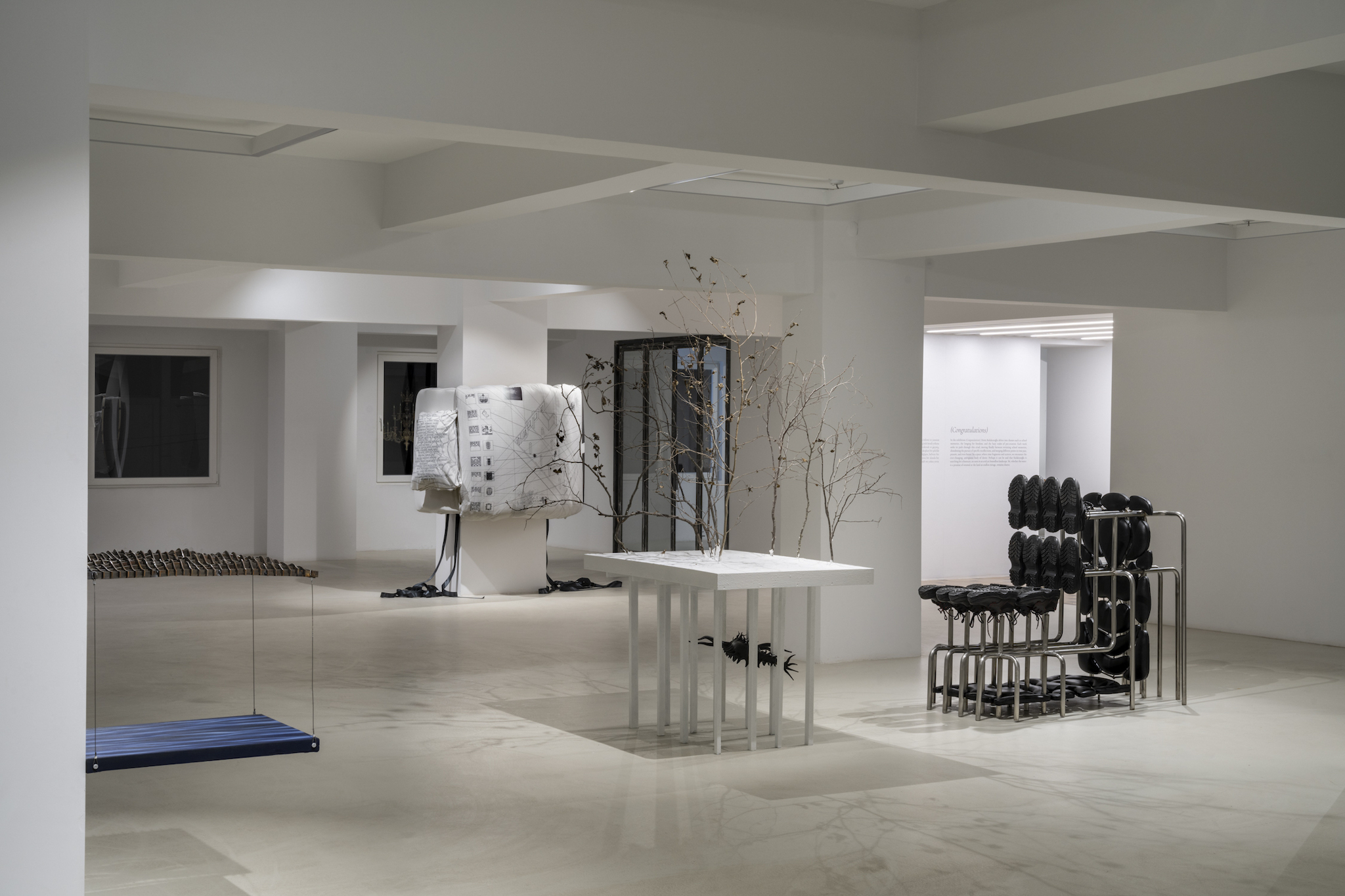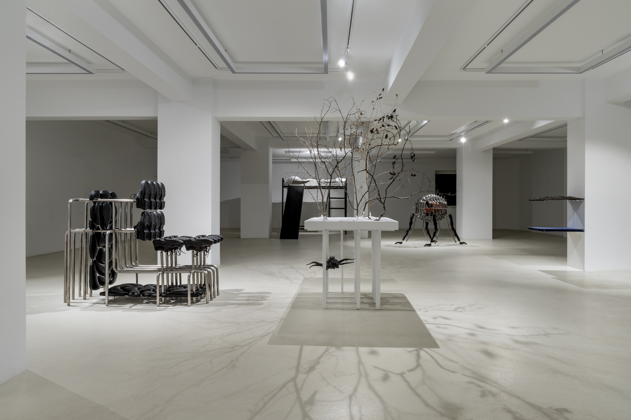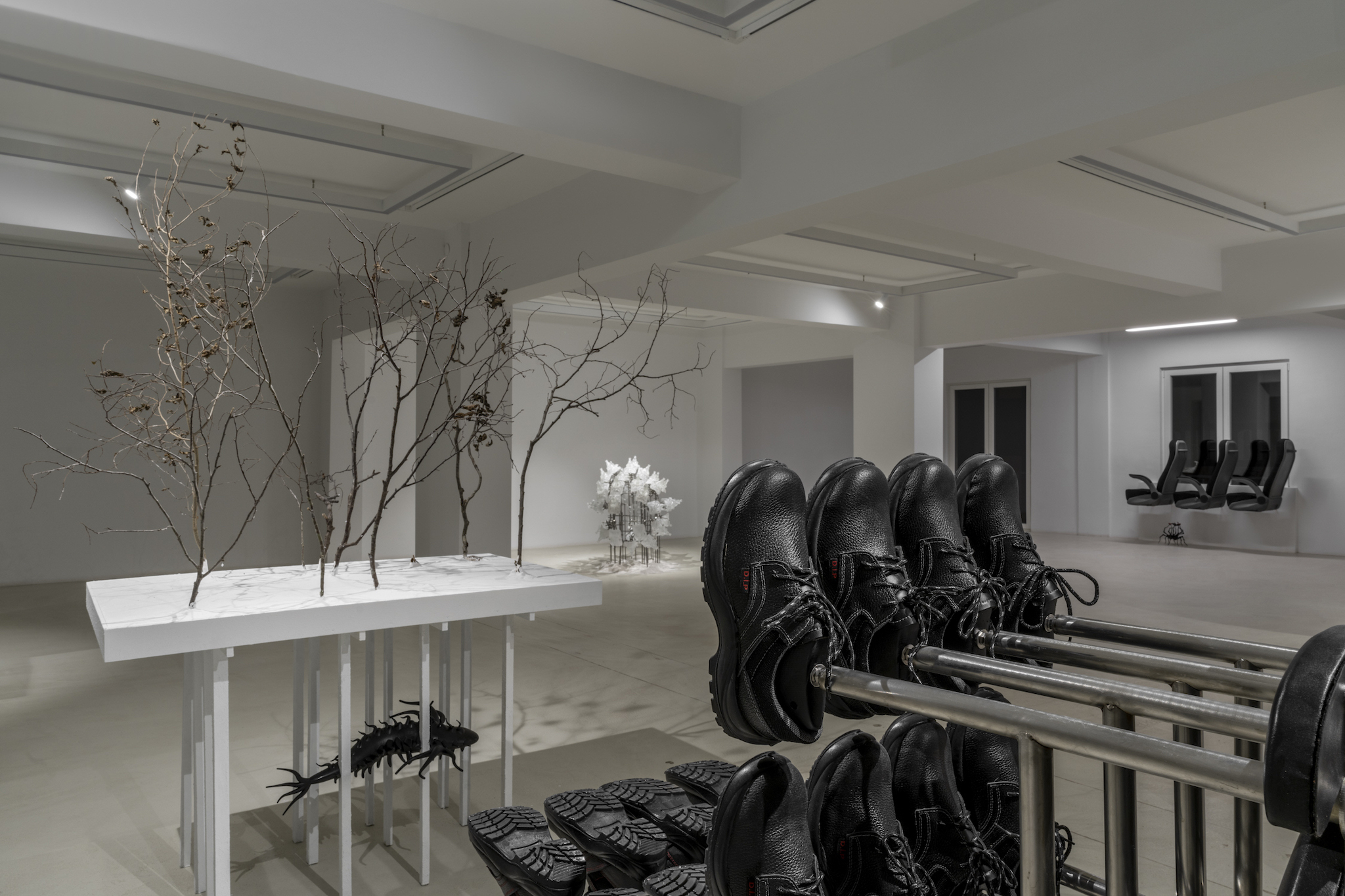 meta-masters, sass and drywall, 2024, stainless steel, steel-toe leather work shoes, synthetic leather, foam, mdf, wood, wall paint, plaster, pla, tree branch