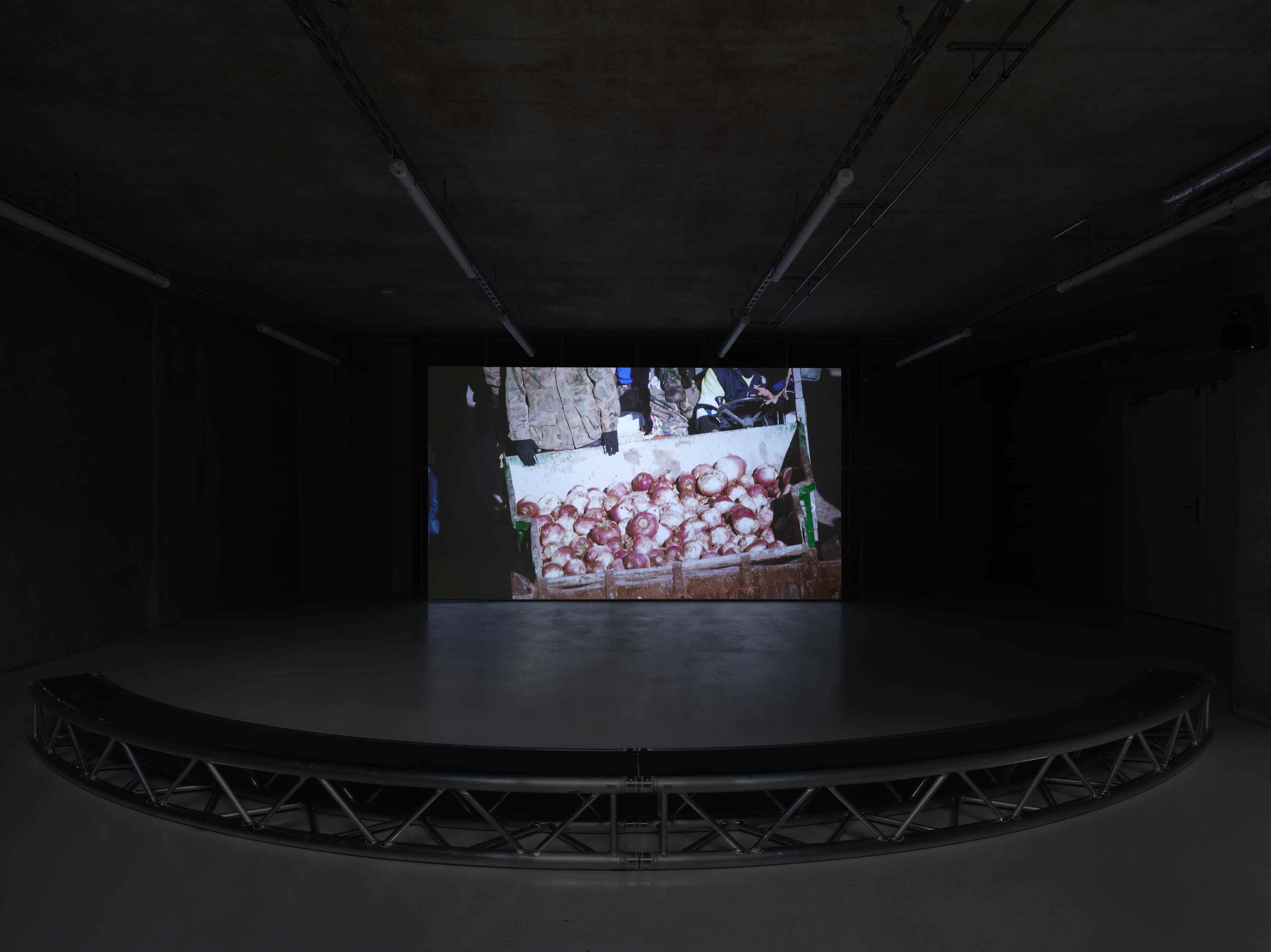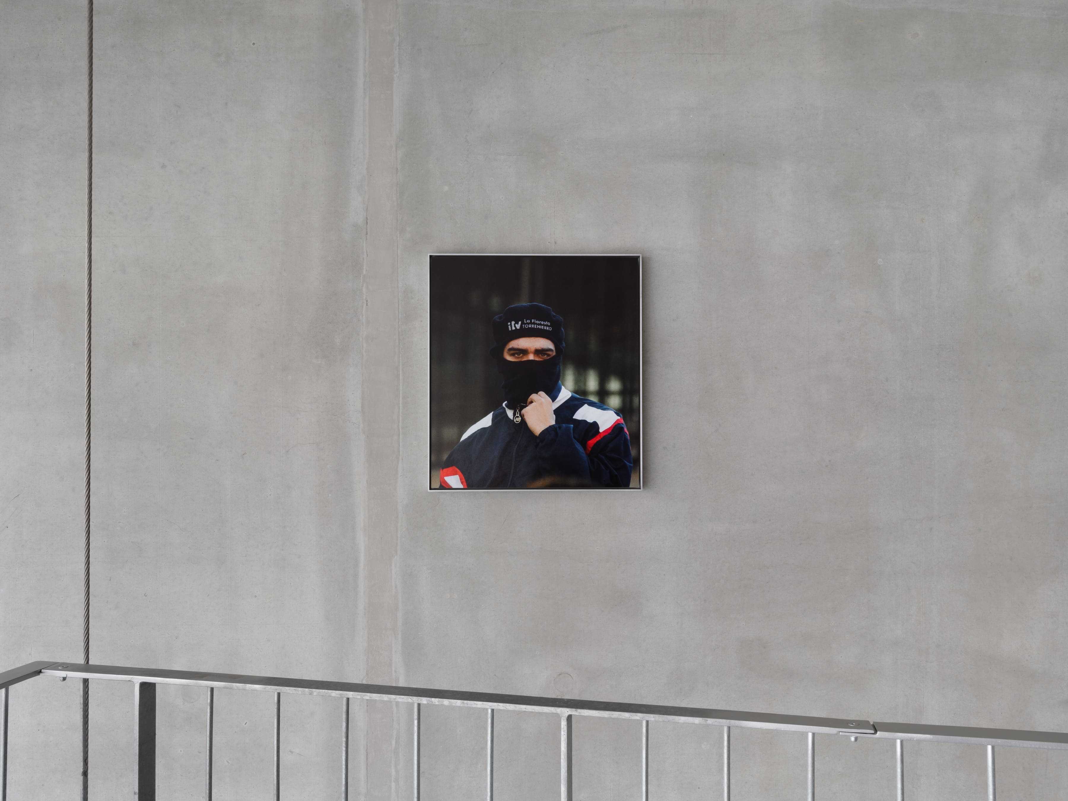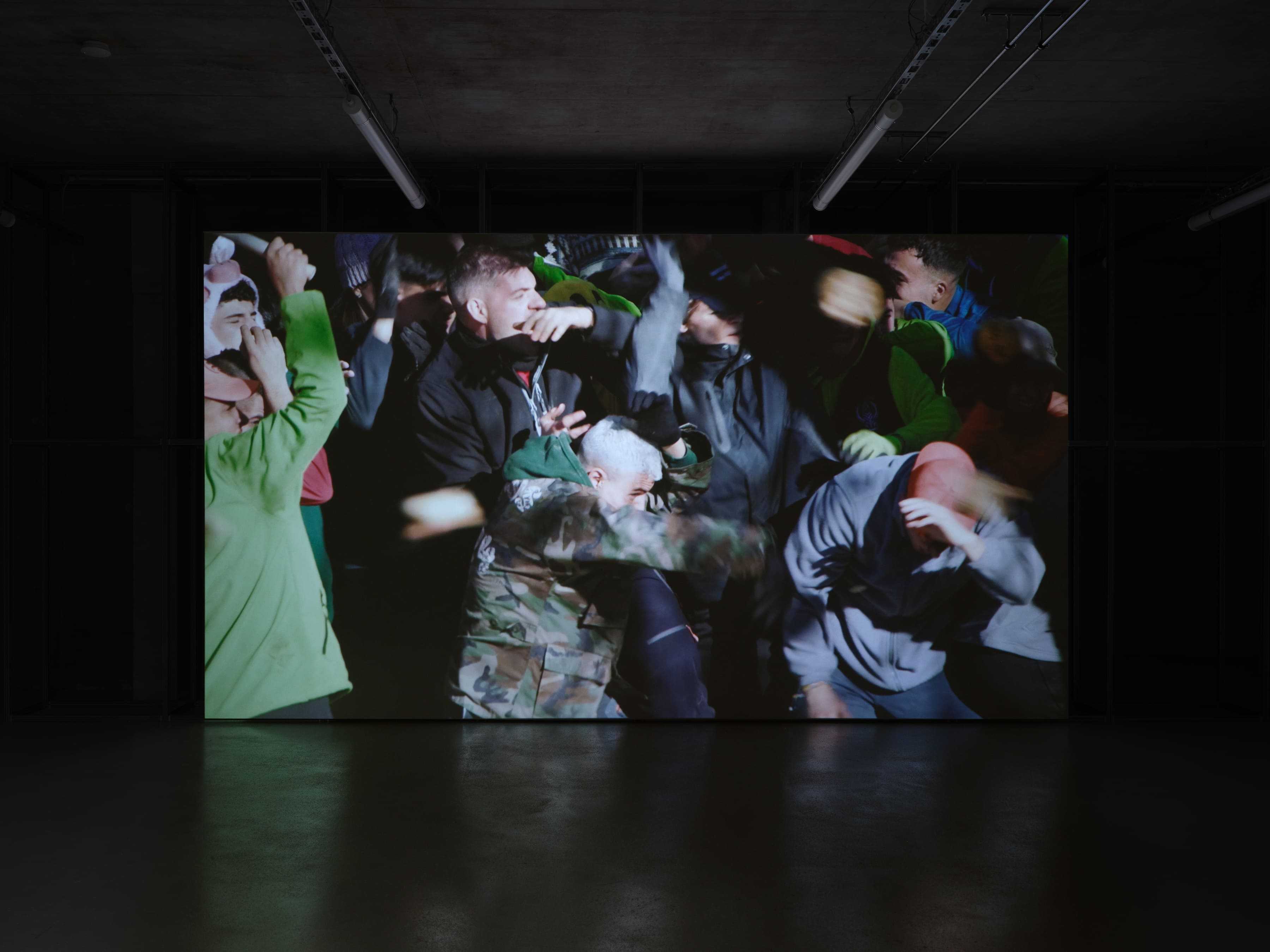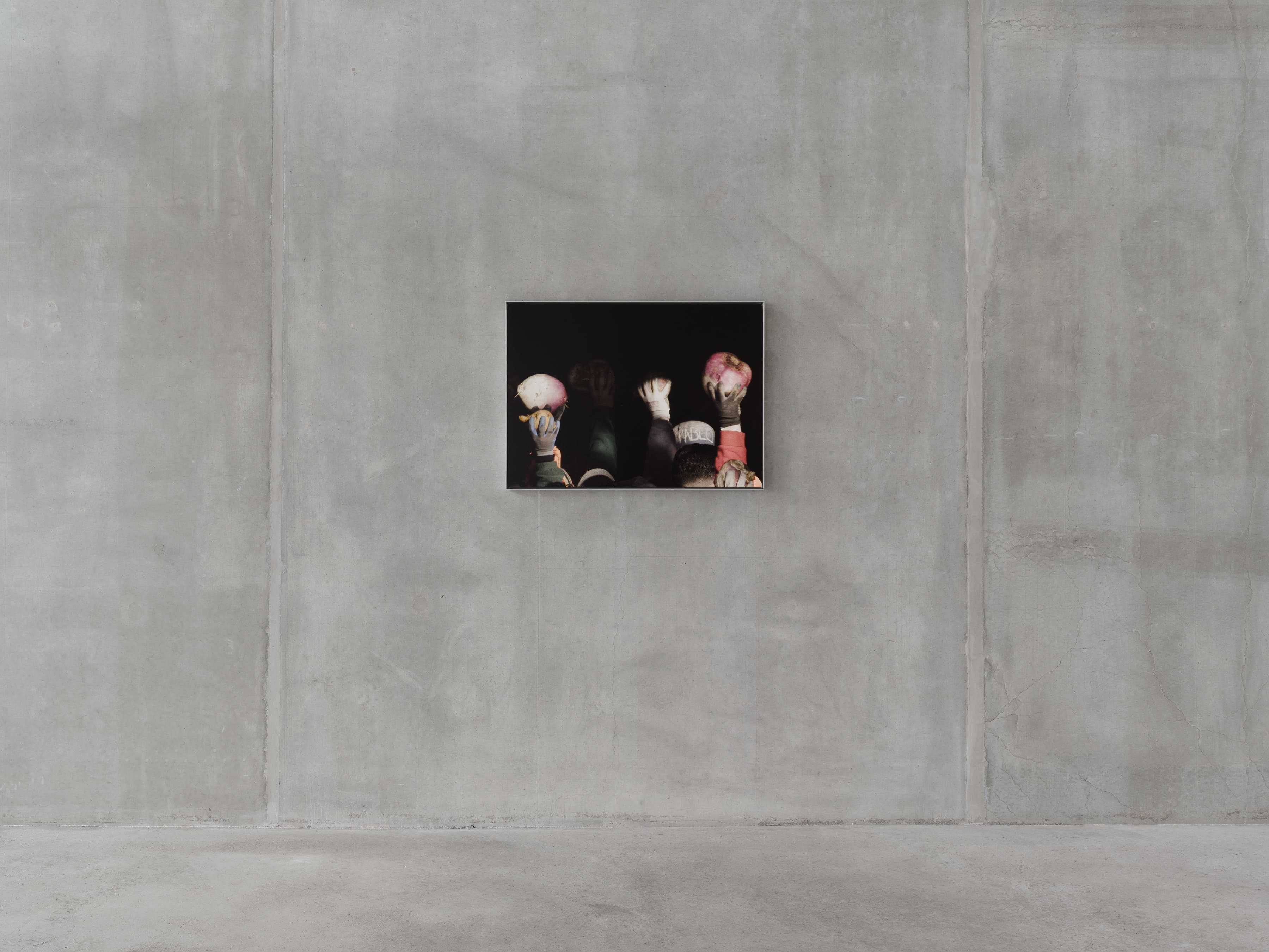 For its premiere at Galerie Molitor, Jarramplas is presented on purpose- built scaffolding and displayed with four related photographs from her series Barrage. The film begins with the violent-sounding clamor of fireworks in a night sky. Slowly, young people wearing ponchos in a rainy, southern European town prepare for some sort of event: a fight? A celebration? The camera’s gaze focuses on turnips, collected by big machinery and ultimately thrown at one another. Over the course of roughly fifteen minutes, we glimpse a picture of contemporary youth at a crossroads. By intentionally withholding key contextualizing information, Afsah asks us to question what is really going on here. Installed throughout the gallery space, a series of photographs allows viewers to examine the visual tension of Afsah’s project: a man in military fatigue cowers, about to be hit by organic matter; a number of turnips are hoisted up like trophies or heads; a young person’s hands take on an almost hawklike position; a man in a balaclava stares back at the camera. Afsah’s films and photographs are about what remains unseen as much as what is revealed. Crucially, in