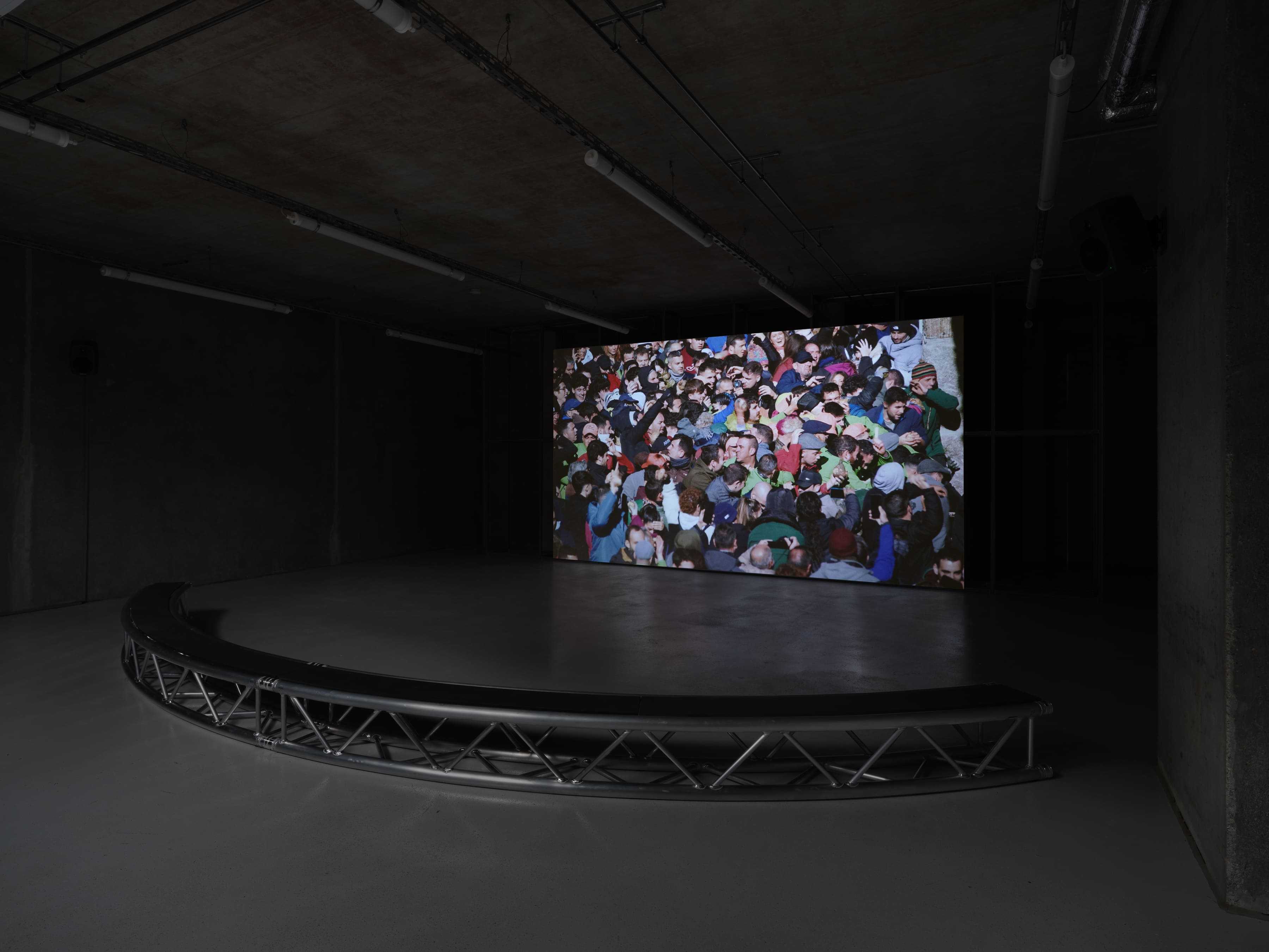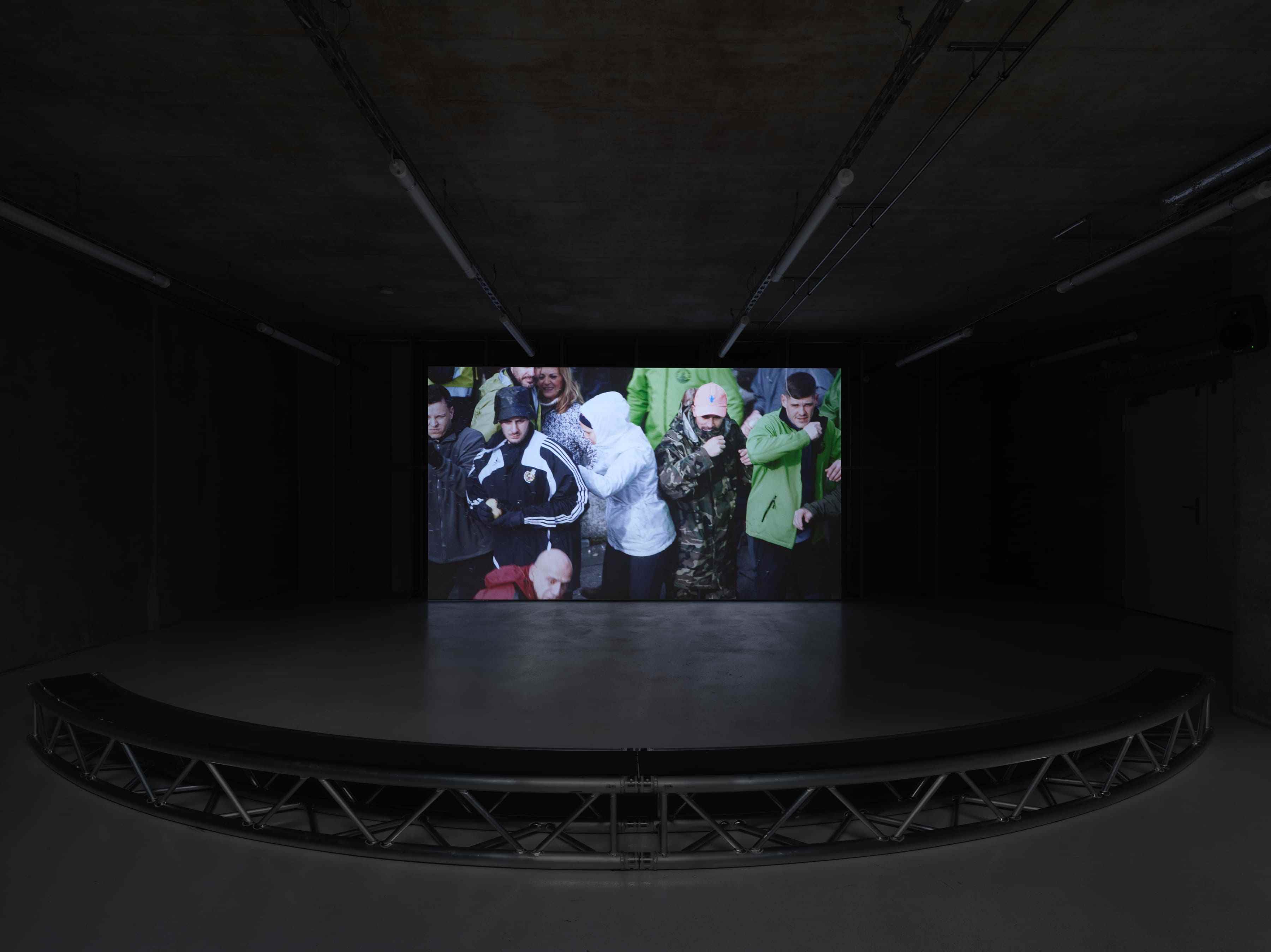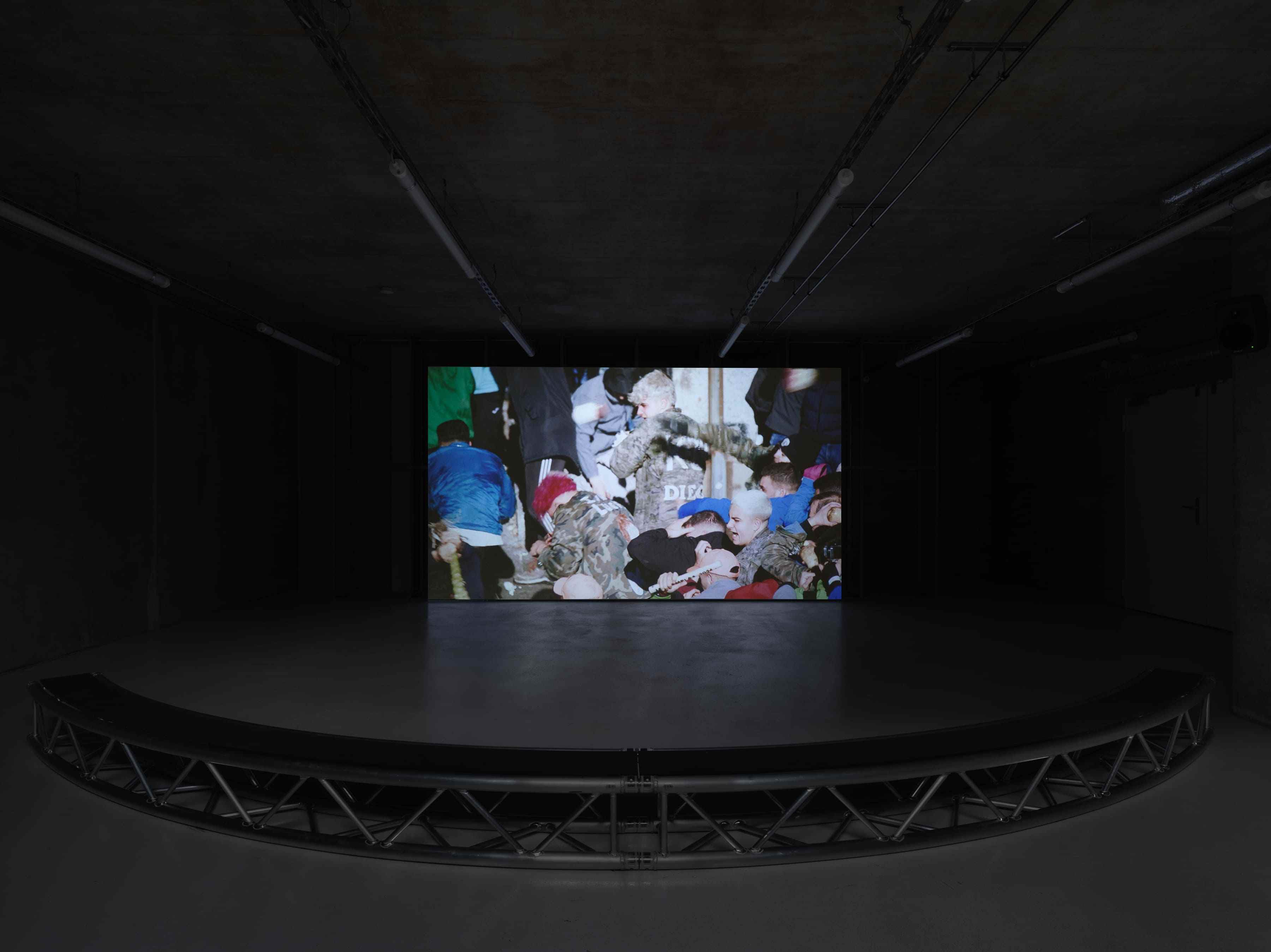 For its premiere at Galerie Molitor, Jarramplas is presented on purpose- built scaffolding and displayed with four related photographs from her series Barrage. The film begins with the violent-sounding clamor of fireworks in a night sky. Slowly, young people wearing ponchos in a rainy, southern European town prepare for some sort of event: a fight? A celebration? The camera’s gaze focuses on turnips, collected by big machinery and ultimately thrown at one another. Over the course of roughly fifteen minutes, we glimpse a picture of contemporary youth at a crossroads. By intentionally withholding key contextualizing information, Afsah asks us to question what is really going on here. Installed throughout the gallery space, a series of photographs allows viewers to examine the visual tension of Afsah’s project: a man in military fatigue cowers, about to be hit by organic matter; a number of turnips are hoisted up like trophies or heads; a young person’s hands take on an almost hawklike position; a man in a balaclava stares back at the camera. Afsah’s films and photographs are about what remains unseen as much as what is revealed. Crucially, in