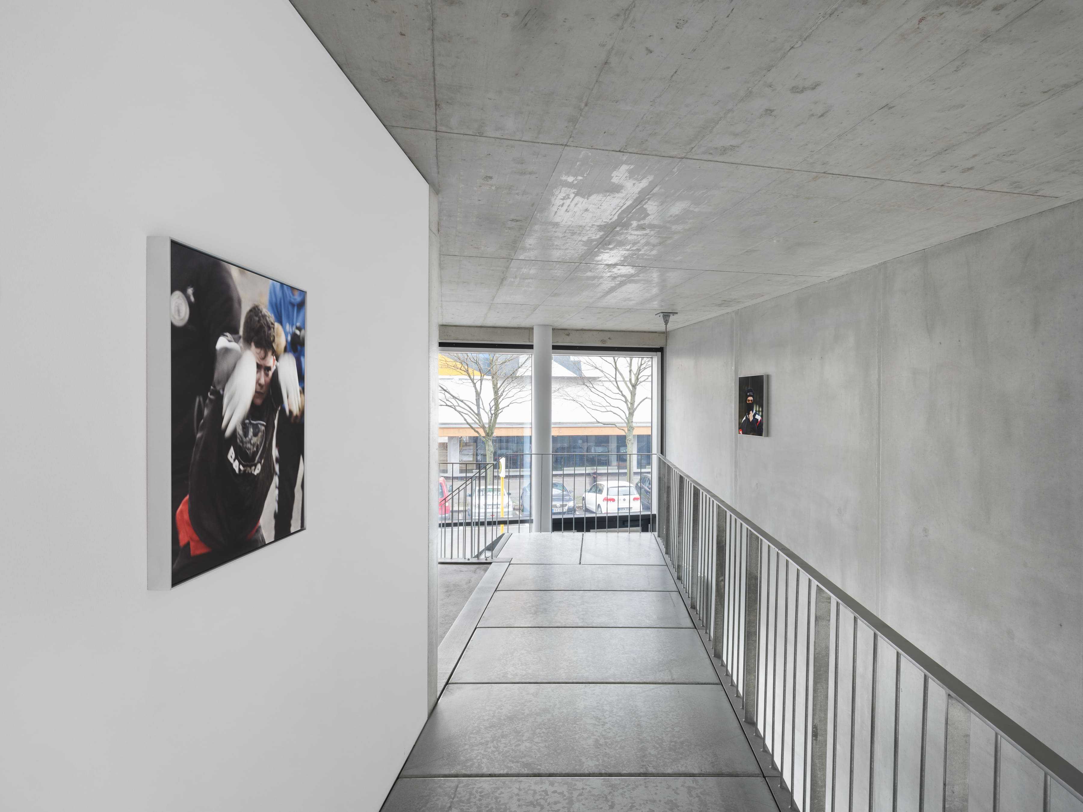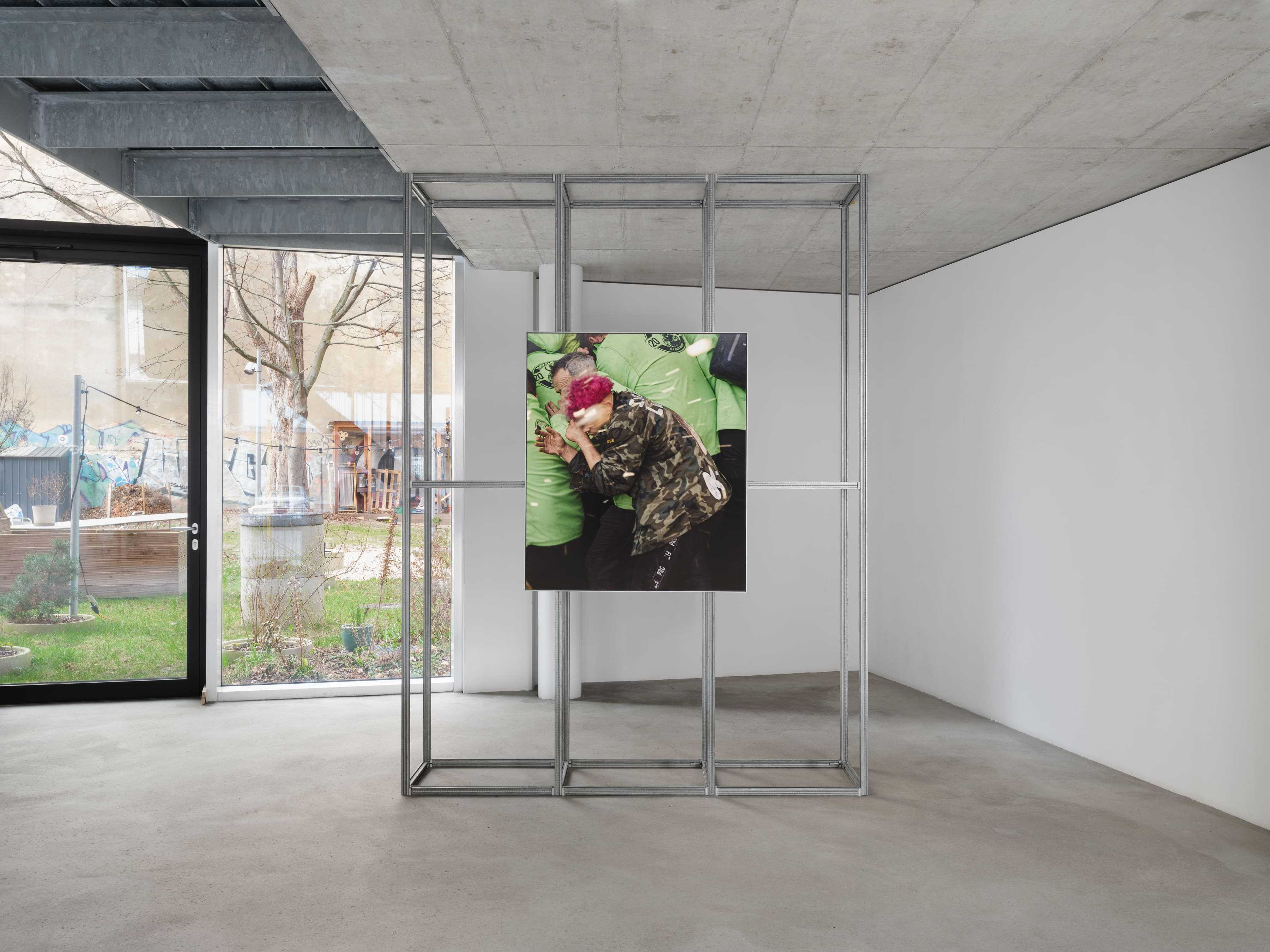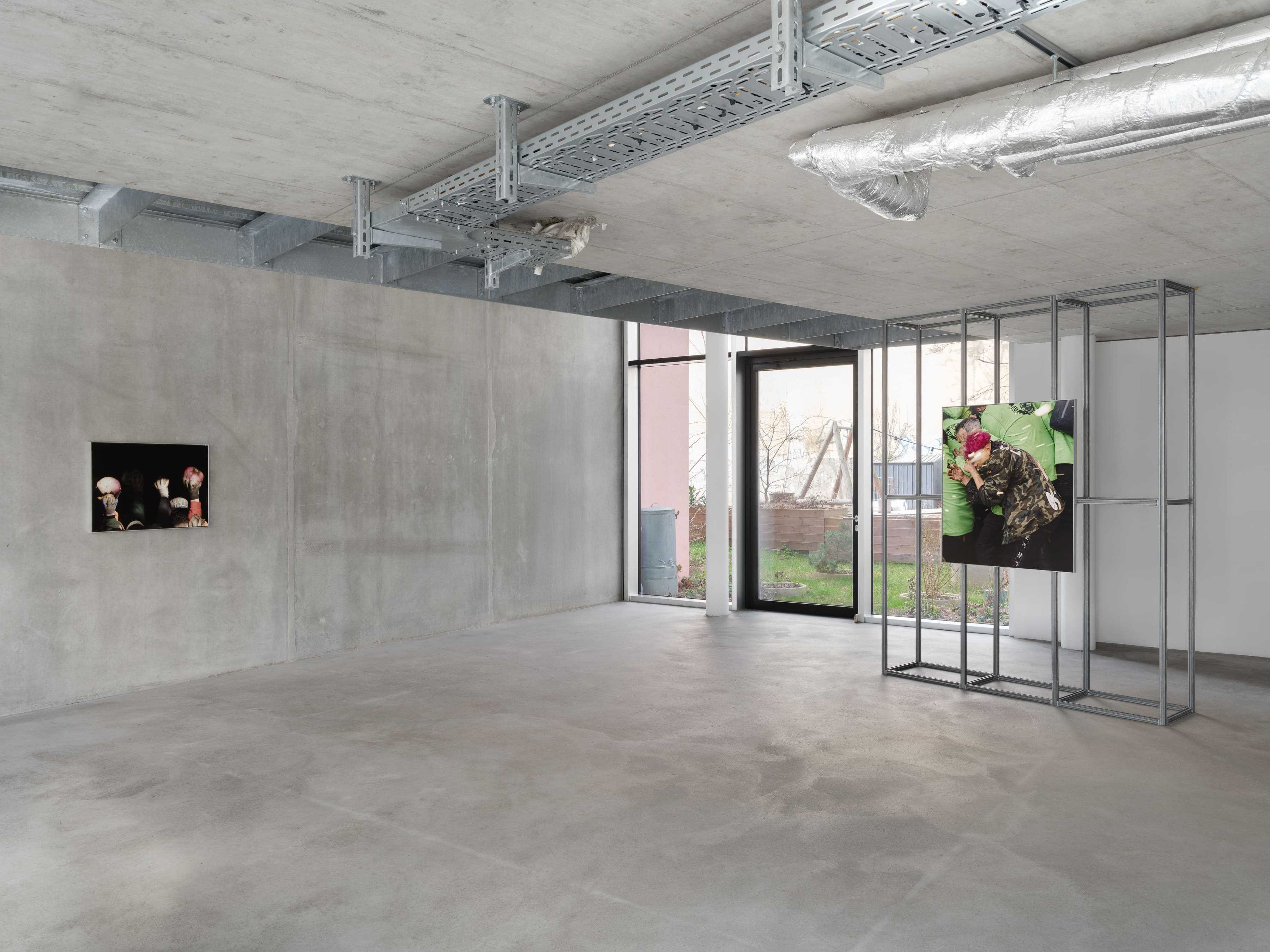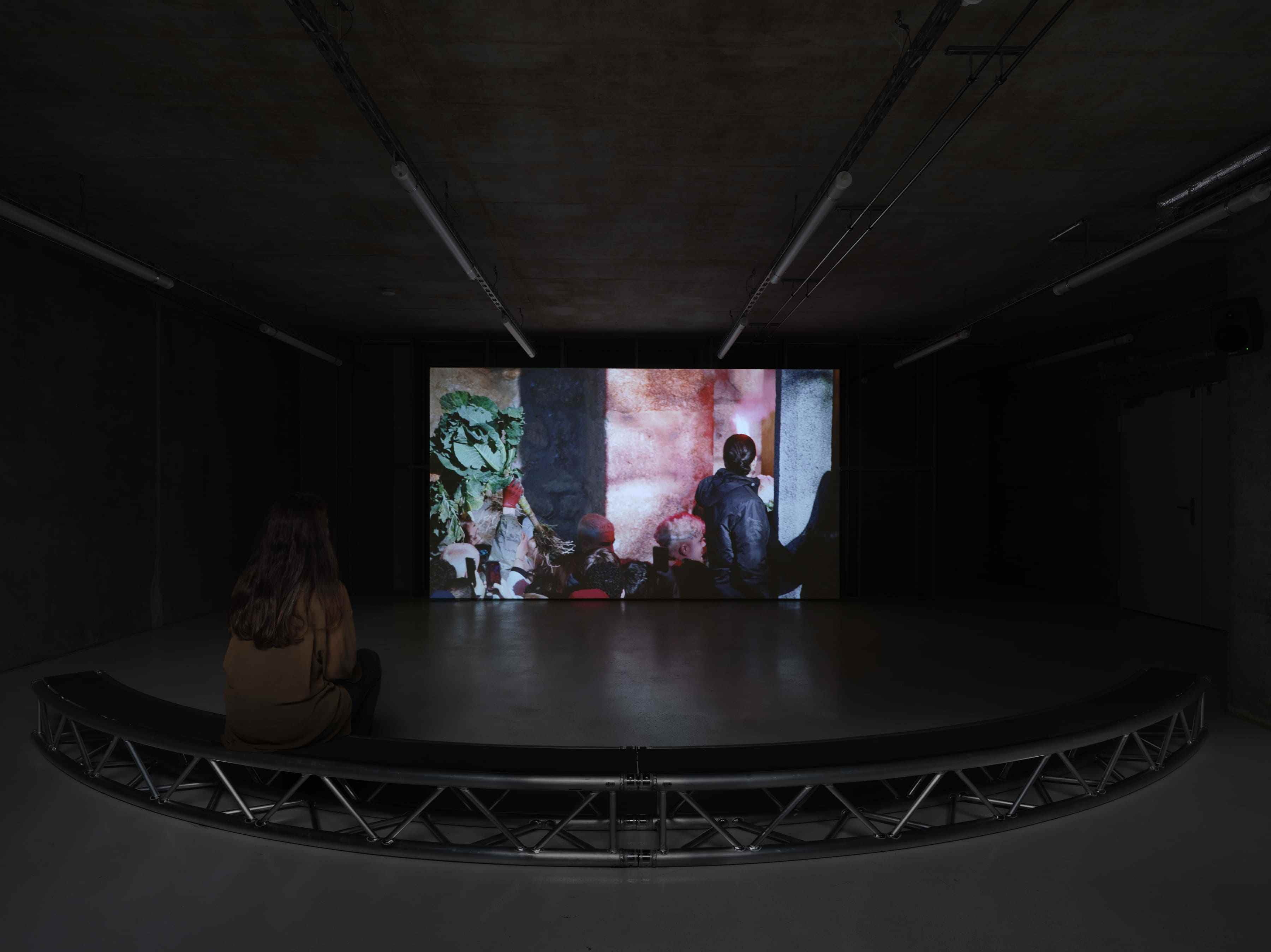 For its premiere at Galerie Molitor, Jarramplas is presented on purpose- built scaffolding and displayed with four related photographs from her series Barrage. The film begins with the violent-sounding clamor of fireworks in a night sky. Slowly, young people wearing ponchos in a rainy, southern European town prepare for some sort of event: a fight? A celebration? The camera’s gaze focuses on turnips, collected by big machinery and ultimately thrown at one another. Over the course of roughly fifteen minutes, we glimpse a picture of contemporary youth at a crossroads. By intentionally withholding key contextualizing information, Afsah asks us to question what is really going on here. Installed throughout the gallery space, a series of photographs allows viewers to examine the visual tension of Afsah’s project: a man in military fatigue cowers, about to be hit by organic matter; a number of turnips are hoisted up like trophies or heads; a young person’s hands take on an almost hawklike position; a man in a balaclava stares back at the camera. Afsah’s films and photographs are about what remains unseen as much as what is revealed. Crucially, in