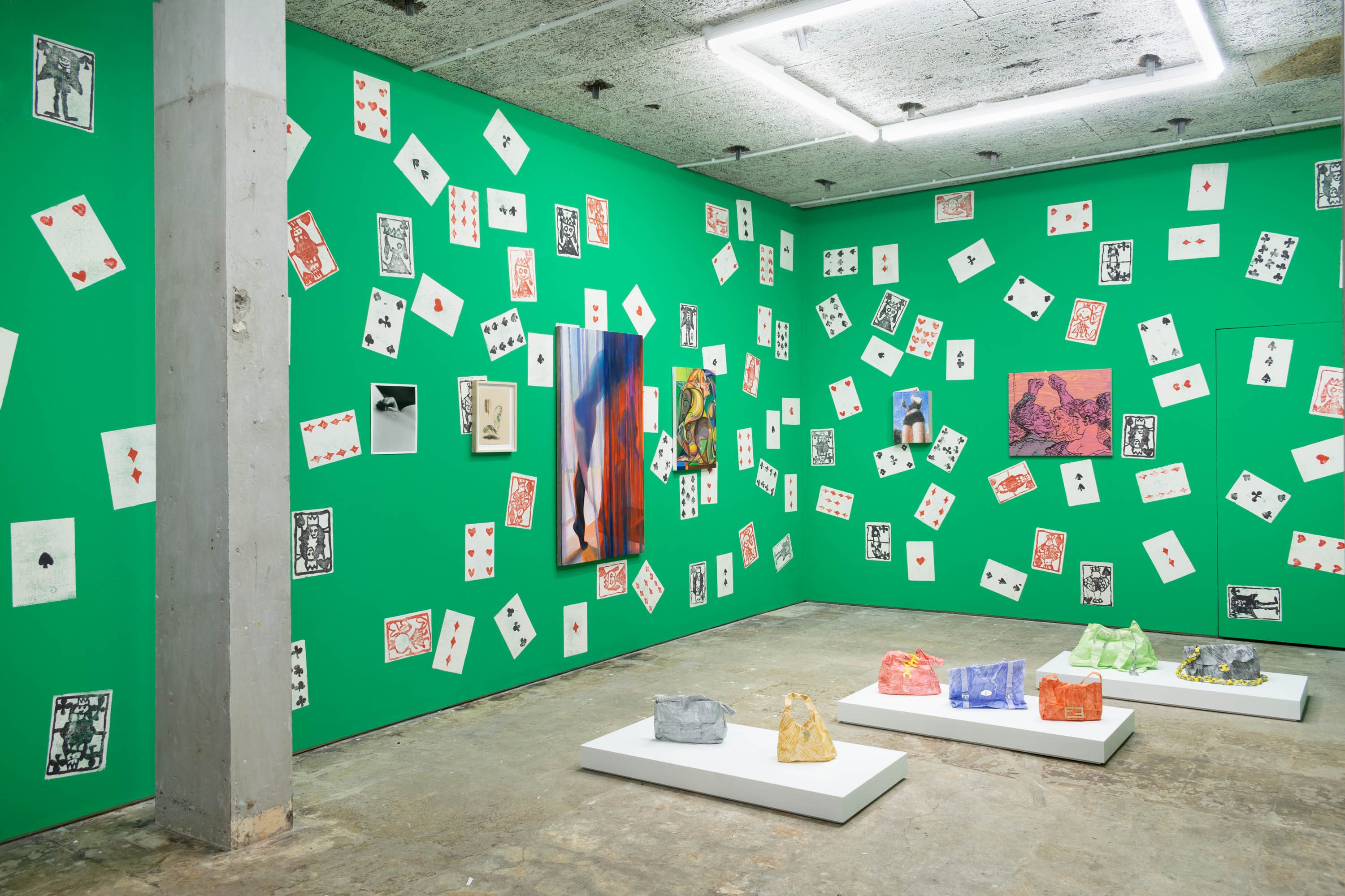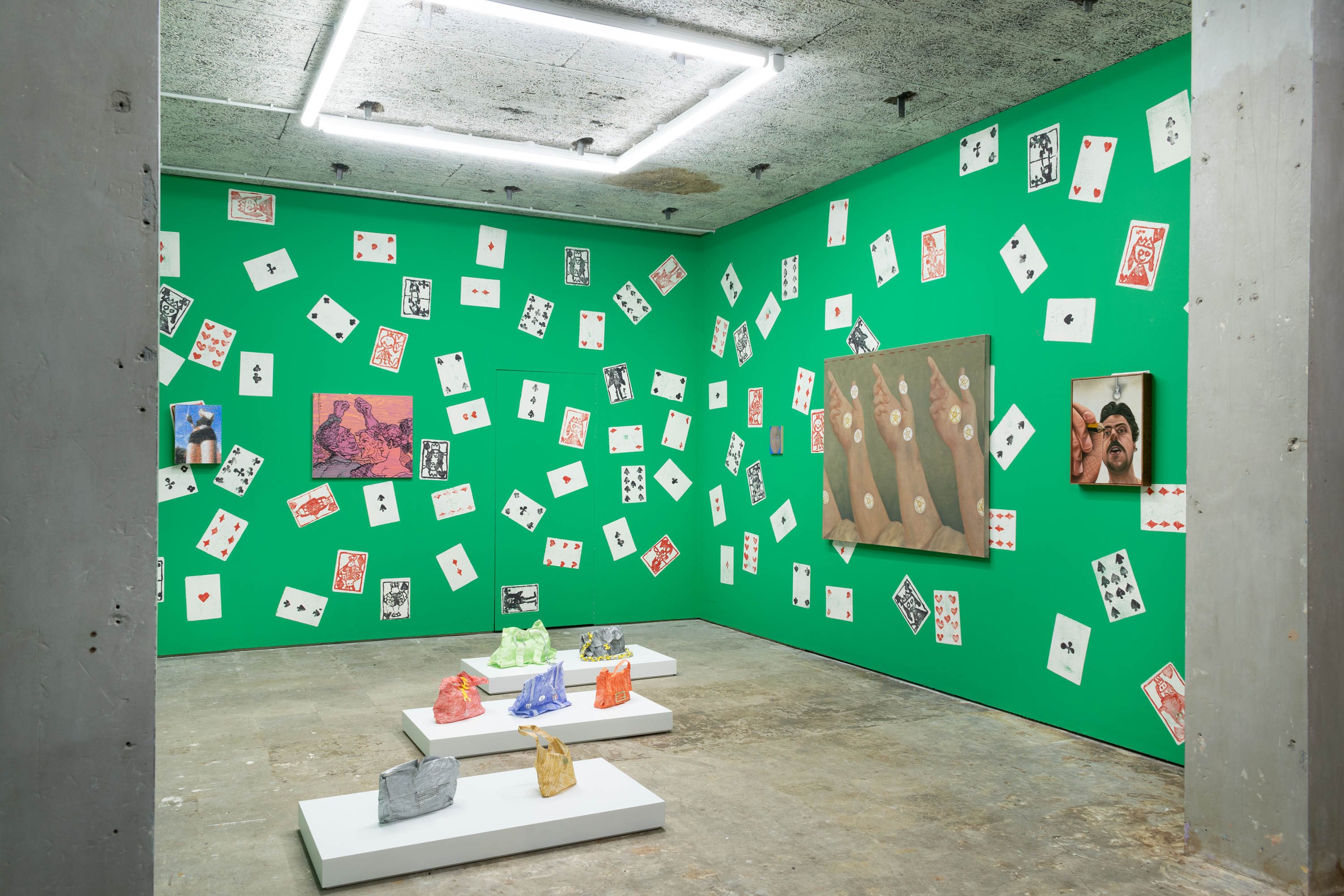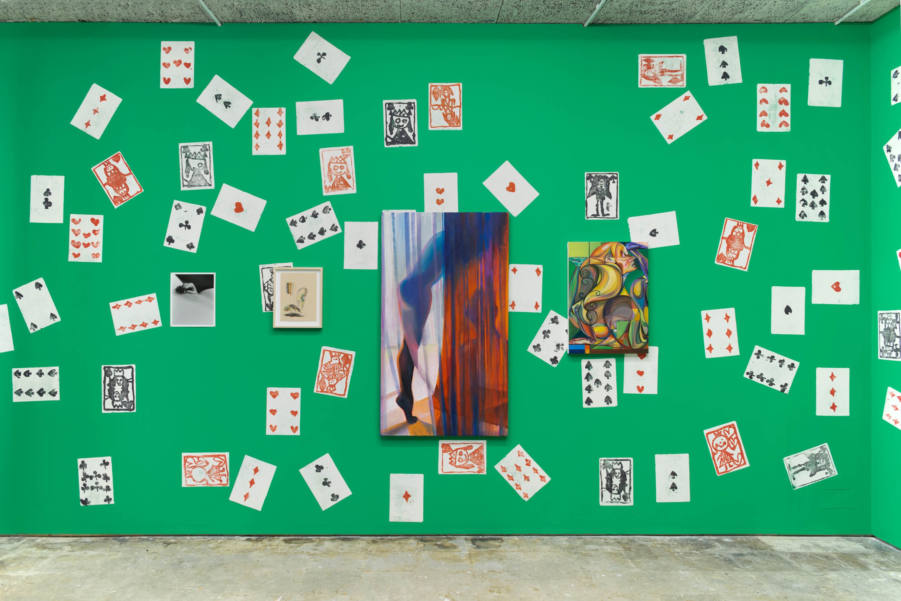 Spanning the walls of the gallery is a commissioned mural designed by Charlie Billingham, and completed by the young participants of our SlugClub Programme. The wall drawing features a full deck of 52 hand-printed playing cards, their scattered arrangement against a vibrant card table green backdrop creating an atmosphere of playful disorder. Each card, designed by the children, carries a unique narrative and serves to illuminate how we all choose to conceal or reveal facets of our identity, as well as the transient nature of a central protagonist.