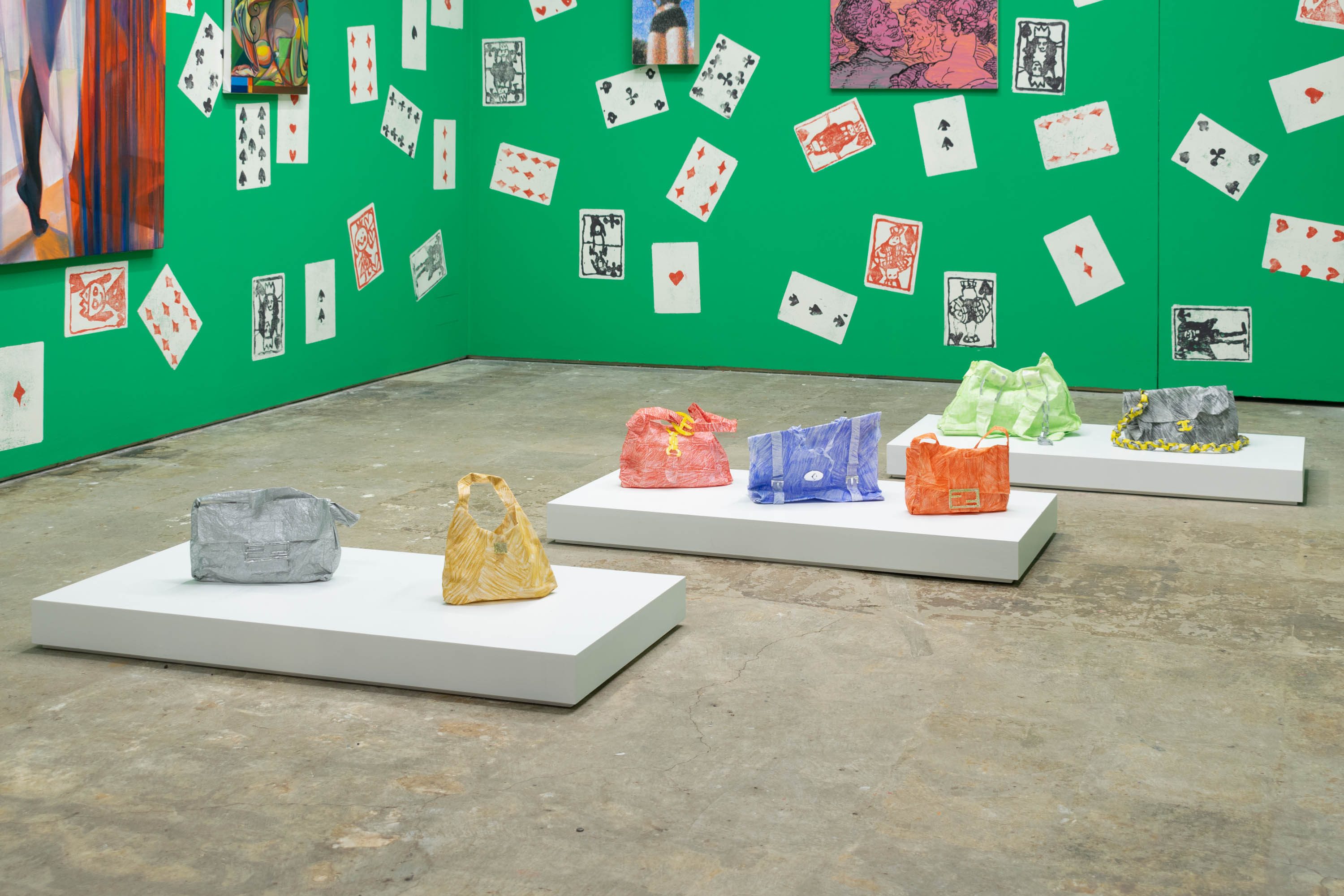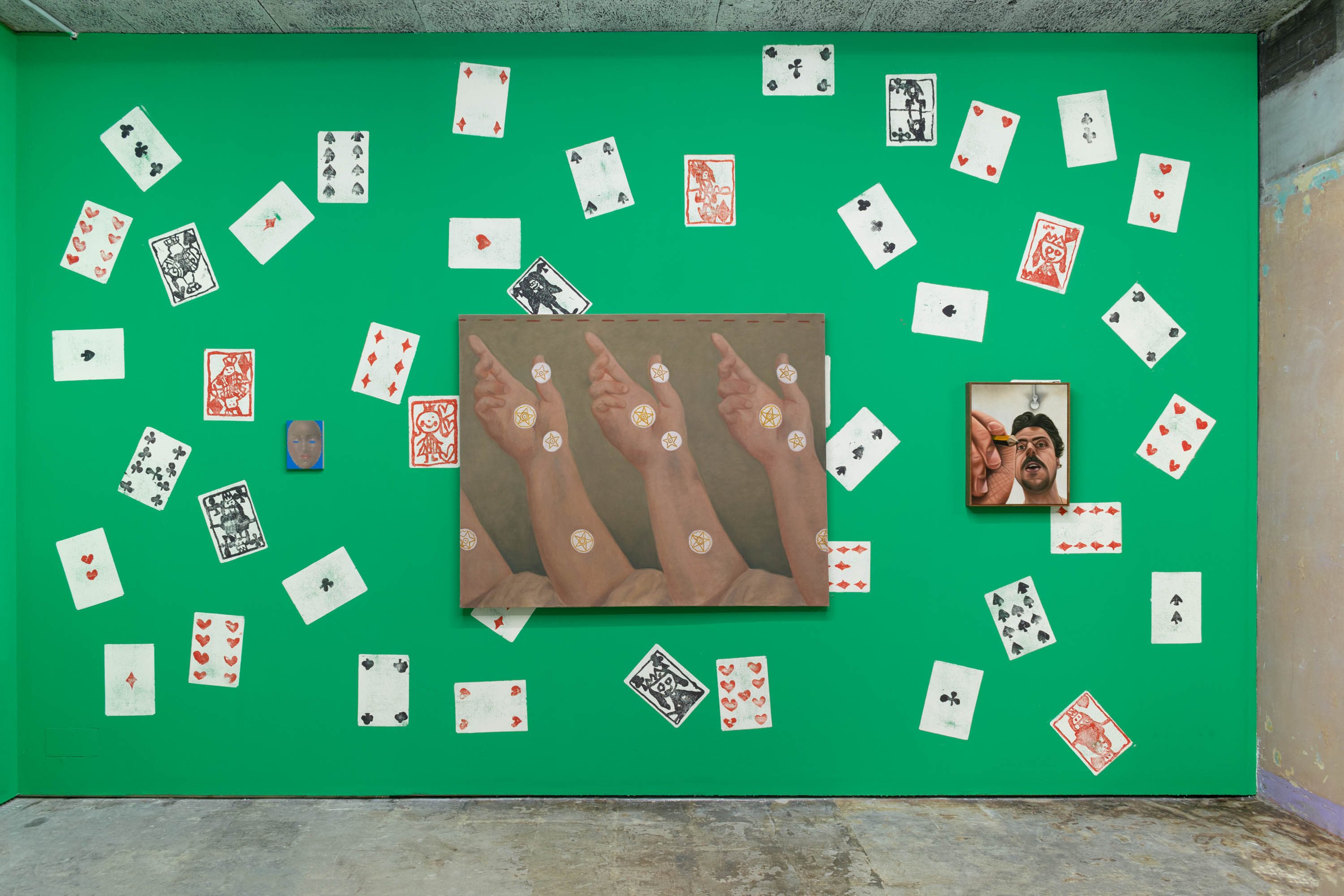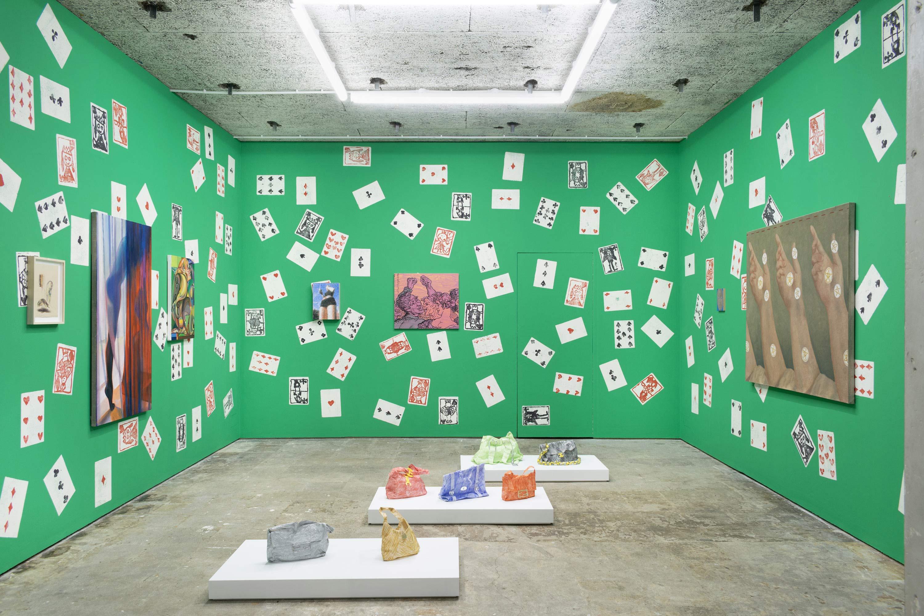 Spanning the walls of the gallery is a commissioned mural designed by Charlie Billingham, and completed by the young participants of our SlugClub Programme. The wall drawing features a full deck of 52 hand-printed playing cards, their scattered arrangement against a vibrant card table green backdrop creating an atmosphere of playful disorder. Each card, designed by the children, carries a unique narrative and serves to illuminate how we all choose to conceal or reveal facets of our identity, as well as the transient nature of a central protagonist.