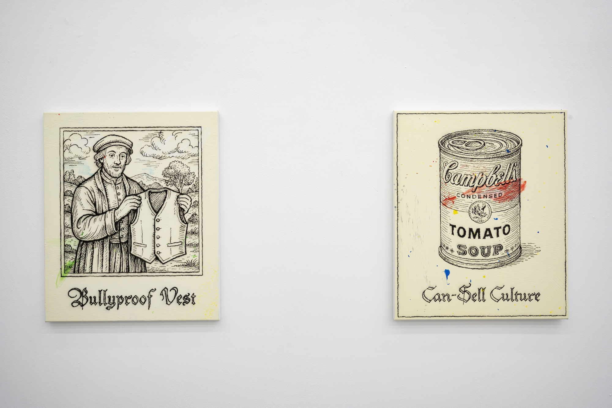 In his latest series, Arno Beck presents, for the first time, a series of acrylic paintings on canvas stylistically inspired by the tradition of woodcuts. However, instead of historical content or religious allegories, we encounter seemingly familiar imagery that, upon closer inspection, is humorously reconstructed and contextually reconfigured. Beck transfers the classic woodcut aesthetic into the here and now by applying it to large-format canvases using the airbrush technique. He sprays the motifs directly into the still-damp primer on a white-yellowish support, creating an effect reminiscent of yellowed, old paper. At the same time, the slightly blurred lines create an image effect reminiscent of greatly enlarged JPEGs—a deliberate reference to digital image culture and internet aesthetics.