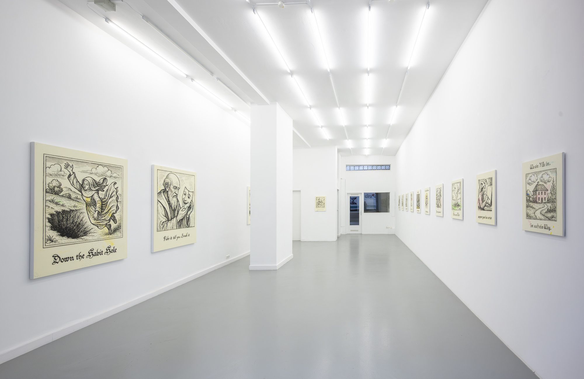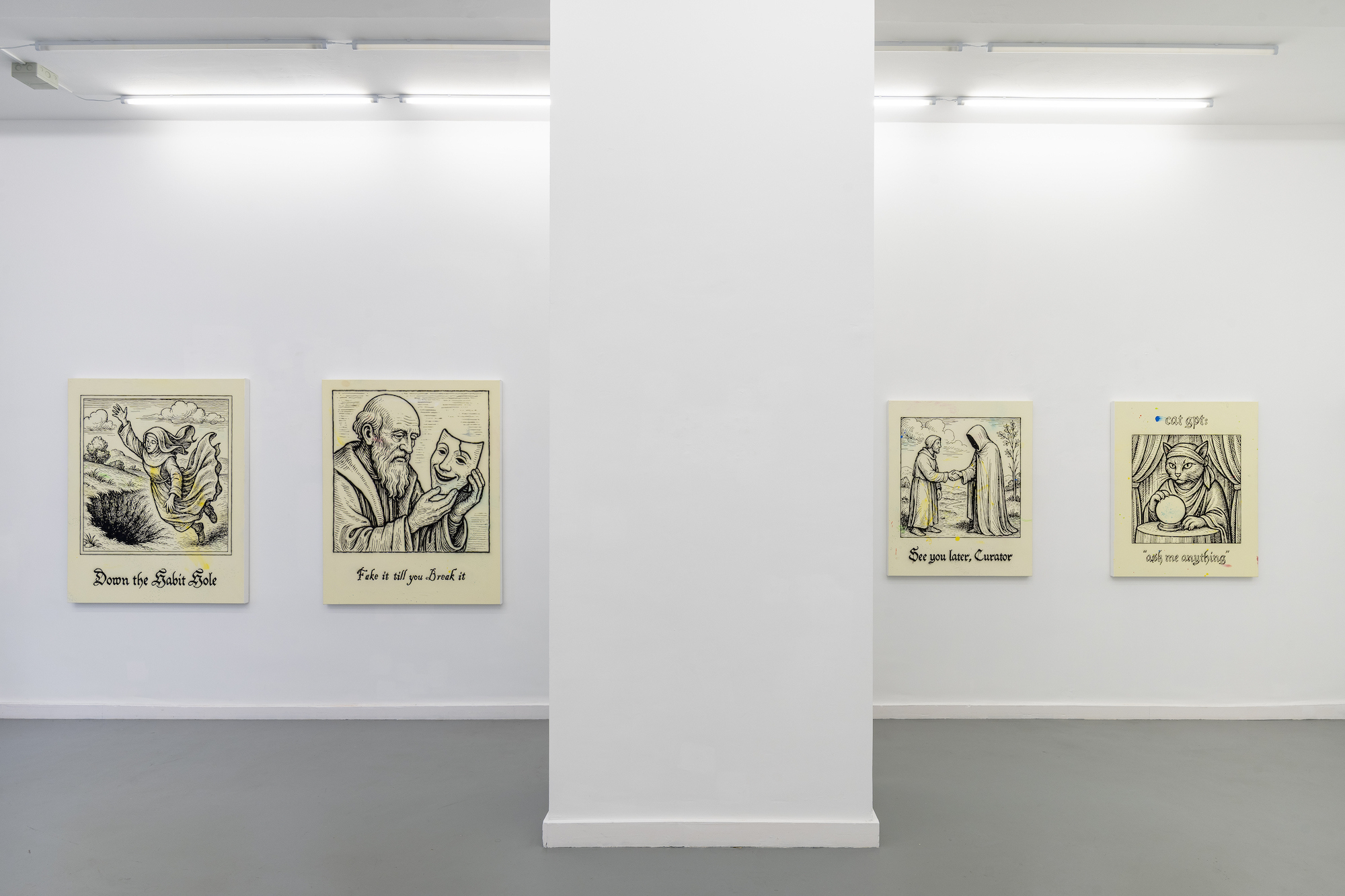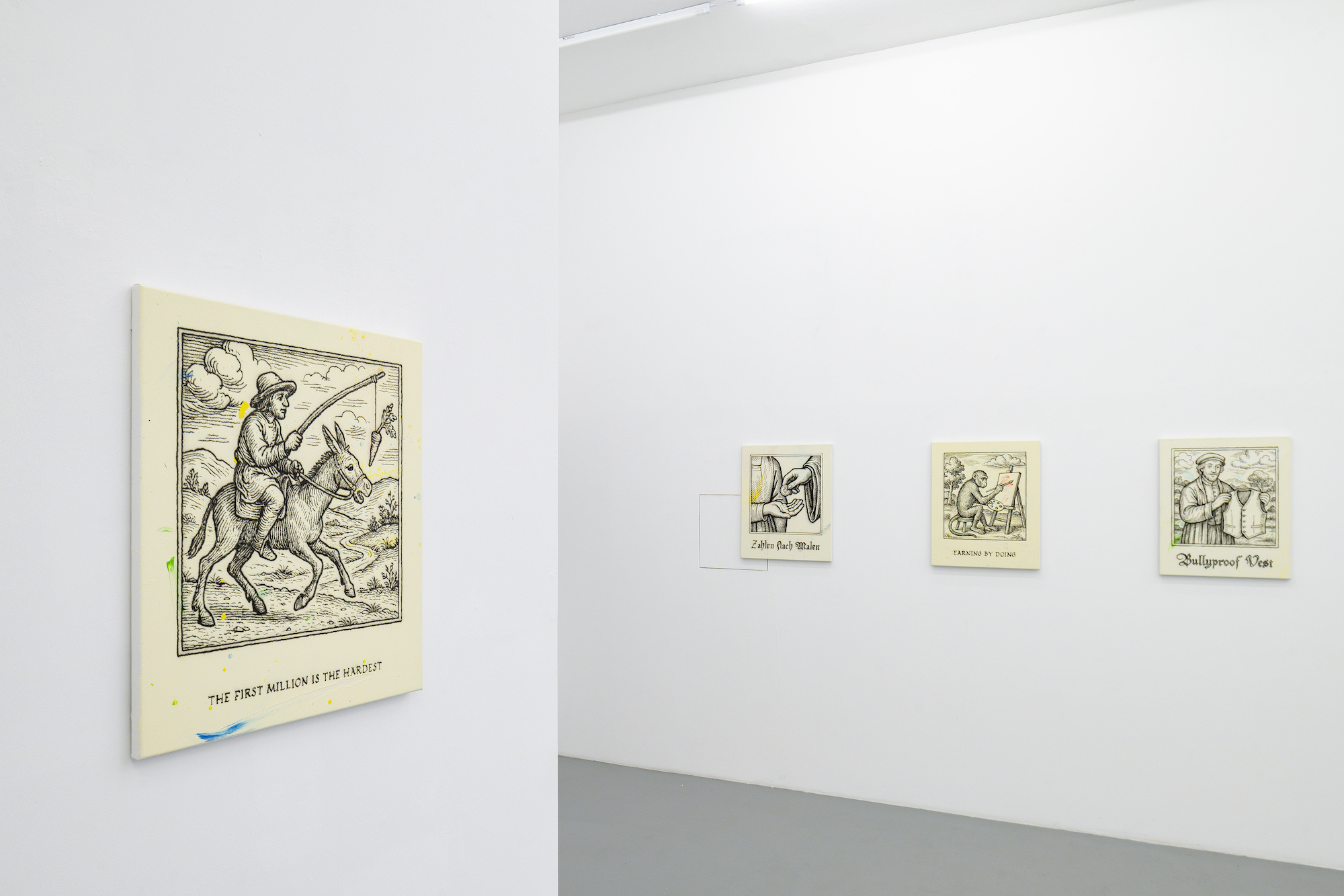 Each image is captioned, adding an additional layer to the work. These phrases, sometimes in German, sometimes in English, are reminiscent of classic proverbs, yet are always twisted in an amusing and absurd way. Here, we encounter not a raised index finger, but a subtle wink. The texts bear a clear meme aesthetic and appropriate the logic of internet-based forms of communication – short, pointed, ironic.
