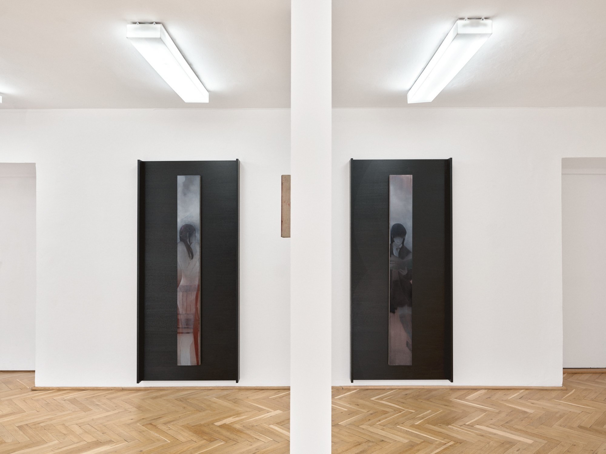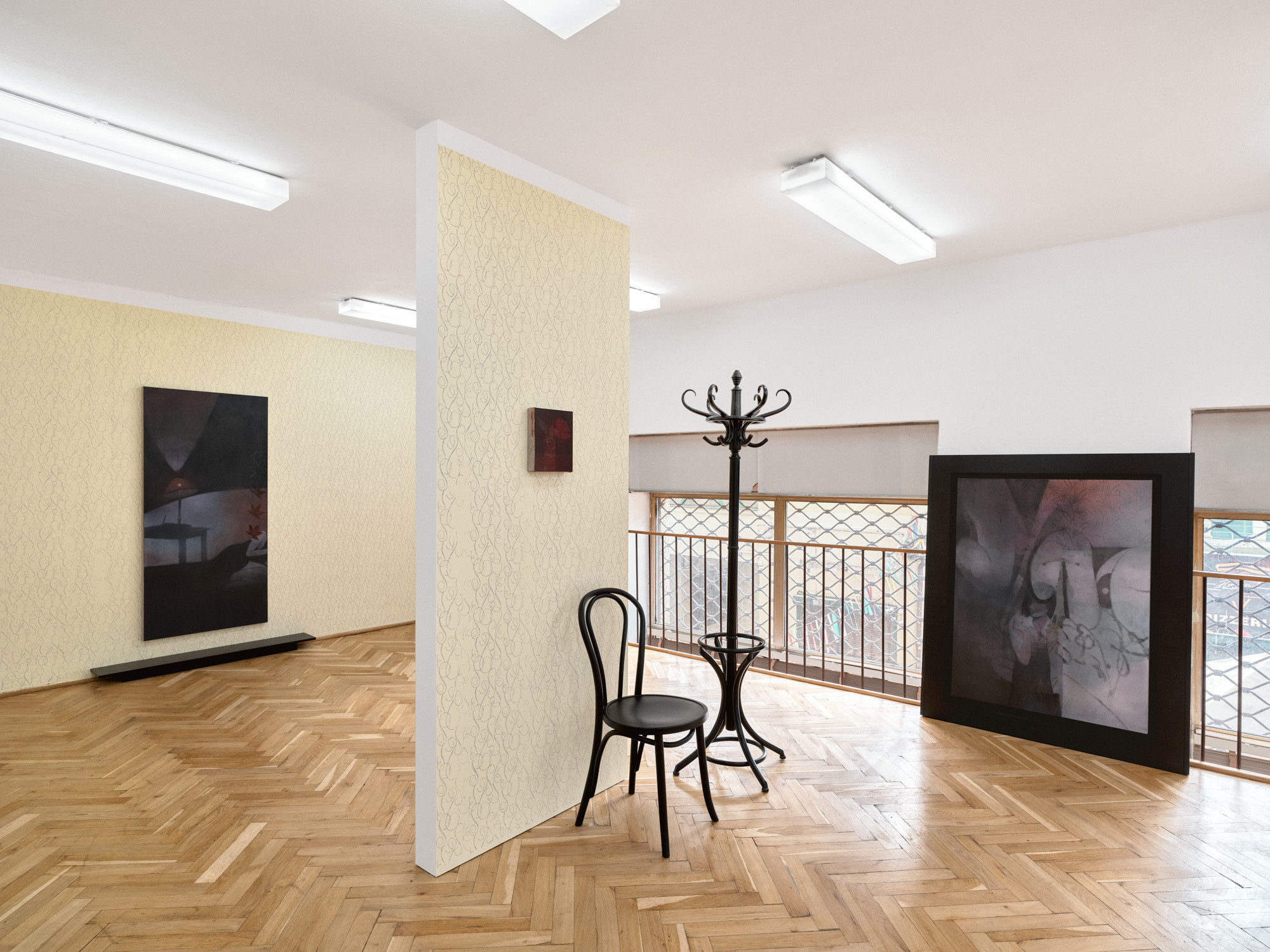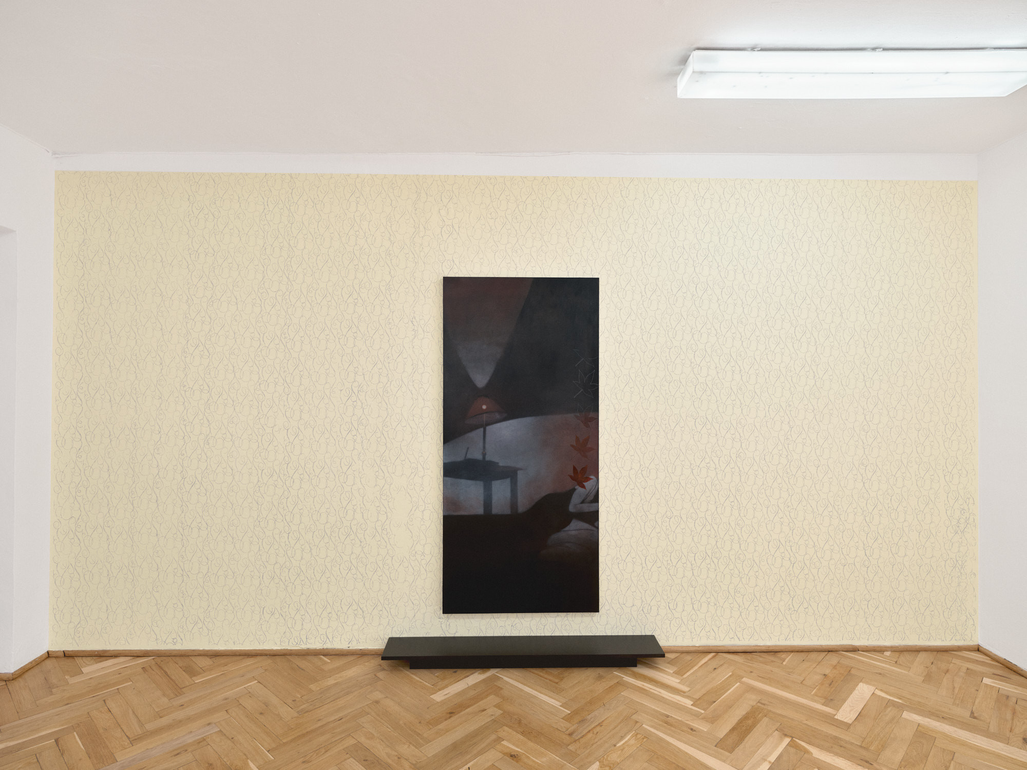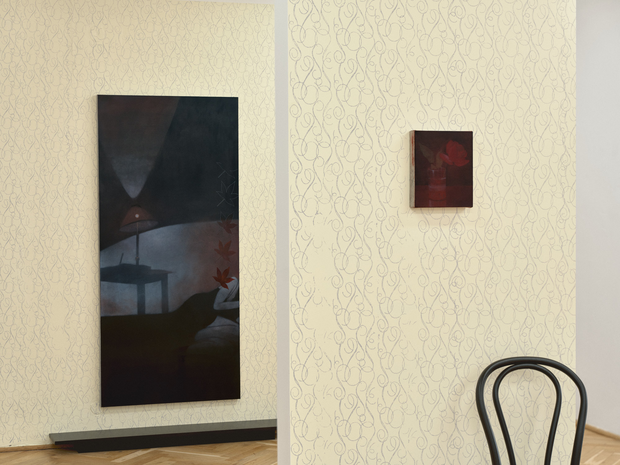 Camille is a second solo exhibition of Ant Łakomsk's at the Turnus Gallery. The collection of works presented in the exhibition is a development of the theme of self-representation present in her painting. The artist reflects upon the issue of exposure – both the image as seen by others and exhibition strategies. The arrangement of Camille, developed in collaboration with Zuzanna Kozłowska, simultaneously references the work of William Morris (1834–1896), Carlo Scarpa (1906–1978) and Marc Camille Chaimowicz (1947–2024). Łakomsk and Kozłowska exploit the interval stretched between the tradition of craftsmanship and post-digital reality.