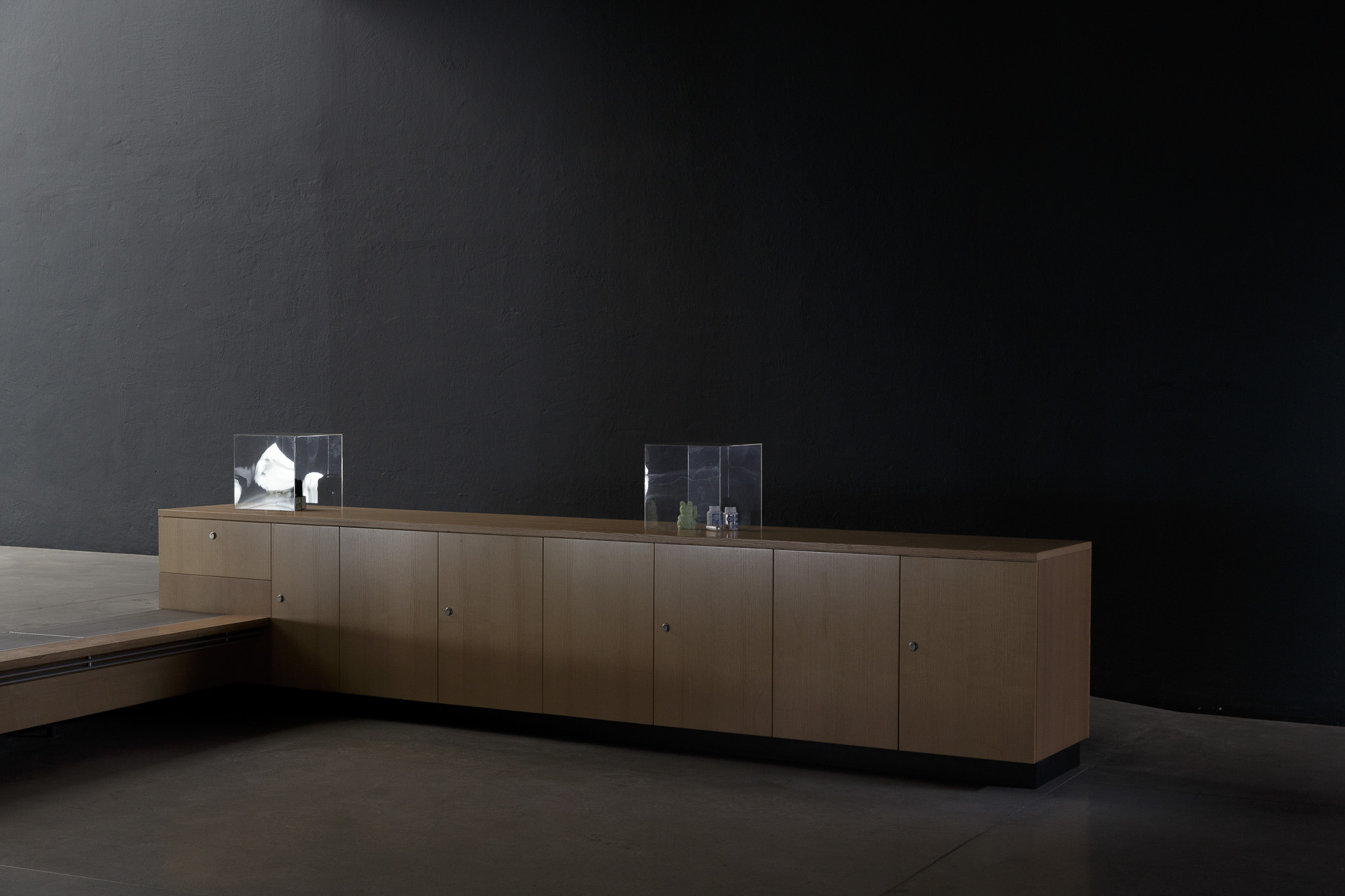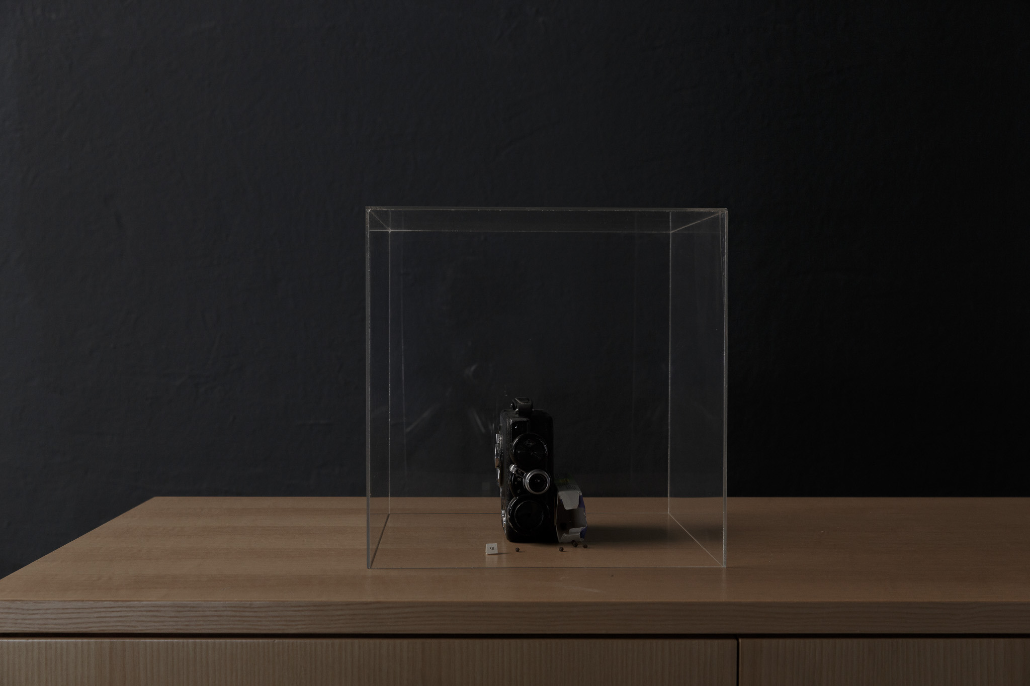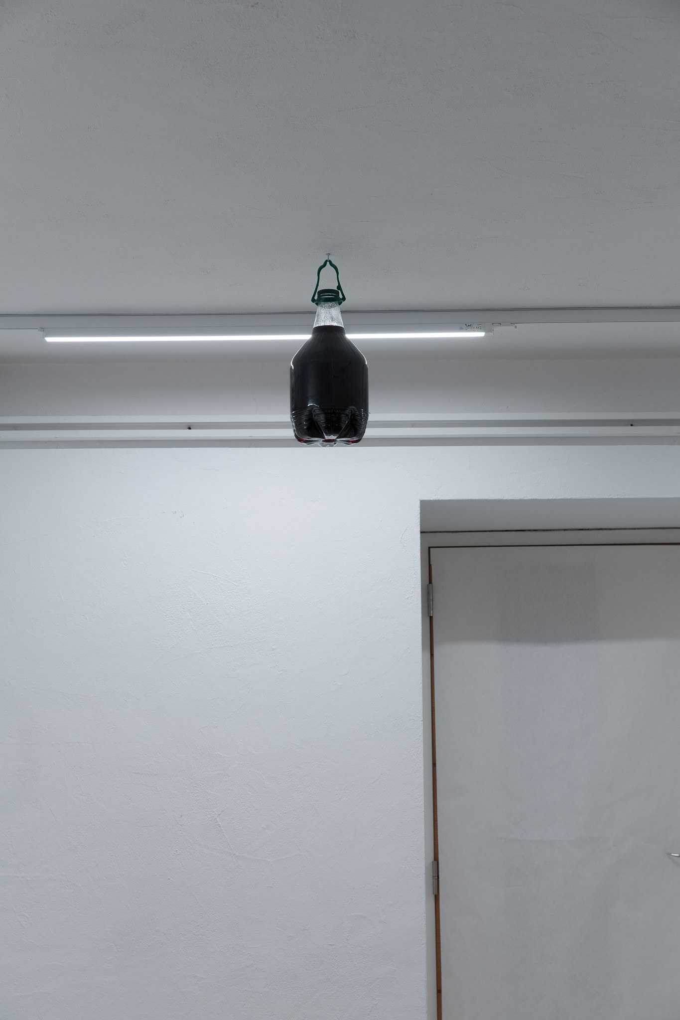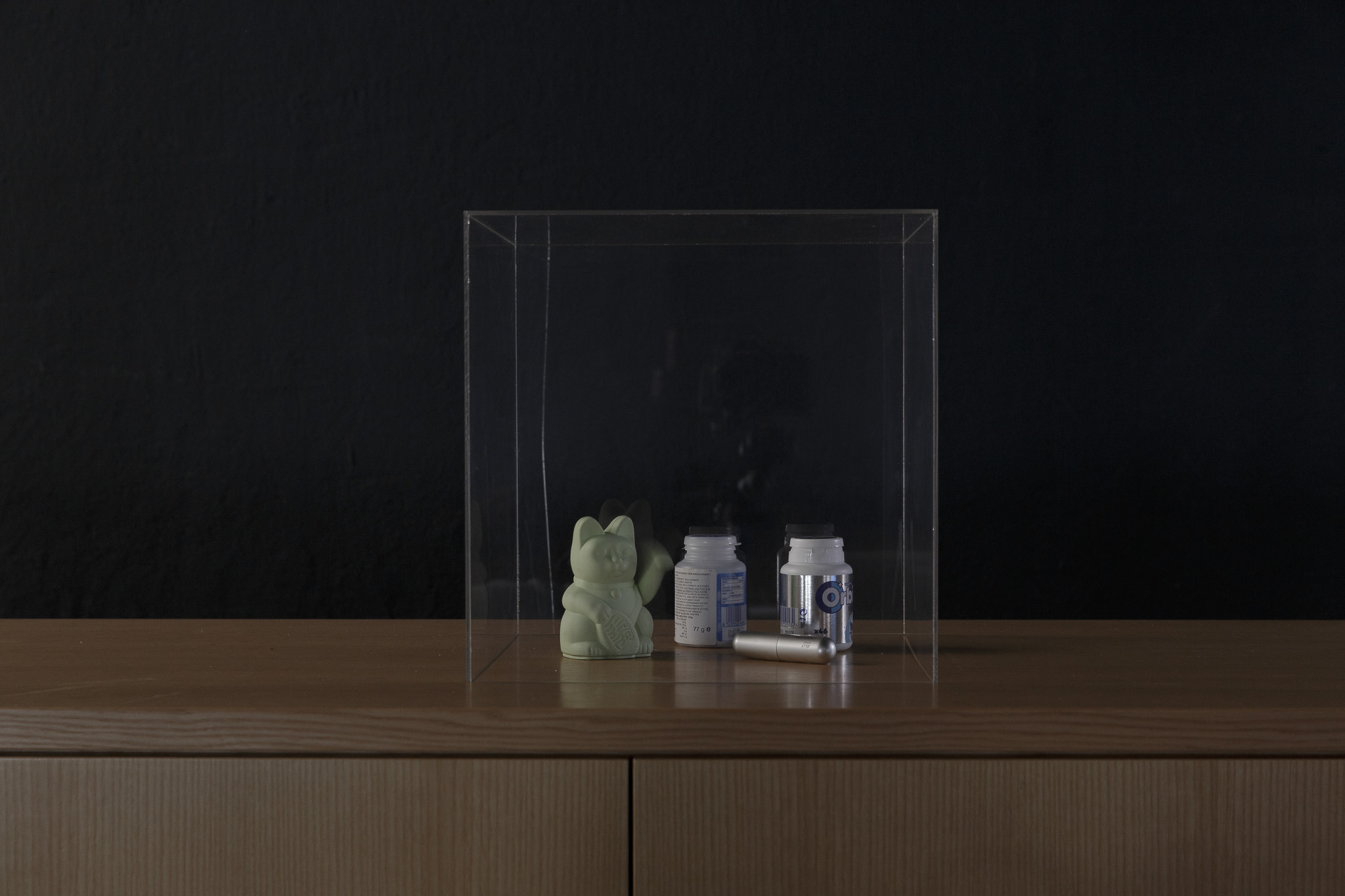 The atmosphere is both restrained and dense. Low lighting, dark walls, and architectural interruptions, doors, columns, stairways, become theatrical cues, breaks in rhythm, passages. The space isn’t filled; it’s weighed, measured. Some works are encased in transparent vitrines, like relics from a forgotten but oddly intimate era: an analog camcorder, vitamin bottles, a waving cat figurine, batteries, electronic detritus. Items without aura, and for that very reason, haunting. Other pieces lie directly on the floor: rods, cords, inert structures that feel as if a single gesture could activate them. Movement through the show isn’t linear; the viewer is asked to consider not just what they see, but how they move.
