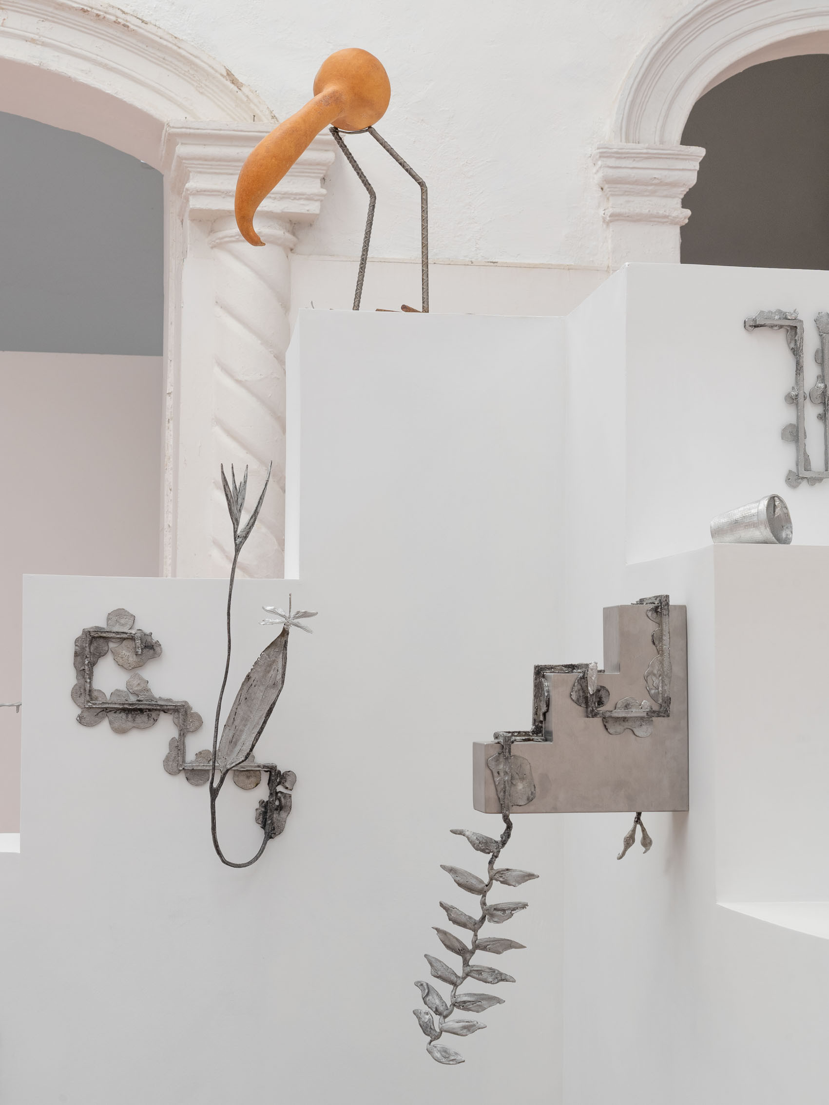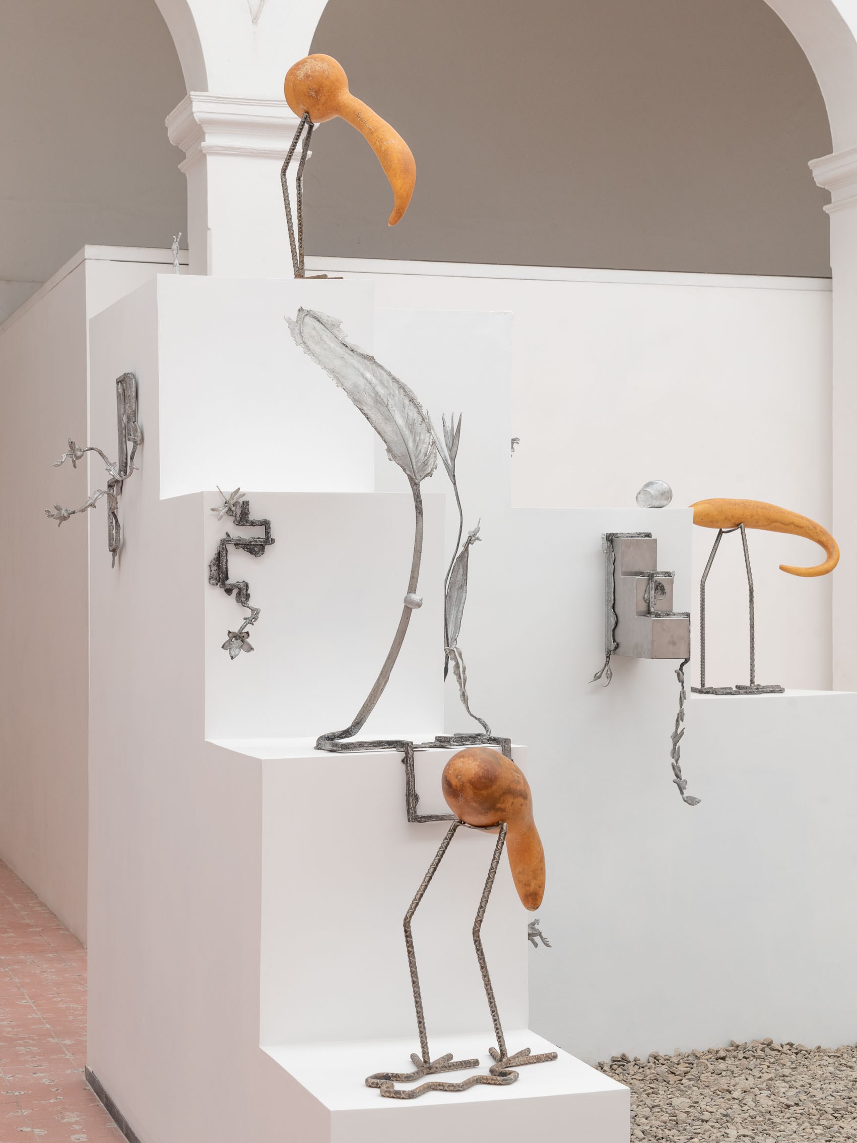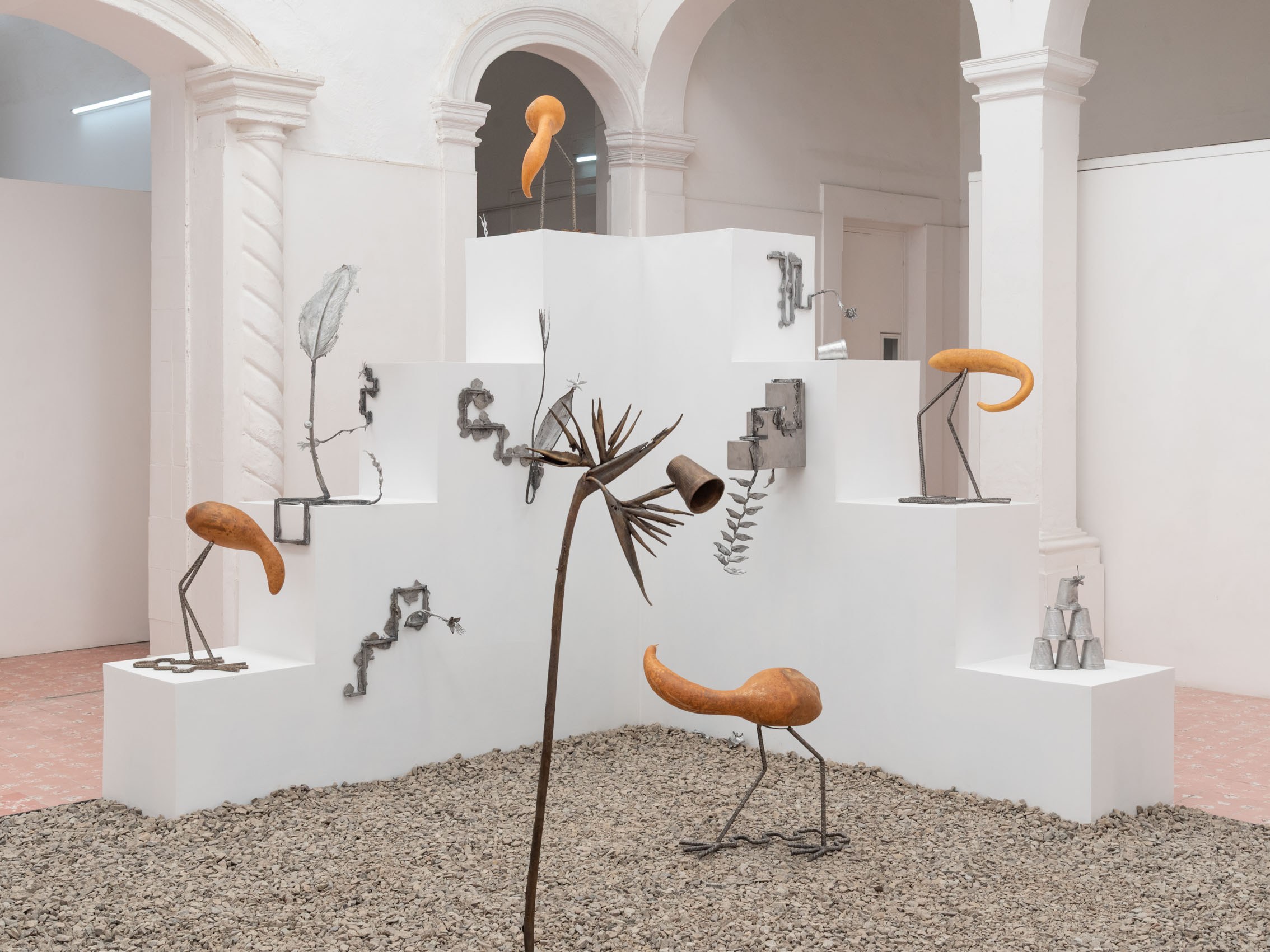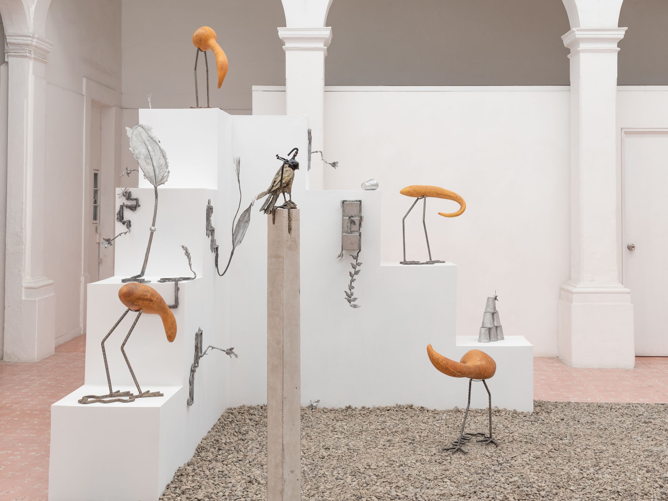 These entities—some metallic, others organic—rest upon and emerge from geometric structures inspired by the xicalcoliuhqui, an ancient stepped Mesoamerican motif that symbolizes cycles, continuity, and movement. The guajes (gourds), living beings that contain and hold embodied knowledge, become vessels that preserve memories and understandings. Their rod-like legs, tied with geometric patterns, evoke how the constructed and the organic coexist. From this base, beings arise: hybrid forms that walk the line between the inherited and the contemporary.