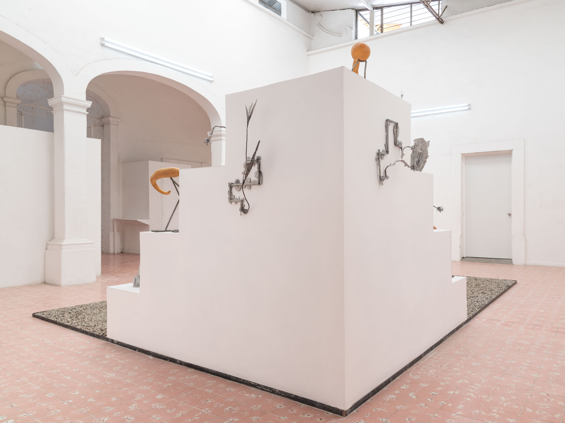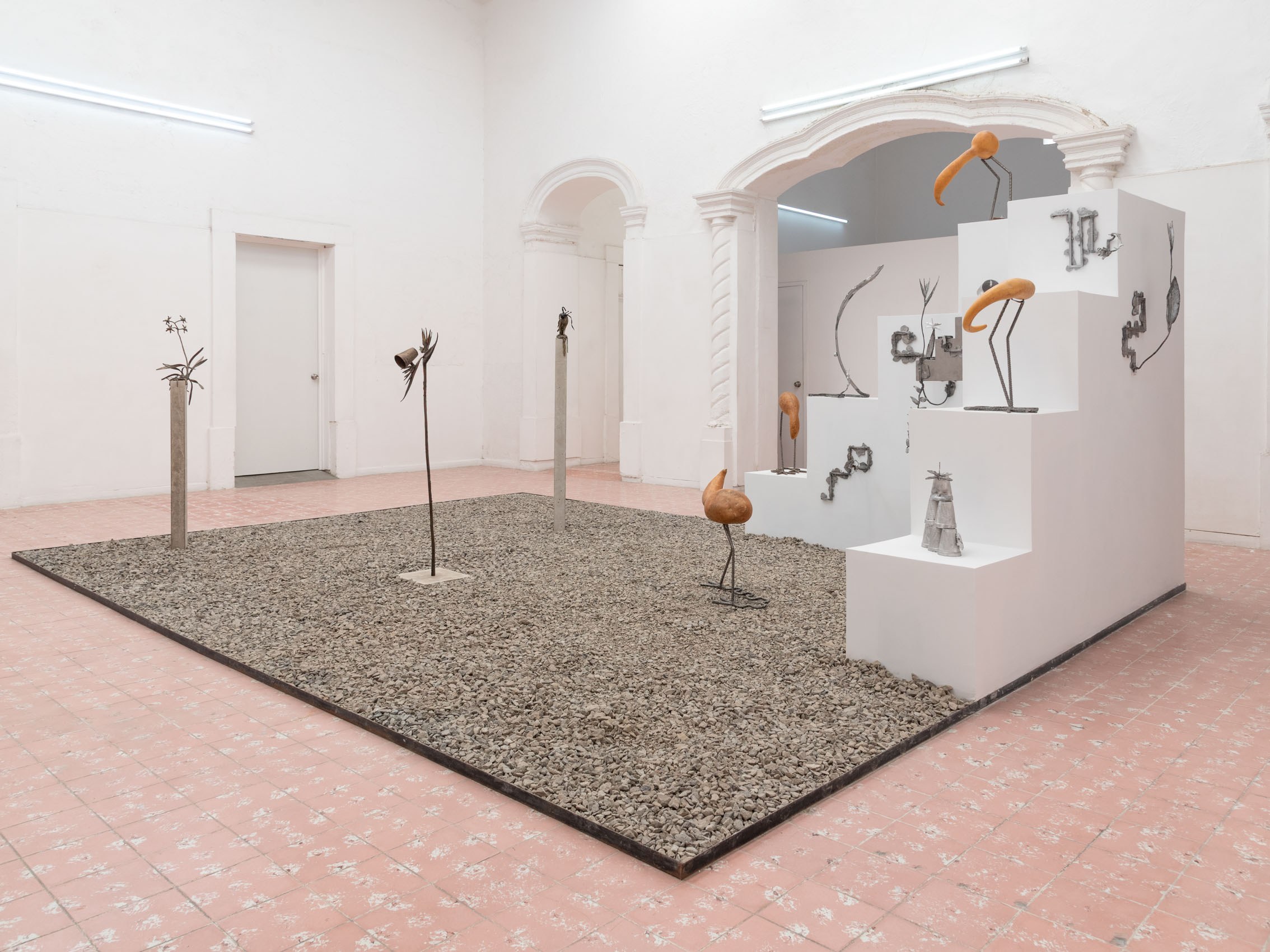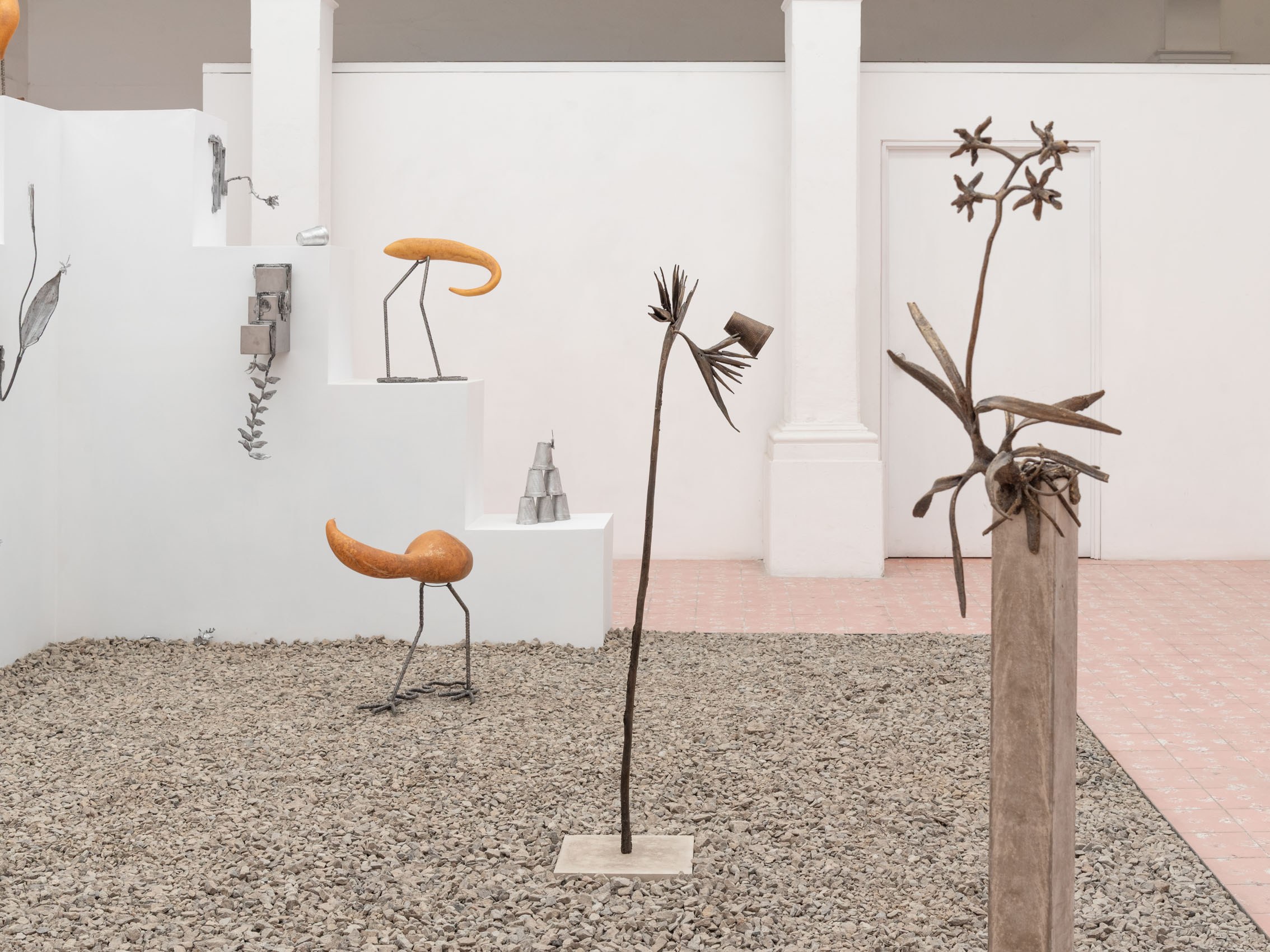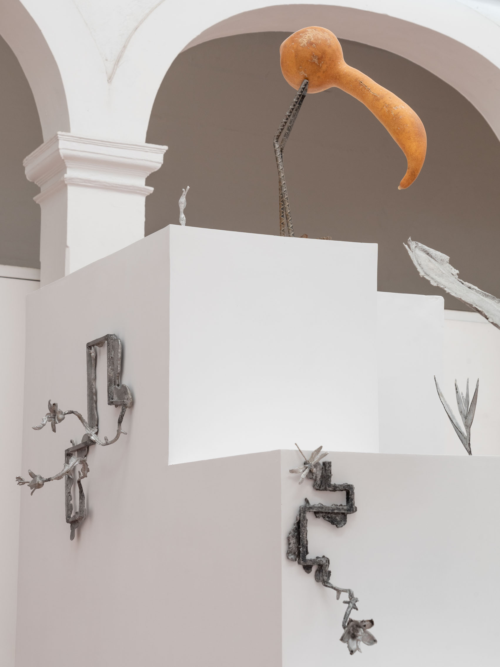 These entities—some metallic, others organic—rest upon and emerge from geometric structures inspired by the xicalcoliuhqui, an ancient stepped Mesoamerican motif that symbolizes cycles, continuity, and movement. The guajes (gourds), living beings that contain and hold embodied knowledge, become vessels that preserve memories and understandings. Their rod-like legs, tied with geometric patterns, evoke how the constructed and the organic coexist. From this base, beings arise: hybrid forms that walk the line between the inherited and the contemporary.