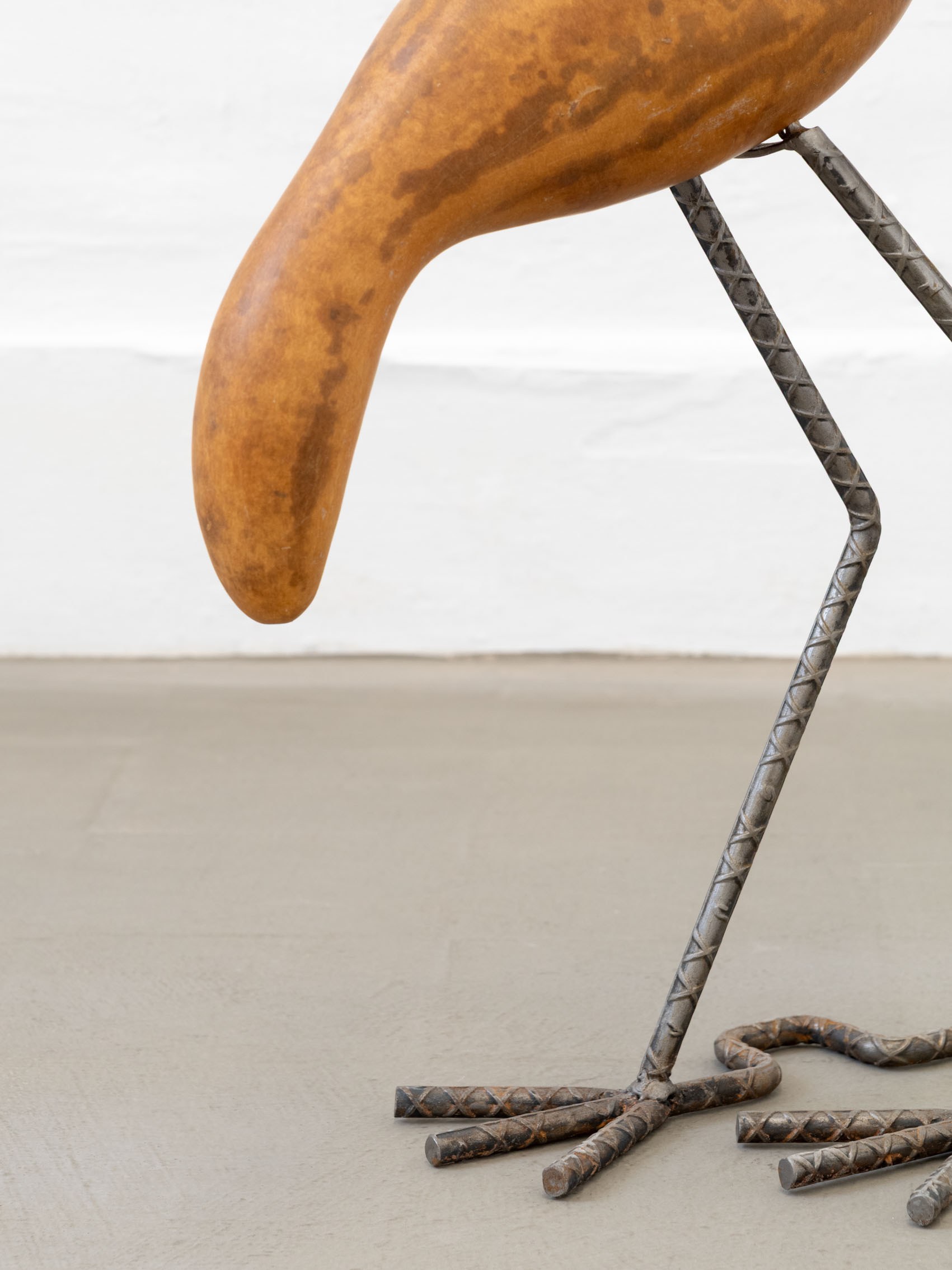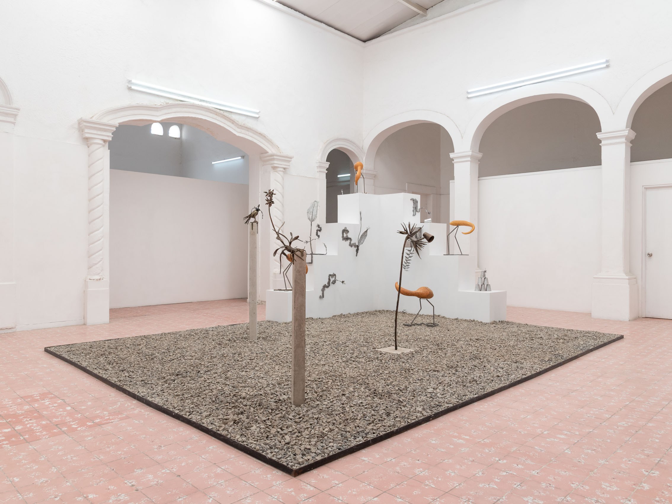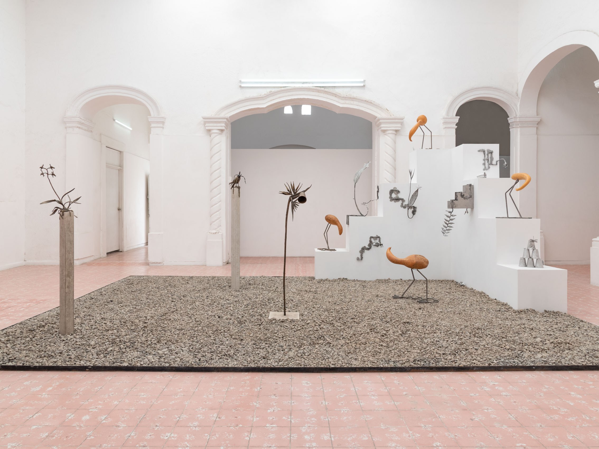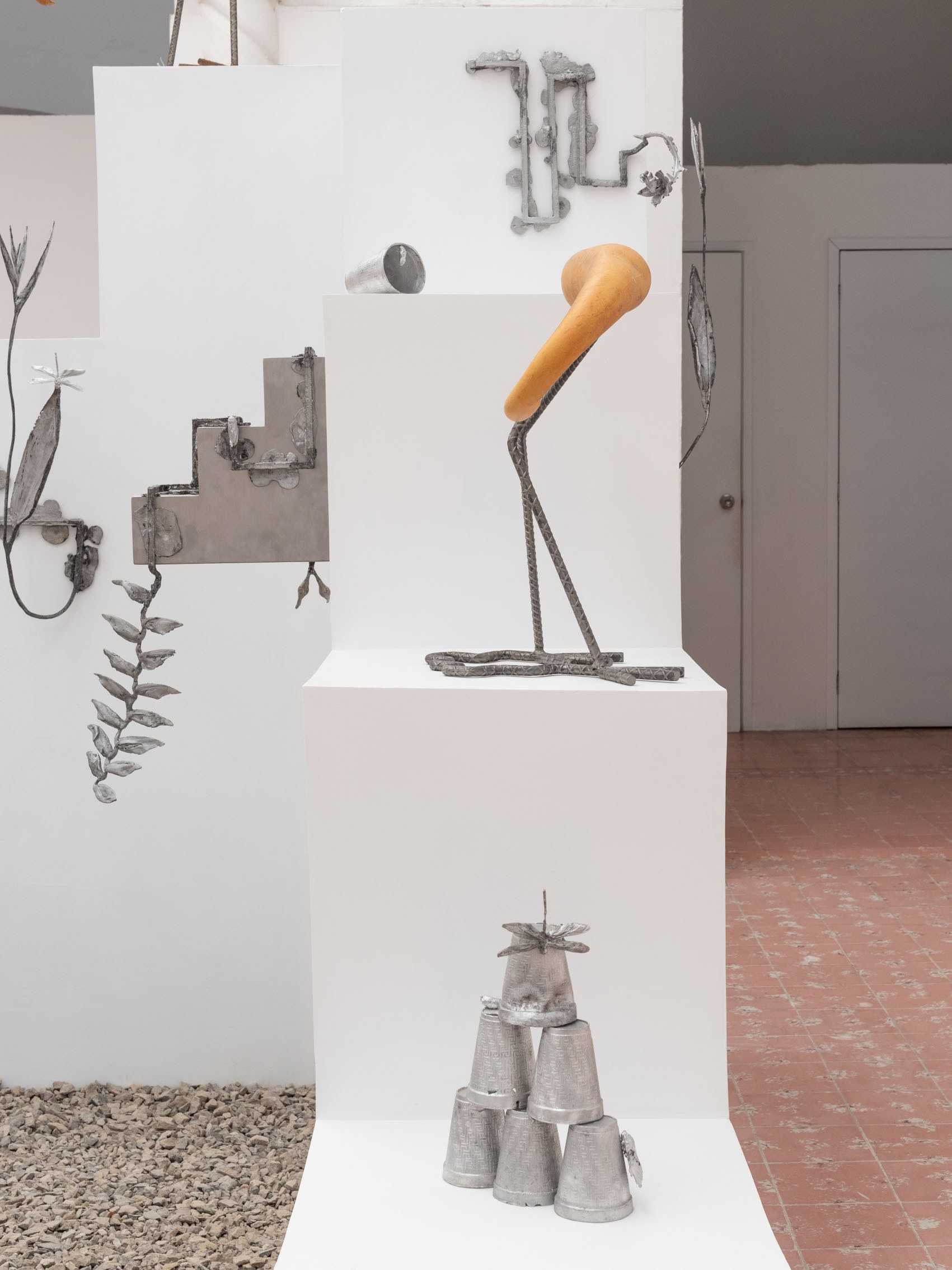 These entities—some metallic, others organic—rest upon and emerge from geometric structures inspired by the xicalcoliuhqui, an ancient stepped Mesoamerican motif that symbolizes cycles, continuity, and movement. The guajes (gourds), living beings that contain and hold embodied knowledge, become vessels that preserve memories and understandings. Their rod-like legs, tied with geometric patterns, evoke how the constructed and the organic coexist. From this base, beings arise: hybrid forms that walk the line between the inherited and the contemporary.
