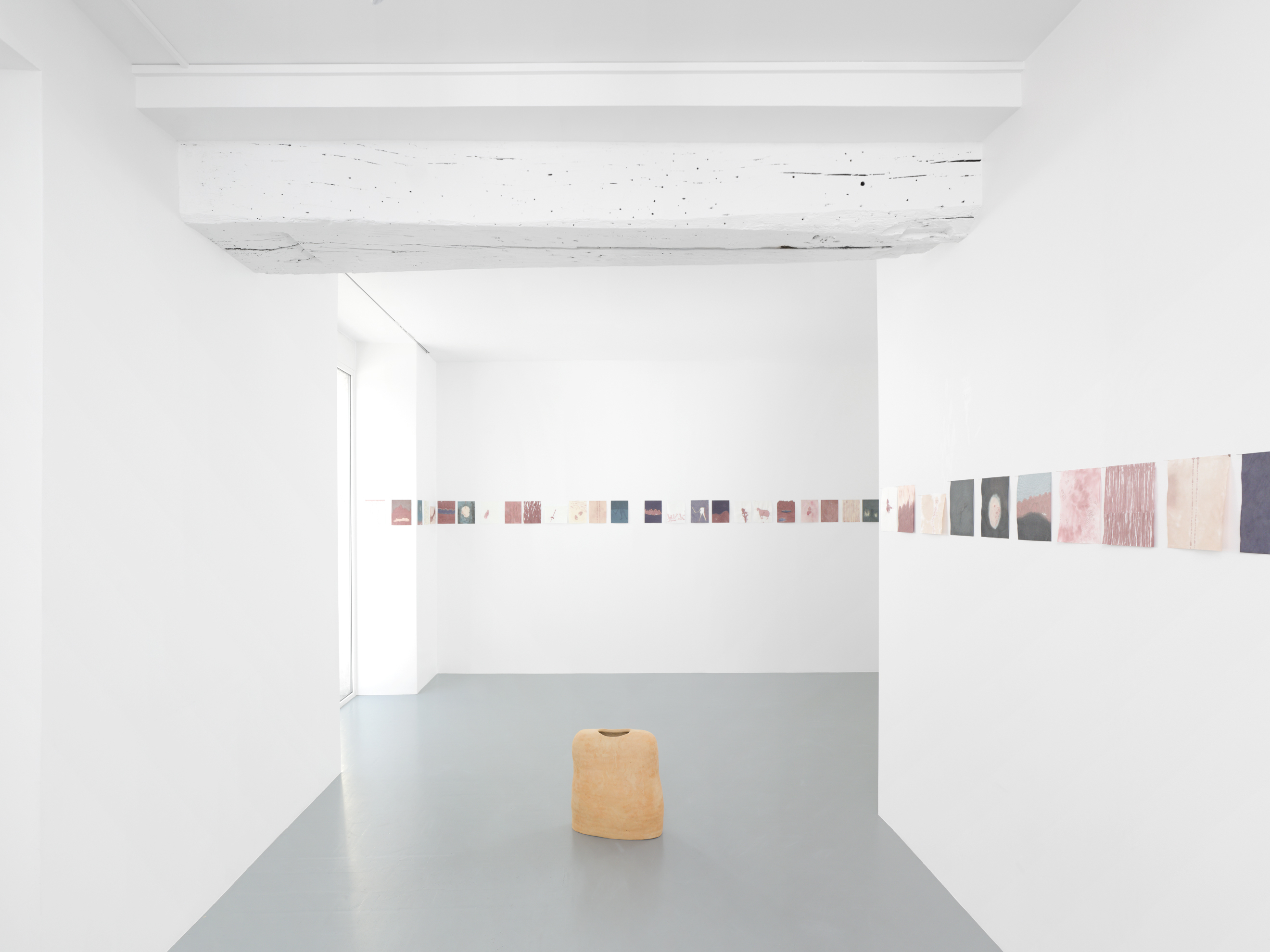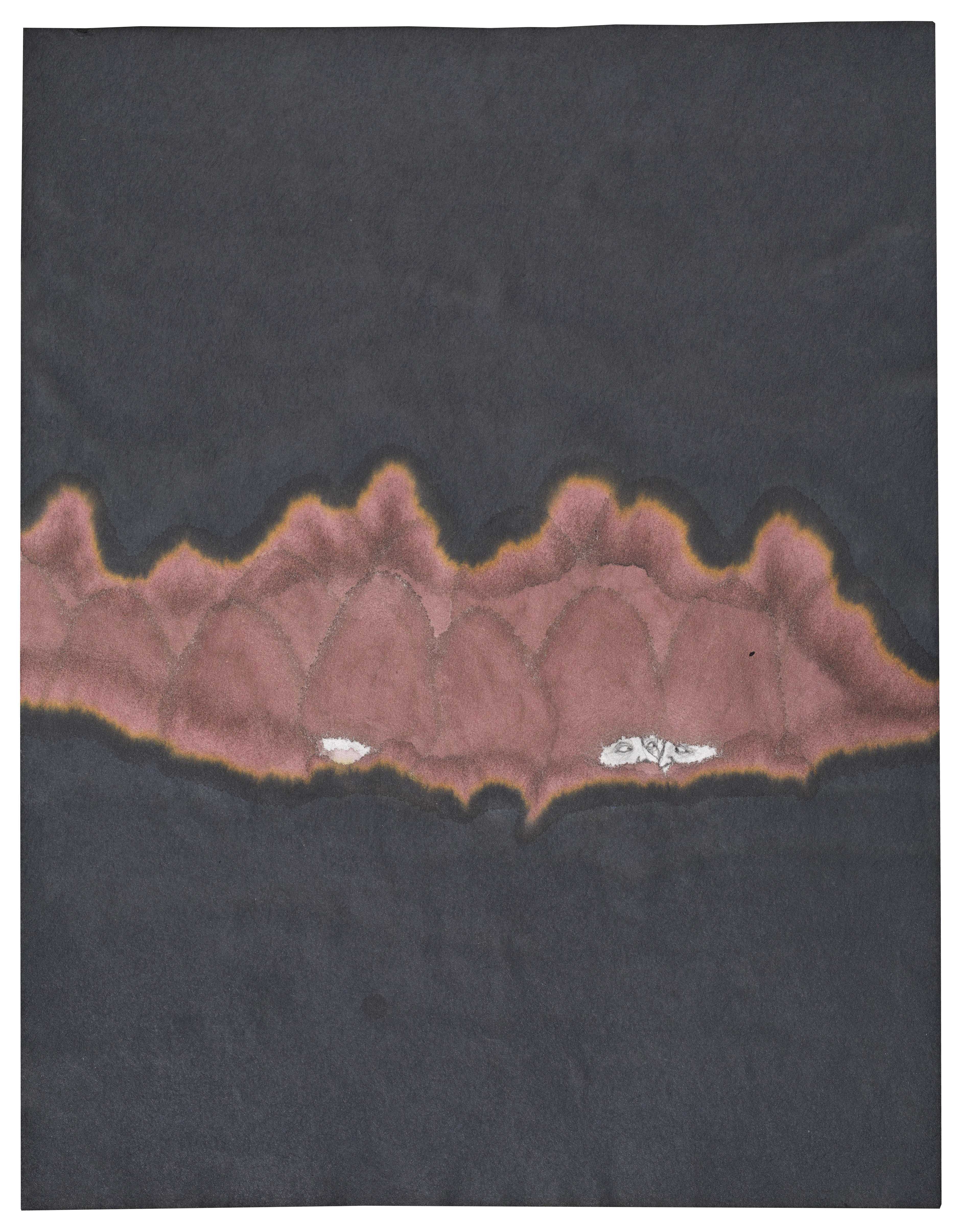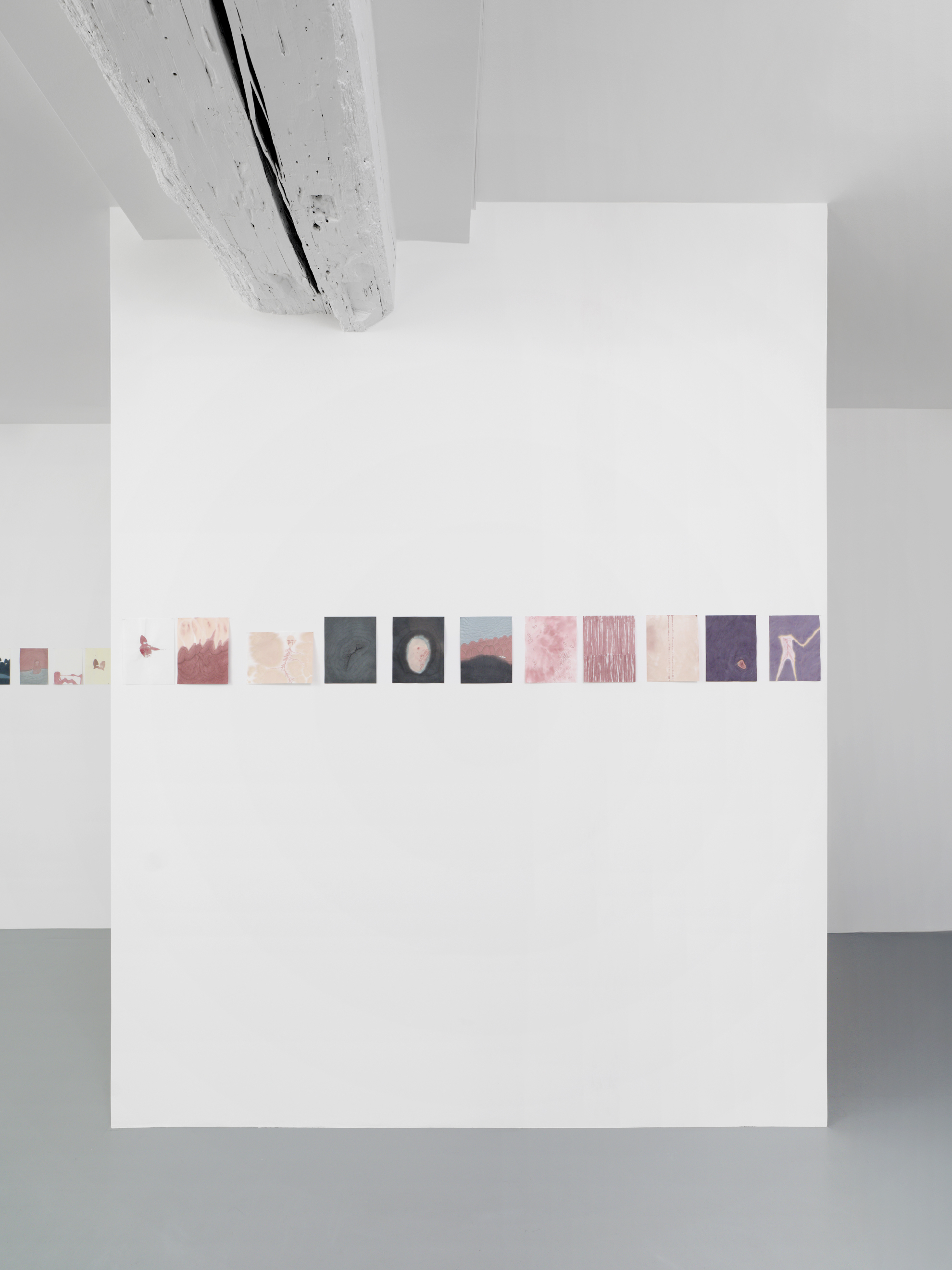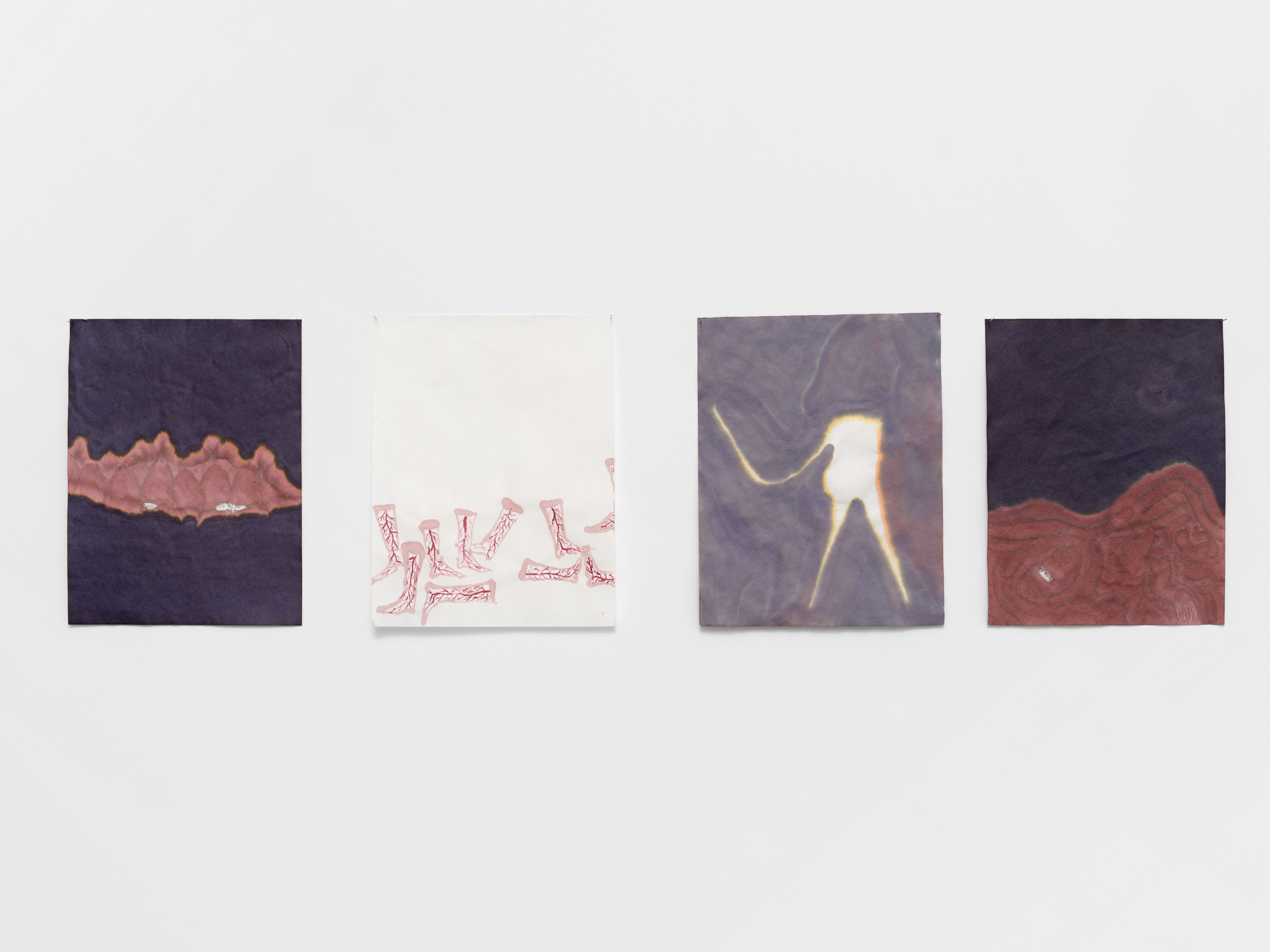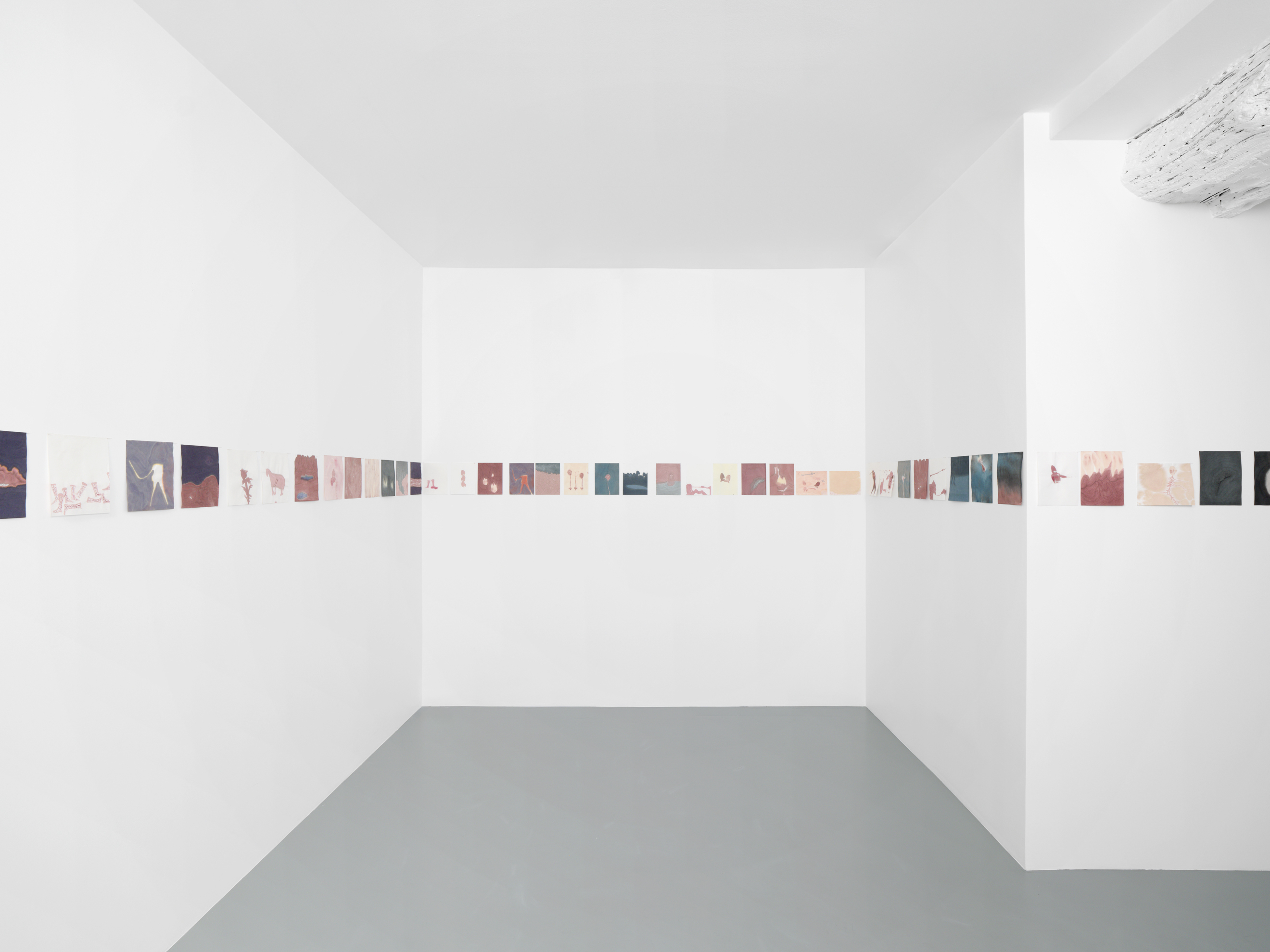 We step out onto the battlefield. Heads, eyes, swords, legs, horses, boots, creatures are swaying from one piece of Japanese paper to the next. The characters either conform to the scenography or grow through and outside of the textured paper fibres. Once again, the inked figures exhibit an indexical nature: helmeted faces, bones, feet with protruding veins, radiating or irradiating torsos, weapons, horse silhouettes, underground shelters, and so on. All these vignettes assemble together to form the battle scene.