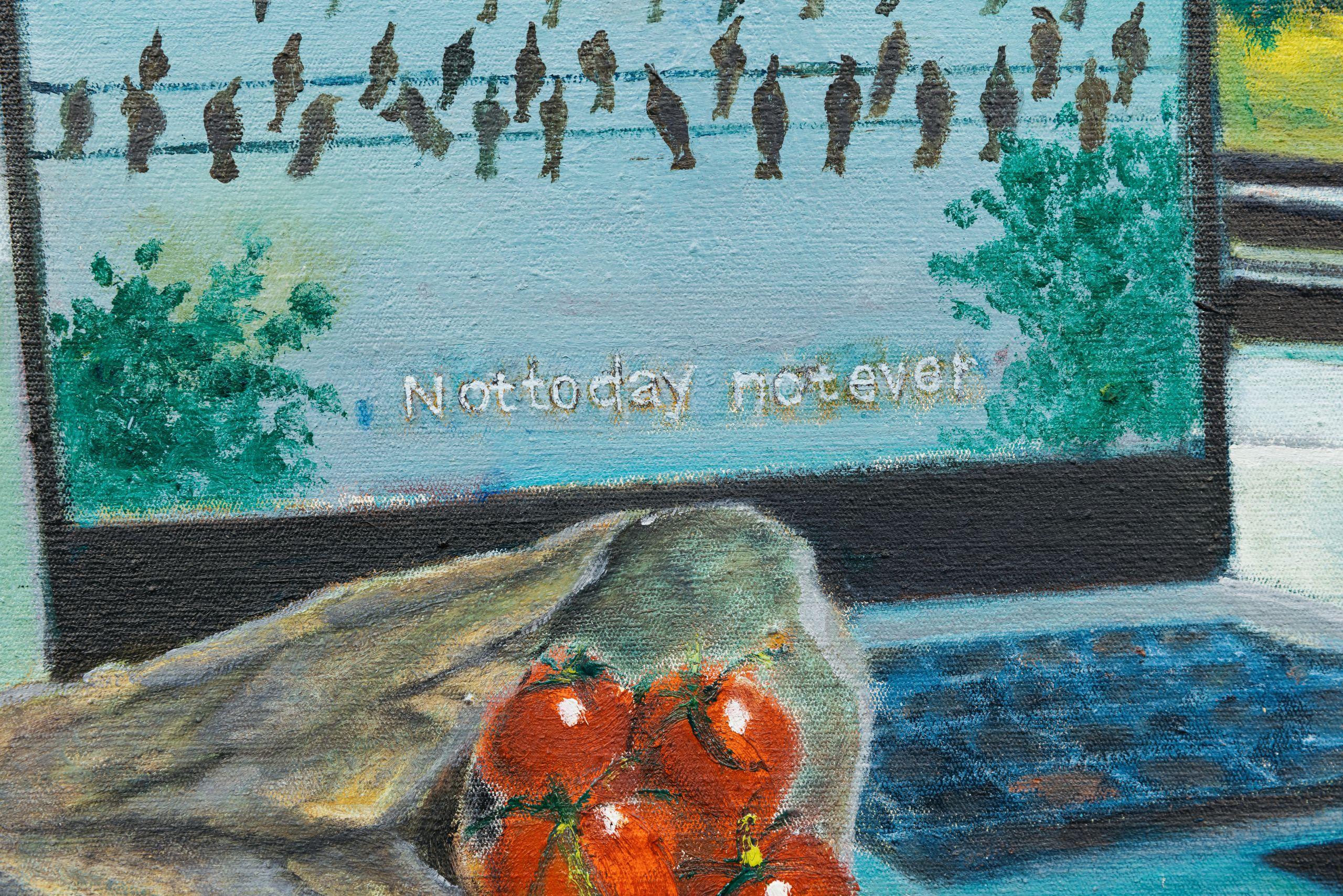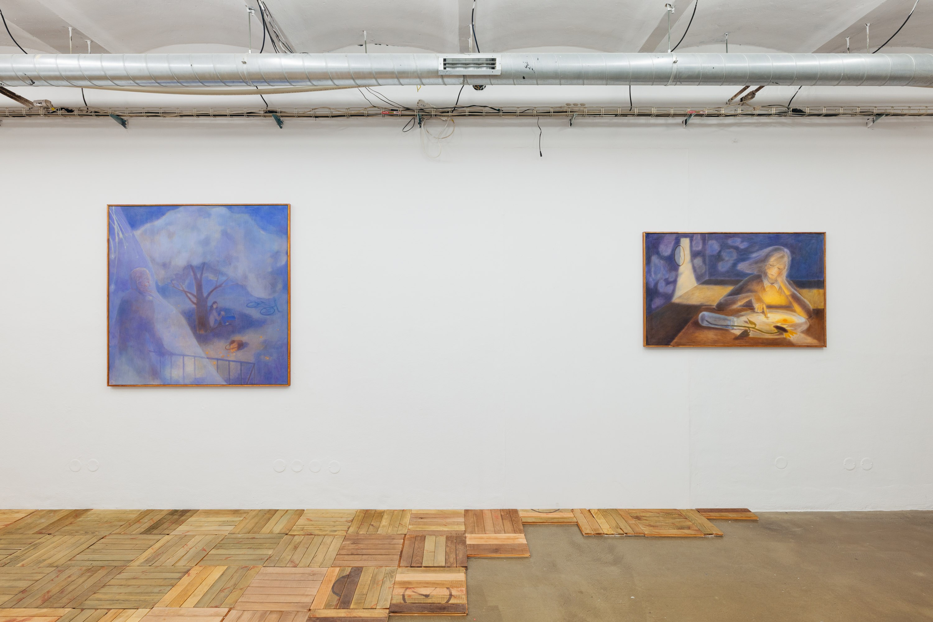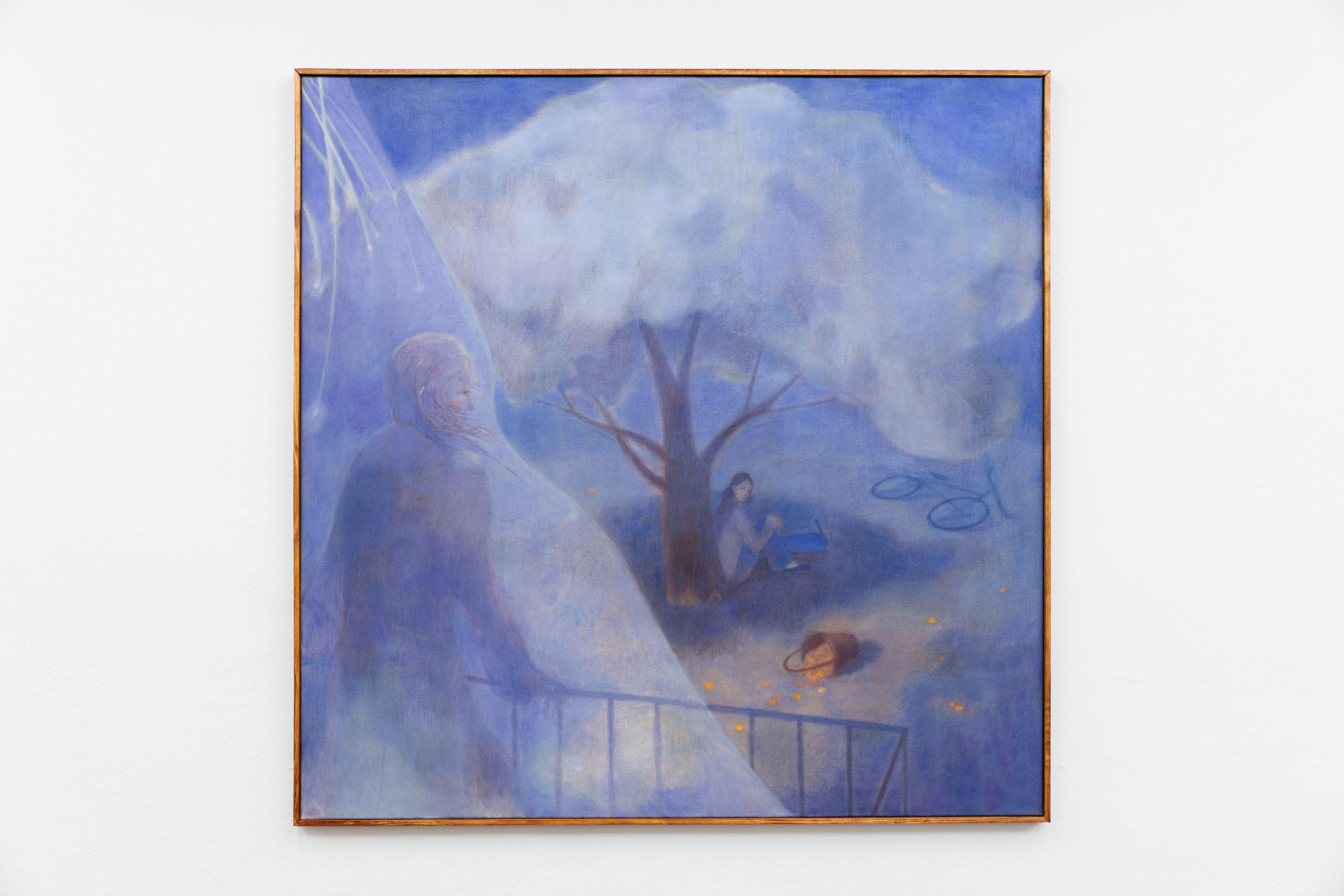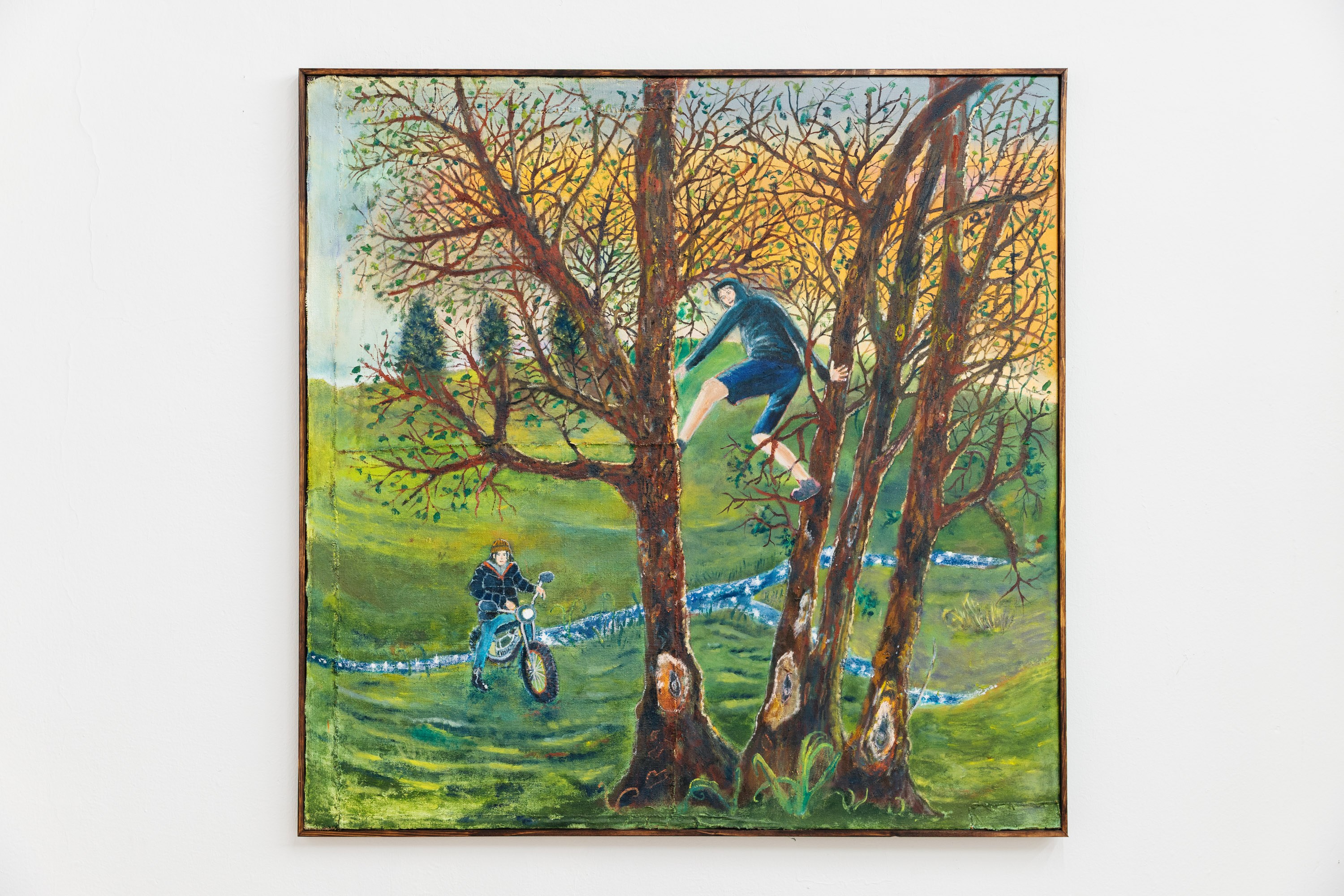 This disrupted temporality is a key theme for both artists. While their paintings are still, they evoke a sense of movement; they capture something fleeting that simultaneously feels like a lasting trace. From this ambivalence emerges the paradox of illusory timelessness – sometimes as a nostalgic memory of lost innocence, other times as a haunting sense of looming anxieties that remain outside the visible frame.