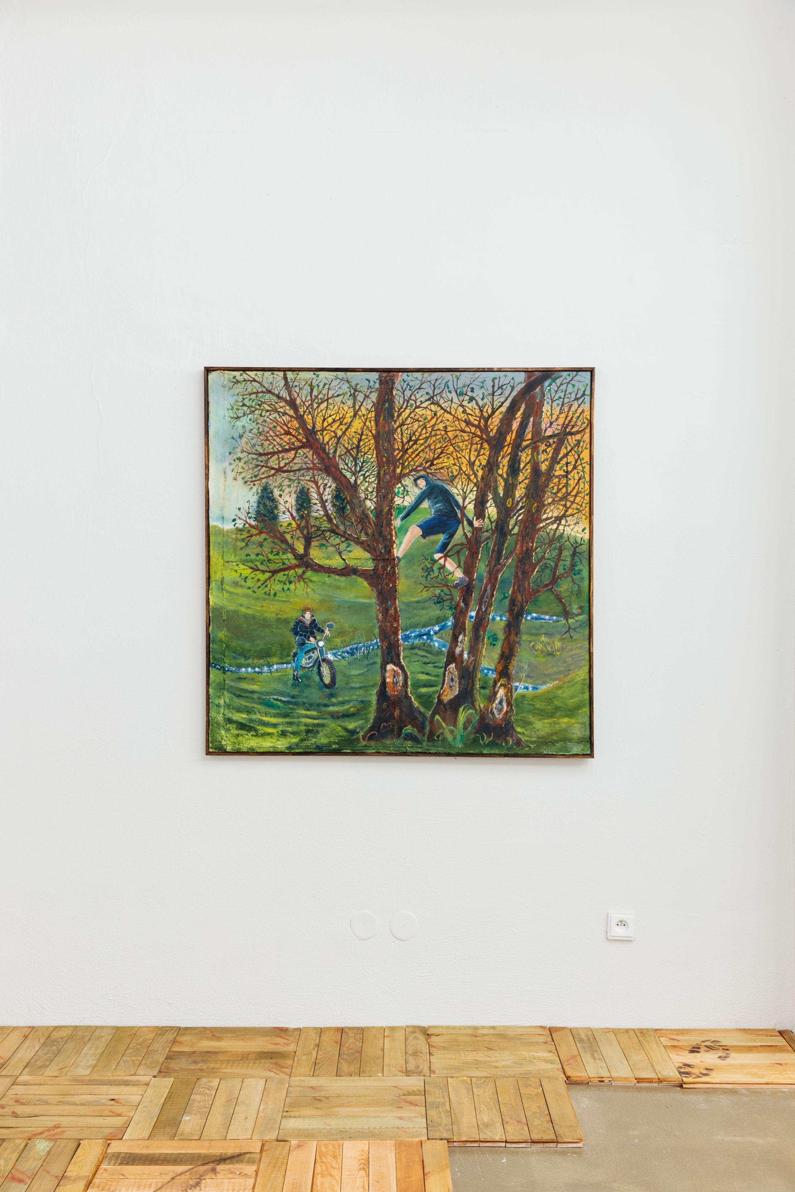 The landscape in their paintings is not merely a backdrop, but an active stage where understated, elusive situations unfold. The figures often look away or beyond the canvas, their gaze is averted, sometimes entirely turned inward. This leaves us in a state of uncertainty, we don’t know what they are looking at, or whether what occupies them is even within the frame. This motif subverts the expectation of linear storytelling and shifts the scene into a peculiar, timeless state. Some works resemble cinematic stills; frozen moments that do not lead to a clear continuation but instead open up a field of possibilities. Time here does not flow continuously, but dissolves into layers in which the present remains fragile and uncertain.