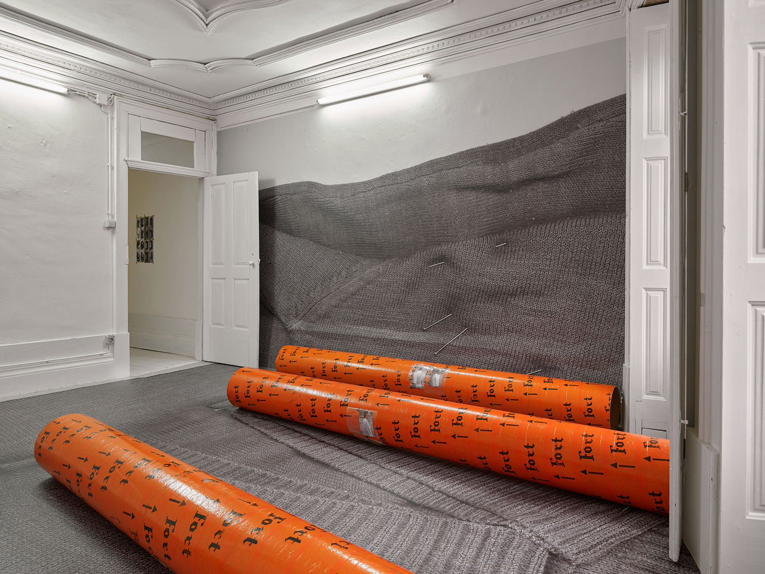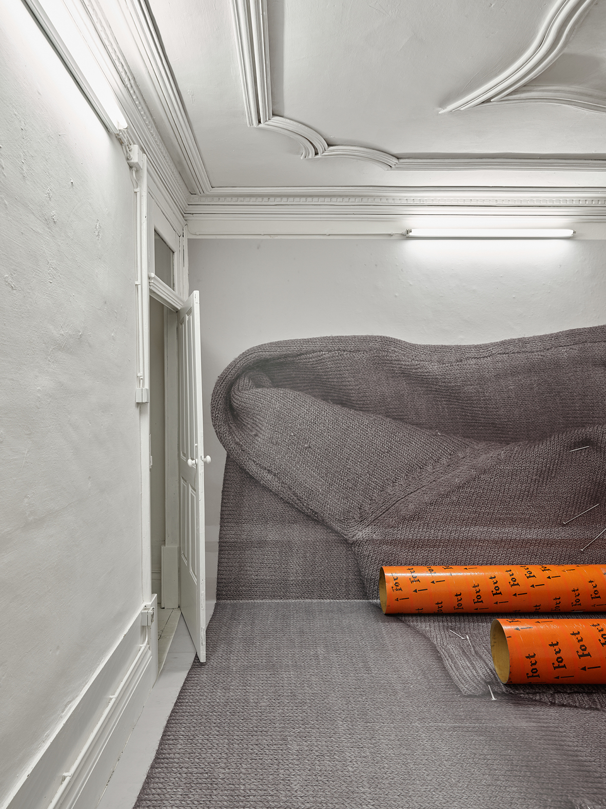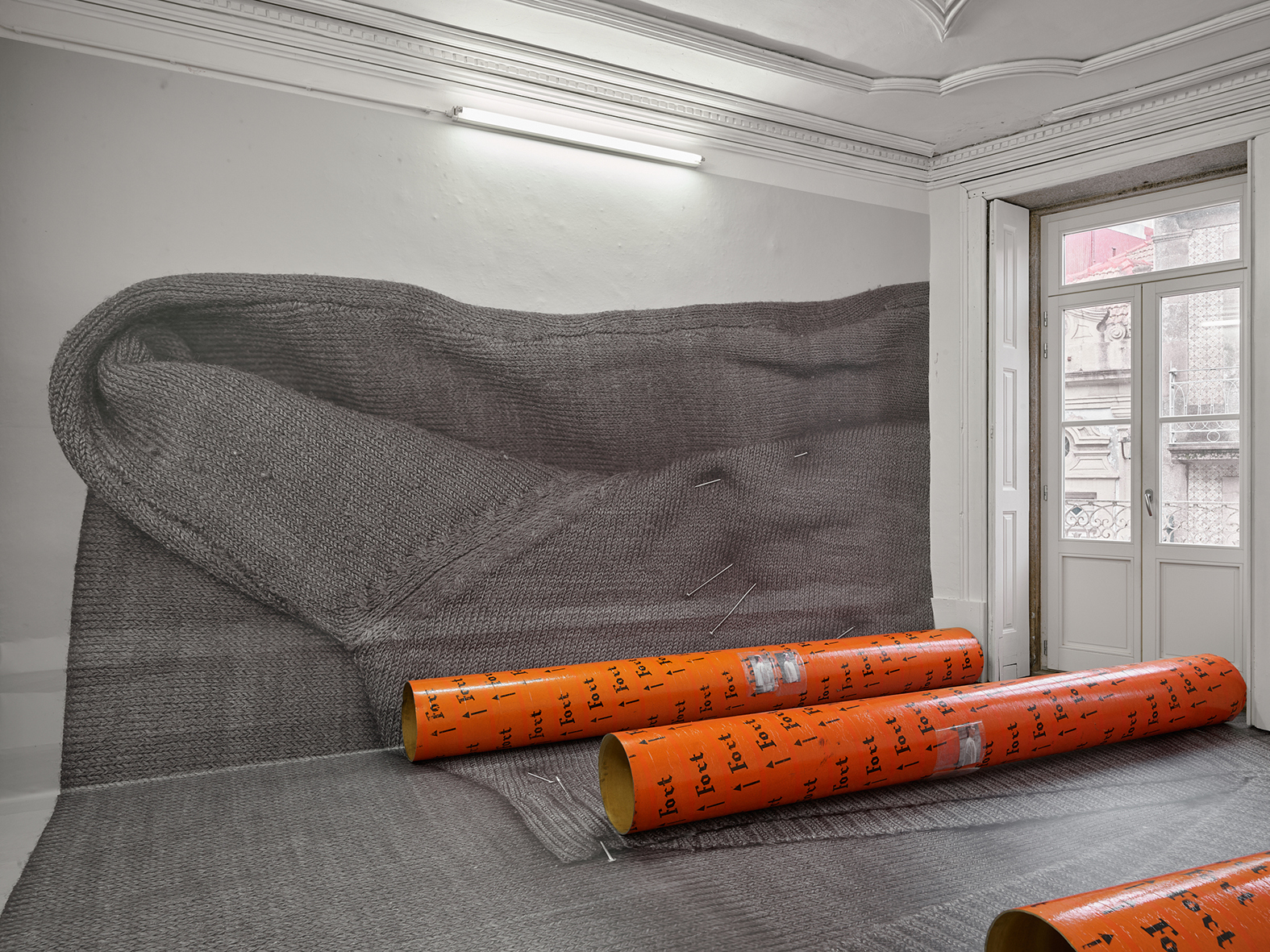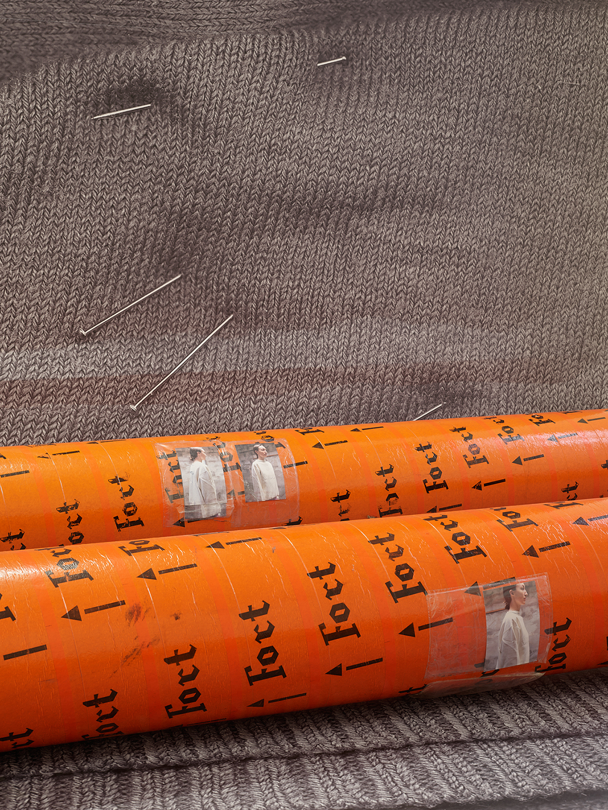 It is 2019 when I first meet June – I am a new mother then and feel alien in my own body, perhaps because the body I have lived in for so long no longer feels like my own. I hardly have time to take care of myself, milk is leaking from my breasts and I am lonely like never before. My life has been turned inside out like a piece of clothing that you pull over your head and, with the inside turned outwards, take off. That's how I feel when I meet June for the first time, turned inside out, empty, a fragile vessel, hollow. At the time, June is giving birth to a new body of work. She is preparing her exhibition No Osso (In the Bone) at Uma Certa Falta de Coerência. Her sculptures seem to hold something within - echoes of bodies, of absence, of structures made to hold or contain - and I immediately sense a connection between my situation, my body, the memory of pain or the pain of memory, June herself and her work. Understanding takes place in the inbetween, in the untold. Hollow spaces offer room for such understandings. Before Junes departure in 2019, she offers me a knitted top - this gesture of care meant more to me than the object itself – I still keep it as a loving memento. Memory appears to be an important aspect in June's work - memory also in the sense of physical remembrance - I am reminded that invisible scars still itch, even if they are covered by beauty with support structures in place. Fast forward to 2025, a lot has happened since our first encounter. The room that once served as my cave in 2019, my bedroom, has now become the vessel for NIKI. June fills this room with an enlarged photograph of another knitted top, her own, folded and held together with sewing needles – needles that are now as big and deadly as swords. Empty construction tubes and photographs of my former self of 2019 lie across the floor. Looking back, it all makes sense: closure and decision-making also pave the way for new beginnings, like an endless unfolding of inevitable transformations.