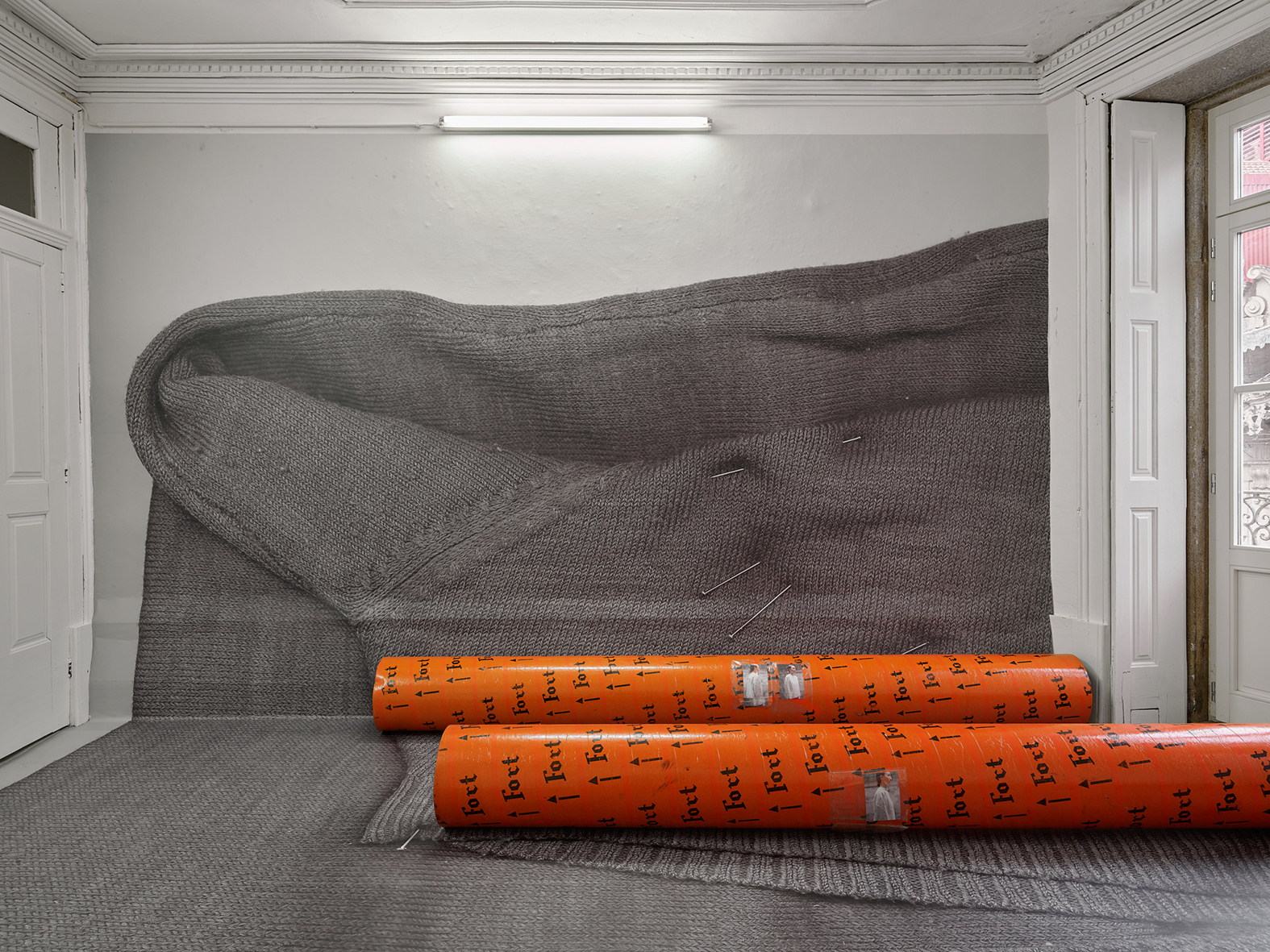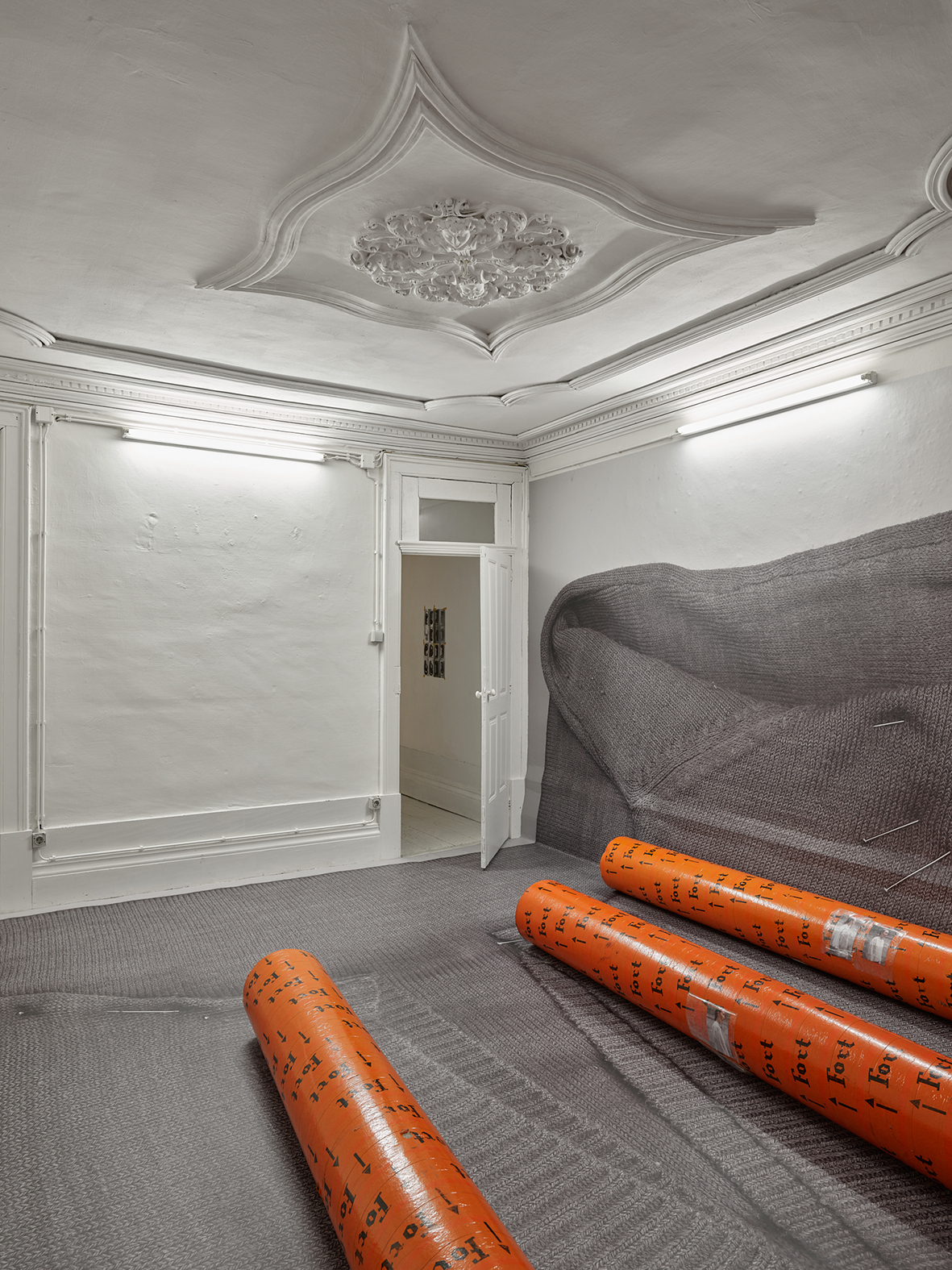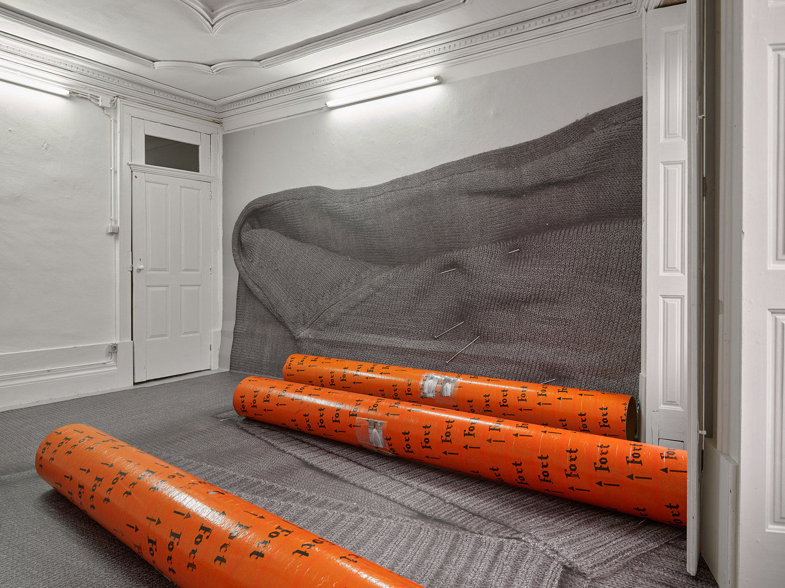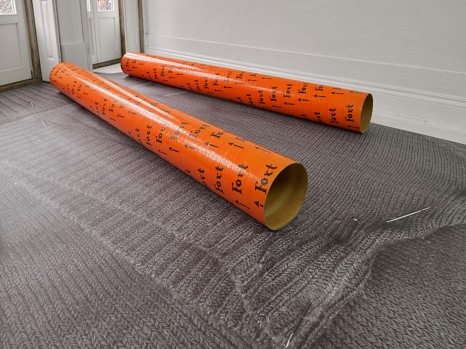 It is 2019 when I first meet June – I am a new mother then and feel alien in my own body, perhaps because the body I have lived in for so long no longer feels like my own. I hardly have time to take care of myself, milk is leaking from my breasts and I am lonely like never before. My life has been turned inside out like a piece of clothing that you pull over your head and, with the inside turned outwards, take off. That's how I feel when I meet June for the first time, turned inside out, empty, a fragile vessel, hollow. At the time, June is giving birth to a new body of work. She is preparing her exhibition No Osso (In the Bone) at Uma Certa Falta de Coerência. Her sculptures seem to hold something within - echoes of bodies, of absence, of structures made to hold or contain - and I immediately sense a connection between my situation, my body, the memory of pain or the pain of memory, June herself and her work. Understanding takes place in the inbetween, in the untold. Hollow spaces offer room for such understandings. Before Junes departure in 2019, she offers me a knitted top - this gesture of care meant more to me than the object itself – I still keep it as a loving memento. Memory appears to be an important aspect in June's work - memory also in the sense of physical remembrance - I am reminded that invisible scars still itch, even if they are covered by beauty with support structures in place. Fast forward to 2025, a lot has happened since our first encounter. The room that once served as my cave in 2019, my bedroom, has now become the vessel for NIKI. June fills this room with an enlarged photograph of another knitted top, her own, folded and held together with sewing needles – needles that are now as big and deadly as swords. Empty construction tubes and photographs of my former self of 2019 lie across the floor. Looking back, it all makes sense: closure and decision-making also pave the way for new beginnings, like an endless unfolding of inevitable transformations.
